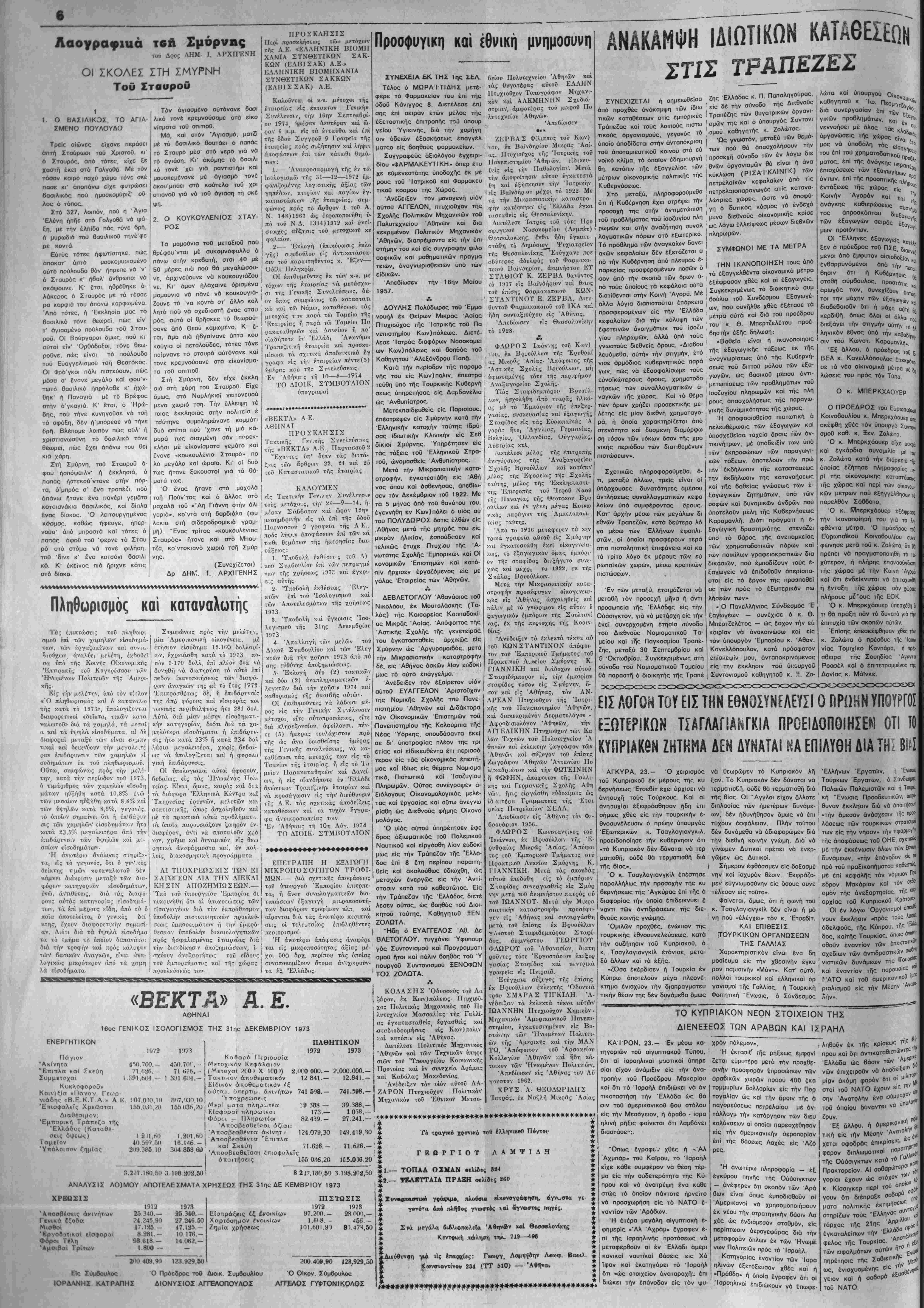 | Σήμερον έφθάσαμεν είς δοΕασμέ ' πρό τοϋ πραΕικοπήματος < Ό κ. Τσογλαγιανγκίλ έπέστησε νην καί ισχυράν θέσιν. ΈκφράΖο- μέ επί κεφαλής τόν νόμιμον Προ παραλλήλως τήν προσοχήν τής κυ μέν ευγνωμοσύνην είς όσους συνε [ εδρον Μακάριον κα'ι τόν Τέ τραγιικό χοονιχό τοθ ελληνικόν Πόντον· ΓΒβΡΓΙΟΤ ΛΑΜΨΙΔΗ βερνήσεως τής Άγκυρας επί τής ά τέλεσαν είς τουτο». διαφορίας τήν όποία επιδεικνύει έ Φαίνεται, δμως, ότι ή φωνή τού ναντι των άντιδράσεων τής διε- κ. Τσαγλαγιανγκ'ιλ δέν είναι ή μό θνοϋς κοινής γνώμης. Όμιλών προχθές. ενώπιον τής τουρκικής εθνοσυνελεύσεως, κατά τήν συζήτησιν τοϋ Κυπριακοΰ, ό νη πού «έλέγχει» τόν κ. Έτσεβίτ. ΚΑΙ ΕΠΙΘΕΣΙΣ | ΤΟΥΡΚΙΚΩΝ ΟΡΓΑΝΩΣΕΩΝ ΤΗΣ ΓΑΛΛίΑΣ σμόν τής άνεΕαρτησίοα, τηο αρχΐας τοϋ Κυπρισκοΰ Κράτοικ· Οί έν λόγω Όργανιττμοί * νούν έκκλησιν «πρός τούς άδελφούς, τής Κύπρου, της δος, καίτης Τουρκίας. όπωο α^ σθοϋν εναντίον των έπεκτστικΐί κ. Τσαγλαγιανγκιλ ετόνισε, μετα- Χαρακτηριστικόν είναι ένα δή σχεδίων των αντιδραστικόν Εύ άλλων καί τά έΕής. μοσίευμα είς τήν χθεσινήν έγκυ νιοτικών δυνάμεων τής "^ -ΖΟσα έκέρδισεν ή Τουρκία έν ρον παρισινήν ·Μόντ.. Κατ' αύτό, ' καί εναντίον τής παρουσίαε Κύπρω άποτελοϋν μέγα πλεονέ- πολλοί τουρκικοί καί έλληνικοί όρ ΝΑΤΟ καί τοϋ αμερικανικόν Ί κτημα ενίσχυον τήν διαπραγματευ γανισμοί τής Γαλλίας, ή Τουρκική ι ριαλισμοϋ είς τήν Ινΐέσην ' τικήν θέσιν της δέν δυνάμεθα δμως Φοιτητική Ένοχΐις, ό Σύνδεσμος Αήν». ΤΟ ΚΥΠΡΙΑΚΟΝ ΝΕΟΝ ΣΤΟΙΧΕΙΟΝ ΤΗΣ ΔΙΕΝΕΞΕΩΣ ΤΩΝ ΑΡΑΒΩΝ ΚΑΙ ΙΣΡΑΗΛ ΚΑ'ΓΡΟΝ, 23.— Έν μέσω κο- χρόν πόλεμον». ληθοϋν έκ τής κρίσεως 2ί7.ΐ80,50 3 198.30-2,50 ΑΝΑΛΥΣΙΣ ΛΟ)ΜΟΥ ΑΠΟΤΕΛΕΣΜΑΤΑ ΧΡΗΣΕΩΣ ΤΗΣ 31ης ΔΕ ΚΕΜΒΡΙΟΥ 1973 1.— ΤΟΠΑΔ ΟΖΜΑΝ «ελίΑβς 8» Ι.— 9ΕΛΧΤΤΑΙΑ ΠΡΑΗΗ ββλίδ*ς « ί τηγοριών τοϋ αιγυπτιακού Τύπου, ' Ή έκτααιιΤ Γής ρήΕεως έμφανί πρου καί δτι άντικαταθιστώντε ^ ότι αί ίσραηλιναί μυοτικαί Οπηρε Ζεται εύρυτέρα μετά την προχθε- Έλλάδα ώς βάσιν των 'Αμερ'^ σίαι είχον άνάμιΕιν είς την άνα- οινήν προσιροράν έπροσώπων των νών έπιχειροϋν νά άποδείΕουν τροπήν τοϋ Προέδρου Μακσρίου άραβικών χωρών ποσοϋ 400 έκα ' μίαν άκόμη φοράν ότι οί μ|λιτα^ κηί Λτ, τα ·ι™,,ήλ ί-τ,,χ,.^ο, ..λ α» ι τομμυρίιον δολλαρίιον είς τήν Πορ οταί τοϋ ΝΑΤΟ εχουν είο τ|ίν ^ τογαλίαν ώς καί την άρσιν τής ά σην Ανατολήν ένα παγορεύσεως πετρελαίου μέ άν- τρϋ όποίρυ Βύνονται νά τάλλαγμ την κατάργησιν των διευ Ζουν. κολύνσεων οί οποίαι παρεσχέθησαν είς τήν άμερικανικήν όεροπορΐαν επί τής βάοεως Λαχές είς Ά?ό ΧΡΕΩΣ1Σ 1972 1973 Άττοοβεσεις άκινήτων 25 340.— 25.340.- Γενικώ Εξοδα ?4.245.90 27.246.50 Μιοθοί 17.125.- 47.125.— 'Κρνοδοτικσί βΐσφοραι 8.281.- 10.176.- Φόροι Τέλη 93 618 — 14.062.— Άμοιβαί Τρίτων 1 80Ο — Είσπραξις έξ ένοικίων Χαρτόοημον ίνοικίων Ζημία χρήσεως ΠΙΣΤΩΣΙΣ 1972 1973 97.2(Κ). - 23 00'— 1.«8. - ί5ί>-