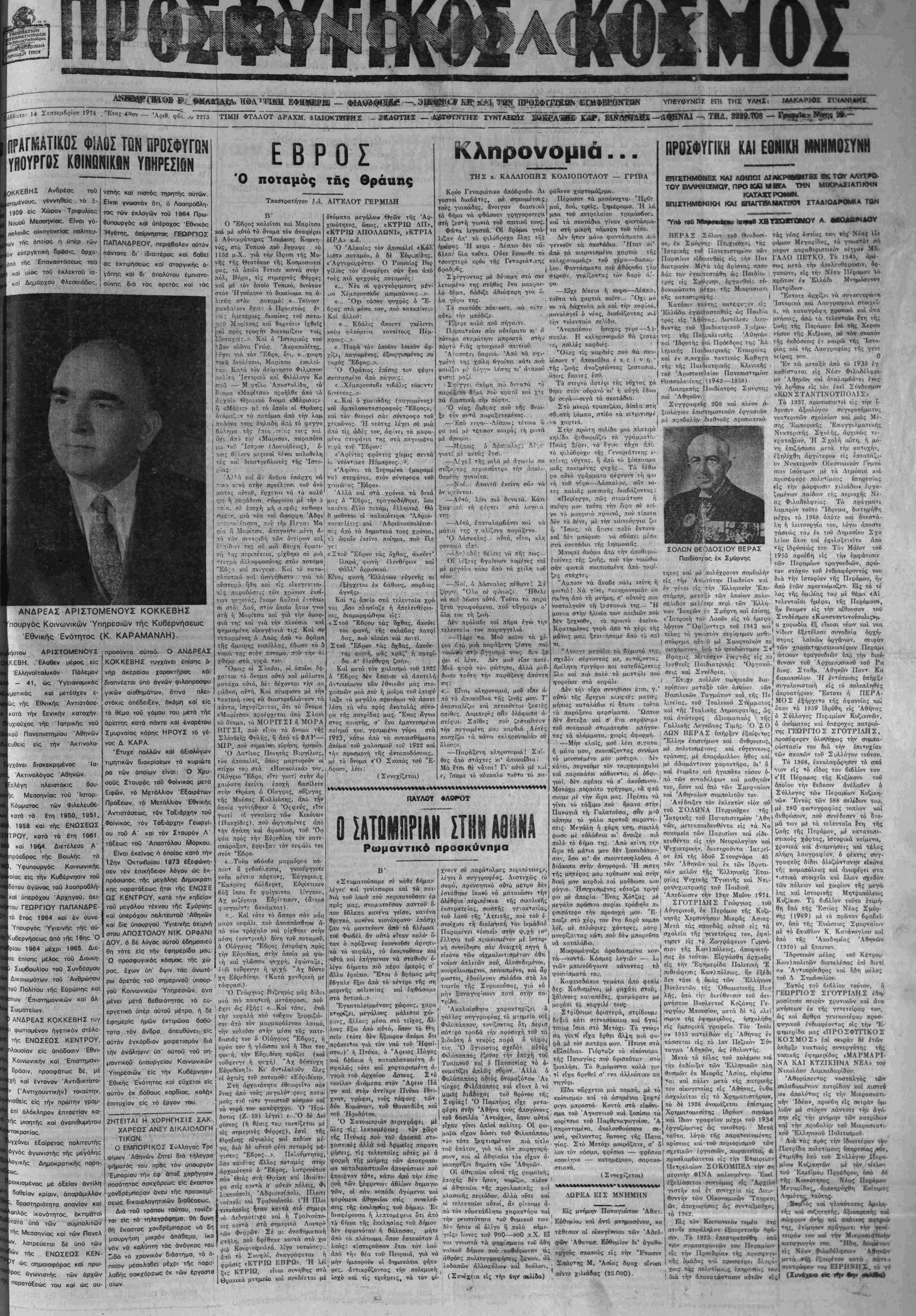 *πλα<; ικανότητος, εκτιμάται οτα υπό των συμπολιτών Ι τΠΐ; Μεσσηνίσχ: καί των Πανελ λατρεύεται δέ υπό των τής ΕΝΩΣΕΩΣ ΚΕΝ- κ' ως σημαιοφόρος κα'ι πρω- ^ άγωνιστής των άρχών Ι παρατάξεως τού κοί ώς συ- προσόντα αυτού. Ό ΑΝΔΡΕΑΣ ΚΟΚΚΕΒΗΣ τυγχάνει έπίσης ά- νήρ άκεραίου χαρακτήρος καί δισπνέεται υπό άγνών φιλοπροστρυ γικών αίσθημάτων, άτινα πλει¬ στάκις απέδειξεν, άκόμη καϊ είς τό θέμα τοϋ γάμου τού μετά τής αρίστης κατά πάντα κσί έναρέτου Σμυρναίας κόρης ΗΡΟΥΣ τό νέ- νος Δ. ΚΑΡΑ. "Ετυχε πολλών κοί άΕιολόγων τιμητικών διακρίσεων τα κυριώτε ρα των οποίων είναι: Ό Χρυ- σοϋς Σταύρος τοϋ Φοίνικος μετά Ειφών, τό Μετάλλιον 'ΕΕαιρέτων ΠράΕεων, τό Μετάλλιον ' Εθνικής ■Αντιοτάσεως, τόν ΤσΕιάρχην τού Φοίνικος, τόν ΤοΕιάρχην Γεωργί- ου τού Α' κο'ι τόν Σταύρον Α' τάΕεως τοϋ Αποστόλου ίΛάρκου. Είναι έκεΐνος ό οποίος κατά την Ι2ην Όκτο>βοίου 1973 έΕεφώνη-