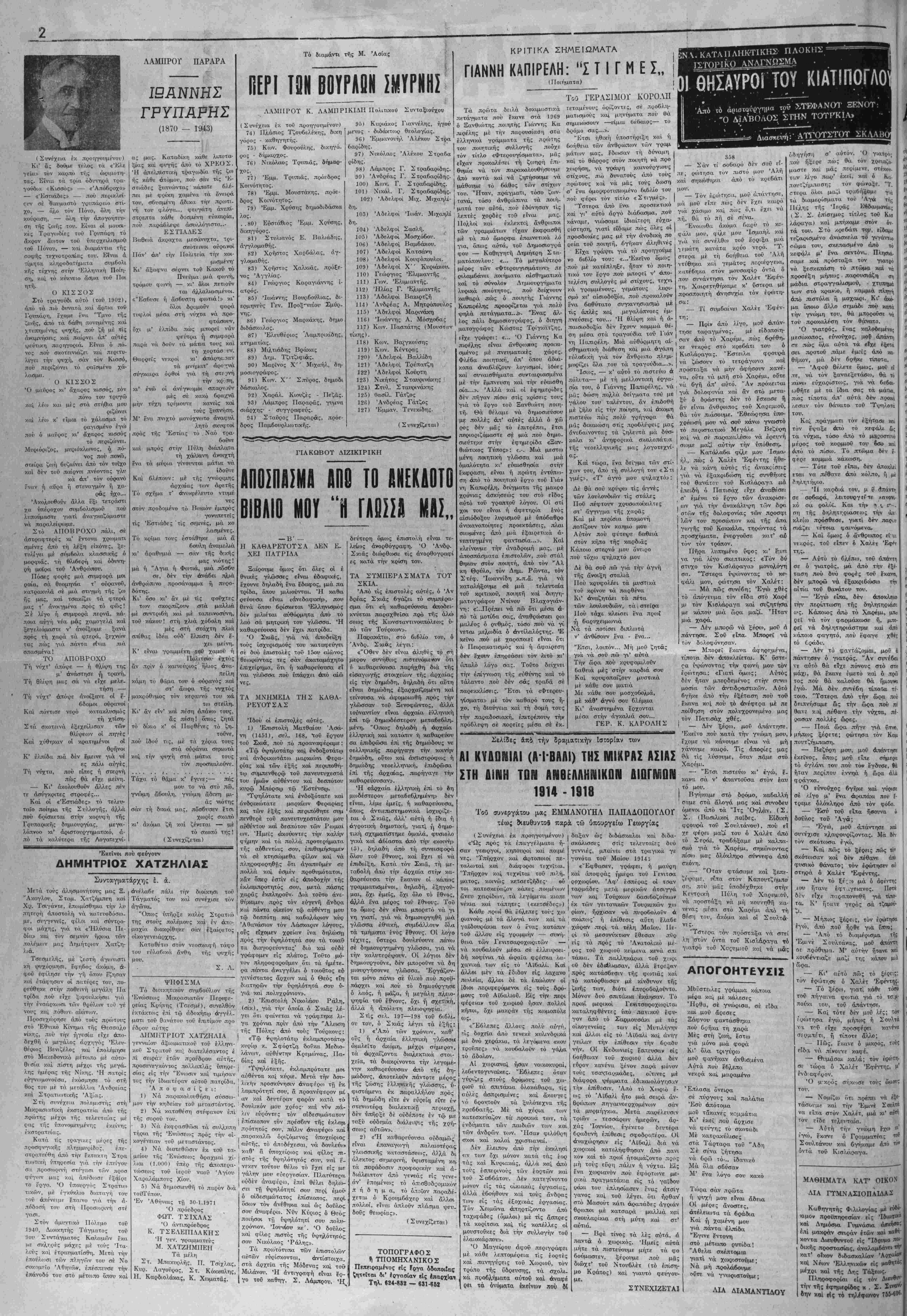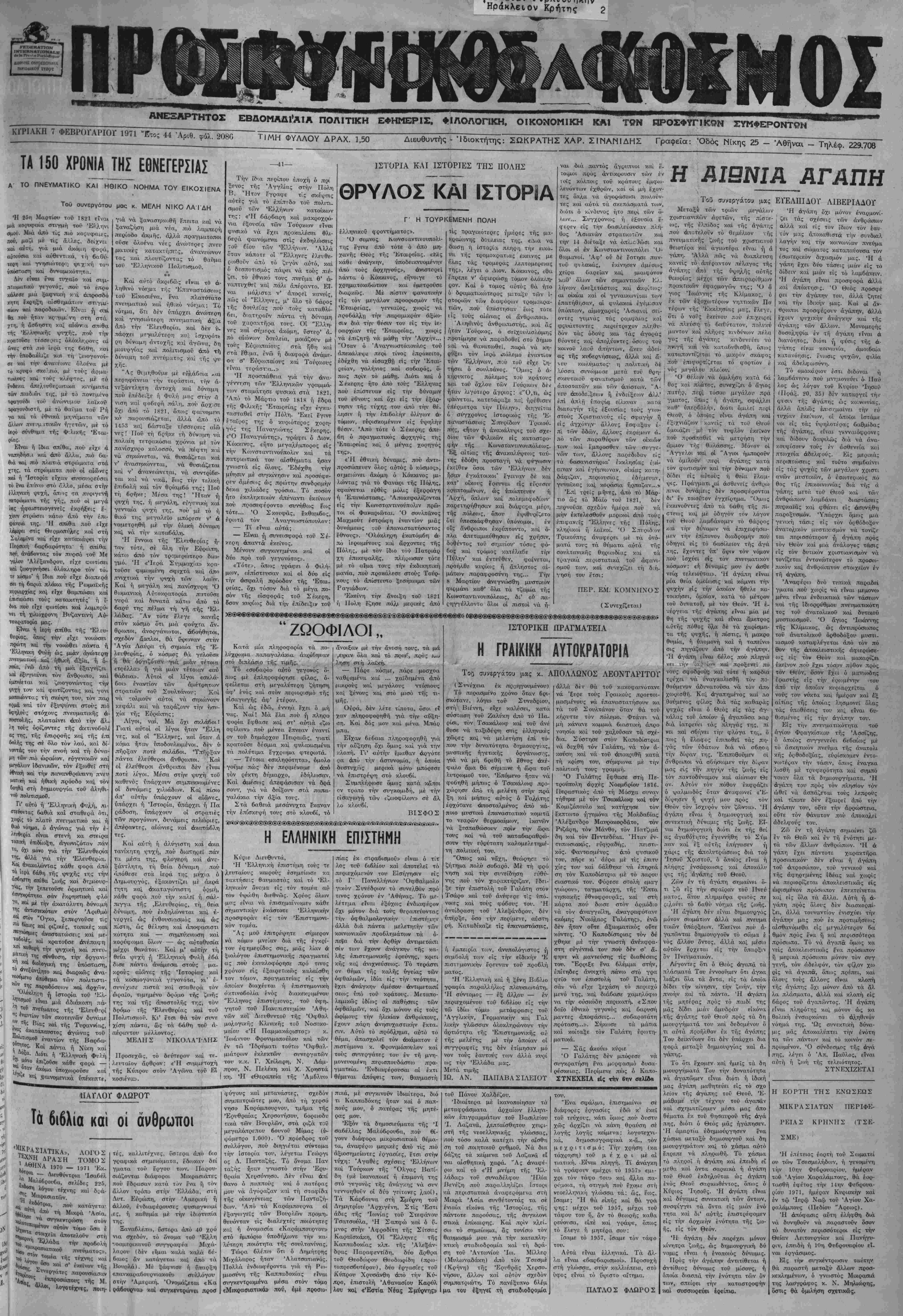 ΚΓΡΙΑΚΗ 7 ΦΕΒΡΟΓΑΡΙΟΓ 1971 "Ετος 44 Αριθ, φύλ. 2080 Τ|ΜΗ ΦΥΛΛΟΥ ΔΡΑΧ. 1,50 Διευθυντάς - Ίδιοκτήτης: ΣΩΚΡΑΤΗΣ ΧΑΡ. Σ1ΝΛΝΙΔΗΣ Γραφεϊα: Όδός Νίκης 25 - Αθηναι - Τηλέφ. 229,708