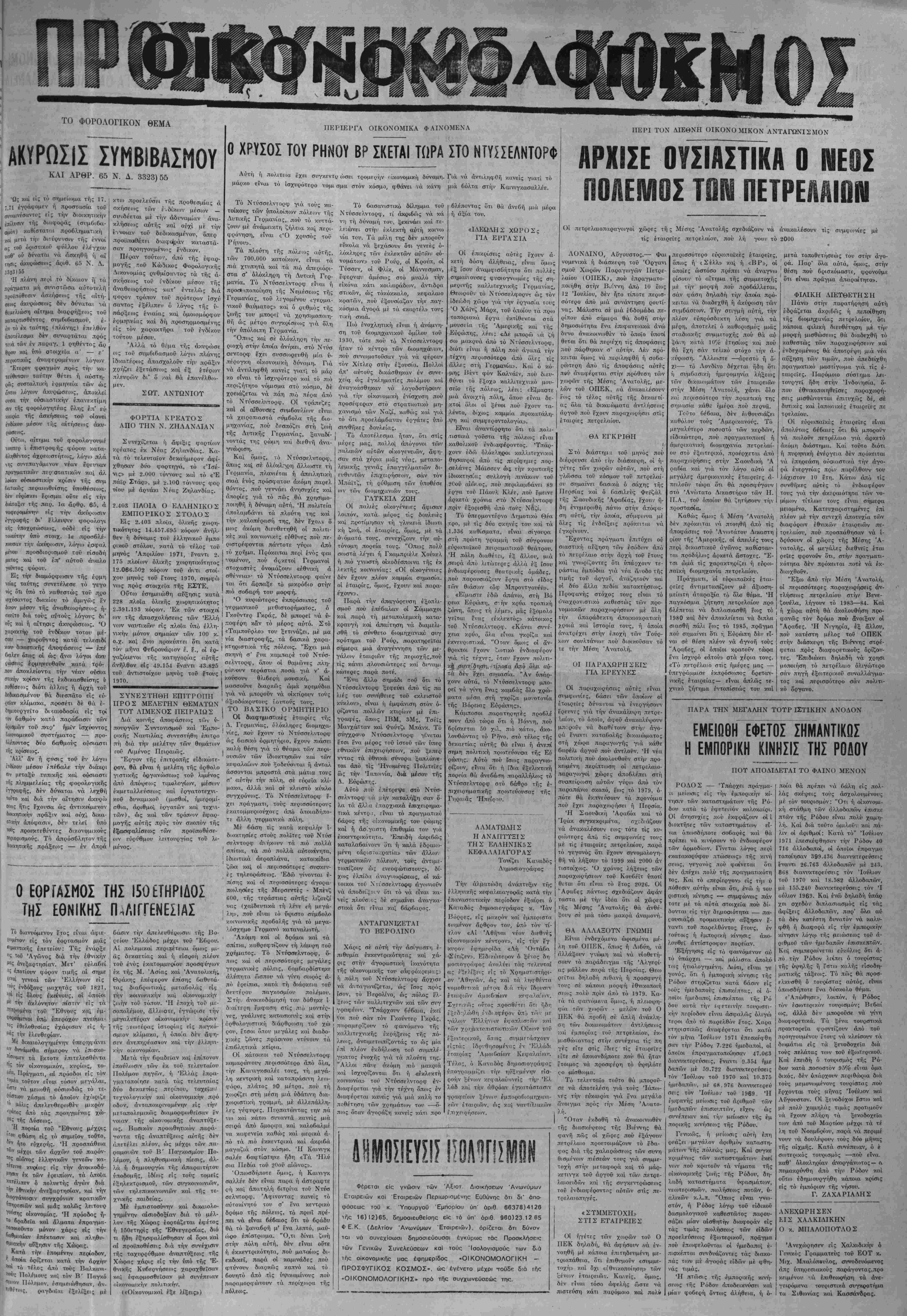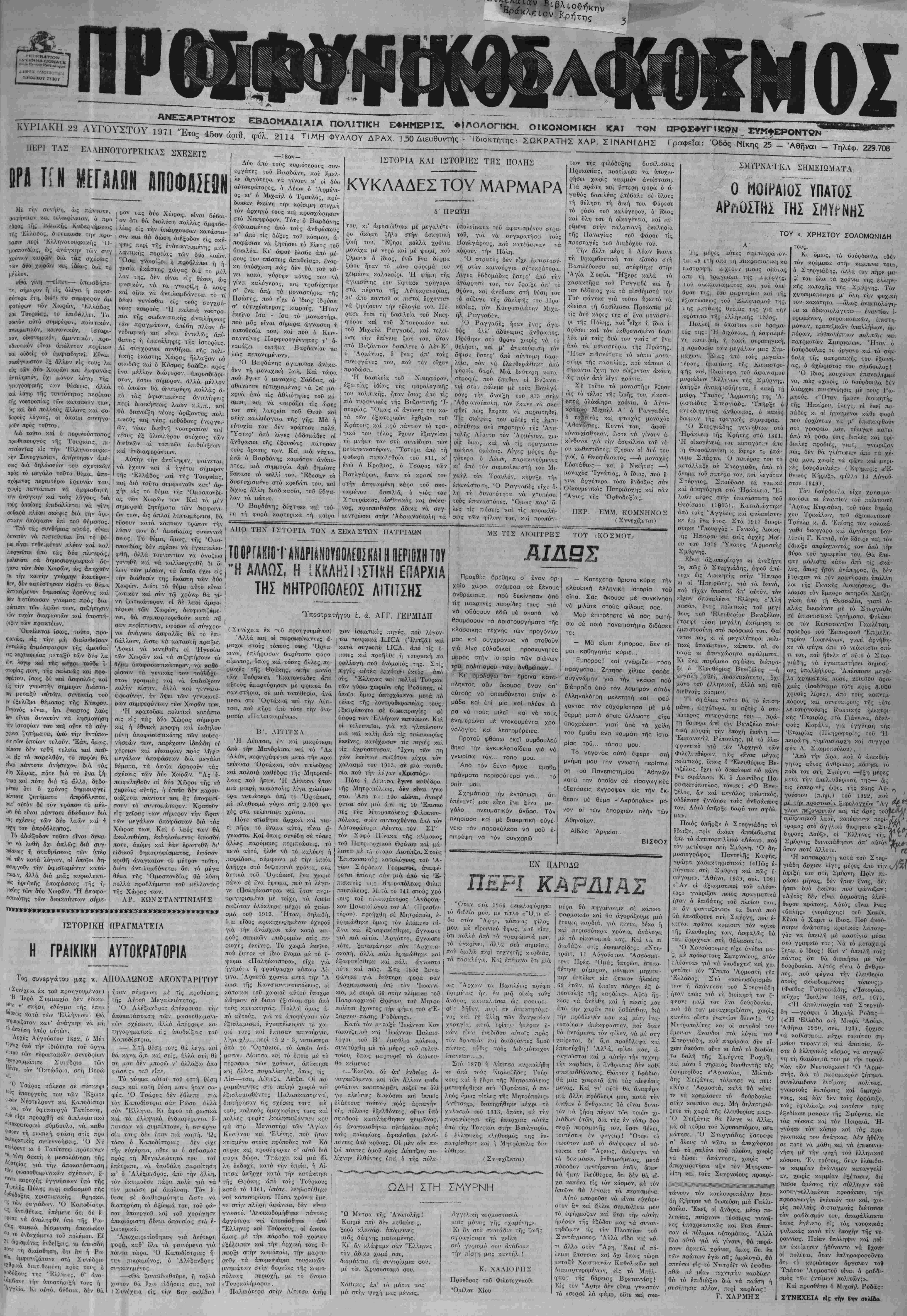 1971 Έτος 45ον αριθ, φΰλ. 2114 ΤΙΜΗ ΦΥΛΛΟΥ ΔΡΑΧ. 1,50 Διευθυντάς - Ιδιοκτητάς: ΣΩΚΡΑΤΗΣ ΧΑΡ. ΣΙΓΗΑΜΙΔΗΣ ΓραφεΖα: Όδός Νίκης 25 - Αθήναι - Τηλέφ. 229.708
