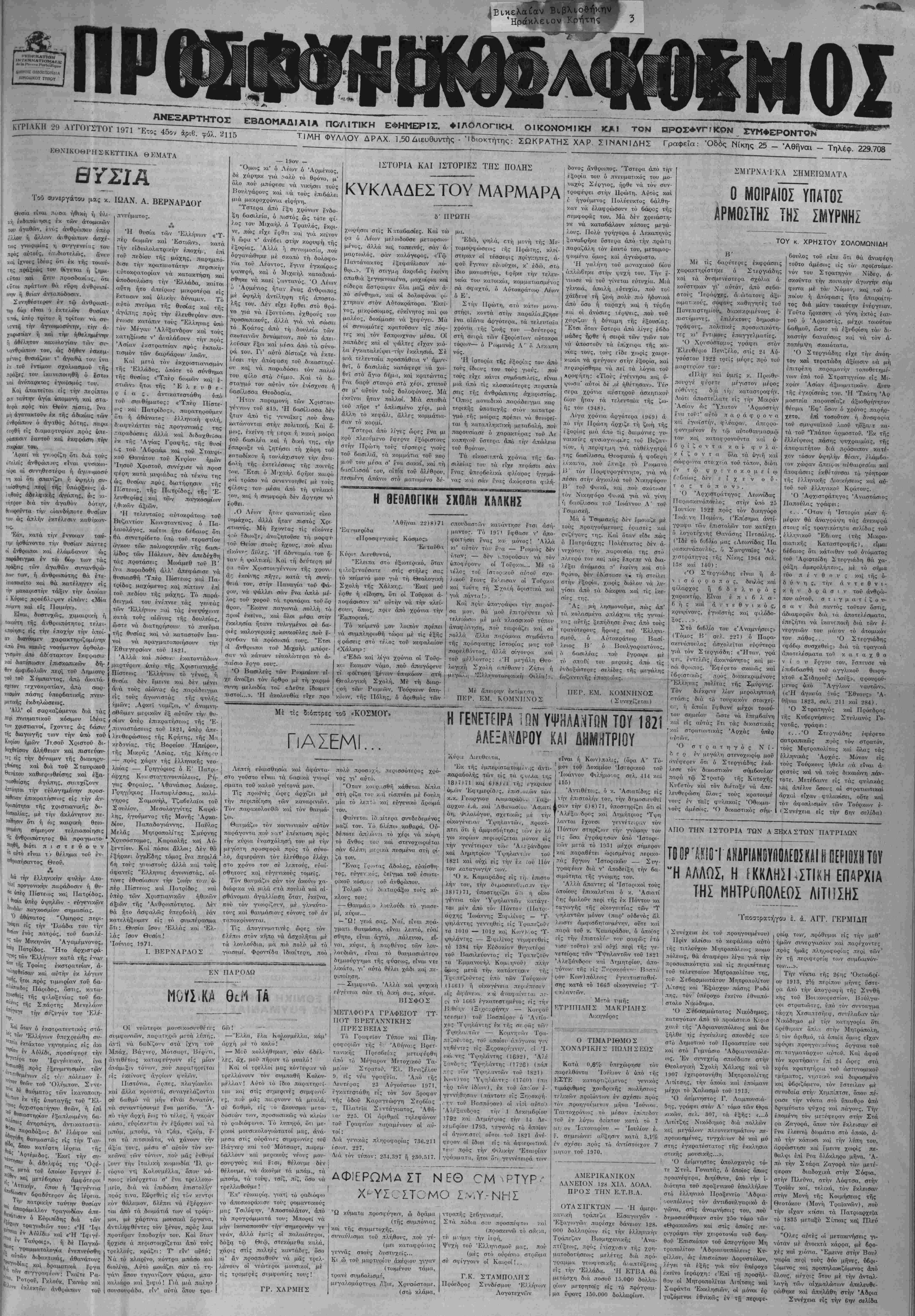 Τ)ΜΗ ΦΥΛΛΟΥ ΔΡΑΧ. 1,50 Διευθυντάς - Ίδιοκτήτης: ΣΩΚΡΑΤΗΣ ΧΑΡ. ΣΙΝΑΝΙΔΗΣ Γραφεία: Όδός Νίκης 25 — Αθηναι - ΤηλέΦ. 229.708