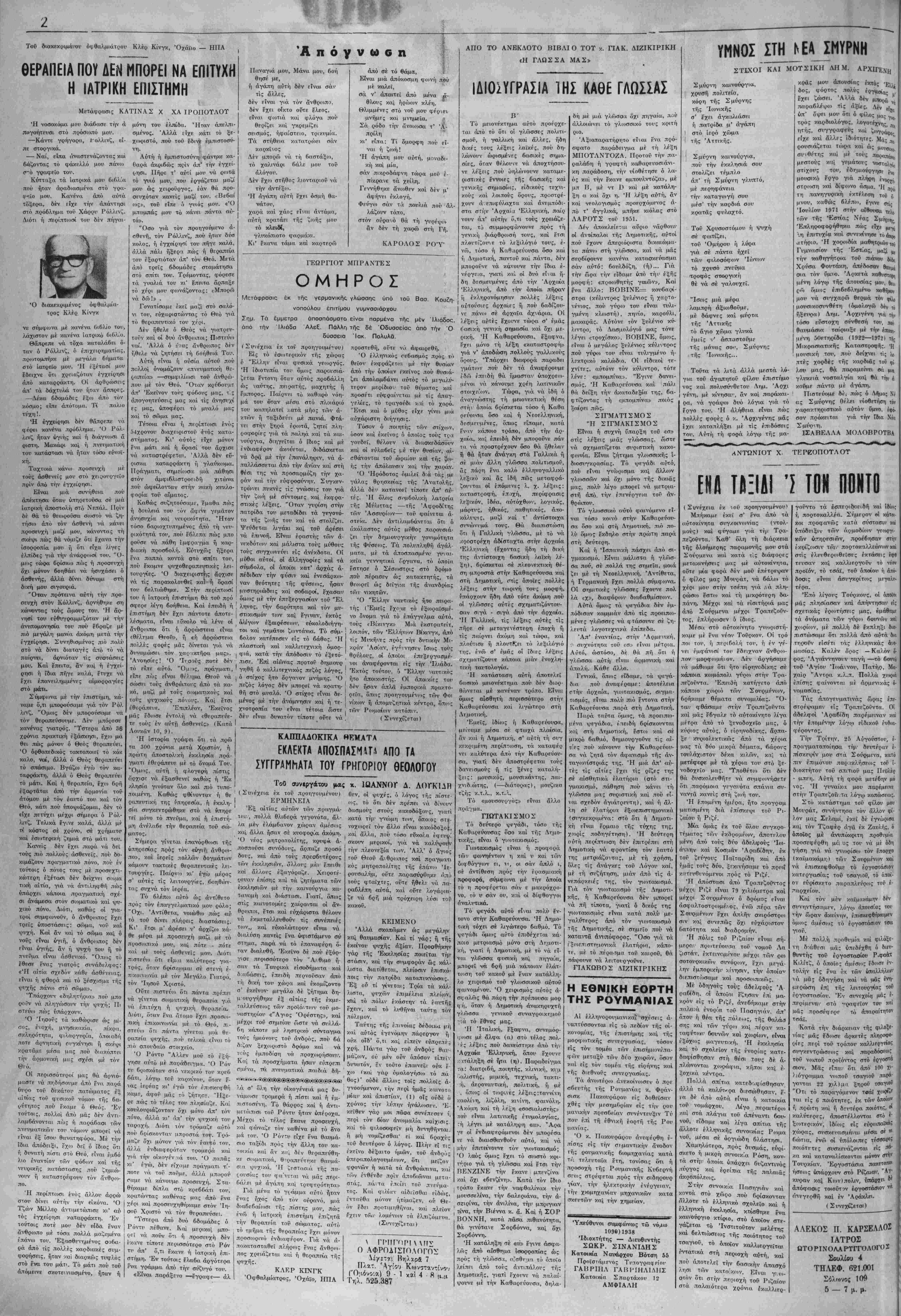 ·/..ιόνος πού περαθΐ ήτ<ι. άληθινή ιΌκιμασία διά τού; ίδικού; της /. η τού; γνωρ<.μους της. "Ελειψε ό λ.αμπρός άνθοωπος, ή χριστια- ν.κή ι|·νχή ή ενγενής οίκοδίσποι- να, ή φΐλεύοπλι/χνος Κν·ρία. "Ο- λοι την άποζητοίη·. "Οταν εί; την Αρχαιολογικήν Έΐαιοίαν ή "Ε¬ νωσις μας άπέδιδε τα; μεγαλυτέ¬ ρας των τιιιων τη; διά τό πνευ¬ ματικόν έ'ργον τοϋ ά,νδρός της Ίαί σνγχρόνο); καί ό Έμπορικός κ-όσμος έτίμα την μαικροχρόνιον ."ργασίαν τού, ή άχώριστη σύν- τροφος εκειτο εί; τό κρεββάτι τοϋ πόνον. Καί τό ίδιο βράδν, ποίι προεβλήθη άπό την τηλ.εό- ηεση καί εΤδε την τιμητικήν εορ¬ τήν διά τόν άνδρα της έδάκρνσε καί έγέλ,ασε άπό αγαλλίασιν. ΤΗ· την τό τελίνταϊο γέλιο τής ζωής της. Ό χρόνο; ποϋ πέρασε έσημε^'- (ι>σε τα μεγάλαι νενά ποΰ αφήκε ό