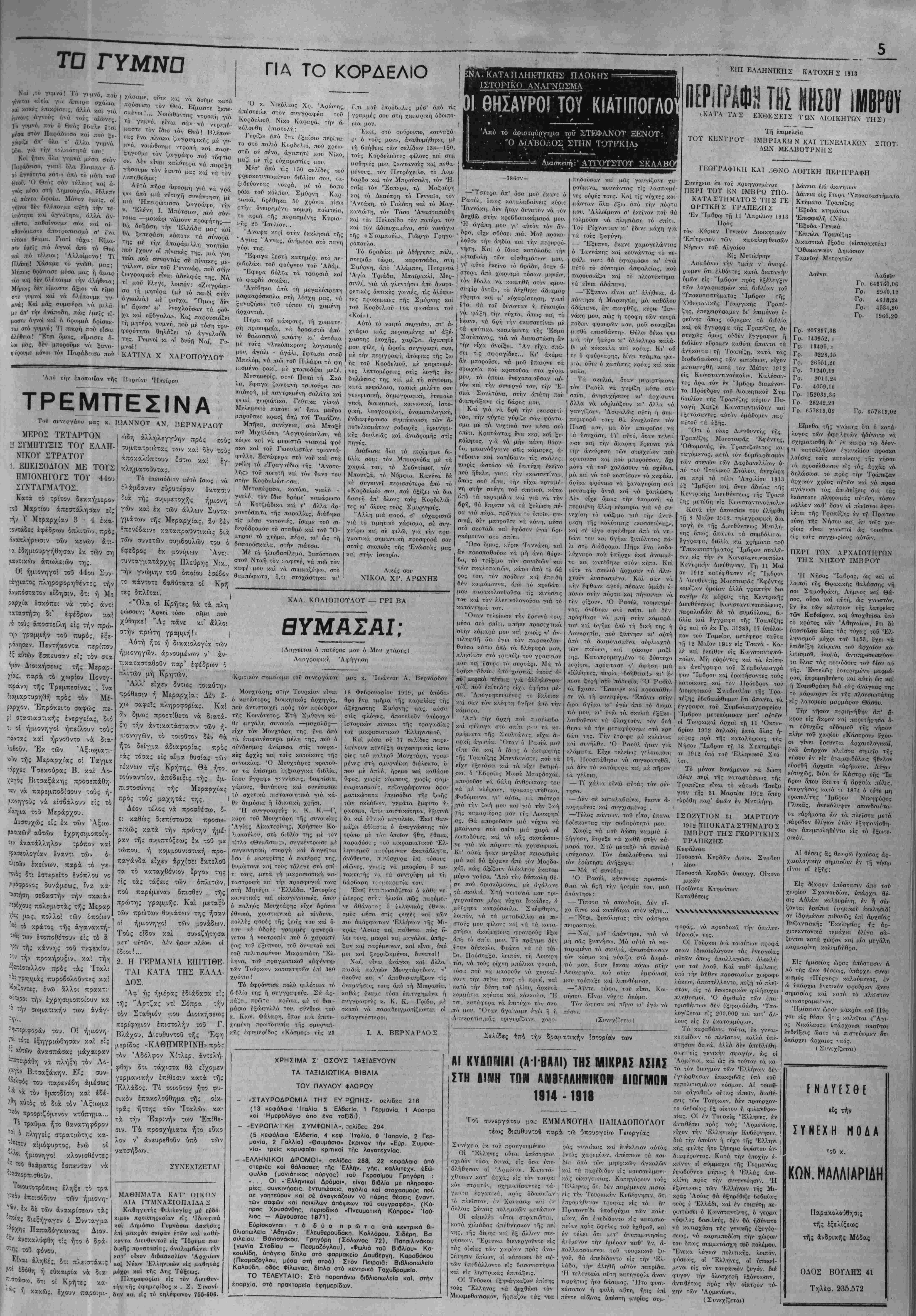 δκι; των άπαρηγορήτων ίδικ<ΐιν της. ΧΡ. Γ. ΕΤΑΓΤΈΛΑΤΟΣ ΕΠΙΤΙΜΟΧ ΠΡΟΕΔΡΟΣ ΤΗΣ ΕΝΩΣΕΩΣ ΕΛΛΗΝΏΝ ΛΟΓΟΤΕΧΝΩΝ » ΔΙΑΓΩΝΙΣΜΟΣ ΠΡΟΣΛΗΨΕΩΣ ΓΠΑΛΛΗΛΩΝ ΥΠΟ 'Εθνικής Τραπέζης. "Αρρενες 100 καΐ θήλεις 50. 'Απόφν.το·. Γυμνασίου. "Εντατικά μαθήματα στά Φροντιστήριχ τής Ελένης Παρασν.ϊυοπούλου Πτυχιούχου μαθηματικών. Ριζά- ρη 30 Τηλέφ. 739-280. Άπό τά Μουσικοχορευτικύ Σύλ λ.ογι) «ΙΙρομηθΐΰ;» δόθηκε την 2(! Μαίου 1919 τό Κιυιμειθθλλιο «Ό Μάρμπα Λινάρδο;, οτό ώραίο θέα τρο Σμαέβσκυ! Σ' αυτήν την θεα τρική πα,ράσταση λ.άβανε μέρο; 22 ιρασιτέχνε;! Τα τριιγούδια τοϋ κωμειδυλλ^'ον, τα σννώδευε μιά πολ.ΰ καλή ύο- χήστρα υπό την διεύθι«ση Πολ.ω- Λθΰ μαέστρον. Γιά την ίστορία, παραθέτομε πιό κάτιο τύ πρόγραμμα τή; θεατρι- κής «ΰτής παραστάσΐως. ΠΡΟΓΡΑΜΜΑ Θέατρον Σμαέβσκι,ι! χ:. Μάϊον 1919 Ό Μπάρμπα Λινάρδος! Κονμειδϋλλιον ι'ίς πράξει; τρείς, Δ. Κόκκον ΠΡΟΣΩ1ΙΑ Μπάρμπα Λινάρδο; Ν. Παπαδό πουλος Μαρούλ^α κόρη 1οι- "Ολ. Μιχαηλ.ί δοι- λρίστο; σίνυγό; της Δτ,μ. Κου τσογιανόπονλ.); Κώστας ρήτωρ ·ί7)· "Αθηνών Βασ. Γρονμματικ.όποΐ'λ.ος Ζ'αμπέτα καμαριέρα Α. Κονντον- ρωφ Λυσίμαχος φαομακοποιό; Κ. Συ- μόνονφ Κορδομένος Τρη.τίΐςίτη: 15. Γηαιι ματικόπονλος ?τννο6ία πελ.άτις Κλ.. Μιχαηλ.ί- δον Ελένη πελάτις Ζ. Βασιλειάδου Κονρελης ,ν>ρος ιοΰ συρμοϋ Ί. Έ-