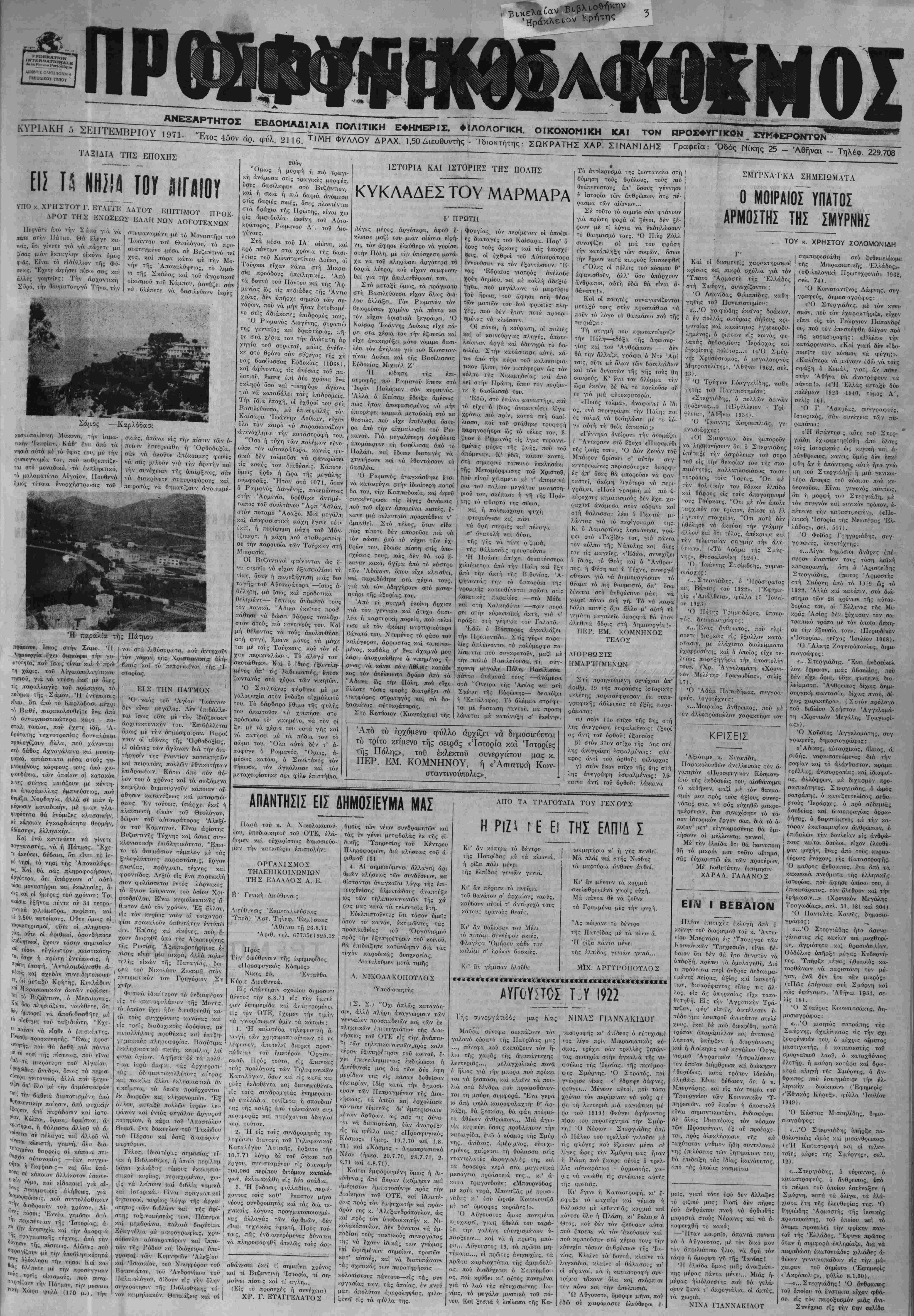 ΚΥΡΙΛΚΗ ;> ΣΕΠΤΕΜΒΡΙΟΥ 1971, Έτος 45σν άρ. φύλ. 2116. Τ'ΜΗ ΦΥΛΛΟΥ ΔΡΑΧ. 1,50 Διευθυντής - Ιδιοκτήτας: ΣΩΚΡΑΤΗΣ ΧΑΡ. ΣΙΝΑΝΙΔΗΣ Γραφεϊα: Όδός Νίκης 25 - Αθήναι - Τηλέφ. 229.708