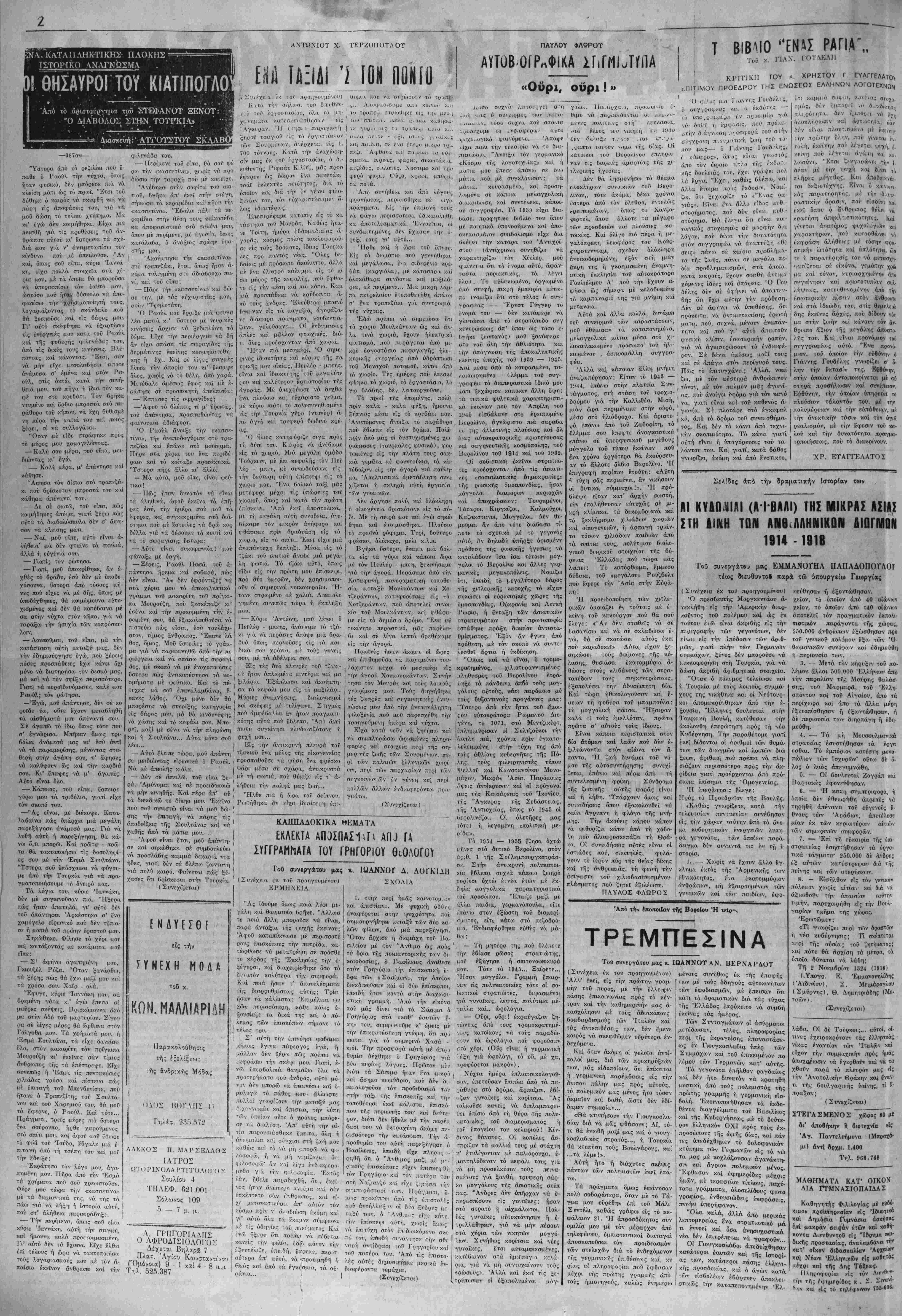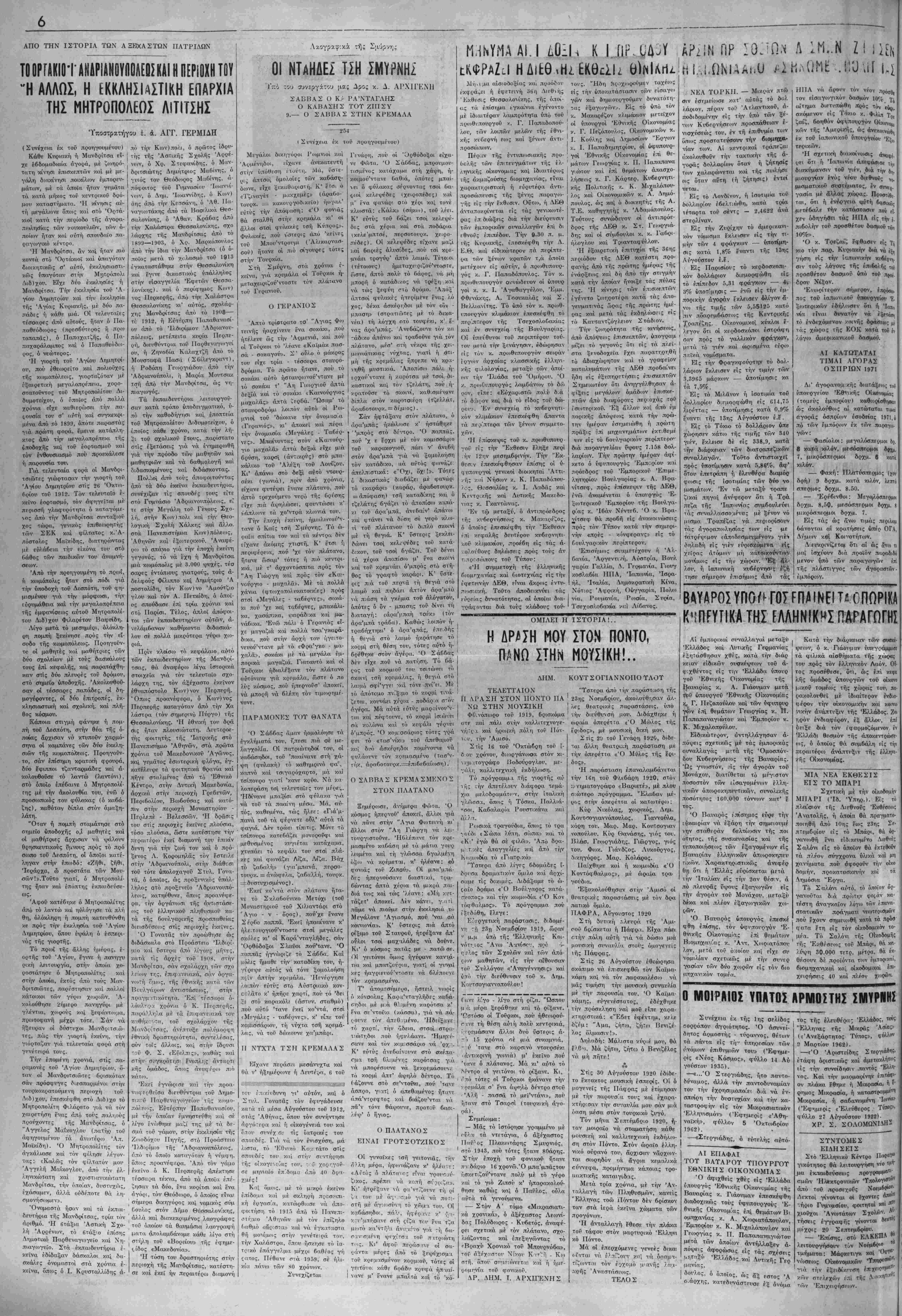 υογρνεϊς τή; ΙΙά<το·ας μέ έτίμησαν μέ την παοονοι'α. τοι; καί εχαρα¬ κτήρισαν την σνναυλία μου σάν μιά &αση μέσα στόν τονρκικό ξυγό. Τύν μήνα Σε.ττέμδριο 1920, ή¬ ταν μοΐφαϊο νά σταματήση κάθε ίιουσική καί καλλιτεχνική έκδή/αο- ση στόν Πόντο. Στόν ώραίο έλλ.η- νικό οϋρανό τού, ά'ρχισαν νάρχοη'- ται σοιρηδύν τα ίγρια κεααλ.ικά ούν-νετρα, ,προμήντμα κάποια; τρο- ιιακτικής καταιγι&'ΐς. Μετά τρία χρόνια, μέ την Άν¬ τ αλλαγή τόν Πλ.Τ[θυσμόν, κανείς 'Ελλ.ηνα; τοώ Πόντον δέν 6ρίβκον ταν στά ίερά ϊκεΐνα χώματα των προγόνοη·. Ή άνταλλαγή τθεσε την πλάκα τοϋ τάφον στόν μαρτυρικό Έλληνι κό Πόντο. Μά οί έπερχόιμ,ενε; γενεέ; δικαι (Γνται νά Ρ.τ'^ουτ ν.α νά όρομα- τίνθντΓ/ι τόν Γ^χο.μό μ-ηνή; λπι,ι- :ίρή; ΆνπατάίΤ,'υις. ΤΕΛΟΣ ΒΑΥΑΡΟίΥηθ^ΓΟΤ,ΠίΙΝΕΙΤίΟΠηΡΙΚΑ Κ'ίΠΡΥΤΙΚΑ ΤΗΣ ΡΛΛΗΝΙΚΚΣ ΠΑΓΑΓΟΓΗΣ Αί έμπορικαϊ στναλλαγαί μεταξύ Ελλάδος καί Λντικής Γρρμανίας εξητάσθησαν χθίς, κατά την διάρ κειαν ειδικόν ουσκέ/ψεον τοΰ ά- ((.χθέντος είς την Έλλάδα νπονρ γοΰ Έθνικής Οικσνομίας τής Βχακιρίας κ. Α. Γιάουμιαν μετά. τΐϋ ύπουργού ΈΟνικής Οίκονθ'μ(ας κν Γ. ΙΤεζοπονλον καί των {>φυπον γ<Γ)ν ίπί θΐμάτων Γεορνία-ς κ. Ιί. Πααιαπαναγιώτον καί Εμπόριον ν.. Κ. Μιχα}>.οπονλου.