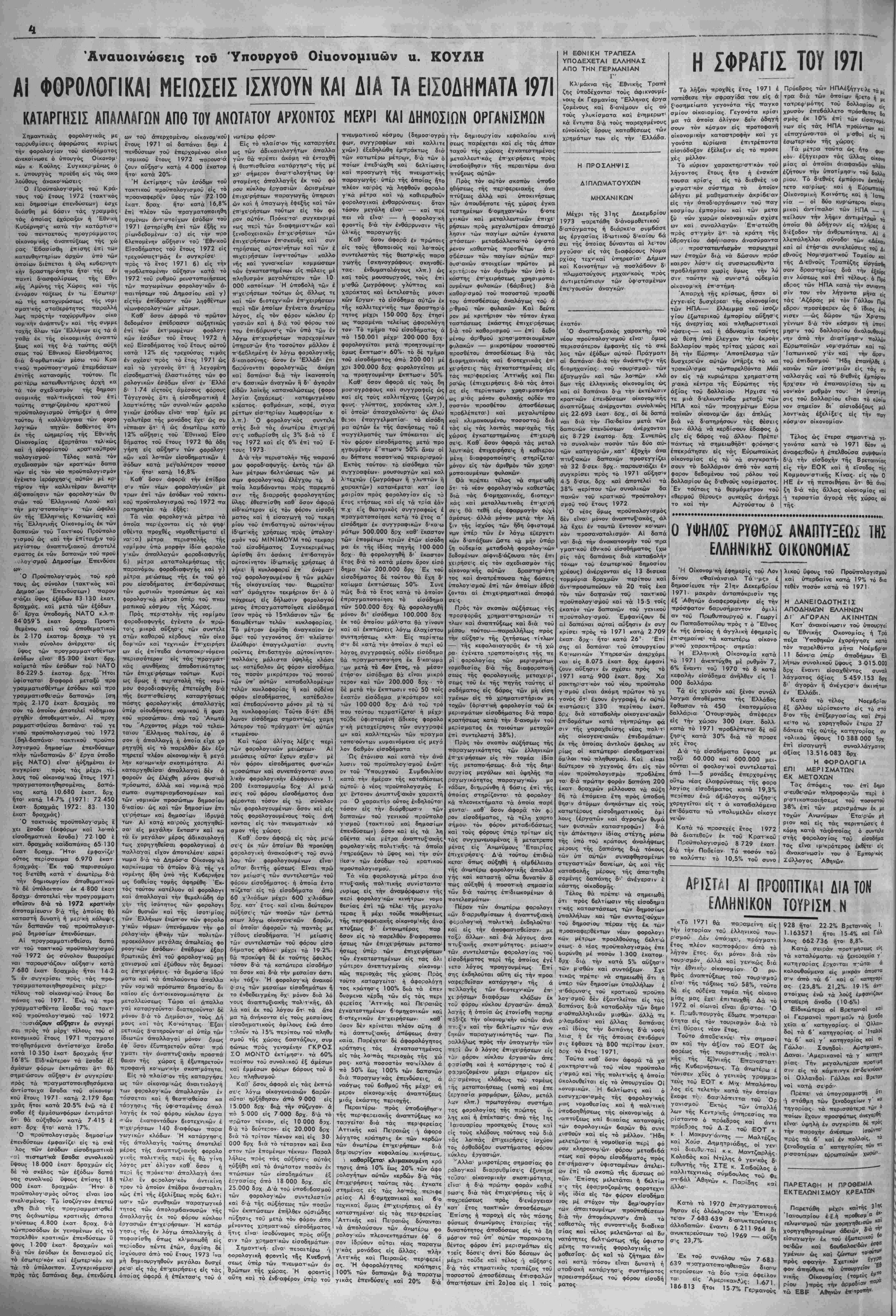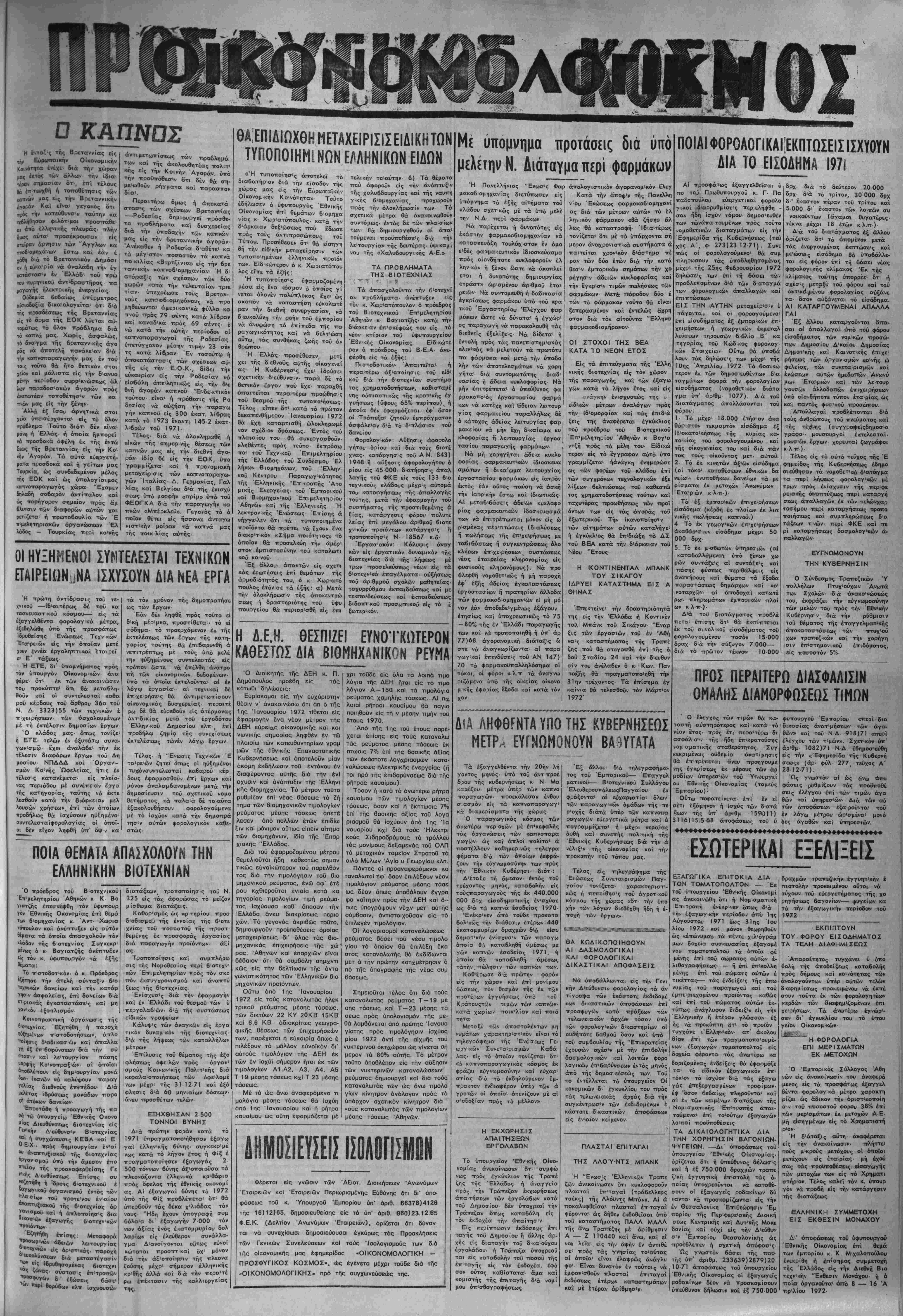 μετά ιής άντιστοίχου τοΰ ^<»ω. ταβλητέου, επί εΐσοδήματος 1971- 2) Νομ. προσώπων μή κερδο- θ'Λθπικοΰ χαρακτήρος. Καταβολή τής 4ης δύσεως τοΰ φόρου, με¬ τά τής άντιστοίχου δόσεως τοΰ π-ροκαταβλητέον. 3) Νομ. προσώπων. Κερδοσκο πικοΰ χαρακτήρος, δτινα Ικλει- σαν Ισολογισμόν τήν 30.6.70. Κβ. ταβολή της 8ης δόσεως τού προ- καταβλητέου φόρου (1)8). 4) Ναμ. προσώπων κερδοσκο πικοΰ χαρακτήρος δτινα Ικλεισαν ισολογισμόν τήν 31.12-70 καταβο λη τής 2ας δόσεως τοΰ φόρον (1)6) μετά τής αντίστοιχον τοΰ προκαταβλητέου (1)8). 5) Νομ. προσώπων υπό έχκα- θάρισιν ή διάλυσιν. Μέχρι ιο,^ 1 ή ύπούολη τής δήλωσις ^, ή καταβολή (έφ' άπαξ) τοϋ φο. ου, έφ'δσον ή εκκαθάρισιν |^. εν ή ή έκκαιθάρισις έγινε την 30. .71. "Αλλως έντός μηνός ολο ής εκκαθαρίσεως ή 6ια τή; διαλιι σεως. ΥΠΟΧΡΕΩΣΕΙΣ ΜΕΧΡΙ 15.11.71 ΔΗΛΩΣίΣ ΧΑΡΤΟΣΗΜΟΤ 'Τπαχρεοι: 'Επιχειρηβεις φ^ι κά η ιομικά Ιΐροσωπα οια τας ε,γγραψεισας εις τα ϋιολια χατα μήνα Όκτωΰριον πράξεις Οιαμονης κερόων και πάσης άποΛήψεων των έτεραιν. ζνι τη υπο6θΛτ"| τής όηλωσεως και η χά ταΟοΛη τού χαρτβσημου. Ε1ΕΡΑ1 ΦΟΡΟΛΟΓΙΚΑΙ Τ11ΟΧΡΕΩ2..Ε1Σ 1) Οί άοχιτέκτονες καίμηχανι κοι υποχρεούνται είς υποδολην θη- λωσεως καί καταβολήν φοοου όια τήν σύνταξιν μελετών, έπιθλεψιι τεχνικών ίργων· κ.λ.π. προ τή; %ο ρηγήσεως τής σχετικής αδείας η τής θεωρήσεως των σχεοίων ω.ι, 2) Οί το πρώτον άρχάμενοι των εργασιών των επιτηδεύματος «κ χρεοΰνται νά ϋποβάλουν σχετικηι δήλωσιν πρός τόν Οίκ. "Εφοροι τής περιφερείας άσκήοεως τοΰ [ πιτηδεύματος καί νά έφοδιασθοίη με τήν υπό τοΰ Νόμου 4045) 1510 προβλεπομένην άδειαν. Ή δήλι» σις δέον νά υποβληθή πρό τής ι νάρξεως των εργασιών* 3) "Επί εκμισθώσεως άκινήτιη κειμένων είς την περιφέρειαν η διοικήσεως Πρωτευούσης, «ρι σταται ϋποχρέωσις ύποβολ.ής η; ιόν αρμόδιον Οίκον. "Εοριορον άν τιγράφου (είς διπλούν) τοΰ ίδιοι τικοΰ μισιθωτηρίου κατά τάς χοτω τέρω διακρίσεις: α) 'Επί καταστή μάτων άινεξαρτήτως ποσοϋ μιοΐώ ματος. β) 'Επί οίκιών μόνον εί; περίπτωσιν σνμβατικοΰ μιβθώμα- τος άνω των 2.000 δραχμών μη- νιαίως. Προθεσμία ύποβθ/ττίς: Έν τος μηνός άπό τής καταρτισεω; τής μισθωτικής συμβάσεως. 4) Δήλωσις άποθηκών: Τ,πό- χρεοι οί έπιτηδευματίαι, οί π«««· θέμενοι νά χρησι,μοποιήθΌΐ^ν Χ<5· ρον, πρός άποθήκενσιν αγαθών, ή έτερον, πλήν τής κυρίας έπαγ γελμχχτικήν έγκατάστασιτνι Ή δή¬ λωσις ΰποβάλλεται είς τόν οίχονο- μικόν εφορον τής περκρερεία; "Ο ύποχρέου πρό πάσης χρησιμοποιτρ σειος των άποθηικών ή τής έ-ταν· γελματικής εγκαταστάσεως (άρ¬ θρον 13 ΚΦΣ). 5) 'Τποβολή κατοστάβε<ον πδ Α. Ε. έντός δίμηνον άπο τής έγ- κρίσεως τοΰ Ίσολογιον0'· α^ *' μεδαπαί Α. Ε. υποχρεούνται νά ύποβάλουν διά τάς όνομαοτιώς μετοχάς, ατομικήν κατάστασιν, δ' έκαστον μέτοχον καί κήνι τοιαύτην μέ τα έν παρ. 1 ΚΦΣ όριζόμενα στοιχεία. 'Επίσης έντός τής αυτής π(?οβΕ· σμίας υποχρεούνται βνς ΐυΐοββλην καταστάσεων διά τάς άμοώάς τ»β Διοικητικοϋ Συμβουλίου «ώ 10^ προσωπικού, τάς παρεχοιιένας δια τοΰ εγκριθέντος Ισολογιβμον- ΣΥΝΤΟΜΙΣΜΟΣ ΕΙΣ ΤΗΝ ΠΡΟΣΠΑΘΕΙΑΝ ΔΙΑ ΤΗΝ ΕΞΑΛΕΙΨΙΝ ΤΗΣ ΓΡΑΦΕΙΟΚΡΑΤΙΑί Τήν σύστασ'ν μονίμων -_ πών έξ άρμοδίω στελεχών τοί μοσίυο 'Μομέωςκαΐ έκιτροσύ1™" των κατά κλάδους ίδιωτΐκ«ν Ψ» ρέων επρότεινεν ό Σύνδεσμος λήνων Β'ομιτχάων πρός τόν 1* πόν τού συστημστικώτερου τονισμού τής προσ-ποθείας την έξάλειψ'ν τής γραφεΌκΡθτ^ Είς σχετικόν έγγ,ραφό"0*- "^ τό υπουργείον Κυβερνητικαί λΐτικής ό ΣΕΒ τονίζεΐ ο'τι ^ βάλεταΐ ή σύστοχτις των βς^. νω μονίμων μΐκτών έττιτροιτ»ν τή έπισήμανσΐν των άνσσχε γραψεΐοκρατικών διστυ1"1"" καί