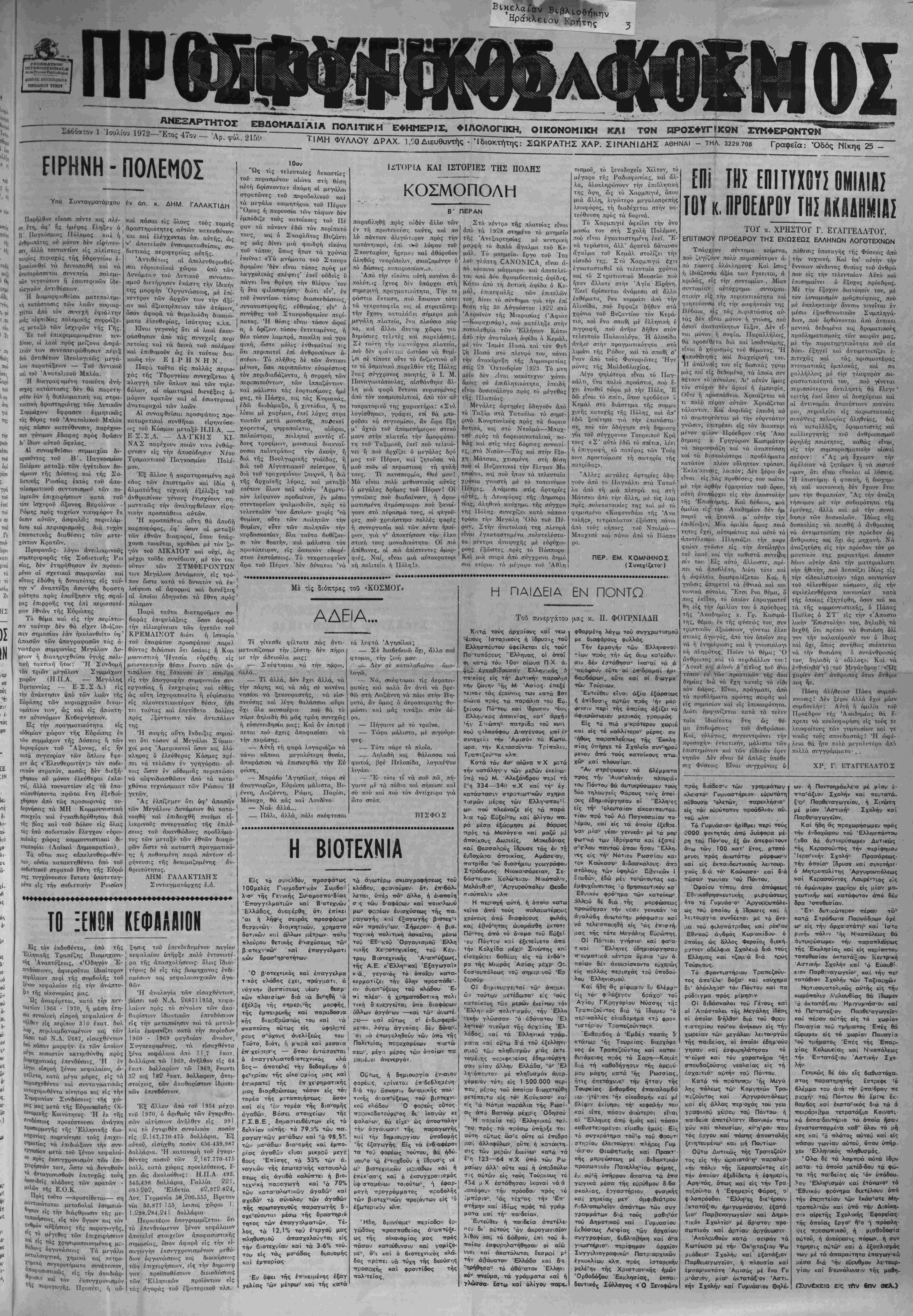 ΤΙΜΗ ΦΥΛΛΟΥ ΔΡΑΧ. 1,50Διευθυντής - 'Ιδιοκτήτης: ΣΩΚΡΑΤΗΣ ΧΑΡ. ΣΙΜΑΜΙΔΗΣ αθηναι - ΤΗΛ. 3229.708 Γραφεϊα: Όδός Νίκης 25 -