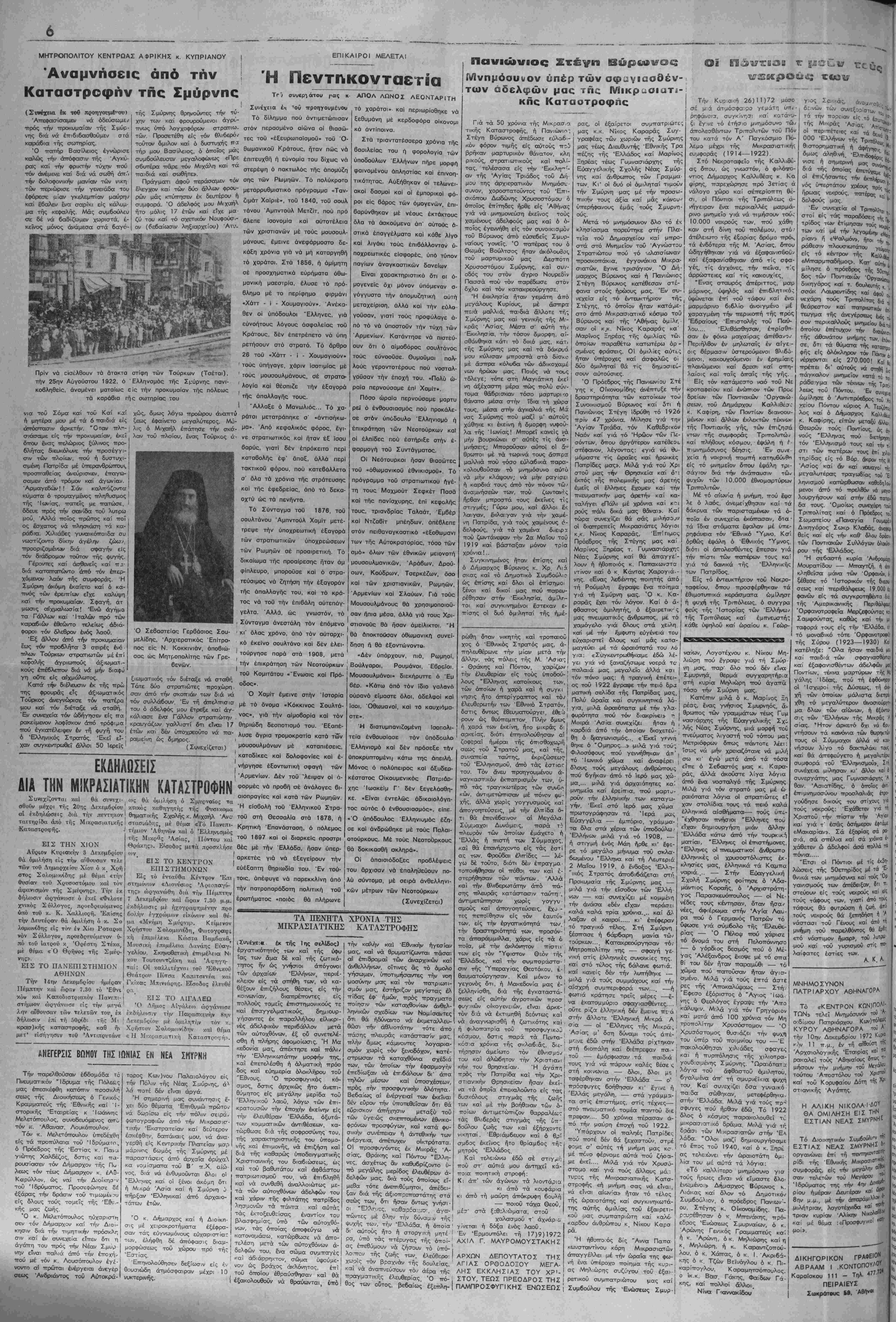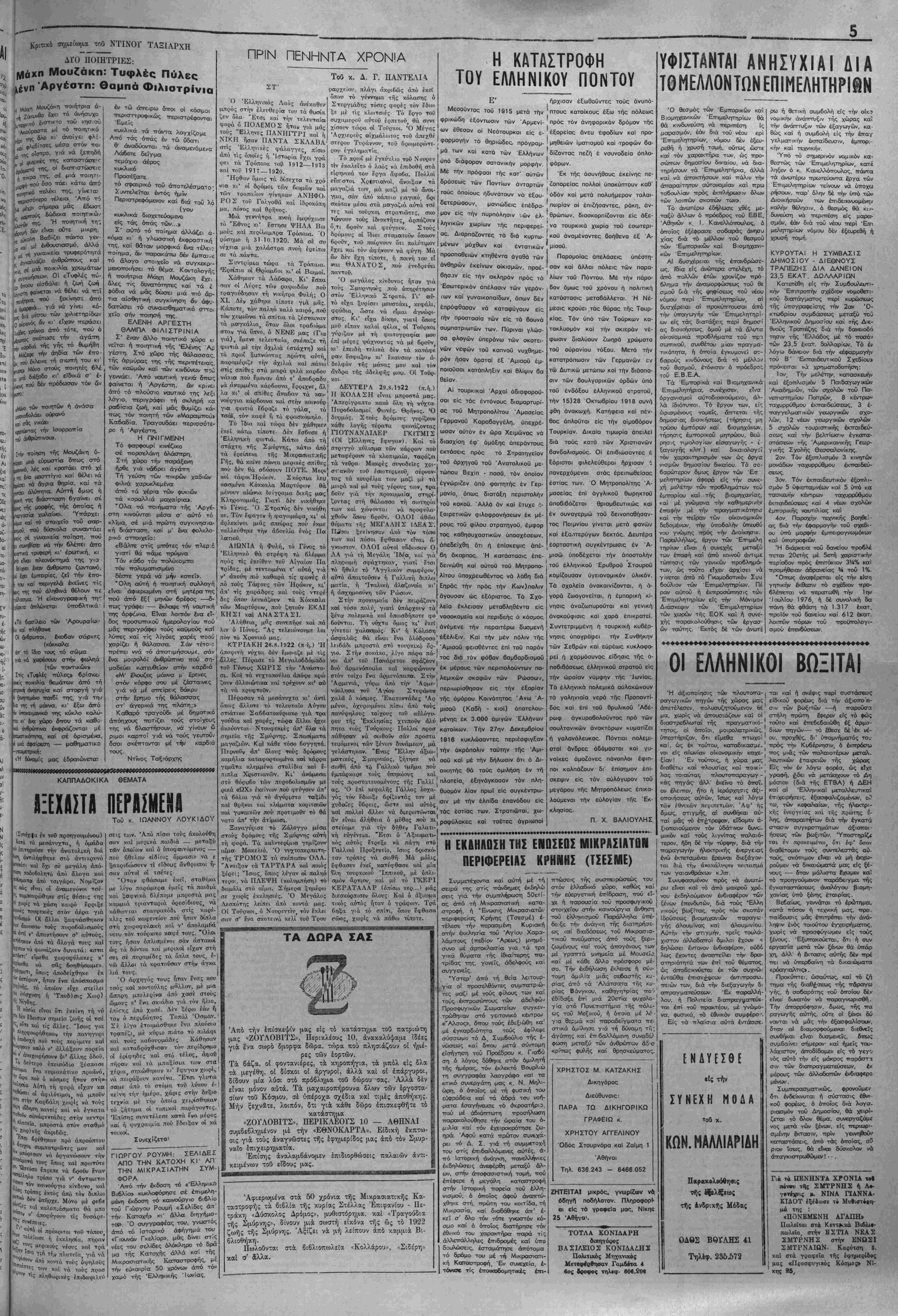 δυσ<όλους στιγμάς τής ζωής τω-^ καΐ ,μέ τήν βοήθςιΐαν των ό- ττοίωτ^ άντιιμετώτπζον θαρραλέως τάς θλιδεράς στιγμάς τής ί,π- &Μου ζωης των και εξήρχοντο νκηταί. Έθριάμβευον καΐ ό θρ' σμβος 6<εΤνος ήτο θρίαμβος τής μητρός Ελλάδος, Καΐ τελειώνω έδώ σέ στιγμτ'; ττοΰ στ' αύτιά μου άντη,χεΐ κά- ττοια ττοιητιική στιροφή: Κ ι άπ' των άγώνων τά λιοντάρια κι άπό τά κουφάμια κ ι άττό τή μαύρη άττόκρυφη 6ουλή — ποιοΰ τάχα Θεού, μέσ' στά ξςθΐλιώματα, στοΰ χ-αλασμού τ' άχνάρ,ο τού — τους γιά στή οΌΐν τά τής χιλιοτρα- παιδία Κ0Π τ ιές θέσες ΥΟι;δ σ.μένης Σμύρνης. Τ, δλοι με Ι λθιΥ1ια τοΰ ότφβαστιού ό,μιλητού, στήν Έλλάδα — ο' 6Υ«λμένα άττ' τή σιμυιρνέϊχι— ψυχη τΓρίσψυγες 6οήθησιαν κι' ενΐνΐ ή τσυ· Κα! σ^εχιζει δσα γυναικό Έ1· ___/λ._ , , ! ττη !^ητ ~,Α____ __ ./ Λ Ταστ'^ — στά γράμμςχ- στ!ς τέχνες— πά.δα νη,ν είναι τταλιά άττό τήν ττού ιιέ τόν κ. ΛουσότΓθυλον έγέ- νοντο α! τΓρώτα, ενεργεια;! άνεγέρ σεως 'Ανδριάντος τοΰ Αύτακρά- £στιας. δ'^ -Λ σωμα μ ής ψυχής τ»,, την Έλλάδα, ή όποία ' γίνετα. ή δόξα ενός λαού. δι αύτους ήτο ή στοργική μητέ Ι Έν Έρμιουττόλει τή 17)9)1972 ρα, υπο τάς τττέρνγας τής όποί-' ΑΧΙΛ Γ. ΜΑΥΡΟΜΟΥΣΤΑΚΗ Σ άς έττεθύ ά ζή 1 ργς τής όποί άς έττεθύμουν νά ζή.ςτς.ί,ιν τό υπό- των- νυκτερινης. ν ^,ωσ,ν είς 4. ^ ά,μόσφα,ραν μέχρ, 10 τού ΑΡΧΩΝ ΔΕΠΟΥΤΑΤΟΣ ΤΗΣ ΑΠΑΣ ΟΡΘΟΔΟΞΟΥ ΜΕΓΑ- στό ·—«'ΐα.-ιατικό τομέα τταντού &ιε: ττρεψαν.... 50 χρόνια πέρασαν ά-] ' ττό την μαύρη έτταχή τού 1922. 'Υπάρχουν οί παληές Πατρίδες πού ττοτέ δέν θά ξεχαα-τοΰρ·', στμέ φθ'με σ' αϋτές τή μνήιμη μας κ£Γ μέ ττό,νο φέρνομε αύτά πού ζήοα- ,μ€ έκεΐ.... Μιλά γιά τόν Χρυσο- στομο κια! γιά τούς άλλους μά: τυρι;ς τής Μικιροοσιατιικής Κατα- «ή μνήμη σας νά είναι, αίωνία» ήταν τό τέλος τής ώραΌτάττηις καί συγκινηκωτά- της αυτής άμΐλίας τού εξαιρετι¬ κόν μας συμττατριώτη καί καλό καρβου άινθρώττου κ_ Νίικου Καρά ρά. Ή ήθοατο ός δίς "Αννα Παττα κω-,ισταντΐνου κόρη Μιικ,ρασιατών άτΓαγγέλλει μέ την ώραΐα της φω- νή ένα ύττέροχο ττοίηιμα τής κυρι- ας ΜηΛιώρης σ^ζύγου τού έξαι·- τού όττοίου άραύσθΓανκα! Ϊ' Γ^ ^"ΓΙΙ ^ άέρα τή': ΛΗΣ ΕΚΚΑΗΣΙΑΣ ΤΟΥ ΧΡ-- <* ΜηΑ,ώρης σ.<ύγου τού έξα, έξακολουθοΰν νΓθΖΕταΓβϊΐ θΓΤΓ'Τ '^' '° ^1 ΣΤ0Υ' ΤΕΩΣ "ΡΕΟΔΡΟΣ ΤΗΣ Ρετ-«ο0 συμττατρ,ώτου μας καί ρανωνται, υπό! θος των ούτος, βεδα,ως έξεττλη-1 ΠΑΜΠΡΟΣΦΥΠ ΚΗΣ ΕΝΩΣΕΩΣ Συμβούλου τής Ενώσεως Σμυρ- Μιλά γιά τούς πρ-1 ήρβαν έδώ. Τό 1922 κόσμος τταιραικολουθεΐ τύ μιικιραισιςττ κό δράμια. Μιλά γιά τή δράσι των Μκιρασιαττών στήν Έα λάδα. "Ολοι μαζί δηιμιουργήσαιμε τό έττος τού 1940, καί ό κ. Ξηρΐ. άς τελειώνει την ώραιοτάτη ό,μ: λυα τού ,μέ αύτά τά λόγια: «Τό καλλίτερο μνηιμόσυνο γισ τοώς ήρωες είναι νά εϊμαστε δλο· έν&:ιμένο,.» Δτίιμσρχιος Βύρωνος κ Λιάκας κα! δλον τό Δημοτικόν Συμβούλιον, ό τη,οόεδρος Πανιων'- ου, Στέγηις κ. ΟΙκονοιμίβης. Πα- ρη,'ρέθησαν ό κ. Μίττενάχης, ττρό¬ εδρος Ενώσεως Σμιυρνιαίων, ό κ. Άρώνης Γενΐικός Γ,ραμματεύς κα! ή κ. Άρώνη, ό κ. Μηλιώρη-ς καί η κ. Μηλιώρη, ή κ. Καραντζοπού- λου, ό κ. Χάητας, ό κ. Ι. 'Ακριβά- ■κΓρς ό ■·<. Τζών ΒεΊΊίόγλου ό κ. Πι- καρΐττογλου, Καραιμητσόττουλος. ο ϊικ,κ. Βαισ. Γάικης, Φαιδων Γά- κης, κσί ττολλο! άλλοι. Νίνα Πανναικίΐδου | ΜΝΗΜΟΣΥΝΟΝ ΠΑΤΡΙΑΡΧΟΥ ΑΘΗΝΑΓΟΡΑ Τά «ΚΕΝΤΡΟΝ ΚΩΝ)Π0ΑΙ· ΤΩΝ» τέλει Μνημόσυνον τοθ "Α· οδί,μου Πατ.ρ·άιρχου Κ) ΚΥΡΟΥ ΑΘΗΝΑΓΟΡΑ τοθ * την ΙΟην Αικεμβρΐον 1972 Κι»?« κ, V 1 1 π.μ., έν τή αιθούση^ της Άρχσιολογΐκής Έταιρίας κ<" "α ροκαλεΐ τούς Άθηναίους δττωί ή ύ Μα μήσουν την μνήμην τού ; τούτου Αποστόλου τού Χρι"10" «αί τού Κορυφαίου Δότη τής ΛΡ1 στιανικής Άγάτ~ς. Η ΑΛΙΚΗ ΝΙΚΟΛΑΪ