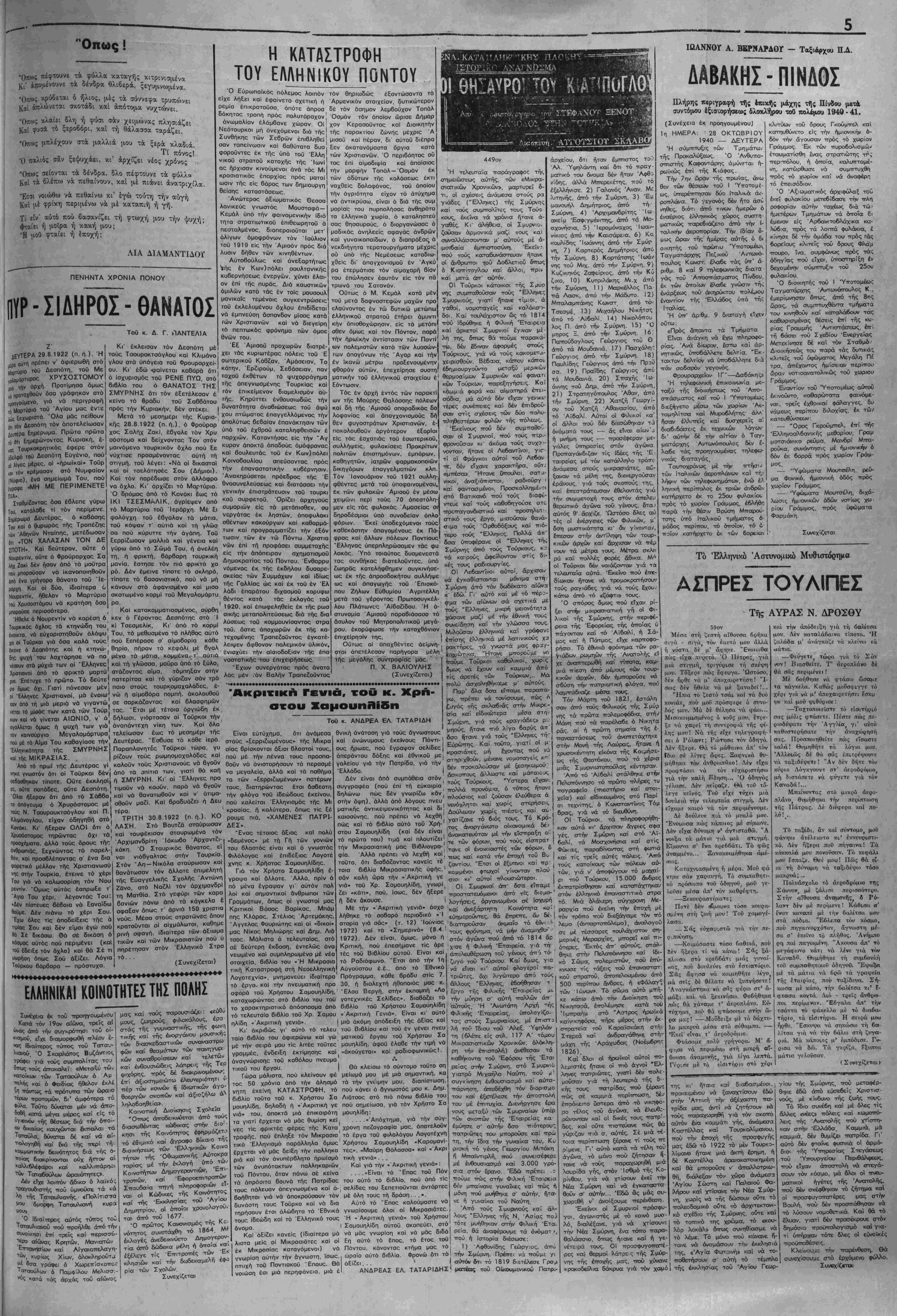 <«ί άξίζειι νά άφιβρω- μειρικιάς γραιμμάς δι' αύ την. Είς τό ττιό μ.ιικιρότβρον χωριό καί είς τό καλλύτερον μέρος, συ- νήθως τπαρα—λεύρως της 'Εχκλη- σίας ύπ·ήρχε τό Σχολείον συντη- ρούμενον άττό τούς κατοίκους ττπϋο χών κου ττλουσίων. "Αν στρέψωμβν τα βλέμιματα τπρός την ΆινατοΙλιικήιν -πλευρόν τού Πόντοο Οά άντικ,ρύσωιμίν τούς. δύο τηλαυγίΐΐς Φάρους, τούς όποι ούς έδηιμΐιούργησοιν οί "Ελληνες είς την τελευταίαν είκοσιττενταί· τίαιν πρό τού Παιγικοσιμίου πολέ μου καί είς τα όττοΐα έξέθρεψαιν μίαν νέαν γεννειάν μέ τα μορφω- ■πΐικά των ίδρύματα καί έξαττέστε1 λάν τταντοί} δττου ήσαν " Ελληνας είς την Νότιον Ρωσσίαν καί είς τόν Καύκασον διδαισκάλους, άπο στόλους των ύψηλών 'ΕΕΘνικών ί- δ&ωδών, έδώ ιμέν τονά>νοντο:ς κα