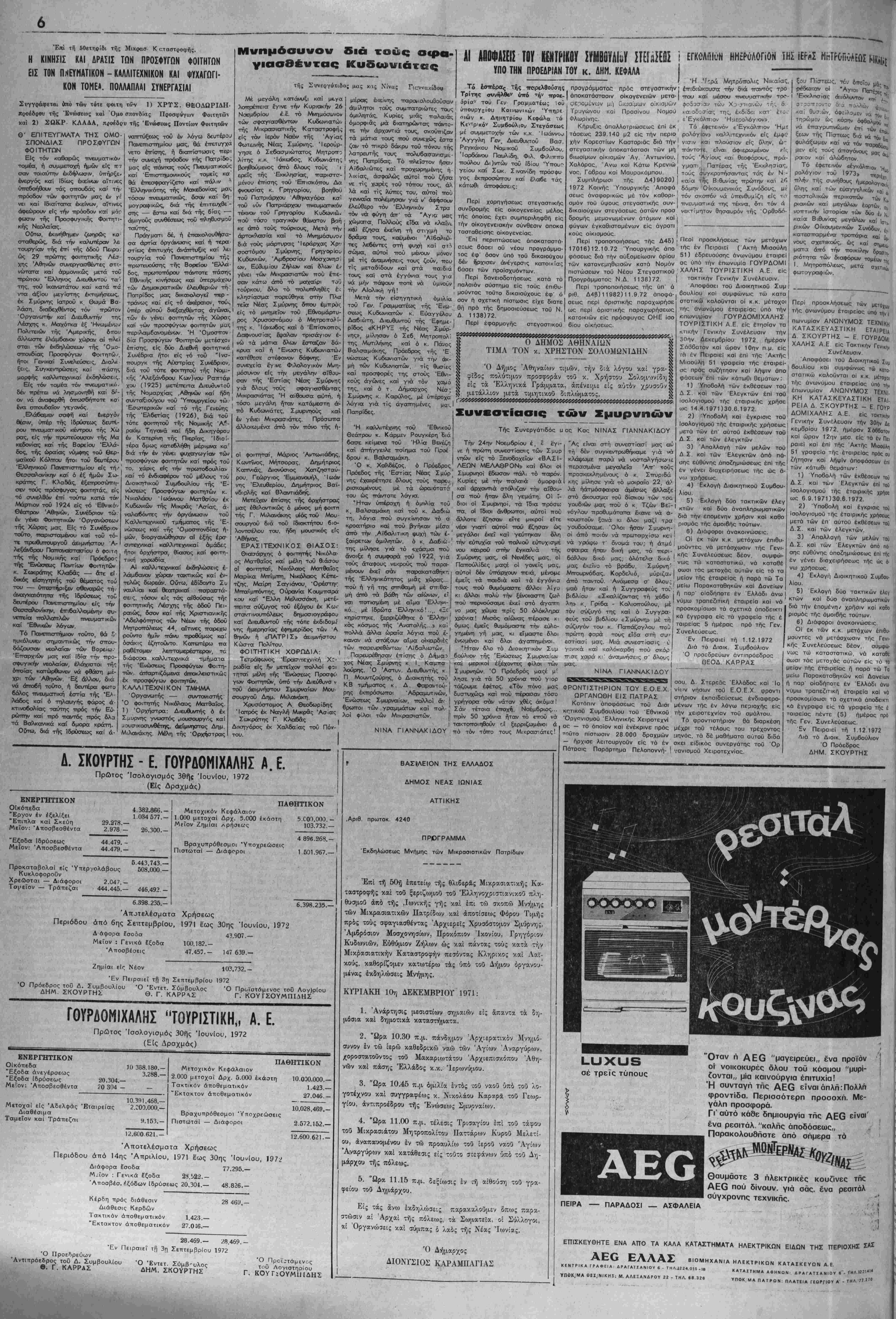 ραιεϊ καί επί τής Άκτής Μιαουλη <ι 51 γραφεϊα τής έταιρείας πρός ου ί Ζήτησιν καί λήψιν άποφάσεων επί ί· των κάτωθι θεμάτων " 1) Ύποβολή των έκθέσεων τού ' Δ.Σ. καί των Ελεγκτών επί τού Ι ίσολογισμοϋ τής έταιρικής χρήοε { ως 6 9.1971)30.6.1972. ί 2) Ύποβολή καί έγκρισις τοϋ ι ισολογισμόν τής έταιρικής χρήσεως μετά των επ αυτού έκθέσεων τοΰ Δ Σ καί των έλεγκτών. 3) Απαλλαγή των μελών τοϋ * Δ.Σ. καί των Έλεγκτών άπό πό· " σης ευθυνής αποΖημιώσεως επί τής ( έν γένει διαχειρήσειυς τής ώς ά- ' νω χρήσεως. , 4) Έκλογή Διοικητικοϋ Συμθου- ■ λίου. ' 5) Έκλογή δύο τακτικών έλεγ ' κτών καί δύο άναπληρωματικών ^ διά την έπομένη/ χρήσιν καί καθο | ρισμός τής άμοιβής τούτων ] 6) Διάφοροι ανακοινώσεις. Οί εκ των κ.κ. μετόχων έπιθυ· ' μουντες νά μετόσχωσιν τής Γενι- κής Συνελεύσεως δέον, συμφώ¬ νως τώ καταστατικώ, νά καταθέ σωσι τάς μετοχάς αυτών είς τό το μεϊον τής έταιρείας ή παρά τώ Τα | μείω Παρακαταθηκών κα'ι Δανείων ή παρ οιαδήποτε έν Ελλάδι άνω ' νυμω τραπείιτική έταιρεία καί νά ' προοκομισωσι τα σχετικά αποδεικτι κα έγγραφα είς τα γραφεϊα τής έ ταιρείας πέντε (5) ημέρας πρό τής Γεν. Συνελεύσεως. Έν Πειραιεί τή 1.12.1972 Διά τό Διοικ. Συμβούλιον Ό Πρόεδρος ΔΗΜ. ΣΚΟΥΡΤΗΣ ι_υχυ3 σέ τρείς τύπους "Οταν ή ΑΕΟ "μαγειρεύει,, ένα προϊόν οί νοικοκυρές δλου τοϋ κόσμου "μυρί- ίονται,, μία καινούργια έπιτυχία! Ή συνταγή τής ΑΕΟ είναι άπλή:Πολλπ φροντίδα. Περισσότερη προσοχή. Με¬ γάλη προσφορά. Π' αύτό κάθε δημιουργία τής ΑΕΟ είναι' ένα ρεσιτάλ. "καλής αποδόσεως,, >