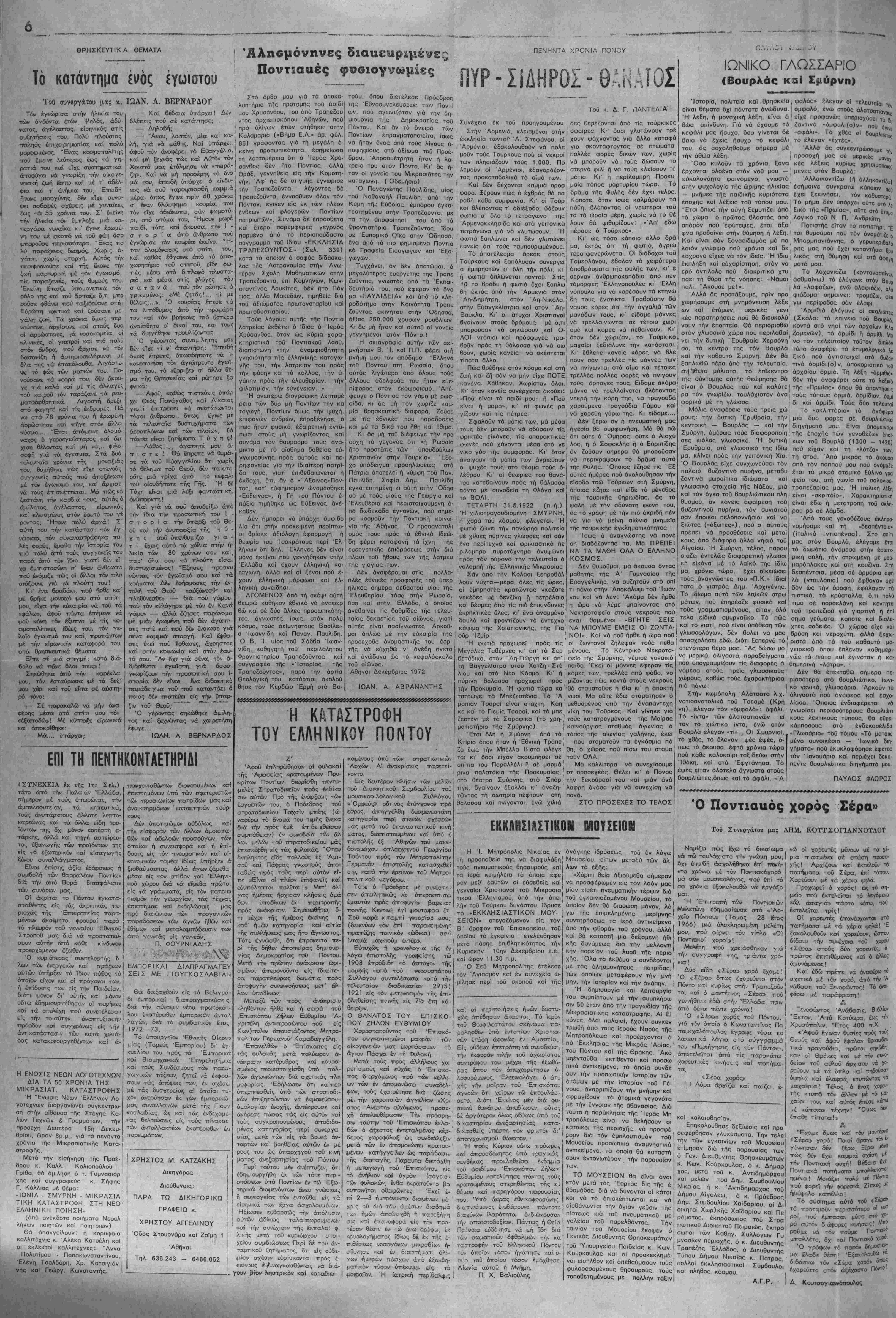 Θε^ύς <αί άφού έψαΐλαν Θρ.αιμβε1-1 τι«ά τιραγούδιχ, τρώτοι σηκώθΐ' κοο^ οί Θρόχες και μέ την σννο- δΐίαν τού αύλοΰ ό:ρχ'<Γθτ/ νά Χ°' ρεύοτ-ν μί τα όττλα ι:αί ίτηδούσα'·1 ύψηιλά κα! έλοιφις'ό:, Κιτι/ττώντσς τ(< μαχαίιρια! Τέλος, ό ενας χορευ- τής κτυπτά τόν άλλον μέ τό μσ.- χα'ριι τού, καί αύτός έττεσί κάτω μ έ κάπο,αν τέχνην! Ό'μως δέν έ'Γ τ ίττοτα!» δ,μως καί τόν μοντέρνί' «Σέρα» χοιρό! Ποιοί αραγε τόν'- γέννη.σαν δέν ξέρω. Ξέρω μ&° ττώς δέν £χει καμμιά σχέση ε1^ την Ποντια·κή ψυχή! Βεβαία έΧΕ Ποντιαι<ά ττατήματτ'α μτταλλετοιτοι ηιμένα! Μοιάζει ττολύ μέ ΠόνΤ'0 ττού φοριϊί την <ρ<ψεΌΊά. Ζίττκεζ Ι*» ήΐ'αύψ-ΐλο καττέλλο! Τό σύστη,μα αύτό τοΰ «ΣίΡ01 τό ττοιςιτ μοΰν ττβρΐ'σθΌτερο ο' νί° ροί, τγο-ύ £μ~ασαν μέσα οτο Χ0" ρό αυτόν δ'άφοίρες κΐ:νή~εις' ^"ο Ρ'θύμε νά τόν ποΰμε μτταιλλέτο, όχι καί Ποντιακό Ό γράφων τό ποορόν ^ μα ελαιδε θέση! 'Εξα<ολοι.θώ ^ δ·5άαΐ<ω τόν ^Σίρα χορό» όιτωί έχορεύετο στόν άξέχοκττο Πόντο· Δ. Κουτοχ>γιοοννόττουλος