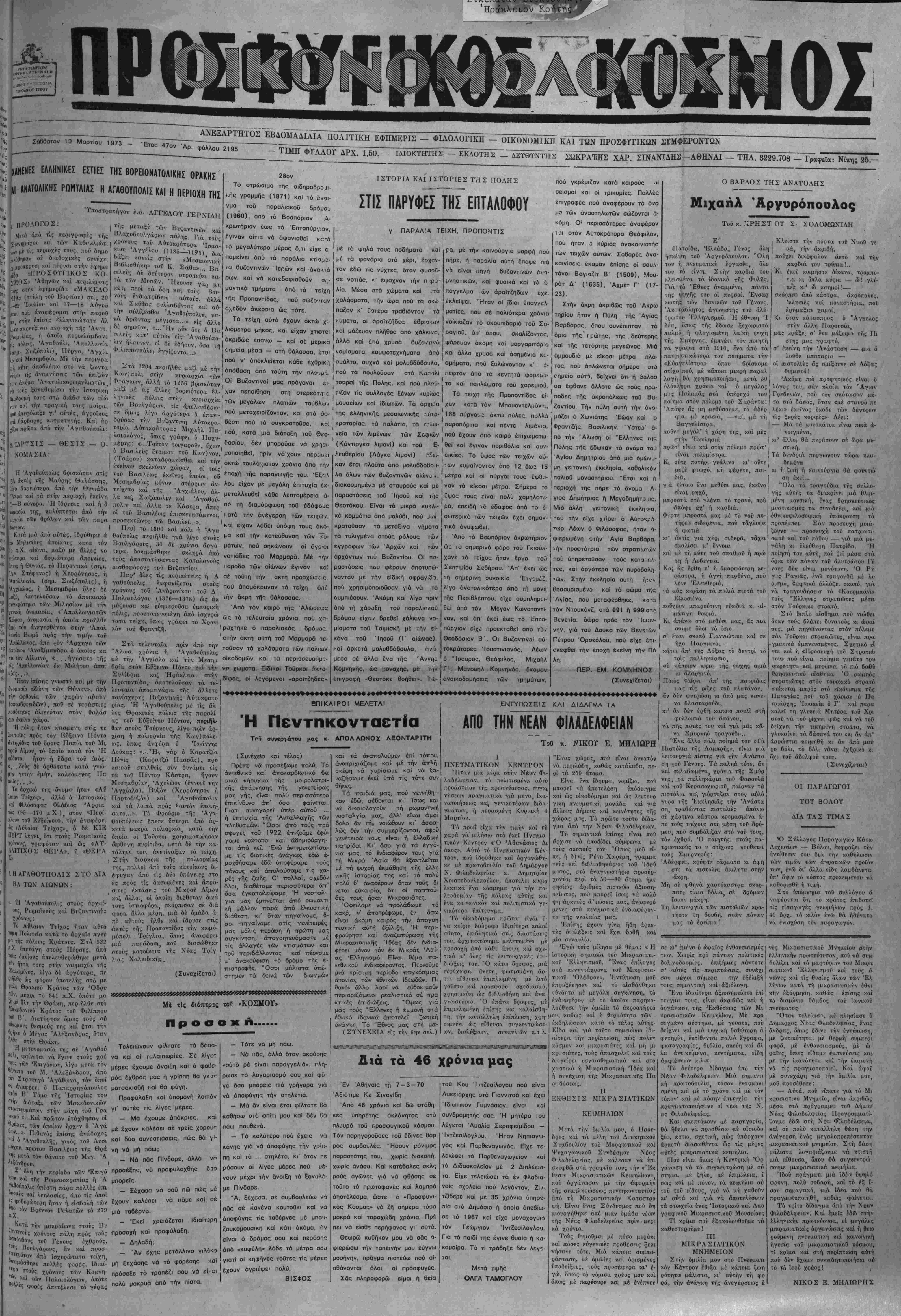ΤΙΜΗ ΦΓΛΛΟΓ ΔΡΧ. 1,50. ΙΑΙΟΚΤΗΤΗΣ - ΕΚΔΟΤΗΣ - ΔΕΤΘΤΝΤΗΣ ΣΩΚΡΑΈΗΣ ΧΑΡ. ΣΙΝΑΝΙΔΗΣ-ΑΘΗΝΑΙ - ΤΗΛ. 3229.7Ό8 -~Τρ"αφεϊα: Νίκης 25.-
