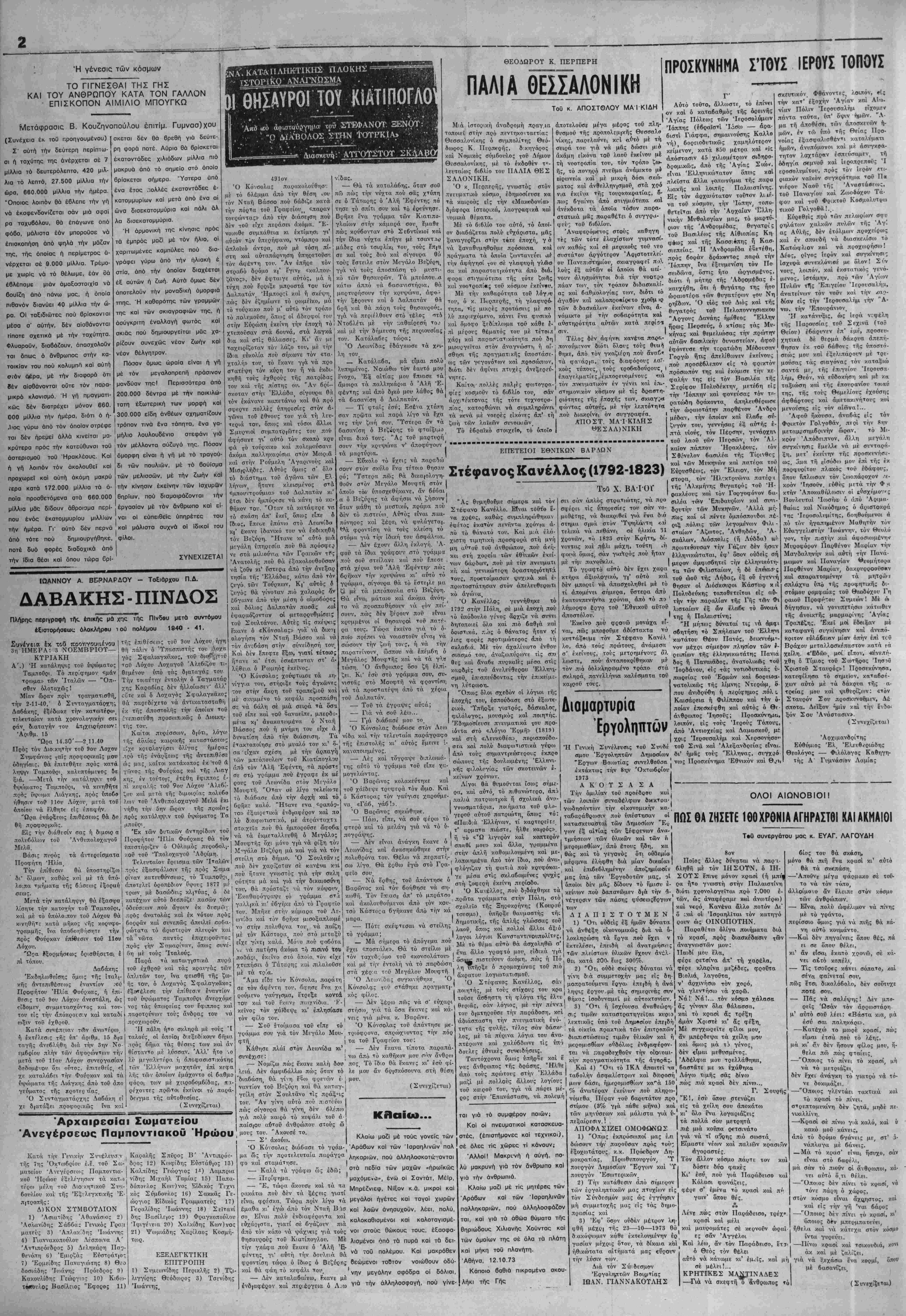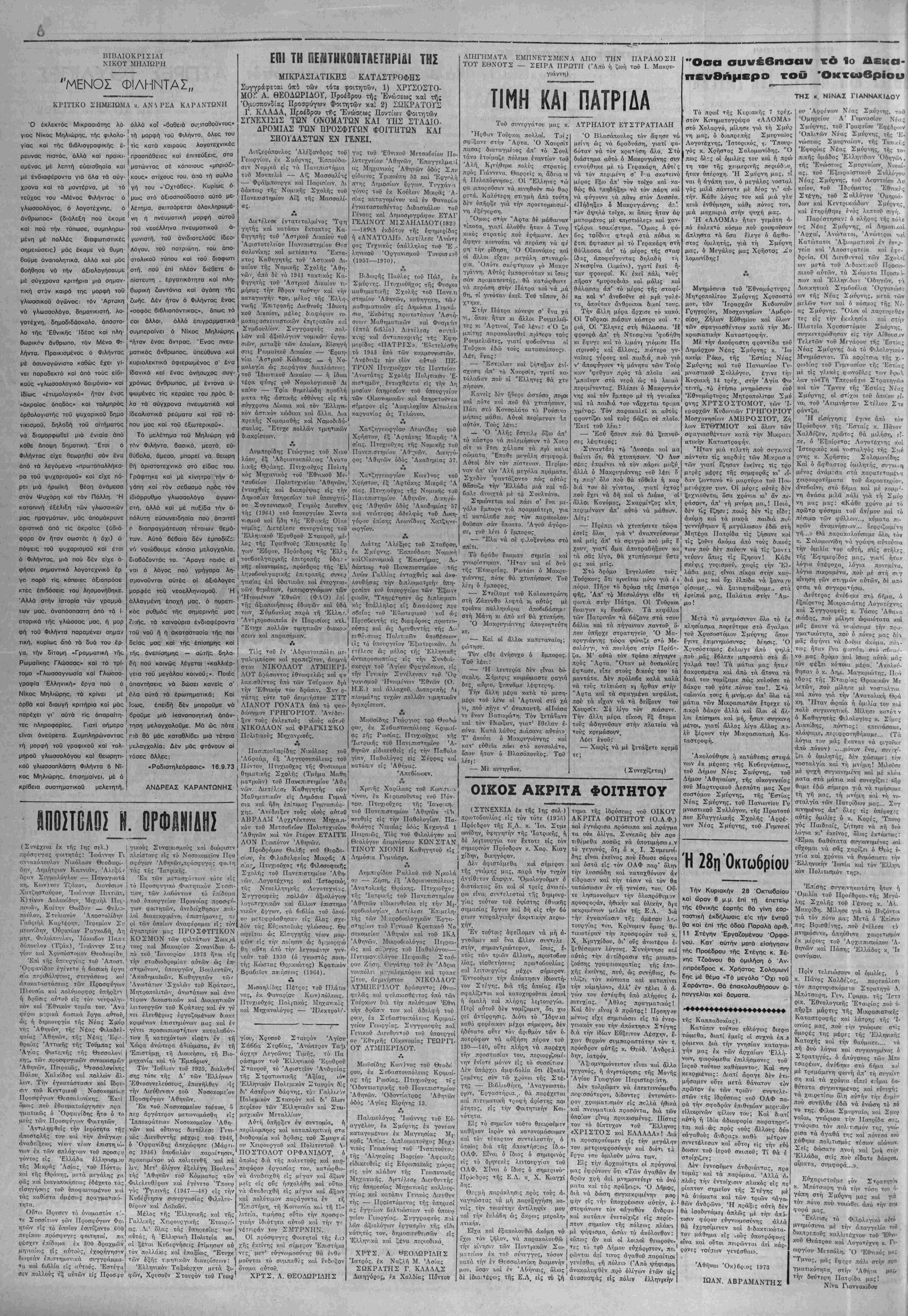 τού μετριοφροσύνην καί διότι τ<ί έίργα τού όμιλοΰν μύνα των. Είς την άρχαιότητα οί πρόγονοί μας έφρόνουν δτι «Των αγαθών άν δρών χρή άεί μνημονεύειν τα όνό ματα καί τάς πράξβ.ς». Ό Δήμος, διά νά δώση συγκεκριμένην μορ φήν είς 'ιήν υποχρέωσιν αύτην, έ· νεί; την ^τοιαύτην αντίληψίν μου ' στεφάνωνε τόν «άγαθόν ανδρα» καί την έκλάδη ώ; άκρως μερολη. καί κατόπιν ένετοίχιζε εί; περίο- πτικήν. ^ ^ | πτον σημείον τής πόλεως πλάκι Είχα καί εξακολουθή άκόμη νά μέ ψήφΐσμα, ώσάν τό ακόλουθον: ϊχω τόν ζήλον, νά παρακολουθώ | «δπιο; άν χ.αί ρ την κίνησιν των Ποντ(ακών Σω- τε; τα τρΰ Δήμου ευχάριστον, ματείιον έκ τοΰ σΰνεγγυ;, τόσον ρώνται άεί τινο; άγαθοΰ παραίτιοι κατά την έν Θεσσαλονΐκη διαμονήν γενέσθα! τή πόλει» (Άπό ψήφισμα μου, δσον λαί έν 'Αθήναις, δλω; ( άνακαλνφ θέν πρό ολίγων έτών είς δέ Ίδιαιτέβω; τής Ε.Λ. είς τό ζή ανασκαφάς εί; πόλιν ελληνικήν Η 28η Οκτώβριον Την Κυριακήν 28 Όκτωβοίου καί ώραν 6 μ.μ. επί τή έπετείω τής έθνικής εορτής θά γίνη έοο- ταστική εκδήλωσις είς την έντταΰ θα καί επί τής όδοΰ Παραλά αριθ. 11 Στέγην 'ΕργαΖομένου Όρφα- νου. Κατ" αυτήν μειτά είσήγησιν τής Προέδρου τής Στέγης κ. Ξέ- νης ΤΖοάνου θό ομιλήση ό Άν- ππρόεδρος κ. Χρήστος Σολομωνί δης μέ θέμα «Τό μεγάλο "Οχι τού Σαράντα». Θά έπακολουθήσουν α¬ παγγελίαι καί δσματα. *♦♦♦♦♦♦♦♦♦♦♦♦♦♦♦♦♦♦♦» τή; Καππαδοκία;). Κατόπιν τούτου εΰλόγο); διερω τώμίθα, διατί εμείς οί σιχνά έπ.ι ρόμενοι διά την γνησίαν καταγω¬ γήν μας έκ των άρχαι'ων 'Ελλή- νων, φωρώμεθα έπιλήσμονε; τοϋ ίες;οΰ τούτου καθήκοντοΓ;. Καί -ητγ κ.εκριμένω;: Διατί άραγε δέν έτι- μήσαμεν ονίτε μετά θάνατον τόν πρώτον έκ των τριών συντ,:λε- στών τή; ίδρύσεο); τοΰ ΟΑΦ πα¬ ρά την σφοδράν επιθυμίαν μερι·.ών είλικρινών φίλων τού; Καί διατί αυτή ή ιδία άδιαφορία ρηρΤ ται καί ώ; πρός ι ούς άλλους δύο «άγαθούς άνβτα;» καθά συνετέλεσαν καί ούτοι εί; την εΰό δωσιν τοΰ ίεροΰ σκυποΰ; Τί θά ί στοίχιζεν; Δέν εννοούμεν άνδριάντας, προ τομά; καί τα παρύμοια. Άλλά <^ πλώ; την έντοίχισιν πλακό; εί; ρίοπτον σημείον τή; Στέγης μέ τα όνύματα καί των τριών «αγα. θών άνδρών». Ή πράξις αυτή δέν θά ισοδυνάμει απλώς μέ την άπί· τκτιν φόηου εΰγνο>μοστ5νης άλλά