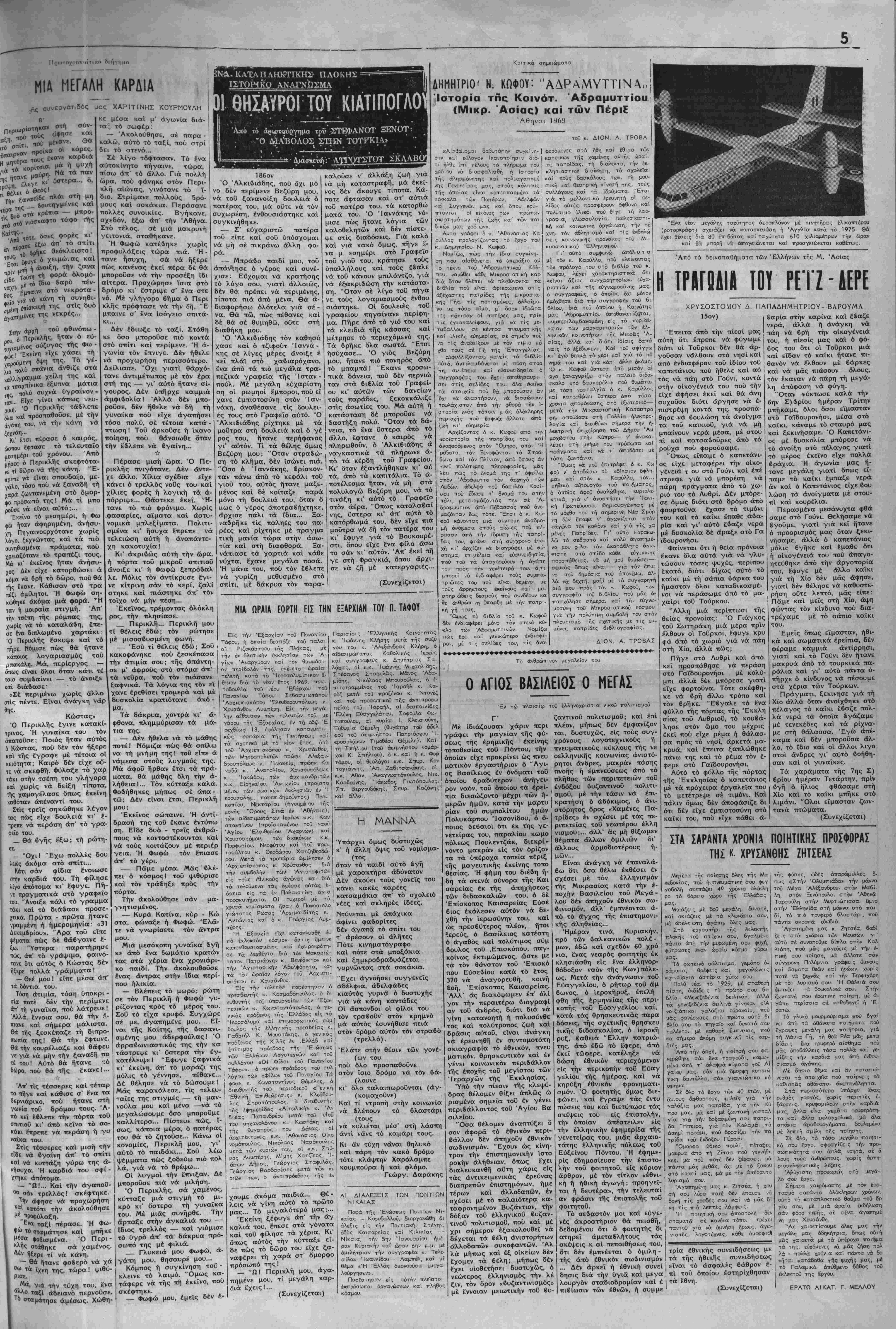 Μαρ<ιέλλα στό Νταραγάτσι. Τα «ττροάστειά» τση καΐ τα τρο γύρω κο'ντακιανά θαλασσινά χω¬ ρία εϊ'χανε κι' άττό μίαν έκκλησιά, έξόν τό Κορδελιό πού 'χε δυό. Αύ- τά ήτα»ε, άτττή μιά μεριά, ό Προ φήτ' Ηλίας μέ έκκλησιά τό ϊδ 3 δνομα άψηλά στό 6ουνό κο'ντά στσΐ Καμάρες, ό Μποζγιοκας Ά μέ Δις ή μ λειος, ήρι'.<νε μέ μεγάλη έπισημό- ΐητα τό Στοχιρό στή θάλασα. Άν^\ιερα λοιπόν ά9°ΰ ήτελευ' ή λειτουργιά στήν έκκλησιά, τό μέ- ρος αύτό τοΰ ΚαΤ ήτανε ξεχΰλσ <όσμο. Οί έπίσημοι "Ελληνες καΐ Τοθρκοι οιττάνω στό σάτι ήττερ μ'- νανε τό Βσσίλειο, καΐ ή «φιλαρμο- νίκη» ήτταιζε διάφοιρες μάρσες. Ό Βιχσίλε'.ος ήφει.·γε. άτττήν "Αγια Φυ ντομβνος μέ τα χρυσά άμφ<3, μ τή μίτρα, την ττατερίτσα κσί τό μαλαματένιο σταυρό τοΰ χεριοϋ. "Ημπαινε στήν ττοώτη κ,αοότσα μΐ τό δάκο καΐ ό βράκας κσβάσης ήαν£6αινε νά κάτση δίπλα στόν κα?οτισιιέρη. Στή δευτέρα κσρότσβ ήμ—αίναν€ οί —αιιΐ'ΐιάθΕς, στήν τρ!· τη οί ψπλτάΕες καΐ στην τέταρττι οί δηαογέροντοι. ΟΊ τέσσεοις κο- ρότσες ή μιά 'ποττίσ' αιι ιήν άλ¬ λη, σάν ήφτά-ανε στό^ ΚαΤ, μέ δυσκολία ήμττορούοχχνε νά ττεοά σοιονε. Ά*ο0 ήανεβσίνανε ούΧο1 αύτοι απάνω στό σάτι κ' ήγενού' ντσνε τό τιρισάγιο, τότες ό Βασί¬ λειος ήριχνε μέ δύνσμι μέσ' τή θα λασσα τό μαλαματένιο τού στσυ- ρό τοθ χεριοϋ, χωρίς νά τονε 'χη δεμένο. Κ' εύτύς καμμιά δεκαρισ βοιοτηχτάδες τση δουλειάς (έττσγ- γελμΐατίες) Ρωμ^ιοΛ καϊ Τοθρκοι άράτιηδο·, τσίτσιδθι καΐ μόνε μ' ενα σοδρακάκι, ήβοντούσανε μίσ' στή θάλασσα ττοιός θά ττροκάνει νά '6οη τό σταυρό νά τονε φέρη (Λευκαία Πηγή) μέ τσοί "Αγι' Ά στ0 Βαα.ίλειο καΐ νά ττάρη τήν εΰ- νάργυροι, τό Καρατάσι μέ την "Α λογία τού. Μά την "δια στιγμή τ6 ργρ για Παραακευή, ό Ζσρχανάς (Παλ. ΐ ί Κί βαπόοια τού Παντολέων· σημαιεστο ό Σφαγεϊα) μέ την Παναίτσα (Κοί- λ,σιιένα ματζί μέ τ' άλλα ξενικά μησις Θεοτόκου), ή Καραντί^σ μέ | β—,-όρια τ' άοαγμένσ ήσφυρίζανε τή Μεταμόοφκση, ό Κιοστεπές μέ δυνατά μέ τσϊ μπου'ροϊδες τως, τόν "Αη Παντελεήιιονα καΐ τό Κο- κάογιαλι μέ την "Αγια Μαρίνα. Άτττήν άλλη μεριά, ήτανε τό Μερ- σ νλΐ μέ τήν Παναγ ά τή Μερςτινιώ τισσα (Μυρτιδιώτισσα), τό Μττα- ριακλϊ μέ την Άνάληψη, ή "Αγια Τριάδα μέ έκκλησιά τό Τδιο δνο¬ μα, τα Πετρωτά μέ τόν "Αη Παν- τελεήμονα, τό Άλά' μττεϊ αέ την "Αγια Μαρίνα, τα Κορδεγιό μέ την "ΑγιΌ-ν-"Αννα, Μητρόπολη 'Εφέσ- σου', καΐ τάν "Αη Γιάννη τό Φοτν- στή (Γενέθλα) στοΰ Πιλάφα^ «τού ΠατττΓο; ή σκάλα» μέ τή Μεταμόρ- φωση καί «τού Τομάζου» μέ τόν "Αη Δημήτρη. Κι' ουλες αύτές ή¬ τανε δεκάξη έκκλησιές. "Οσες έκικλησιές ήτανε κο'ντά στή θάλασσα κ' εΤχοΐνε την εϋκο- λία, ήρΐχνανε τό Σταυοό μέσ' στή θάλασσα. "Οσες δέν ήτανε κο'ντά, ήοίχ;ανε τό Σταυρό μέσα στήν κο μπονροϊδες 'καϊ ματζί ήποτιζε κ' ή «ψιλαρμο- νιχή». (Συνεχίζεται) Διδ)τωρ ΔΗΜ. Ι. ΑΡΧΙΓΕΝΗΣ ΝΕΑΙ ΕΚΑΟΣΕΙΣ ΚΟΣΤΑ ΖΟΜΠΟΥΛΙΔΗ: ΙΣΤΟΡΙΑ ΤΗΣ ΙΤΑΛΙΚΗΣ ΛΟΓΟΤΕΧΝΙΑΣ Έκυκλοφόρηοε μ!α ούντομη άλλα περιεκτικωτάτπ ένημε- ρω^ιένη Ίστορία τής Ιταλικήί Λογοτεχνίας τού κ. Κώστο Ζουμπουλΐδη, πού 6ρχ(ζει ά¬ πό τίς πηγές της καΐ τόν Δόν λυ'μπή9ρα, έξόν άν είχανε "Αγιασ | τη, ώς τίς ήμέρες μ'ας. Τό δου πρός λήψιν καταδικάση- | κατά των Ιταλών ψηφοφόρων """----' "·■■·"··" ---·-» ' συναδέλφων των καί διά τής κης κατ' αύτοϋ Συνοδικής α¬ ποφάσεως άντέδρασε κατά δύο διαφόρους τρόπους, συ- έιτεμβάσεως τοϋ βασιλέως τής Γαλλίας Φιλίππου νά έπιτύ- νετώς καί άσυνέτως. Συνετώς · χούν τήν εκλογήν Γάλλου τήν μέ καί κανονικώς, διότι £- έθνικότητα Πάτΐα υπό τό 6- σπευσεν εγγράφως νά χαρα- ' νομα ΚλήμηςόΕ' (1305— κτηρίση τάς κατ' αύτοϋ κα- ' 1314). Καί ό Γάλλος αύτ