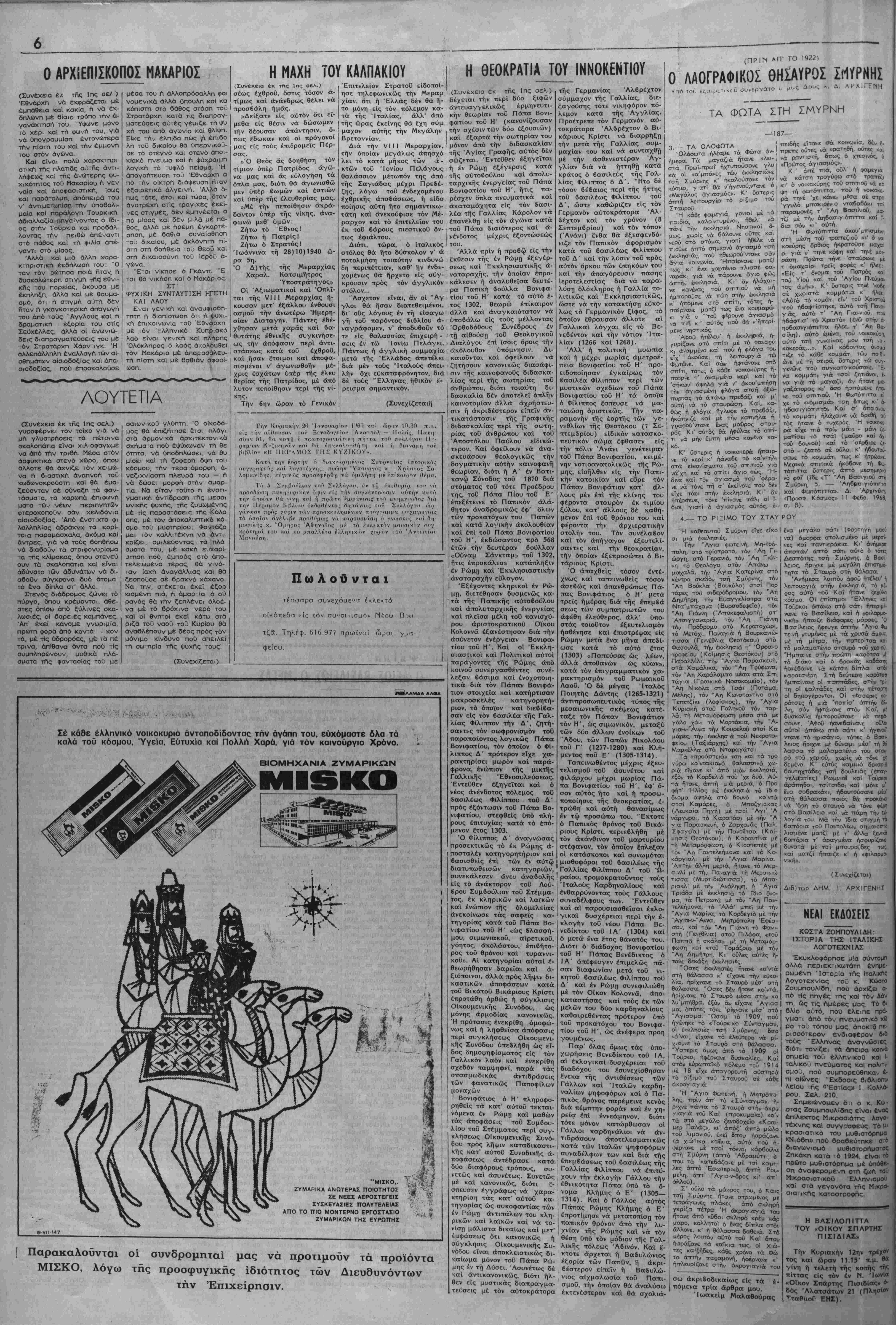 εΤχε πάε1 στήν έ<κλησιά. Κι' άν ήιτέρσευε, τονε 'πίνανε ττάλι οί I- διοι, γιατΐ ό αγιασμός αύτός, έ- πευτικόν σώμα έφθασεν είς τήν πόλιν Άνάνι γενέτειραν τοΰ Πάπα Βονιφατίου, κειμέ- νην νοτιοανατολικώς τής Ρώ¬ μης, εΐσήλθεν είς τήν Παπι- κήν κατοικίαν καί εδρε τόν Πάπαν Βονιφάτιον κατ' άλ- λους μέν επί τής κλίνης του φέροντα σταύρον έκ τιμίου ξύλου, κατ' άλλους δέ καθή- μενον επί τοΰ θρόνου του καί φέροντα τήν άρχιερατικήν στολήν του. Τόν συνέλαβον καί τόν άπήγαγον έξευτελί- σαντες καί τήν θεοκρατίαν, τήν οποίαν έξεπροσώττει ό Βι- τάριους Κρίστι. Ό άπαχθείς τόσον έντέ- χνως καί ταπεινωθείς τόσον άσεβώς καΐ άπανθρώπως Πά- πας Βονιφάτιος ό Η' μετά τρείς ημέρας διά τής έπεμβά σεως των συμπατριώτην τού άφέθη έλεύθερος, άλλ' υπο¬ στάς τοιοΰτον έξευτελισμόν ησθένησε καί επιστρέψας είς Ρώμην μετά £να μήνα άπεβί- ωσε κατά τό αύτό έτος (1303) «Παπεύσας ώς λέων, άλλά αποθανών ώς κύων», κατά τόν έπιγραμματικόν χα- ρακτηρισμόν τοΰ Ρωμαϊκοϋ Λαοϋ. Ό δέ μέγας Ιταλός Ποιητής Δάντης (1265-1321) άντυΐτροσωπευτικός τύπος τής μεσαιωνικής σκέψεως κατέ- ταξε τόν Πάπαν Βονιφάτιον τόν Η', ώς σιμωνικόν, μεταξύ των δύο άλλων ένοίκων τοϋ "Αδου, των Παπών Νικολάου τοΰ Γ' (1277-1280) καί Κλή- μεντος τοΰ Ε' (1305-1314). Ταπεινωθέντος μέχρις έξευ- τελισμοϋ τοΰ άσυνέτου καί φιλάρχου μέχρι μωρίας Πά¬ πα Βονιφατίου τοΰ Η', έφ' 8- σον αύτός ήτο καί ή ττροσω- ποποίησις τής θεοκρατίας, έ- τρώθη καΐ αυτή θανασίμως έν τφ προσώπω του. "Εκτοτε ό Παπικός θρόνος τοΰ Βικά- ριους Κρίστι, περιεβλήθη μέ τόν άκάνθινον τοϋ μαρτυρίου στέφανον, τόν οποίον έπλεξαν οί κατάσκοποι καί συνωμόται «Αύτό τό κομάτι εΤν' τού Χ( πού ήβαφτίστηκε, αύτό τσή Πανα¬ γ άς, αύτό τ' "Αη Για·νιοΟ, ττού ήβάφτισ' τό Χριστό» (ένώ στήν ά- ηοβασιγιότηττα ήλεε, τ' "Αη Βα- σίλη), σ.ύτό έμένσ, τού νοικοκύρη, αύτό τσή γυναίκας μου τσή ,ο. κοκε,ράς...». Καί κό6 όντος ό.ομά τιζε τό κάθε κομμάτ. τώνπθ'δι- ώ.ε μέ τή σειρά, ϋστερις τώ συν- γενώνε ττού συγκατο «ούσανε. "Ε¬ να κομμάτι γιά τσοί ζητιάνοι, Ι¬ να γιά τό μ<χγσζ, άν ήτανε μα- γαοζάτορας κ:' 'όσο ήαττόμενε ήτο- νε το3 σττιτιοΰ. Ή Φωτόττιττα εί χε τό «νόμισμά» τση όπως κ ' 6- ηβασιγιόττιττβτ. Καΐ σ δττοανου τό κομμάτι ήλάχαινε νά δρεβη, αθ τος ήτανε ό τυχερός. Ή νακοκε- ς ή ,ρά εΤχε τπό ττρΐν ό ά - μάνι ζε· ,ρά χ ρ μ^ ζ ματίσει τό τσάι (μούρο καΐ δχι τού δοΐΑθύ) καΐ τό 'σέρβιρε ζε- στό - ζεστό σέ οθλθι κ' ήδοι/τοίι- σα,νε τό κομμάτι τως κ' ήτρώαι.ε Μει?ι«ά σττιτικά ήκόβανε τή Φω- τόττιττα Οστερις άτττό μεσημερισ νό φαΐ (ίδε «Τ' "Αη ΒασιγιοΟ στή Σμύρνη, 5. — ΆηβροιγιότΓϊ—α :καί Φυτόπιττσ». Δ. Άρχιγένη, Κόσμος» 11 Φεδο. 1968, σ, β). 4.— ΤΟ ΡΙΞΙΜΟ ΤΟΥ ΣΤΑΥ ΡΟΥ Ή καθεαυτοΰ Σμύρνη εΤχε εΐκο | ενα μεγάλο σάτι (Φοο.τηγή μαοθ σι μιά έ<«λησιές. ι να) όμοοφσ στολισμένο μέ μερσί- Τήν "Αγια φωτεινή, Μη-τρό- Ι νες καΐ τταντιεράκια. Κ'" άνήμερσ ττολη, στό τρίο-τρατο, τάν "Αη Γι- άττοττάν' άτττό σάτι αύτό ό τόττνς ώργη, στό Γε,ρανιό, τόν Άη Γιάν- | Δεσττότιις τσή Σμύρνης, ό Βασί- Άτσιγγακχριά, τόν τόν Πρόδρομο στό Π ά βασισθείς επί των έν αύτφ Ι μισθοφόροι τοΰ βασιλέως τής διατυπωθεισών κατηγοριών, Γαλλίας Φιλίττπου Δ' τοϋ Ώ- συνεκάλεσεν άνευ άναβολής | ραίου, τρομοκρατοθντος τούς είς τό άνάκτορον τοϋ Λού- βρου Συμβούλιον τοϋ Στέμμα- τος, έκ κληρικών καί λαϊκών καί ενώπιον τής όλομελείας Ίταλούς Καρδηναλίους καΐ ένθαρρύνοντας τοΰς Γάλλους συναδέλψους των. "Εντέυθεν καΐ αί παρουσιασθείσα! έκλο- άνεκοίνωσε τάς σαφεΐς κα- ! γικαί δυσχέρειαι περί τήν ε¬ τηγορίας κατά τοϋ Πάπα Βο¬ νιφ