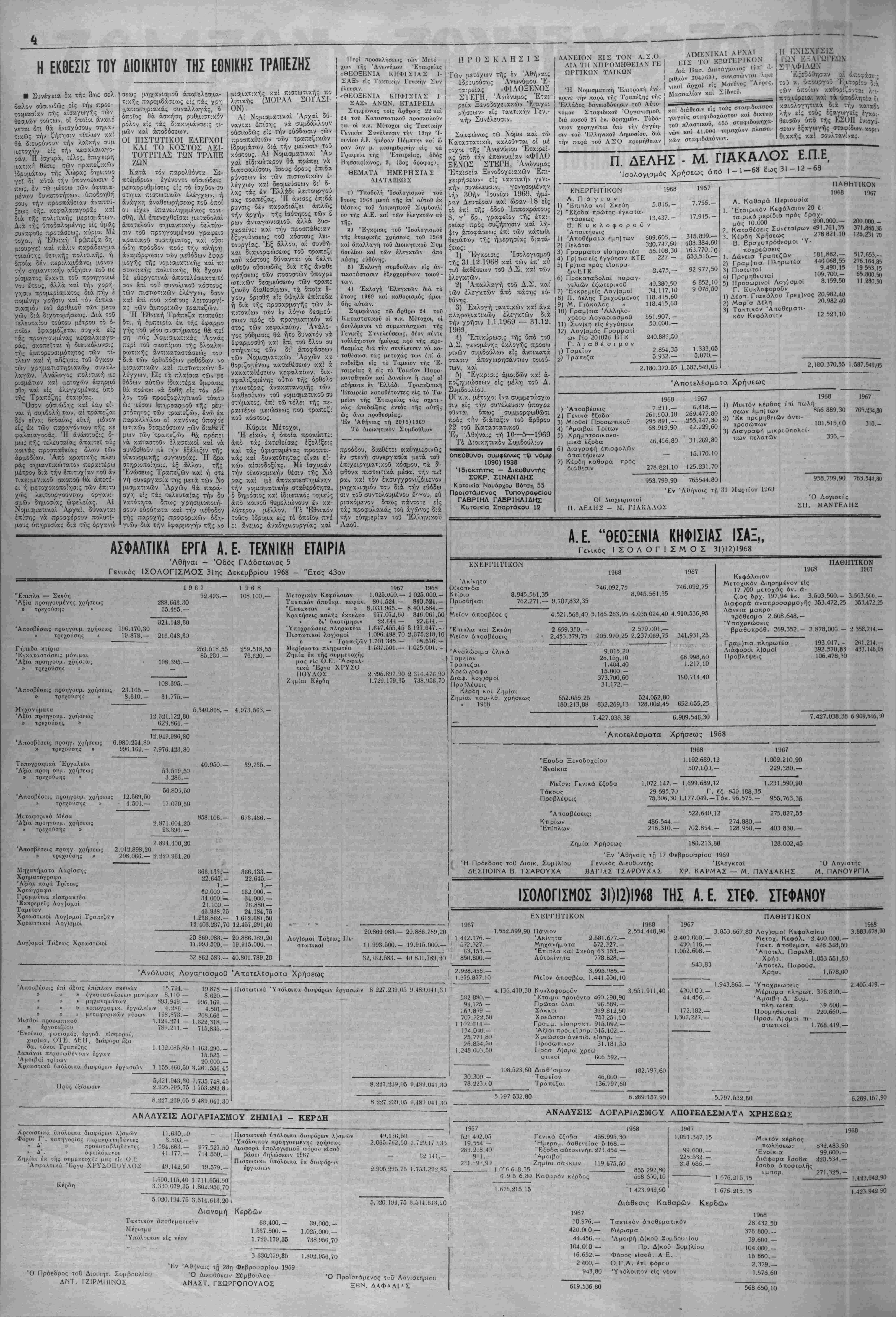 Δ ι α Ο ε σ ι |< ο ν "Ιδιον Κ ε φ ά λ α ι ο ν Ταμείον 915,50 Κεφάλαιον 200.000.- Τράπεζαι Λ. όψ. *Υ π ό χ ρ ε ώ σ, ε ι ς Κυκλοφορούν Τράπεζαι 30 000- Έμπορευμαΐα 916.971.- Προμηθευταί 169 739,10 Πελάται 89 679.- ΛικαιοΓχοι έκ προεγγρ. 12 420.- Άτομ. Λ«)γ· έταίρων Ι88..715,60 Δοσοληπΐικοί Λογ. 558 572.- Π ά γ ι ο ν Γραμμάτια Πληι,ιωτία 228.865.— "Επιπλη «αί σκεύη 2 999 — Κρατήσεις ίιηέρ Τρίτιυν 671,50 1 2ΟΟ.267.60 1.200.267,60 Ανάλυσις τού ΛΟΓΑΡΙΑ5ΜΟΥ ΑΠΟΤΕΛΕΣΜΑΤΑ ΧΡΗΣΕΩΣ ΕΝΕΡΓΗΤΙΚΟΝ Άμοιβαί Τρίτων Γενικά έξοδα "Εξο*α εγκαταστάσεως "Έίοδα Ιδρύσεως Τόκοι καί Ι1ρομή"ειαι 178 .450. - 367 .543.- :πο.- 12 .895.- !3 .ϊ!79.- 563.077.— Κέρδος έκ πωλήσεως ρμπ)τιον Διάφορα ίσοδα /_ημια Χρήσεως Ό Διαχειριστής Δ. ΦΛΛΜΠΟΥΡΑΣ Α.Ε. ΞΕΝΟΑΟΧΕΙΑΚΟΝ ΕΠΙΧΕΙΡΗΣΕΟΝ ΦΙΑΟΞΕΝΟΣ ΣΤΕΓΗ Αθήναι - Ίπποκράτους 8 Τηλ 629 019 Ίσολογισμός τής 31 ής Δεκεμβριού 1968 ("£τος Πρώτον) ΠΑΘΗΤΙΚΟΝ 37.1 386,4° 188,715,60 563.077.- Ό ΎπειΊθυνος τού Λογιστηρίου ΚΙΜΩΝ ΚΟΥΛΟΥΡΗ5 Γήπεδα —Οΐκόπεδα 2.405 6Ί2. — Κτιρια 532 5Οθ— Οίκοδομή Ξενοδ. 585 170.— Μεΐον άποσβέσ. 52.670.— "Κργα έν έκτελέσει 55 00(5. — Χρε'οσΐαι διάφοροι 1.Ο2Ο.ΟΟΌ.— Εχχρρμρΐς Λ)σμοί-Χρεωστ. 22 824 — Καταϋεσε-ις παρά Τραπέζ. 6ίΐ' 72ί>.—