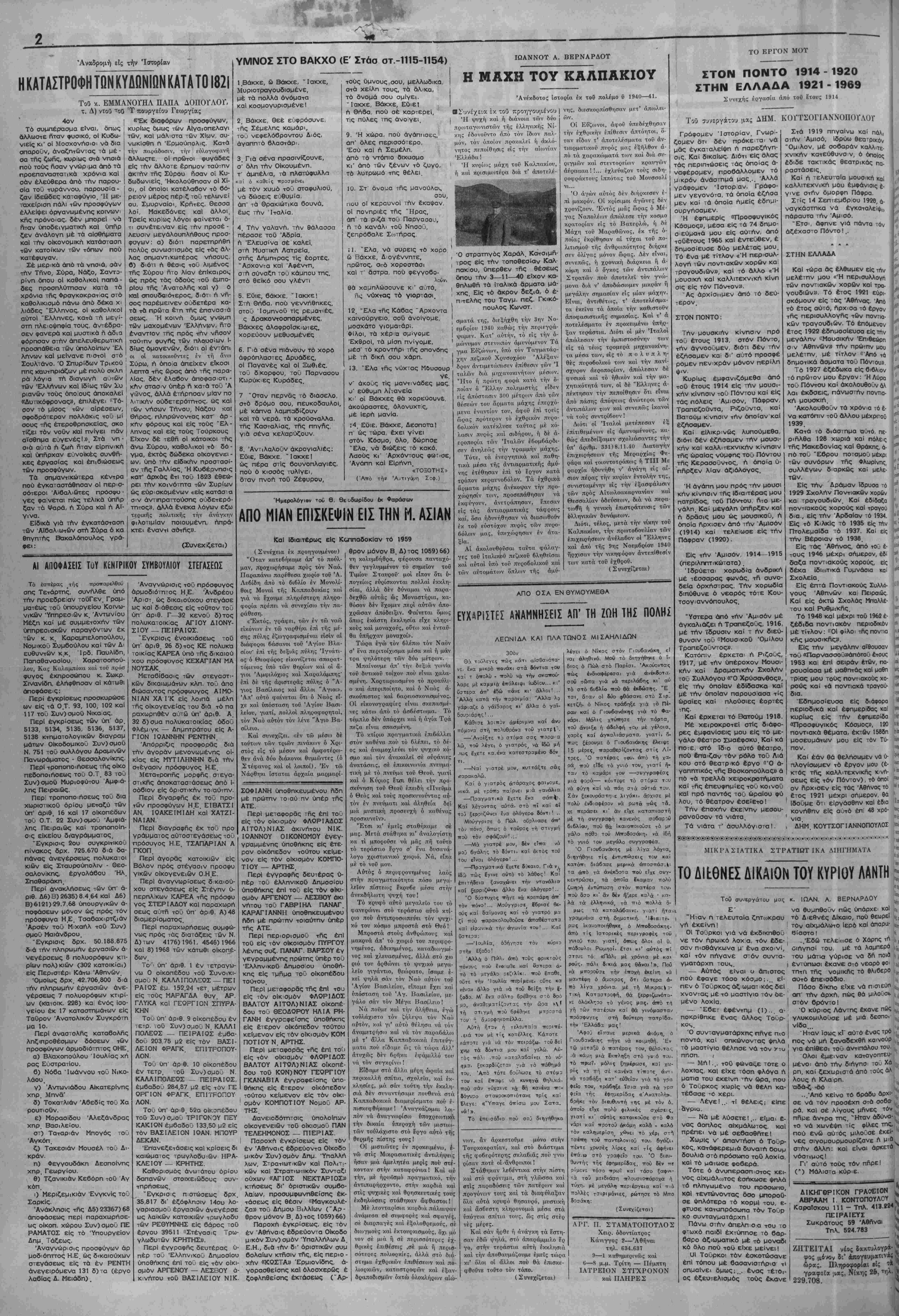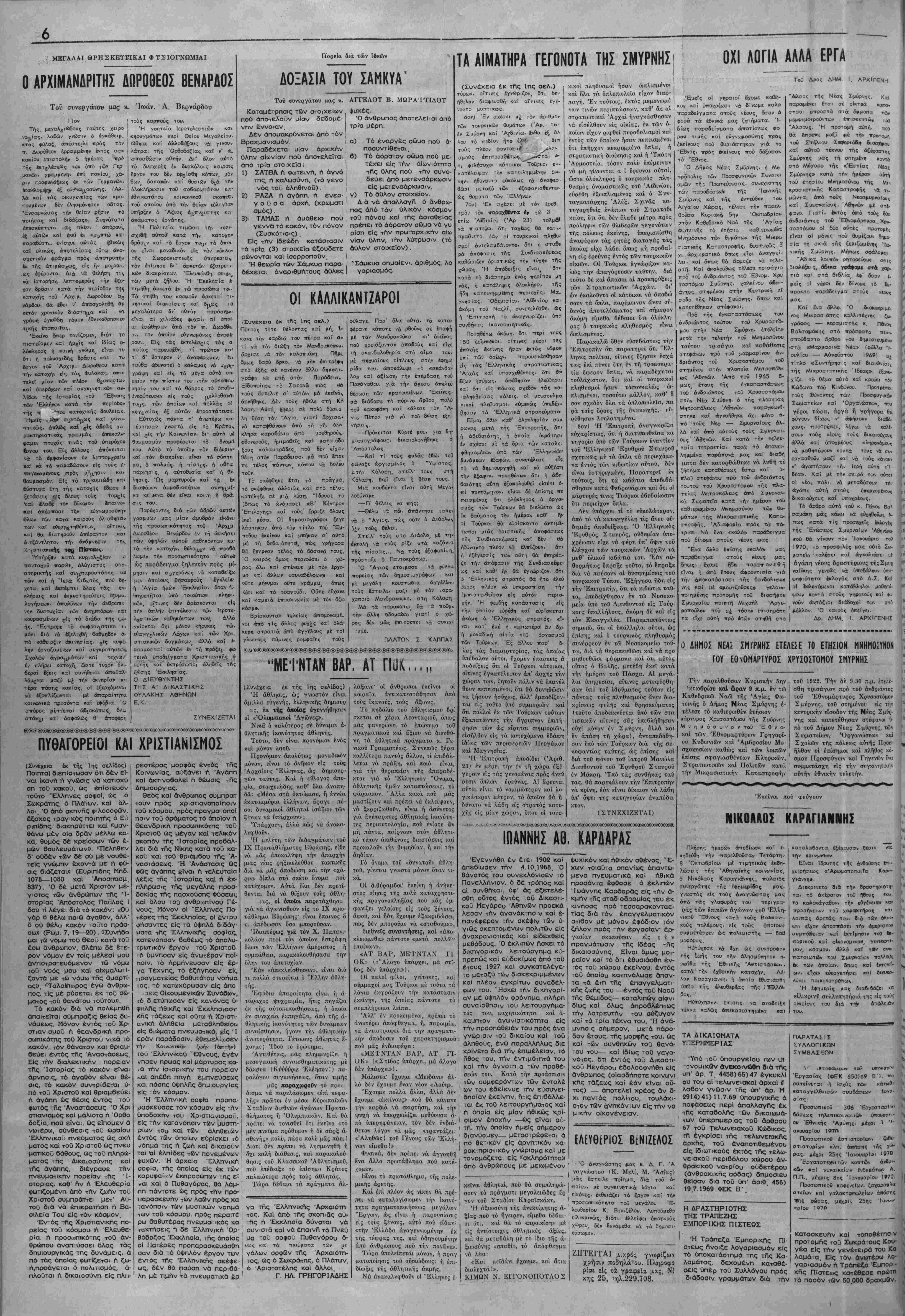 Καθεδρικώ Ναώ τής Άγίας Φ<ο· ' τεινής ό Δήμος Νέας Σμύρνης έ¬ τελεσε τό καβιερωθέν ετήσιον μάρτυρος Χρυσοστόμοιι τής Σμύρνης Μνημόσυνον τοθ Έ θ ν ο- καί των 'Εθνομαοτύρων Γρηγοφί- ου Κυδωνιών καί ΆμΛροσίου Μο- σχογησίων καθώς καί των λοιπών έπίσης σφαγιασθέντων Κληρικών, Στρατιωτικών καί Πολιτδν κατά την Μικρασιατικήν Καταστροφήν τοϋ 1922. Την δέ 9.30 π.μ. έτελί σθη τρισάγιον πρό τοΰ άνδριάντος τοΰ Έθνομάρτυρος Χρνσοοτόμ/"1 Σμύρνης, τοΰ στημένου είς τί| κίντρικήν είσοδον τής Νέας Σμί'ο- νης καί κατετέθησαν στέφανοι ν- πό τοϋ Δήμου Νέας Σμύρνης, τώ Σωματείυιν, Όργανώσεων χοί Σχολών τής πόλεως αυτής Προσ¬ ήλθον οί έπίσημοι καί πλήθος χό- σμου Προσφύγων καί Γηγενών ίνα σννιμετάσχη είς την συγκινητικόν αυτήν εθνικήν τελετήν. Έκεΐνοι ποϋ ςρεύγουν ΝΙΚΟΛΑΟΣ ΚΑΡΑΓΙΑΝΝΗΣ Πλήρης ήμϊρών άπεβΐωσρ καί ε¬ κηδεύθη την παρελθούσαν Τετάρτην 8 "Οκτώβριον, μέ τιμητικάς έκβη- >ώσ»ις τής Άθηναϊκής κοινοινΐας,