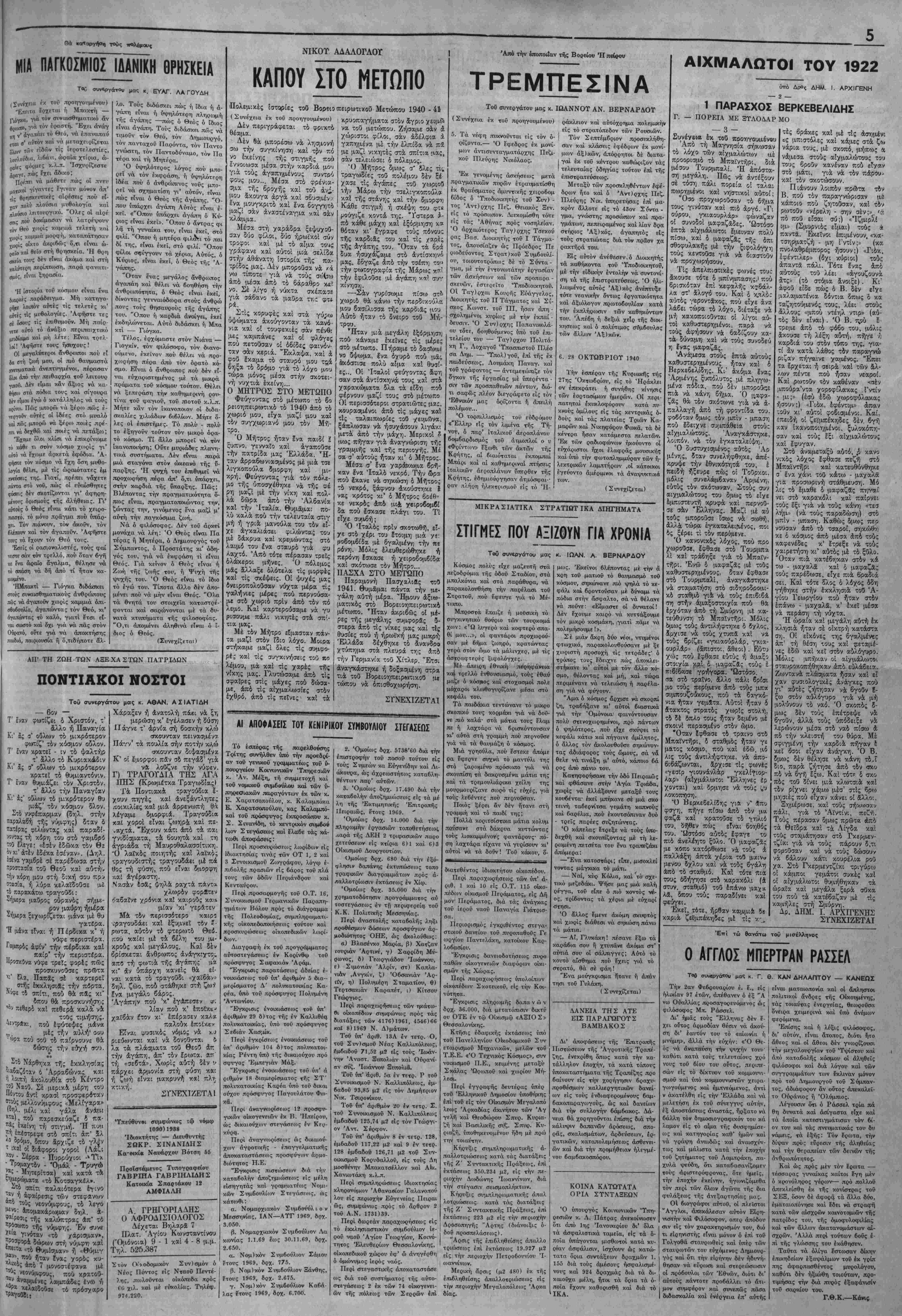<ρίς - φίς - φίς» Λέξε; τουρκ. άφοθ ήκάναν- πώς ήτανε άράπηδοι (βαρ,. τουρκ ρημ. άπ,ρόσωπ. — ύπάρ χει «φί; - φίς» φίς τοηρχ. μό- ριο πού τό λένε πολλές φορέ; καί παρααταίινει ψίθυρο ρατ:- ,κι&ς συνομιλίας ψί - ψί) Κάποια παρέα ή'ντυνού'νταν- ίτσι κάθε χρ6·νο κ' ήπαιρνε μχ: ζί τό Γιουβάνη τό Ντεληγιάν- νη, τό μπεκρή, πού 'τανί τλ χαριστημένοι, γιά τό κχλό, τώς στσιτσιέρης. Αύτό; ήτανε πό/.·) •ήδίνανε κάτι. "Ητανε δμ«ο; κα'ι γκεβεζές κ' ήδινε ζωή σ:ήν τλ ί έ Μά 'λλήθ άνάποδοι πού, έ ) γζς ή ζή ή ρέα. Μά τού 'κολλήθηκε γ'.α■:χ^ ' 6 ί ό λ Β λημένοι μέ τσοί _ μουστερήδι; τό καί τό παρατσοΰκλι «Βαρχ τως, ήκάνανε τόν κουφό. Κχϊ , βάρας». τότες τ' άραπάκια ήλέανϊ: —«είσαΐ τσιμοΰρι» ΣΓΝΕΧΙΖΕΤΑΙ Δρ. Δ. Ι. ΑΡΧΙΓΕΝΗΣ ΕΘΝΙΚΗ ΕΚΔΗΛΩΣΙΣ ΕΙΣ ΤΟΝ «ΟΙΚΟΝ ΣΠΑΡΤΗΣ» Ν. ΙΩΝΙΑΣ υπό τοΰ υίοΰ καί διαδόχου τον Με γάλου Αλεξάνδρου κατά την μά¬ χην των Θη^ών τοΰ ετους 334, δ οποίος άνέσκαψεν έκ θεμελίων τάς Θήδας καί έφείσθη μόνον των Ιε- ρών νιιών καί τής οικίας τοΰ έξό- χον τέκνον των θηδών, τοΰ ποιη- τοϋ ΙΙινδάρον, διατάξας τονς στρατιώτας τον «ΙΙινδάρον οίκον, μή καίετε». Ό Μέγας Άλέξανδρος κατά θείαν βονλήν δΐίλάσας την Μικρα¬ σίαν έγκαθίστα είδικευμένονς τε- χνίτας καί έπαγγελματίας βετε- ράνονς εθελοντάς στρατιώτας τον είς τα ένδότερα τής Μικρασίας. Βραδύτερον δέ τό μέγα καί σννε- χώς όγκούμενον ρεΰμα μετανα- στών έξ Ελλάδος δέν ήνέχθη νά τεθή τέρμα καί είς τόν αρχαίον Ελληνικόν Πολιτισμόν τής κυρίως Ελλάδος μετά την κατάργησιν τής δημοκρατίας καί τής αύτονομίας των 'Ελληνικων πίλεων υπό των Μακεδόνων βασιλέων καί την άνα πόφευκτον άλλά καί σωτήριον με- τανάστενσιν. 'Ειπαμένως, μετανα - στεύοντες είς την Ανατολήν καί ειδικώτερον είς την Μικρασίαν, σν ναπεκόμισαν μεθ' έαυτων, ώς έθνι κόν κειμήλιον, τα φώτα τοΰ Αρ¬ χαίον 'Ελληνικοΰ πολιτισμοΰ τοιν καί τα μεταλαμΛΟδευσαν είς την μόνιμον καί φιλόξενον νέαν πατρί δα των την "Ελληνικήν Μικροκτί- αν. Εντέυθεν καί δ έξελληνιισμός των αϋτοχθόνων καί ή καλλιέρ- γεια καί διάδοσις τής 'Ελληνικής γλώσσης καΐ ή έπικράτησις των 'Ελληνικών ήθών καί έθίμων είς ολόκληρον την Άναιτολην κατά την 'Ελληνιστικήν εποχήν. Τουτο δέ απεδείχθη έκ τής άποτυχίας τοΰ Ρωμαϊσμοϋ να έκλατινίση τάς Άνατολικάς επαρχίας τής ρωμα- ικής αύτοκρατορίας, δπως έπέτυ - χ«ν είς τάς νπαναπτύκτονς Δυτι- κάς επαρχίας της. Πισχεύω δτι δ λόγιος άναγνώστης εξήλθε τής πλάνης τού καί ϊσως θυμιάση πε¬ ρισσότερον άπό εμέ τό θαυμάσιον καί θεάβουλον &γαλμα τοΰ Μικρά σιατισμοΰ, δηλαδή τής Νεοελληνι κης Ελλάδος! Ίωακείμ Γ. Μαλαθούρας Είς τόν έν Ν. Ίωνία «Οίκον Σπάρτης» ή έκεϊ «"Ενωσις Σπάρ της Μ. Άσίας καί περιχώρων», την παρελθούσαν Κυραικήν 22αν Μαρτίου, διωργάνωσί, κατά τρό¬ πον λάαν επιτύχη, έν τώ πλαισίθ) των έκδηλώσειον επί τή έπετείω τής έθνικής εορτής τής 25ης Μαρ τίοι», διάλεξιν μέ δμιλητάς τούς καθηγητάς κ.κ. 'Ιχοακείμ Μαλα- θούραν κίχί Κιίκτταν Βαμβακάν, παρουσία τοΰ Δημάρχου τής Ν. Ίωνίας κ. Κνρ. Κιοφτερτξή, δή μοτικών συμδούλων, εκπροσωπών των τοπικών έκκλησιαστικών, διοι κητικών, έκπαιδευτικων, άστυνομι- κών άρχών, άντιπροσώπων έπαγ- γελματικών όργανώσεων, τοΰ επι τίμου προέορου τής Ενώσεως ν.. Βασ. Άοτρμιάδην, τού άντιστρα τήγου έ.ά. κ. Έμμ. Σεραφετι/νί 8ου κιί πλήθους έκλεκτοΰ κόσμον. Ο διαπρεπής «τννεργΐΤΓ,Γ; μ«ϊ ν.. Ίωακείμ άφοΰ. έν άρχή, με γλαφυρότηιτα διέτρεξεν είς την αρχαίον ελληνικήν Ιστορίαν, έπι- σημάνο.ς τα τρομακτικά δεινά, τα όποΐα οί <νταγ(ονισμοί καί διενέ- Ρεις τ(Τ) τότε έλληνικών πόλεο)·