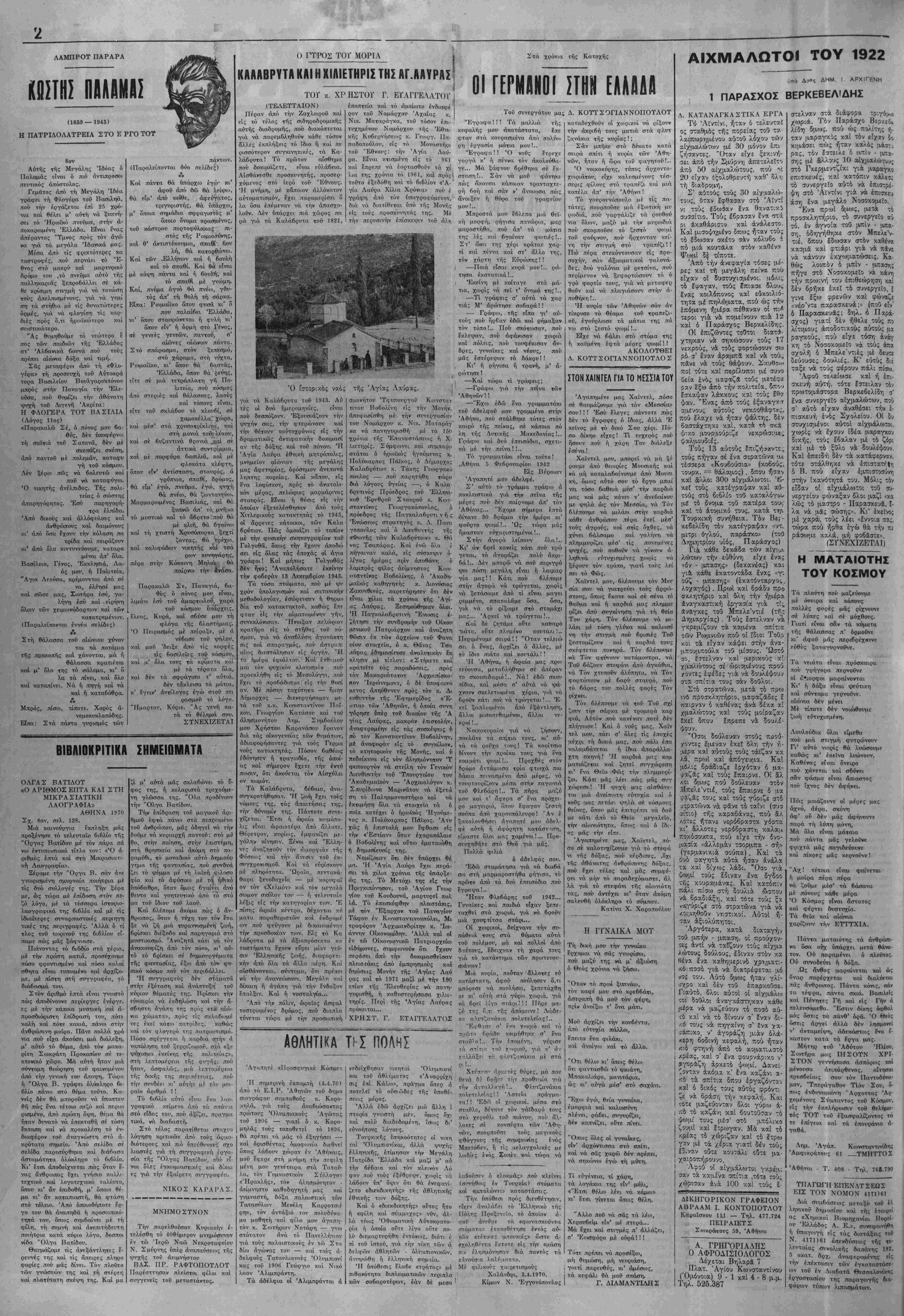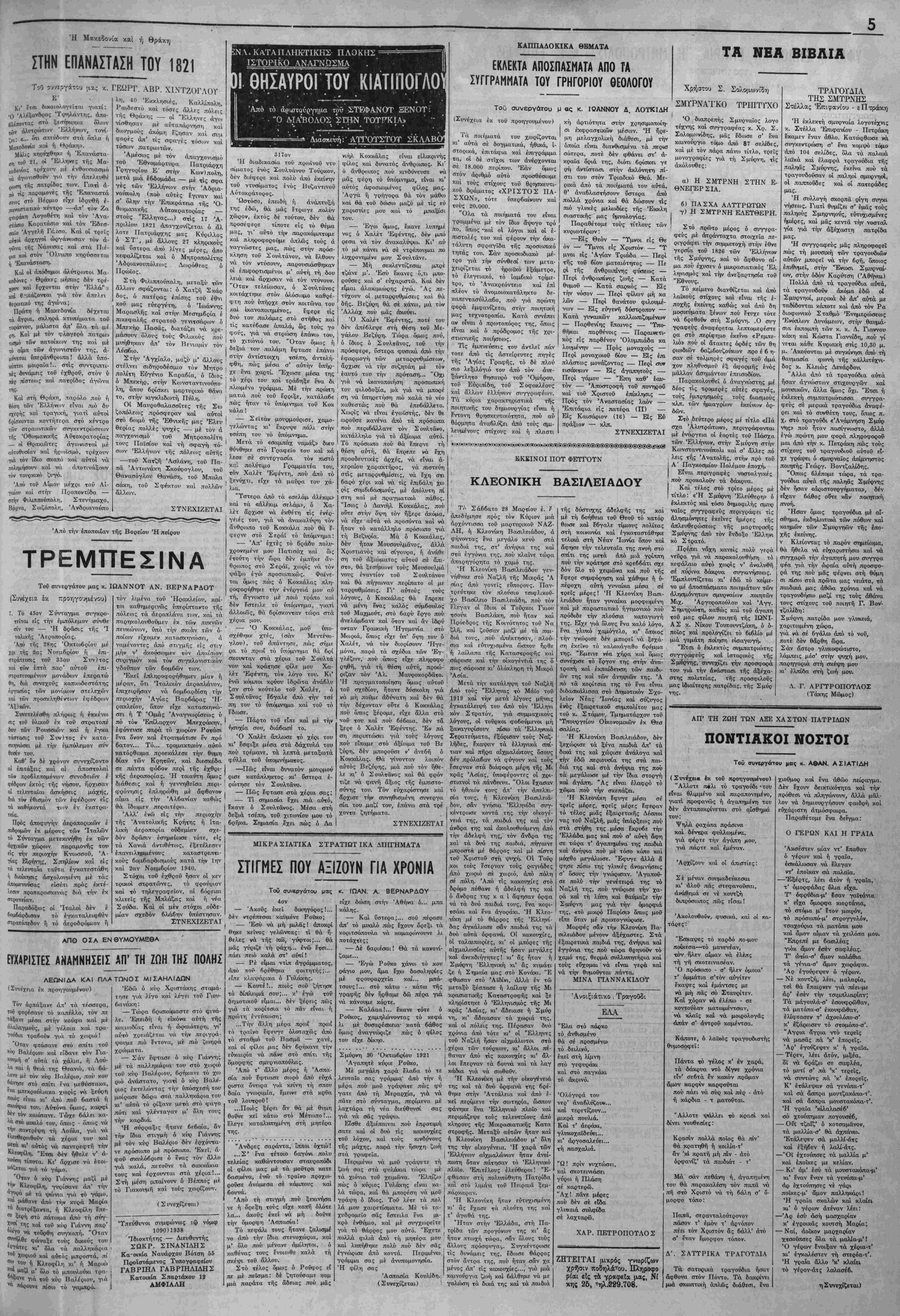 'Ε6<δ Σμυρνιοί, έκεϊ παληέ; Σμυρνιοχτοποΰλες, πού ψύγανε αλλΐς μικρές, καί άλλΐς κοπελλοΰδες μέ των σχολείων τίς ποδιές καί μακριές πλεξοϋβες. Καί τοΰτοι άΤλοι οί ΣμΐΗ?νιοί — μικρά παλληκαράκια — ανδρες τώρα γινήκανε, Παπποϋδες καί πατέρες καί νανουρίζουνε παιδία κι' έγγόνια τα 6ραδάκια άναπολώντα; δμορφϊς κι' άξέχαστες ήμερες. Τριγύοοο μας άπλώνονται οί ήσκιοι των πατέρων καΐ των μανάδων οί εύχές ίορνκρό. μδς παραστεκουν καί των χαμένο)ν άδελφιών καΐ τόσων νιών καί γέρων που φύγανε ολ' τή ζωή καί στή σκιά μας στέχουν. Μ' 5; ·δώσο) τώρα μίαν εύχή·, κι' άς μείνη ιπίσιο ή Θλίψη τοτ) χρόνον στήν άποψινή βραδειά κανείς μας νά μή λ.είψη. Ή έν λόγω ποιήτρια τυγχάνει Ι Σμνρναία, τό γένος Ίοιάννου Κι- ουρκτσόγλου, καΐ σύζ"γο; τοΰ δια -τρεποΰς καθηγητού των Μαθημα¬ τικήν κ. Δημητρίου Λιαροπούλου. Δρ. ΔΗΜ. Ι. ΑΡΧΙΓΕΝΗΣ ΕΚΔΟΣΕΙ2 Άπό τάς «'Εκδόσεις Α. Καρά δία», ετέθη είς κυκλοφορίαν είς λίαν έπ«μελημένην εμφάνισιν καί έκτύπο)σιν τό υπό τόν τίτλον «Ό άνθρωπος τοϋ "Ομήρου — έσωτε ρική δομή τής Ίλιάδας» βιβλίον τοΰ παρά τώ Τπουργείω Κοινω νίκων 'Τπηρεσιών Διευθυντοΰ κ. θεμιστοκλή ΆΘηνογένη, ό οποίος είναι- υΐός τοΰ αλησμονήτου καί διαπρεποΰς νομικοΰ έκ Σμύρνης Άντ. ΆΘηνογένη, άλλοτε 'Τπουρ γοθ Προνοίας καΐ Άντιπροέβρου τής Βουλής. Πρόκειται περί άληθώς άξιολό γου πραγματείας, ή όποία τιμά, όντως, την έλ.ληνικήν γραμματο λογίαν. ΑΙ «ΑΚΤΙΝΕΣ» ΣΤΟΝ ΔΡΟΜΟ ΜΟΥ ^'Εκι-κλοφόρησε τό τεΰχος Άπρι λίου τοΰ περιοδικόν «ΆκτΙνες». Άπό τα περιεχόμενα: «Ή άσκη¬ σις τή; προσωπικής Ίατρικής» τοΰ κ. Α. Βενσάν. «Ή άνθρωπο- λογική Άγοογή» τοΰ κ. Άρ. Άσ- πιώτη, «Ή Ανατολή», ή «Λύσις» καί «Τό μέλλον τής Ό,ρθοδοξίας» τοΰ κ. Κ. Παπαπέτρου, «Χαρακτη ριοτικά τής άνθρ-ωπίνη; εργασίας» τοΰ κ. Γ. Κωστάκη», «"Ενας Χρι- στιανιομός προδομένο; άπό μα;», τή; Μ. Ντελμπρέλ, «Ρωμανός ό Μελωδό;» τοΰ κ. Π. Α. Σινοποιν λ.ου. κ.λ.π. «Ο ΚΟΣΜΟΣ ΤΗΣ ΕΛΛΗΝΙ- ΔΟΣ» 'Εκι»κλοφόρησε τό τεΰχος Άπρι λίου τοΰ περιοδι.κοΰ «Ό Κόσμος τής 'Ελληνΐδος». Άπό τα περιε- χόμ«να: «Πάσχα: ή πόρτα τής ζωή;» τής δ. Κατ. Άδαμτξίλο- γλου, «Τό 'ΕΘνικό καί Ίσιτορικό μας μουσεϊο» τής κ. Α. Άγγίλο- πούλου, «Ό 'Εκπαφυτικόξ κα" τό σημερινό τού ε"ργο ίής κ. Κ. Σπήλιου», «Ή μητέρα Θεραπεΰει τα έλαττώματα των παιδιων» (Ά Στύν Ο'>οδομιχόν Συν)σμόν ό