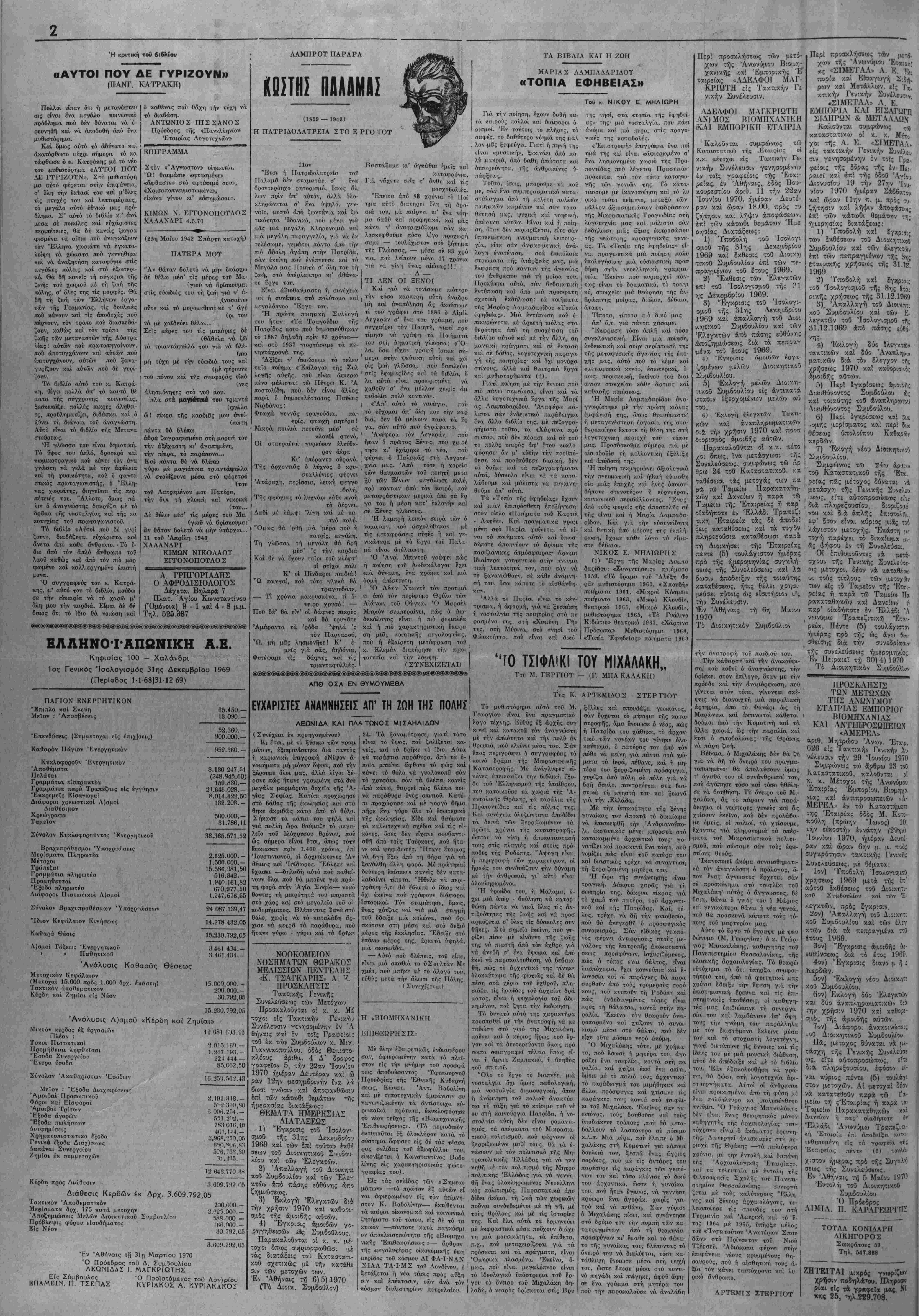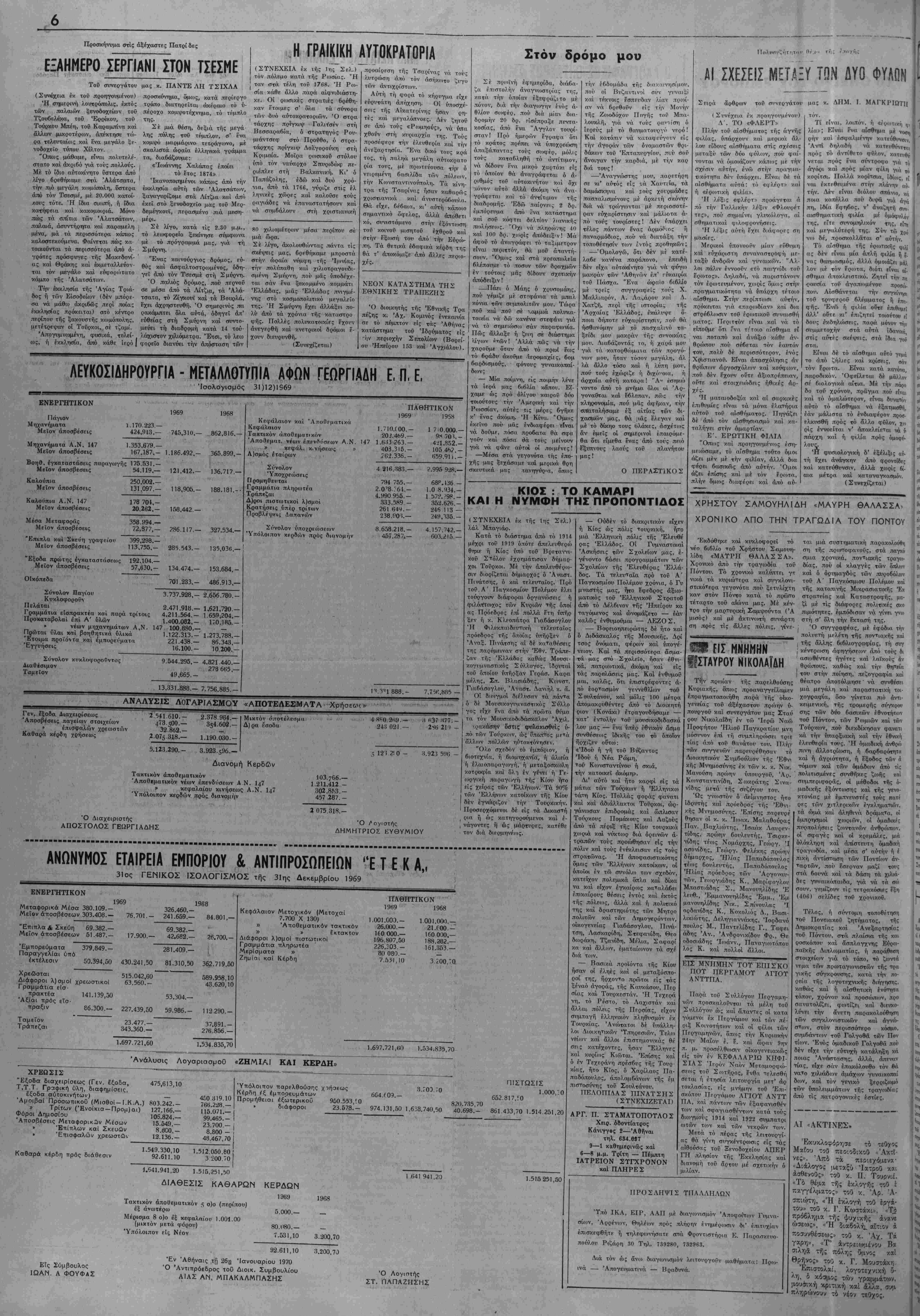 δέν είχε την ευτυχή καταλήξη κ<ί ποίας Άνάοτασης, άλλά, άπεναν τία;, είχε σάν έπακόλοτ»Θο τόν θά νατο χιιλιάβοιν άμάχον γυναικοπηί δόν, καί τόν γενικό ξερριξωμό των ύπολειμμάτων τή; τραγο*6ίας άπό τίς πατραγονΓκές έστίίς. ΑΙ «ΛΚΤΙΝΕΣ» Έκυκλοφόρησε τό τευν,ος Μαίου τοθ πεοιοδικοθ «'ΑκτΙ- νες». Άπό τα περιεχ^ενα- «Διάλογος μΐταξύ Ίατροΰ και άσθενοθς- τοΰ κ. Π. Τουρνιέ. «Τό θέμα τής έκλογής τοΰ έ παγγέλματος» τοϋ κ. 'Αρ. Ά- σπιώτη, «Ή έ%λογή τοθ έργά- του» τοΰ κ. Γ. Κωστάκ'», «Τ4 πρό^λημα τή; ψυχικάς άνανε ώσεωςν, «Ή διαβολή». αΐτιον ά ποσυνθέσεως» τοθ κ. Ά/. Τα γαρη», «Τ' άντρειωμένου Βα σιληά τής πόλης δμνος καΐ Βρ9)^ος» τοϋ κ. Γ. Μουστάοιη Επιστολαί, λογοτε/νική δ¬ λη, δ κό:»μο; των γρα<ιμάτων, μουσική κ,ριτική καί άλλα, σ-ομ πληρώνουν τό νέον τεθχος.