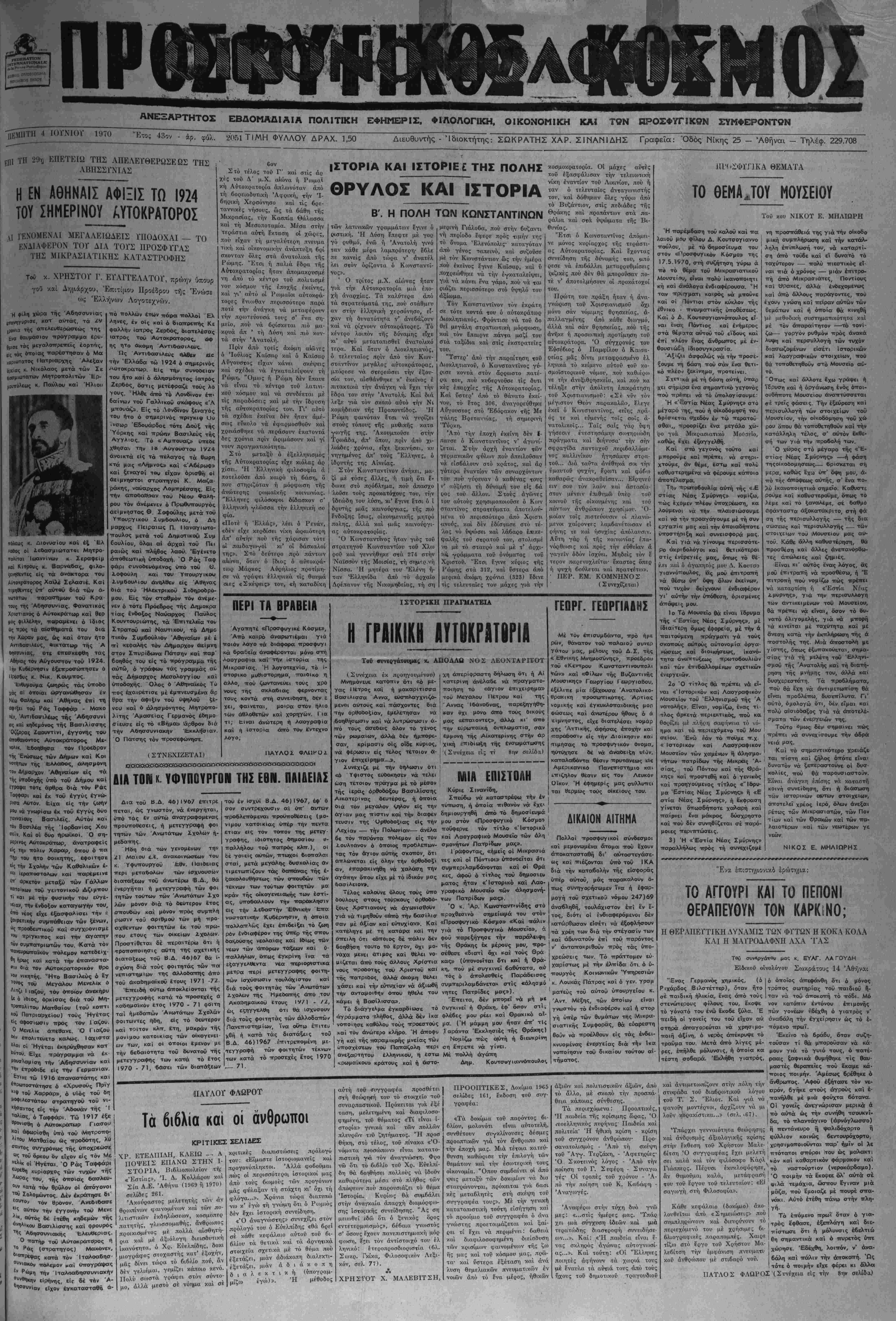 2051 ΤΙΜΗ ΦΥΛΛΟΥΔΡΑΧ. ΐ~Ό Διευθυντής - Ίδιοκτήτης: ΣΩΚΡΑΤΗΣ ΧΑΡ. ΣΙΝΑΝΙΔΗΣ Γραφεΐα: Όδός Νίκης 25 - Αθήναι - Τηλέφ. 229.708