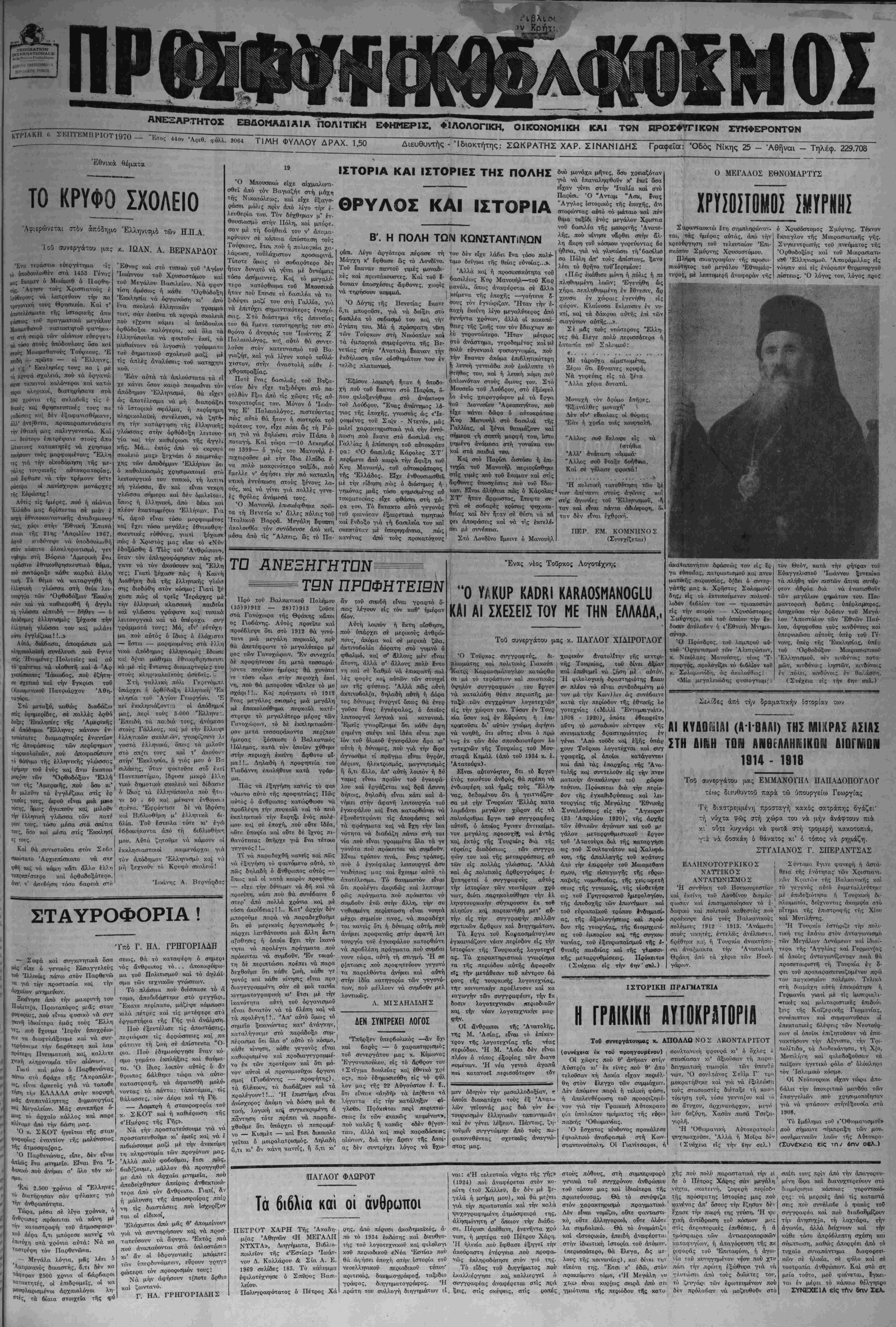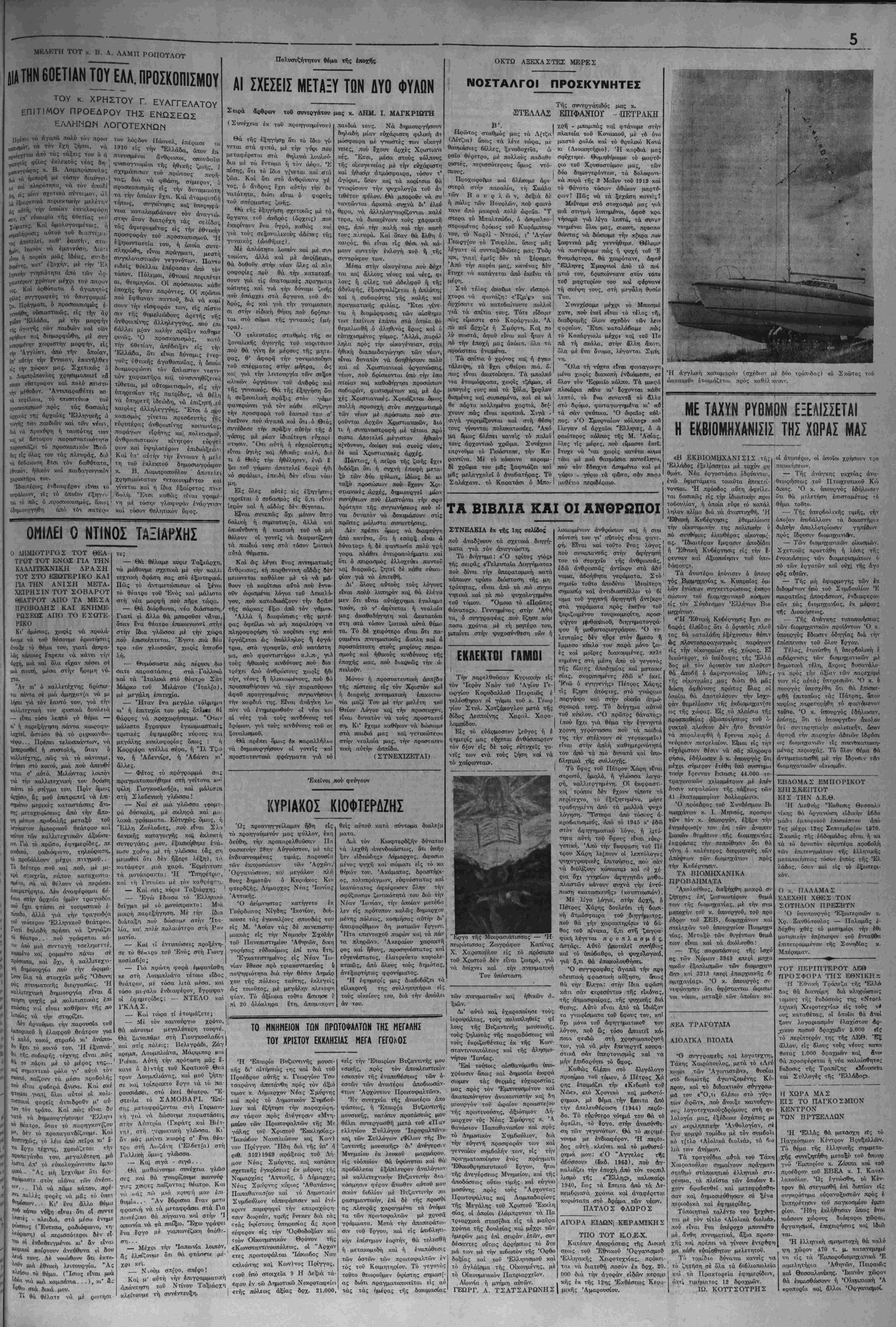 έ/,ληνική γλώ<Γσα τού καί μιλάει ιιόνο έγγλέζικα!!..» Αύτά, διάβασα, αποφάσιβΐ αιά ν,ληοικολαική συνέλευσι πού Ιγινε οτ(ς Ήνωμένες Πολιτείες καί αύ τέ φαίνεται νά υίθ'θ'εττή καί δ 'Αρ χιΐΛΪβκοπος Ίάκωιβος, πού έζήτη- σε σχετικά καί την ίγκριβι τού Οικουμενικόν Πατριάρχου Άθη- ναγάρα. Στό μεταξύ, καθώς διαβάιζω Έθνος καί στό τυπικό τοΰ Άγίου Ιωάννου τοΰ Χρυσοστάμου καί τού Μεγάλον Βαβιλ.είου. Νά φρον τίοη άμεσος ή κάθε Όρθάδοξη Έκοιλησία νά οργανωθή κι' άπο ένα σκολειό έλληνικών γραμμα των, σάν ΙκεΧνα τα κρυφά σκολειό πού ΐϊχ,ανε κάμει οί ΰπάδουλοι όρθάδοξοι καλόγεροι, καί δλα τα ελληνόπουλα νά φοντοΰν έκεϊ, νά μαθαίνοι·ν τα λιγαστά γράμμπτΐι. τυΰ δημοτικοϋ σχολειοΰ μαί;ί με τίς άπλές άναλύσεις τοΰ κα-ΐηιχητι κου. Εάν αύτά τα άπλοΰστατα τα εί χε κάνει ">οον καιρό ποιμαίνει τόν