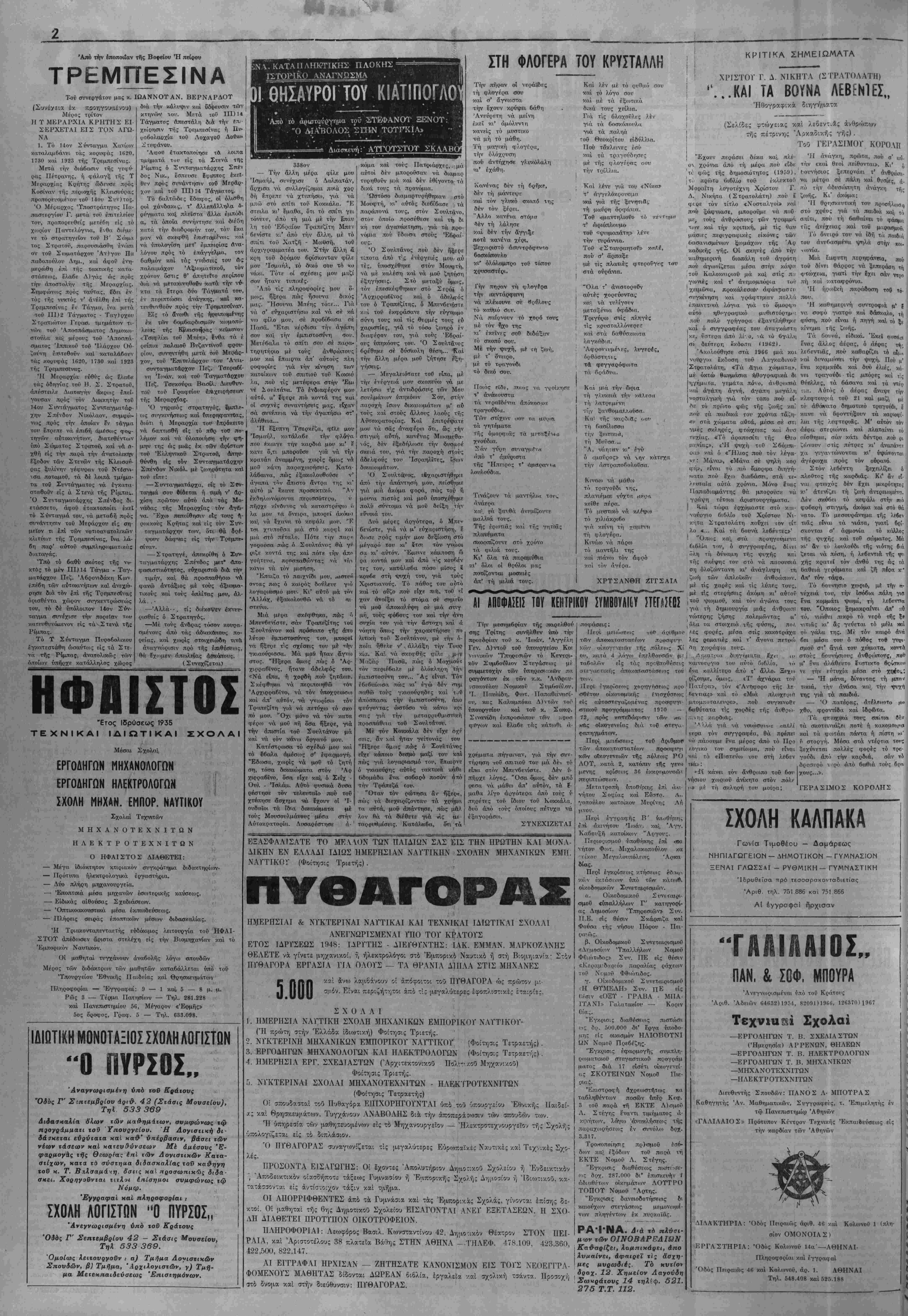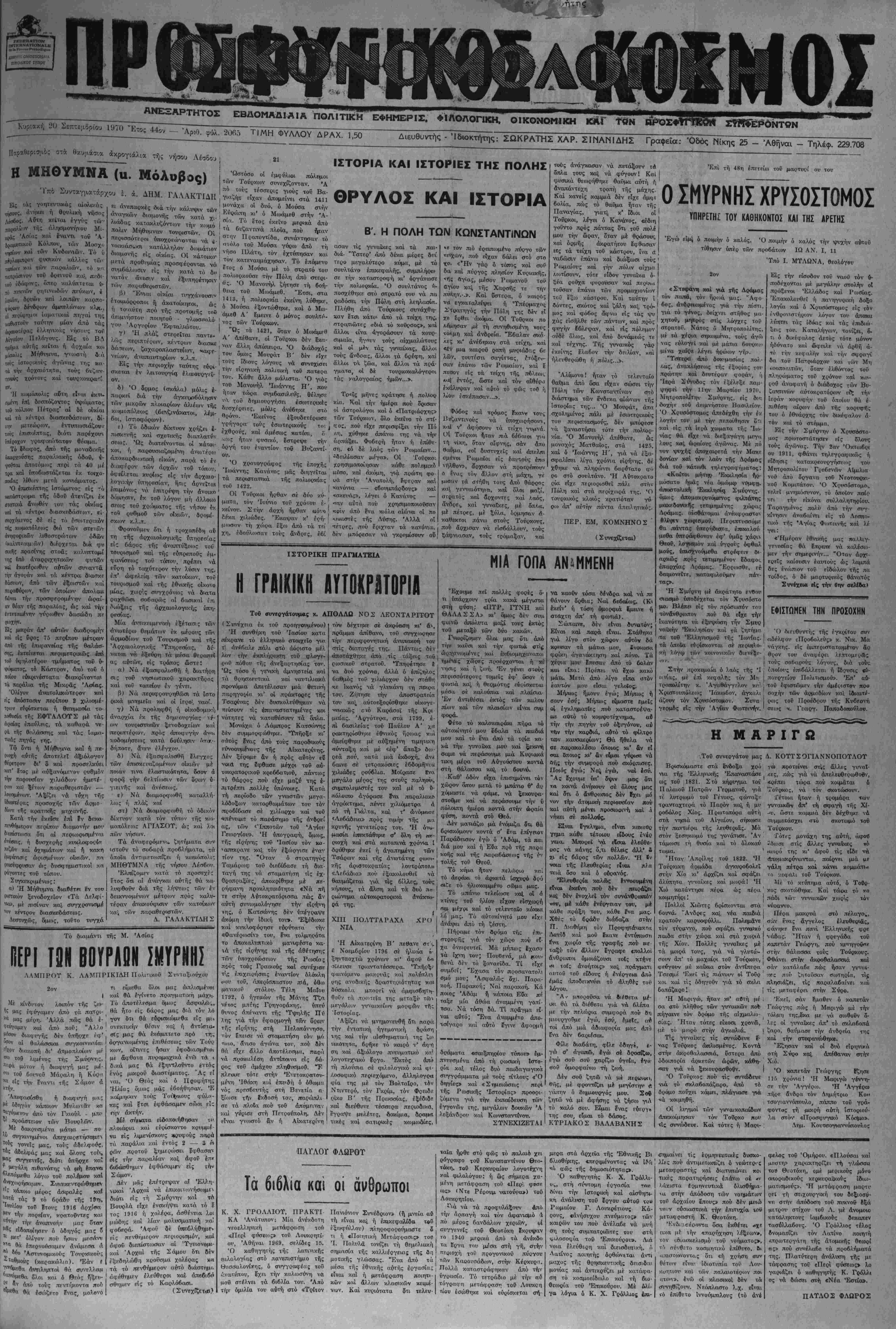 Δίευθυντής , Ίδιοκτήτης; Σ_.ΚΡΑΤΗΣ ΧΑΡ. ΣΙΗΑΝΙΔΗΣ Γραφεΐα.· Όδός Νίκης 25 — Αθήναι — Τηλέφ. 229.708