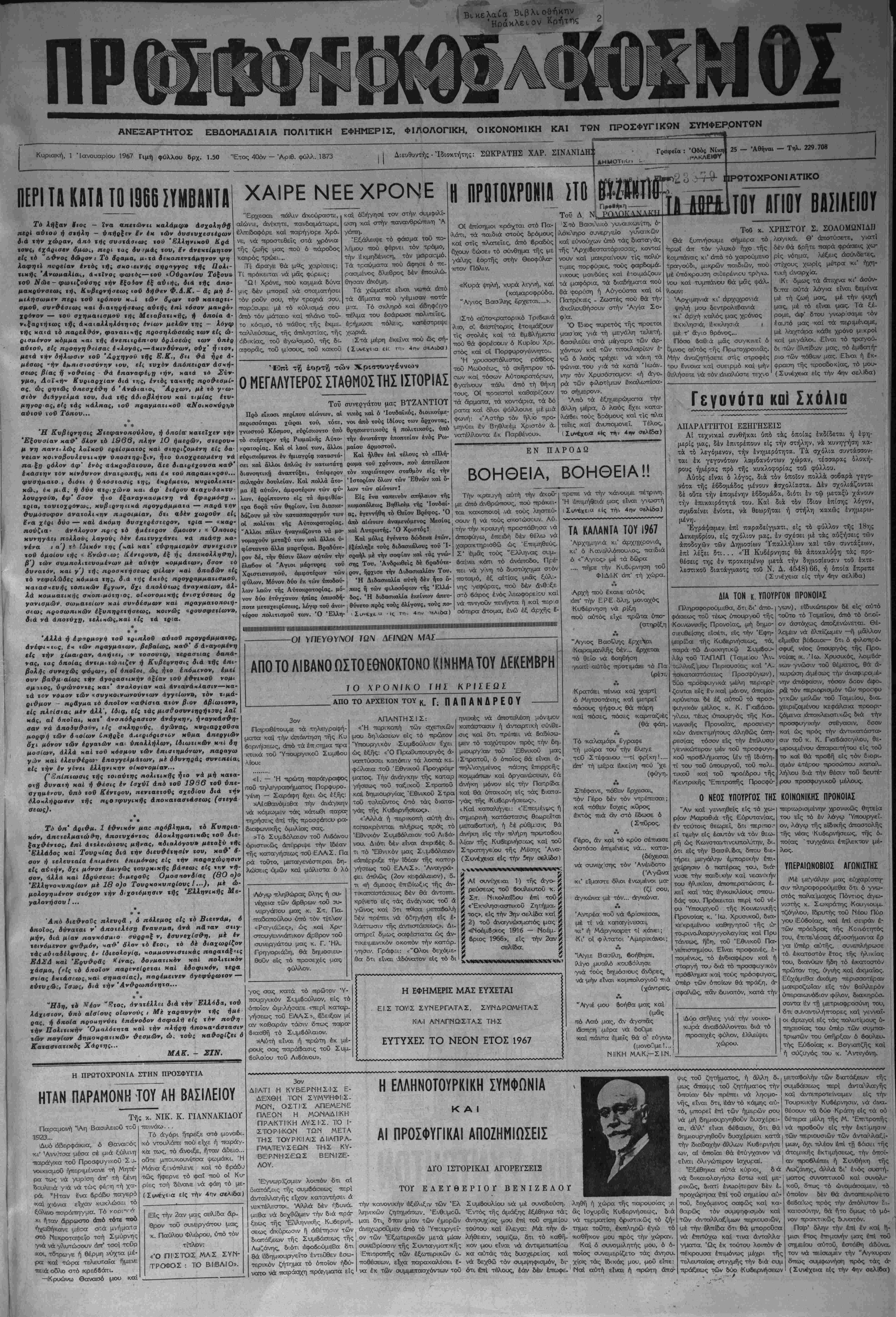 Κυ,ρια,κή, 1 Ίανουιαρίου 1967 Γιμή φύλχου δρχ. 1.50 ΐΕτος 4Ο6ν - Αριθ. ψύλλ. 1873