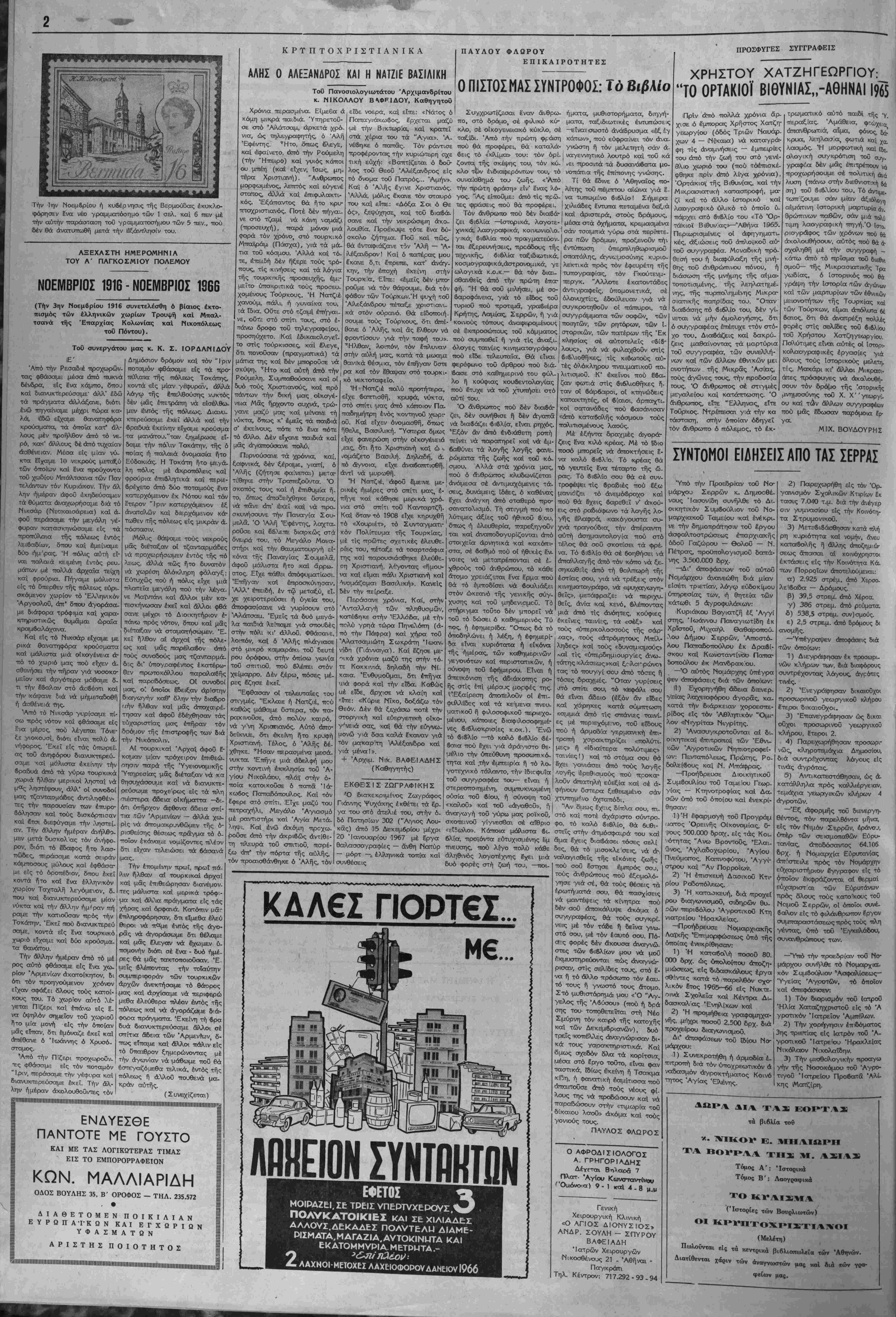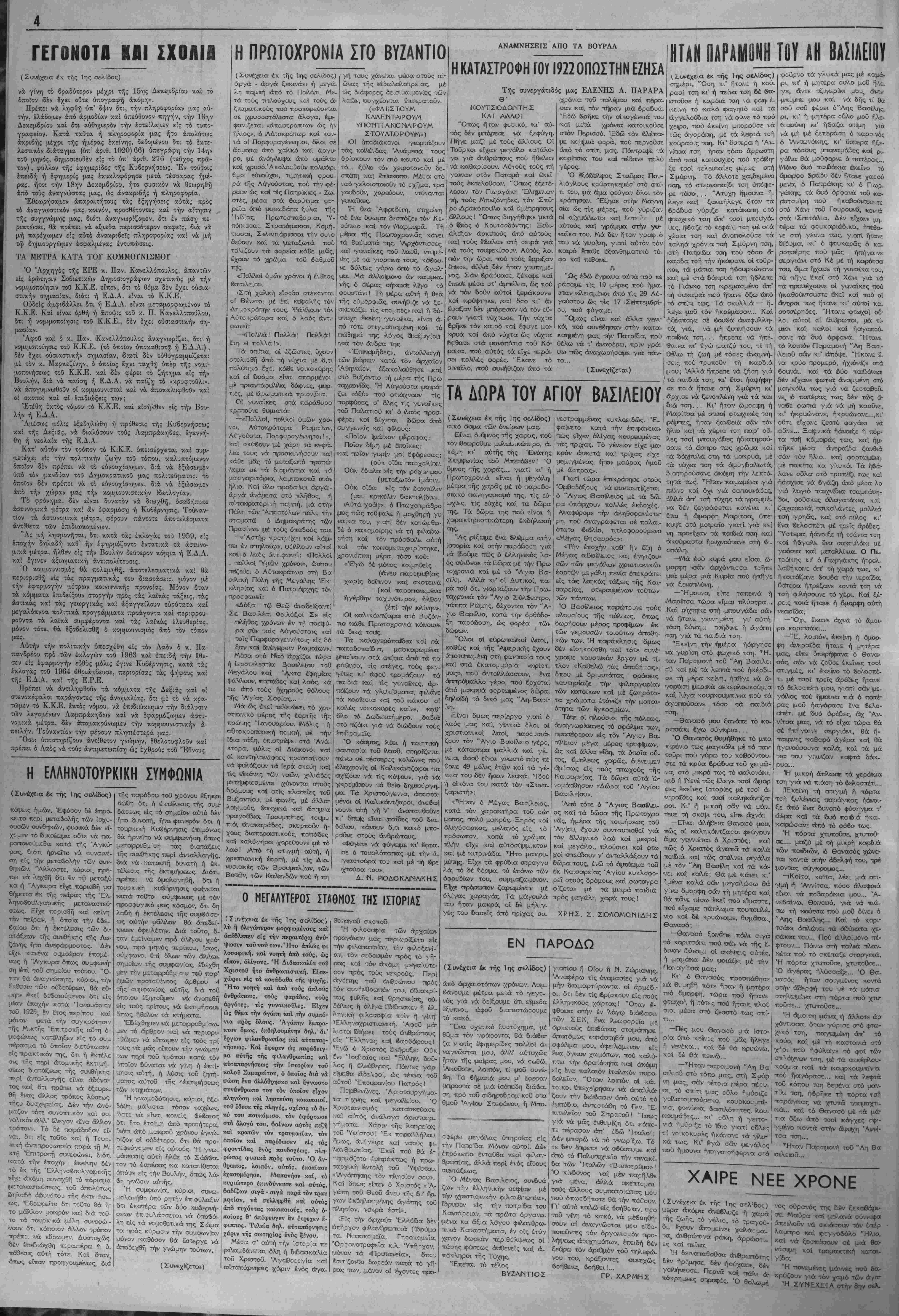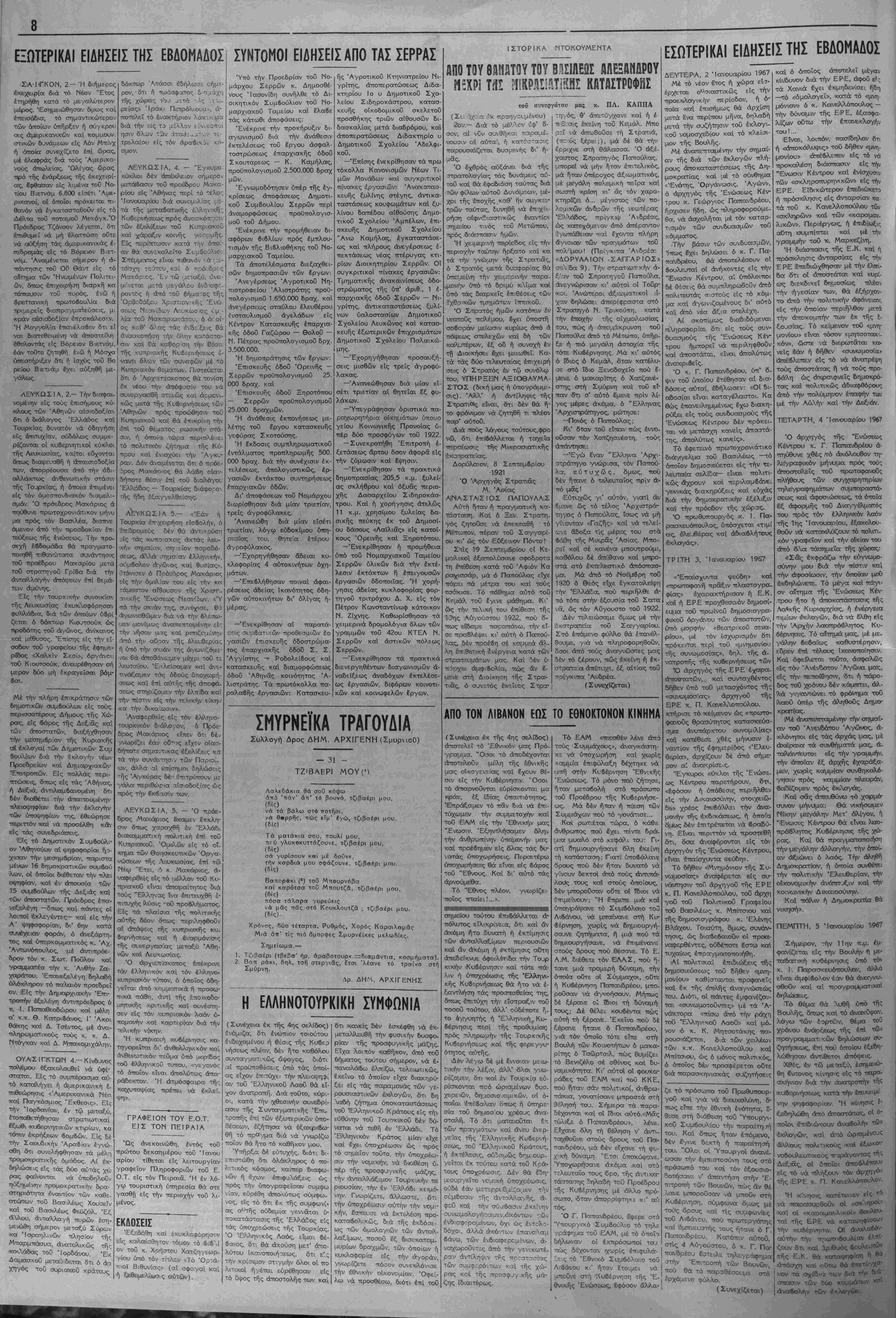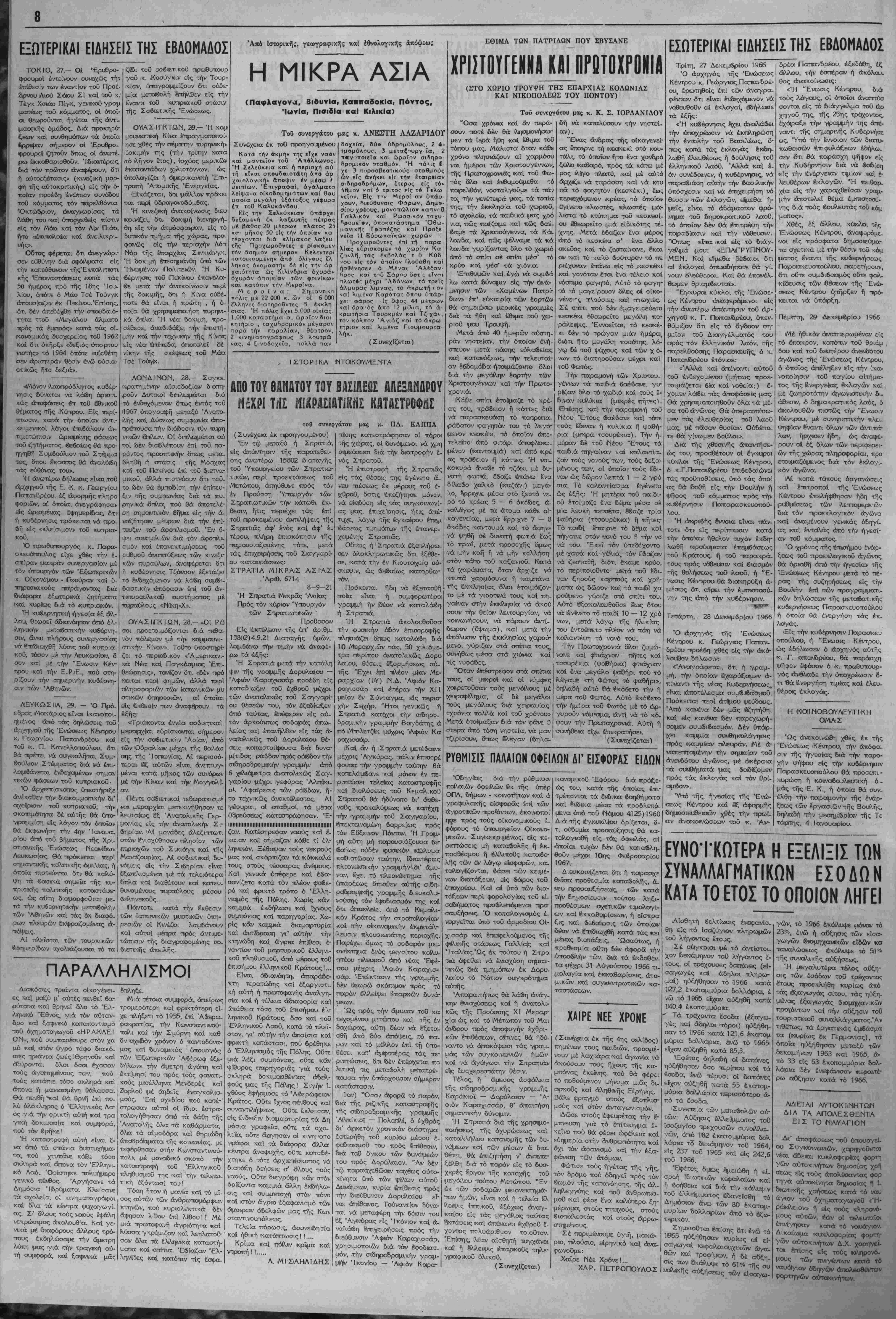 τά τον νοιιον των «συγχοινωνούνιων <1γγ«ίων», ι όν τιμά- ριϋ·μον - πρ&γμα τό οποίον κα&ίστα «τόν βίον άβίωτον», είς πλείστας μέν άλλ', Ιδία, είς τάς μισϋοαννιηρήτανς λαϊ κάς, αί οποίαι, κατ' άνσπόδραστον ανάγκην, ήναγκάσ&η- ααν νά άποδν&ονν, ιΐς σκληρούς, αγώνας, κνριαοχοΰσα μορφή των όιοίων ίπήρξε άΛεριόρισιον κύμα άπεργιων δχι μόνον των έργατών κα< ύπαλλήλων, ίαΊωΐικδν κίι δή μοσιων, άλλά καί τοϋ κόσμον των έπιοτημόνων, παραγω ν λ) ν καί έλευϋ'έρω· έπαγγελμάτων, μέ όδυνηράς σννεπείας είς την έν γένει ελληνικήν οίκονομίαν... ('.ζπίπτωσις τής τοιαύτης πολιτικής τ}γο νά μή κατα- ο%ϋ δνναιή καί ή Φέσις έν Ισχύϊ άπό τοϋ 1966 τοΰ ύπε- αγημένον, υπό τοϋ Κέντρον, πενταετοϋς σχεδιον διά τ·ήν όλοπλήρωβιν τής π^οιφυγικής άποχαταστάσεως (στ$γά σεως). * Τό ύπ' άριθμ. 1 εθνικόν μαα πρόβΐημα, τό Κυπρια- αόν, άπετελματώ&η, Λποΐνχόντος δλοκληρωτικ&ς τοϋ διε- ξαχ&έντος, επί άτίλειώτονς μήνας, «διαλόγον» μεταξύ τής Ελλάδος καί Τουρκίας διά την διευθέτησιν τού, καθ' ό¬ σον ή τελευταία έπιμένει έπιμόνως είς την παραχώρησιν είς αύχήν, δχι μόνον άμιγώς τονρπικής βάσεως είς «*ιν νή- σσν, άλλα καί Ιδρυσεν-, διμεροϋς Ομοαιονδίας (80 ο)ο Έλληνοπνπρίων μέ 18 ο)ο Τουρχοχυπρίους !.■■), μέ ώ- μολογηαένον σχόχον την διχοιόμηοιν τής Έλληνικής Μβ- γαλονήαον Ι... * * * Άπό διεθνοδς πλενοβ. , δ πόλεμος είς τό 5ί«τνάμ, ό οποίος, δύναται ν* αποτελέση ίνανσμα, άνά πατάν στιγ μην, διά μίαν πανκόομιο σύρραξ ν, έσννεχίαϋ-η, μέ έν τεινόαενον ρν&μόν, «αθ' ό'λον τό Ιτος, τό δέ διαχωρίζον τάςαύ<.αδέλψονς, έ* ΙδιεοΙογία, κομμουνιστικάς ΕΔΣΔ καί Έρυ&οάς «ίνας, δο^ματικόν καί πολιτικόν χάσμα, (»1ς τό οποίον παρενείρεται καί ϊδαφικόν, τερα στ/ας εκτάσεως, καί. σηαασίας), παρέμεινεν άγεφύρωτον — βύτνχΛ;, ϊσβος, διά την Άν&ρωπότητα... * * "Ηδη, τβ ν^ον "^τος, άνατέλλβι δία την ΕλλΛδα, τού λάχισιον, υπό αΐαίονς οΐωνούς ι Μέ χαρανγήν τής ήαέ ρας, ή ό ποία προαηννει Επάνοδον άσφαλή είς την ποϋ·η- τήν Πολιτικήν Όμαλότητα καί την πλήρη αποκατάστασιν των παγίων ΔνμοπρατΐΜών θεσμων, ώ, τού; καθορίζει ό ΚΌταοΊατίΚΟς Χάρτης... ΜΑΚ. - ΣΙΝ. ΧΑΙΡΕ ΝΕΕΧΡΟΝΕ καί ό!3ήγησέ τον στήν ο>ση καί στήν ~αναν&ρώ~ΐίνη Ά