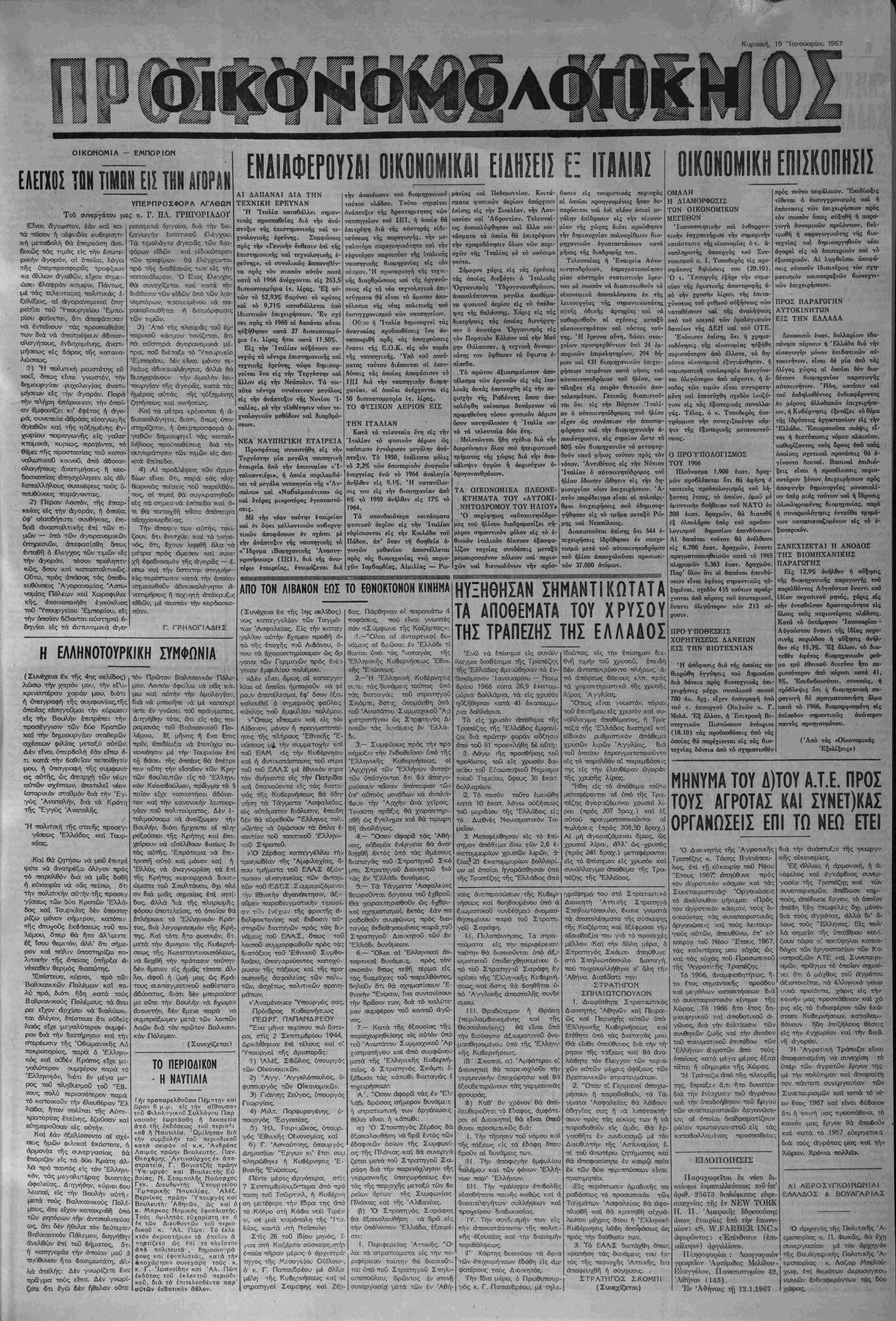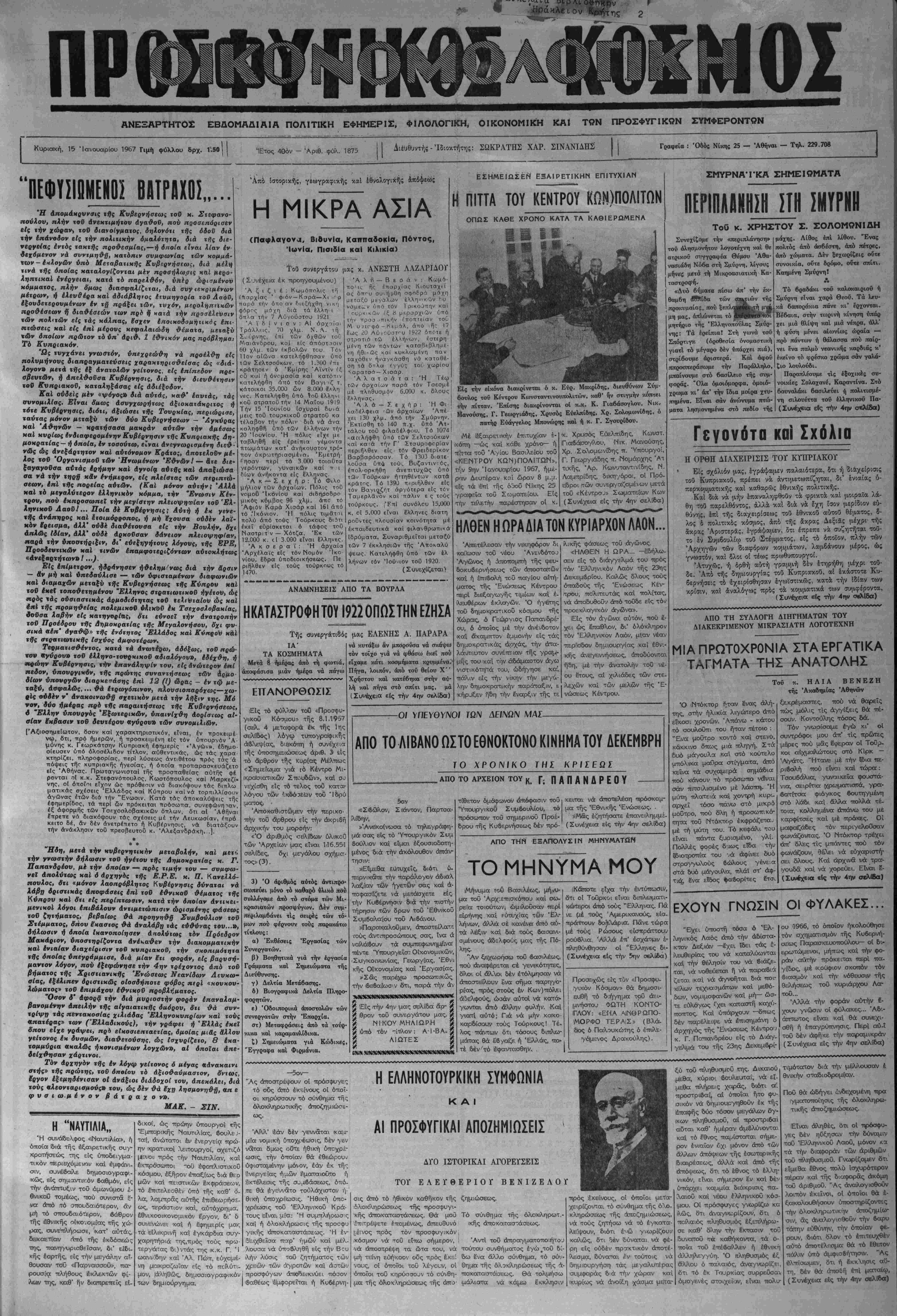 Κυριβκή, 15 Μανουαρίου 1967 Γιμή φολλου 5ρχ. 15β| | >1Ετος 40όν - Άρυθ. φϋλ. 1675 Αΐέύθυντής-Ίδιοχτήτης: ΣΩΚΡΑΤΗΣ ΧΑΡ. ΣΙΝΑΝΙΔΗΣ"