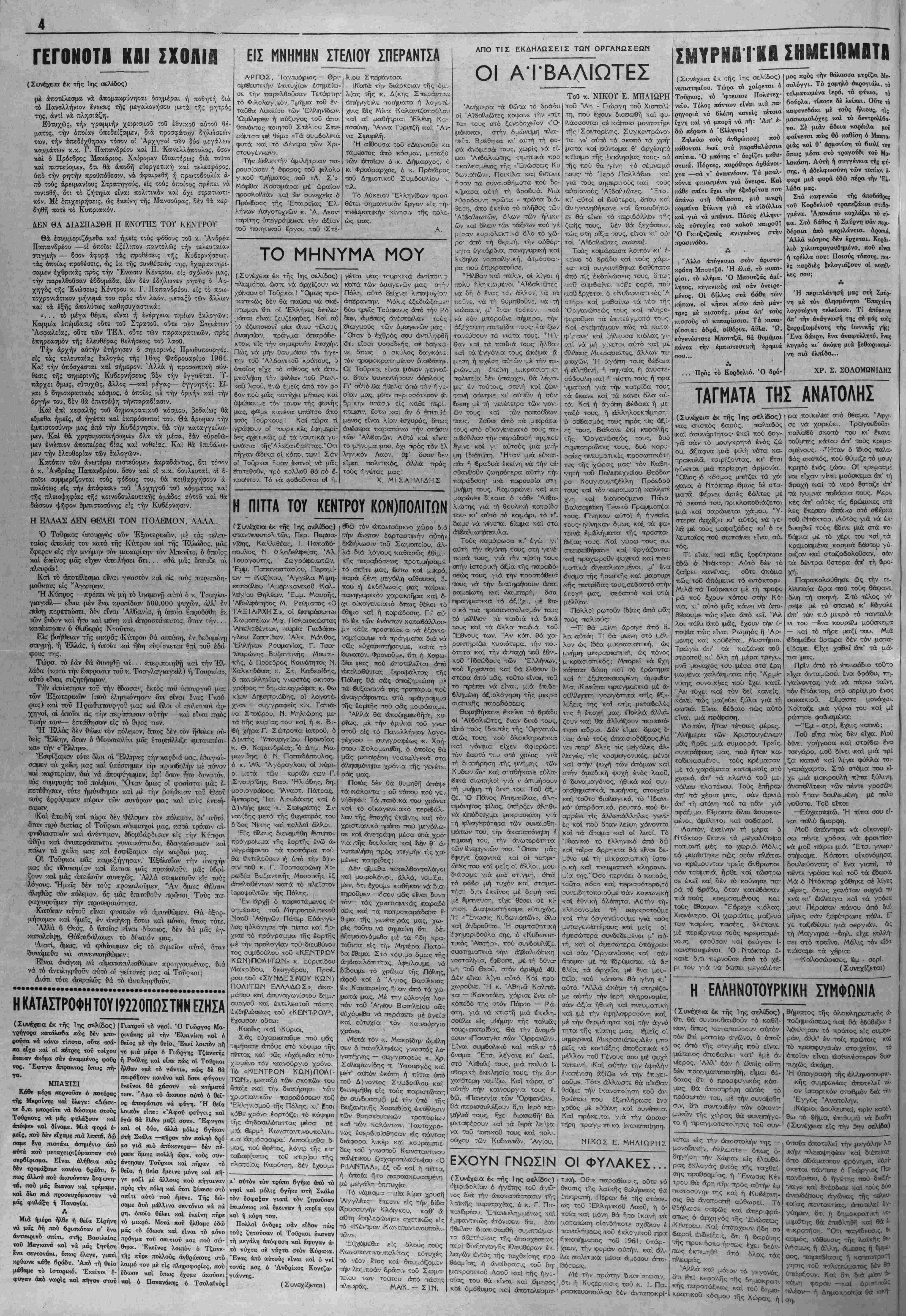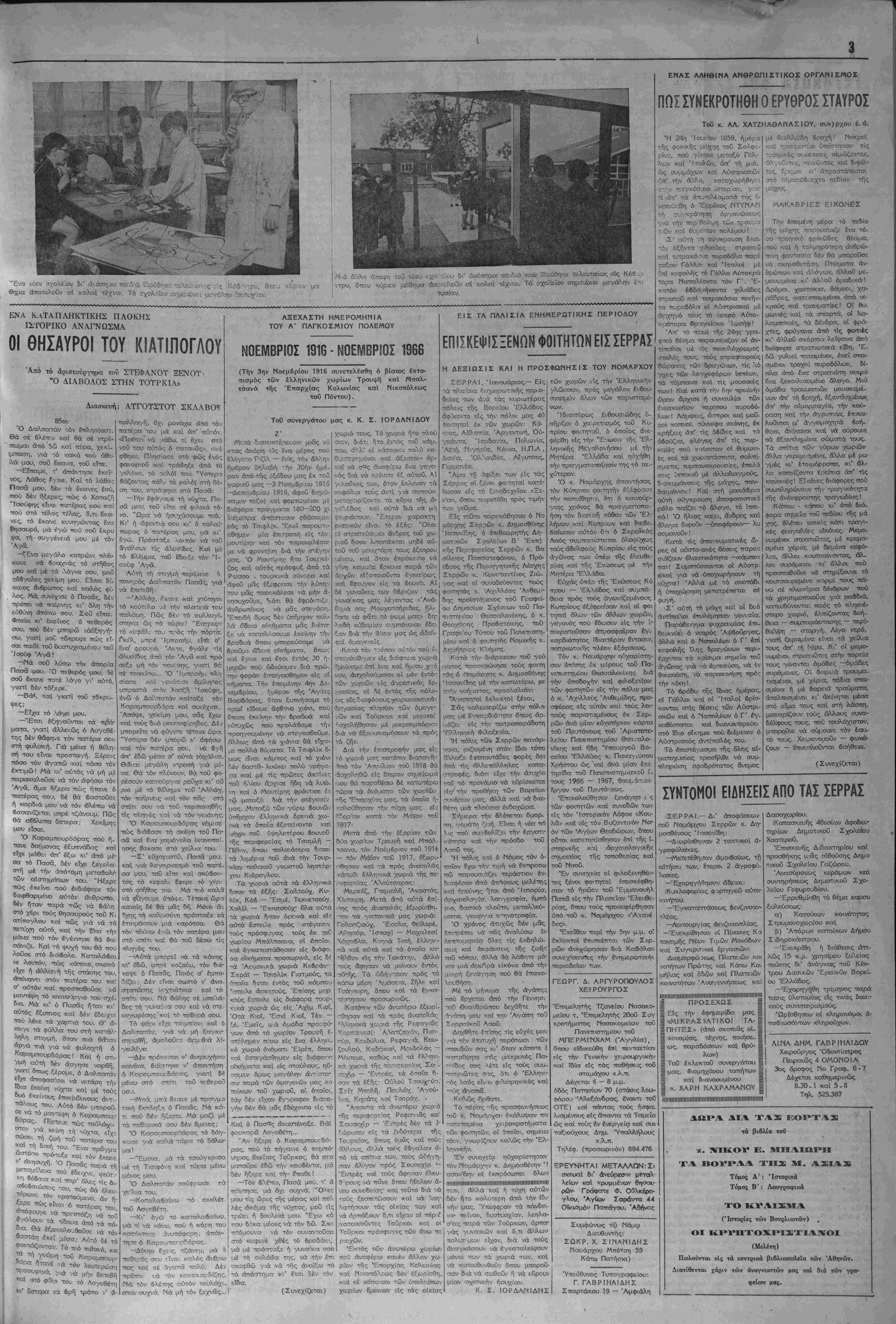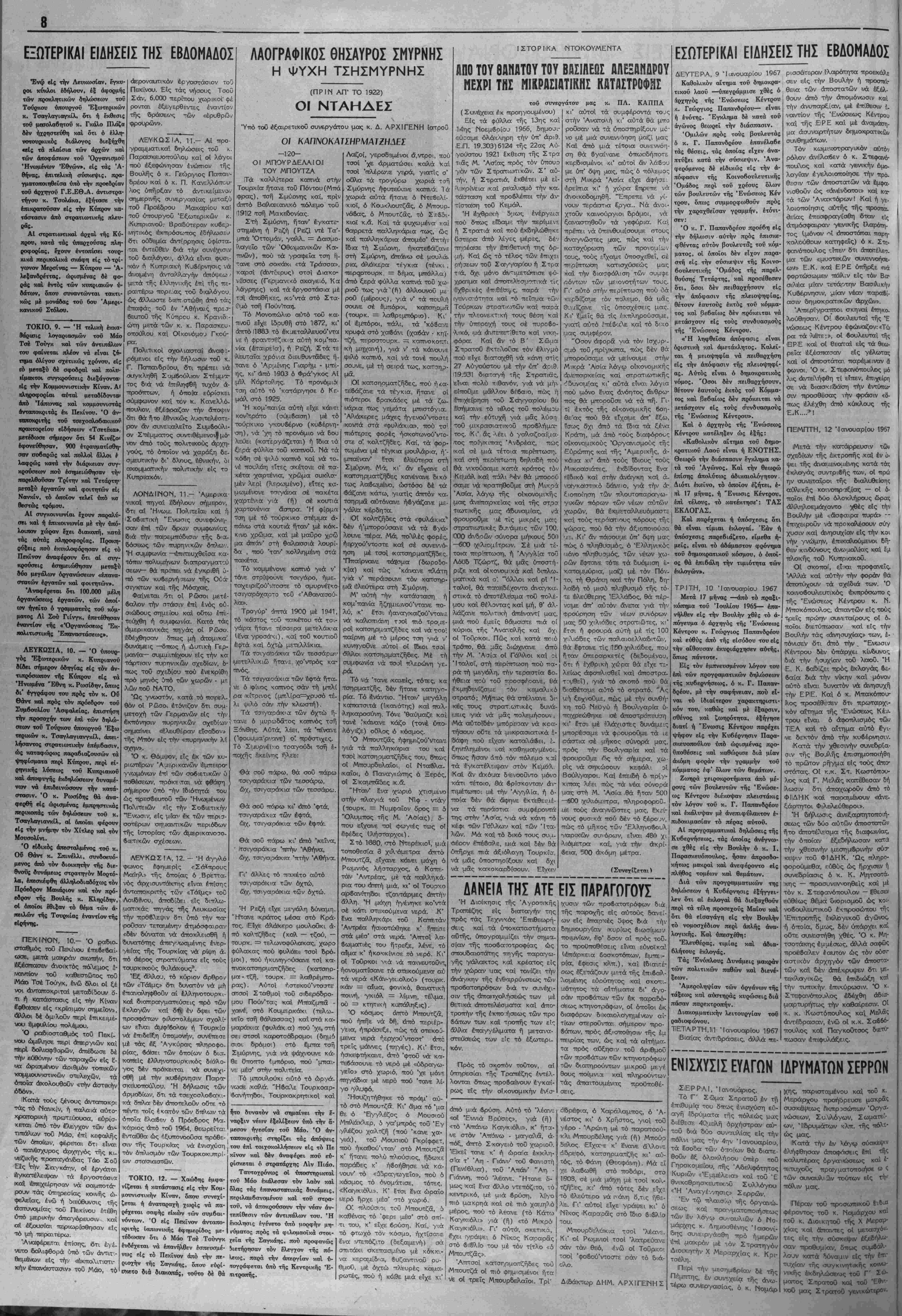ΟΙ -λοόσιοι τοΰ Μπουτζό:, 5 μίρθζ.< ^ το λέισνε (τό κάτω τεπίθεσιν των άντιπάλοτν τού. Ή ικαθένας τό 'φερϊ μέο' στό σττί- Καγικιόλι» γιά (ή) «τό Μιχρό1 έκκλησις ίνένβτο υπό αοοοιίιν ι·—- τι -ηηιη κ' *Τνΐ: Αη.'™ Κ,^; ^,.α. .. όΐδρέΐφια, ό Χαράλαιμπος, ό Ά- νέστος χι' δ Χρήστος, γιοί τοΰ γέρο - Ά,ρώαη μέ τό παρατσοΰ- κλι Μτπουρ'διέλης γιά (ή) Μπούο δεΐλος <Εΐχος"ε κ' ενανε άλλον ο ιίδρε'φό, κατσηρο.ατζής ικιι' αύ¬ τός, τό Φανή (θεοφάινη). Μά εί χΐ= ιλαιβωθή στό τποδάρι, στο 1ι9Ο3, σέ μ Ά μάΐχη μέ τσοί χοίν- τζήϋ'ες, ικι' «ΐίτΓΟ τότες δέν έκκλησις εγένετο υπό μορφήν μη- τι πρός τά φιλομαοϊκά στοι- τό φτωχό τόν αγικόλι 6ρύση. Καί, γιά ΚαγικιιόΙλυ τής πού προφανώς ένόέχεται νά επανήλθεν έσπευσμέ- ^ετήρησαν τόν έλεγχον τής πό- νως είς τό Πεκΐνον άπό την -- Ιεως, παρά ^ ^^[αν ^ ύ. οιοχην της Σαγκάης, όπου βύρί- Γτογράφβται υπό της Κβντρικής Έ- ·~— δια διακοπάς, τουτο βέ θά «ιτροπής. ,-*^-^-;-ίΓ ΐσσνε 1 Γι' αύτά·, δ ς ιχ τό ιέλ.εύτερο νά ι^άινη δ,τις νηθε- λ)ε. Γι' αύτοι εΐχε γ,ράχΐτει κι' δ Νΐχος ιΚαραρας στό Τ&ιο βΐιδλ'ο τού. ιΜτΓουρδΐ=λάκια τσοί ντεπόζιτο (δ,ξα,μενή) σά ^ .^^ ^^'^^ί *' θί ?^^ ™« Ί"***** σττιτάΐκι σκεττασιμίΐνιο μέ κό'κκ1.- να κεραιμίδ'3, βυζαντινοΰ οο- θΐμοθ, μΐέ όχτώ τλ'ευρές καμα- ■ρωτές, ττού ή κάθε μιιά εΐχε κι' σαν τάν Οεό, ·ένω οί Τοΰρκο· τσοί 'φο6ού'ντο(3ιτε σάν τό διά- Άΐτττσοί κατσΓ^ιμαιτΙζήιδες τού ιΜπουτζά οί ττιό φηιμισιμέαοι ήτκ ν^ε οί τρείς Μπουρδείλαΐοι. Τρί' Διΐδιάκτωρ ΔΗΜ. ΑΡΧΙΠΕΙΝΗΣ ΔΙΕΎΤΕΡιΑ, 9 Ί'ίνουαρίου 1967 Καθολικόν αίτημα τοϋ δημοκρα¬ τικόν λαοϋ —υπεγράμμισε χθές ό άρχηγός τής Ενώσεως Κέντρου κ. Γεώργιος Παπανδρέου— είναι ή ένότης. "Εγκλημα δέ κατά τοΰ αγώνος θεωρβϊ την διάσπασιν. "Ομιλών πρός τους βουλευτάς 6 κ. Γ. Παπανδρέου έπανέλαβε τάς θέσεις, τάς οποίας είχεν άνα- πτύξει κατά την σύσκεψιν. Άνα- φερόμενος δέ εΐδικώς είς την α¬ πόφασιν τής Κοινοβουλευτικής "Ομάδος περί τού χρέους δλων των βουλευτών τής Ενώσεως Κέν τρου, όπως συμμορφωθοϋν πρός την χαραχθείσαν γραμμήν, ετόνι¬ σεν: Ό κ. Γ. Παπανδρέου προέβη είς την δηλούσιν αυτήν πρός έπισκε- φθέντας αυτόν βουλευτάς, τού κόμ- ματος, οί όποίοι δέν είχον παρα- στή είς την σύσκεψιν τής Κοινο- βουλευτικής "Ομάδος τής παρελ¬ θούσης Τετάρτης, καί προσέθεσεν ότι, δσοι δέν πειθαρχήσουν είς την απόφασιν τής πλειοψηφίας, θέτουν εαυτούς έκτός τοϋ κόμμα- τος καί βεβαίως δέν «ρόκειται νά μετάσχουν βίς τούς συνδυασμούς τής Ενώσεως Κέντρου. «Ή ληφθεΐσα απόφασις είναι όριστική καί άμετάκλητος. Καλεί¬ ται ή μειοψηφία νά πειθαρχήση είς την απόφασιν τής πλειοψηφί¬ ας. Αύτός είναι ό δημοκρατικάς νόμος. "Οσοι δέν πειθαρχήσουν, θέτουν εαυτούς έκτός τοϋ Κόμμα- τος καί βεβαίως δέν πρόκειται νά ιιετάσχουν είς τούς συνδυασμούς τής Ενώσεως Κέντρου». Καί ό άρχηγός τής "Ενώσεως Κέντρου κατέληξεν ώς εξής: «Καθολικόν αίτημα τού δημο- κρατικού Ααον είναι ή ΕΝΟΤΗΣ. Θεωρώ την διάσπασιν εγκλημα κα¬ ί τα τού Αγώνος. Καί την θεωρώ έπίσης απολύτως άδικαιολόγητον. Διότι έκεϊνο, τό οποίον εζήτει, ε¬ πί 17 μήνας, ή "Ενωσις Κέντρου, επί τέλους, τό ,κατέκτησε': ΤΑΣ ΕΚΛΟΓΑΣ. Καί παρέχεται ή ύπόσχεσις ότι θά είναι τίμιαι εκλογαί. Εάν ή ύπόσχεσις παρεβιάζετο, είμεθα η¬ μείς, είναι τό όδάμαστον φρόνημα τοΰ δημοκρατικοΰ κόσμου, ό οποί¬ ος θά επιβάλη την τψιότητα των έκλογών». ΤΡΙΤΙΗ, 10 Ίανουαρίου 1967 Μετά 17 μήνας —άπό τό πραξι- κόπημα τοϋ Ιουλίου 1965— επα¬ νήλθεν είς την Βουλήν χθές τό ά-| πόγβυμα ό άρχηγός τής "Ενώσεως Κέντρου κ. Γεώργιος Παπανδρέου καί ευθύς άπό τής εΐσόδου τού είς την 