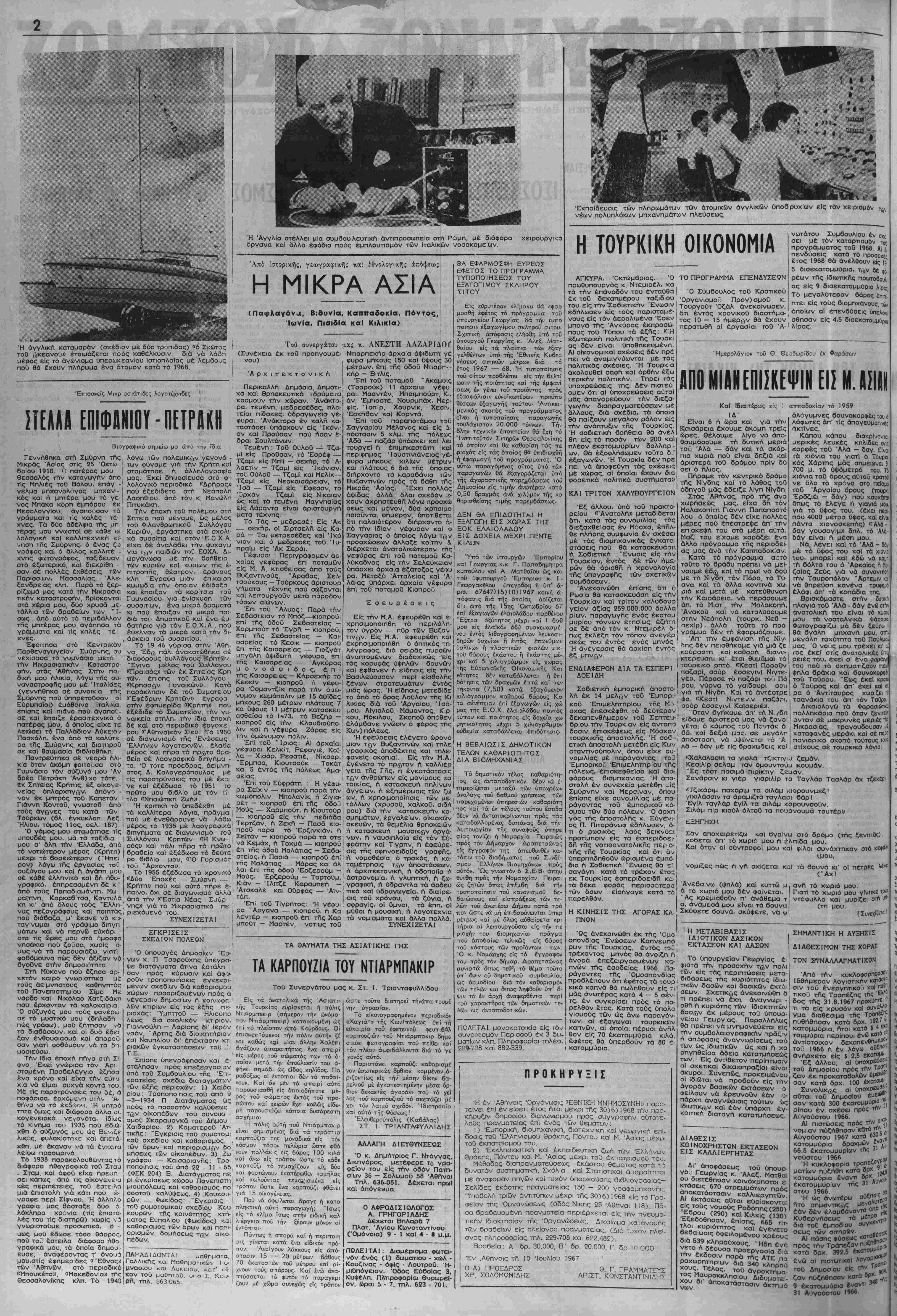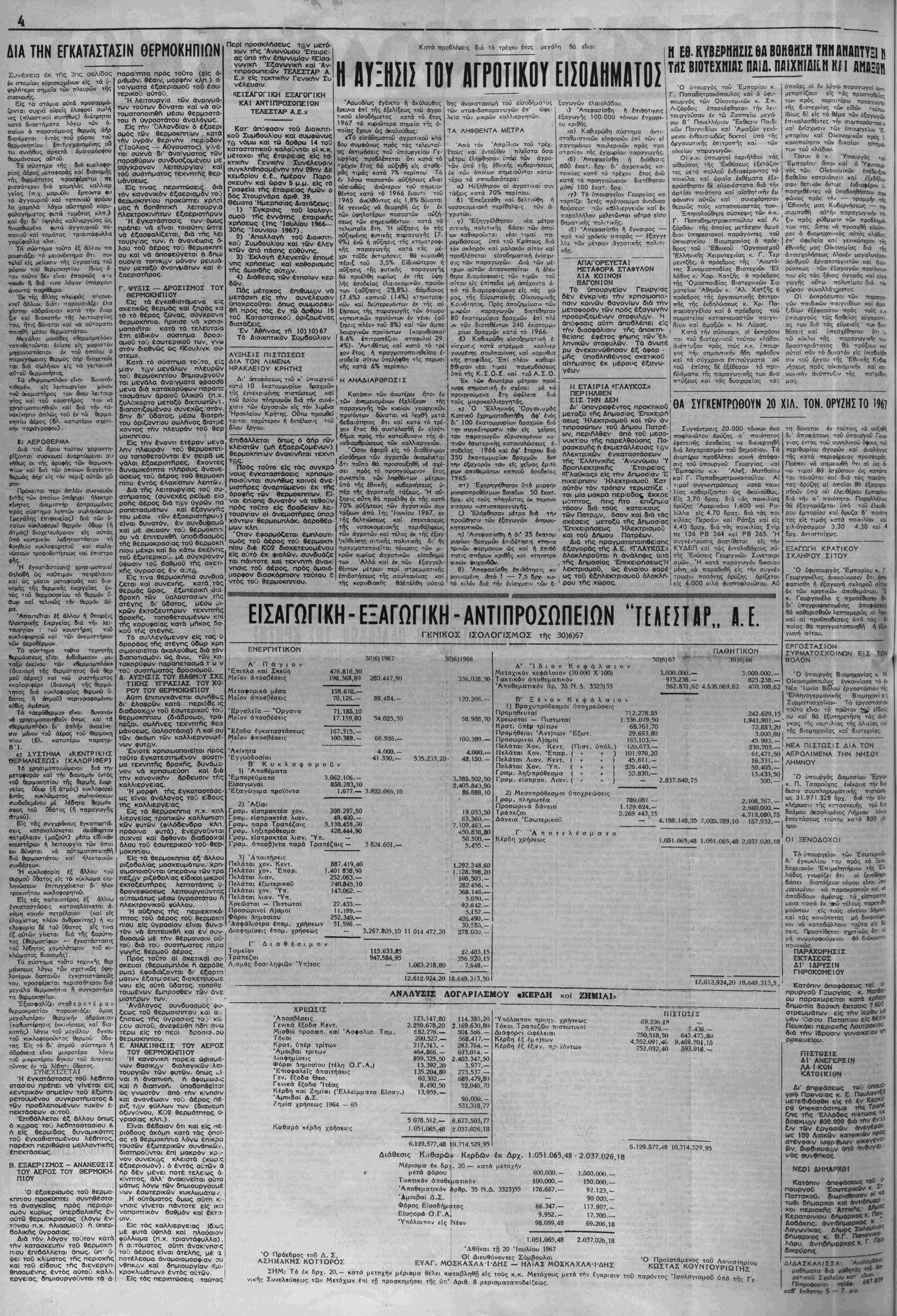 δοχήν ό τάφος αυτού εύρ!σ<ετο έν Κυνοσούρα τής Λακωνίας ή της Άρκαδίας. Βραδύτερον μετηνά- στειισεν ώς ττνε&μα είς 'Επίδαυ- ρον καί κατόπιν έμυήθη είς τα "Ελευσίνια Μυστήρισ. Κατά τδν Δελφικόν χρησμόν ό Άσκλητπός εγεννήθη Τνα άπο5? δ μέγας σω- τήρ των έν τώ κόσμω πασχόντων έκ ττατρικής χάριτος καί όνττβς έδοξάσθη καί έλατρευετο εν Τ3*κ. έπωνύμοις ναοΐς τ' ΆσκληττΐΓΪα άττό Στ' ττ.Χ. μέχρι Δ' μ.Χ. αΐω- νων δτε έιτεκράτησεν ή θρησκείσ τοΰ Χριστοΰ σωτήρος καί ττρο- στάτου άττό παντός κ α κ ο ΰ σωματικοΰ καί ήθικοΰ καί μεγάλου ίατροΰ των ψυχών καί των σωμά- των διά τούς πιστεύοντας. Διά των διασήμων δι' υ'ιών τού καί των επι γενομένων έν συνεχεία άττογόνων αυτών εδημιουργήθη ή ίατρική πά ράδοσις των Άσκληπιαδών. Έν βραχεΤα ό Άσκληπιός έθεωρεΤτο χθονία θεότης εΤχεν ώς σύμβολον τόν δφιν καί έν τώ άιδύτω έττεφαί· νετο είς τούς ΰττνω διατελοΰντας άσδενεΐς οΐτινες προηγουμένως προηγουμένως είχον καταλλήλως τταρασκευασθή ύττό των ίερέων τού ίκανών ιατρών. Άσκληπιεϊα υ¬ πήρχον έν Έτπδαύρω Τρίκκη Κνί δω Κ ώ καί αλλαχού έ< δέν των αυτοίς εΰρεθεισών πλαχών κα! άνα θημάτων πληροφορούμεθα ττεοί τώ/ θεραπευτικών μ€θόδων των Ά¬ σκληπιαδών κα! των θαυμασϊων Ιάσεων των ττασχόντων. ΣΥΝΕΧΙΖΕΤΑ1 ΒΡΑΒΕΥΣΙΣ Ι ΜΙΚΡΟΝ ΕΠΙΧΕΙΡΗΧΕΟΝ | Τό "Ελληνικόν Κέντρον αΠ- ραγωγικότητος είς τα πλαίσια τής προσπαθεάας αυτού διά τήν αύξησιν τής παραγωγικό- τητος των μικρομεσαίων έπιχει ρήσεων καί τήν εφαρμογήν; είς αύτάς των συγχρόνων άρ χων καί μεθόδων τής όργανώ-' σεως, διά τήν βελτιωσιν τής ά ποδοτικότητός των, απεφάσισεν, δπως βραβεύση μικράς έπιχει- ρήσεις, αί οποίαι εζήτησαν μέ¬ χρι τούδε την συμπαράστασιν τής ύπηρ£σας τεχνικών πληρο φοριων αυτού (τομεύς έφαρμο γών). έφήρμοσαν τάς γενομέ νας πρός αύτάς ύποδείζεις καί έν συνεχεία έπραγματοποίη-' σαν προόδους είς τήν όργάνω σιν αυτών. ΑΙ ΠΟΙΟΤΙΚΑΙ ΠΡΟΔΙΟΓΡΑΦΑΙ ΤΗΣ ΠΑΡΑΔΙΔΟΜΕΝΗΣ ΣΙΚΑΛΕΩΣ "Η σίκαλις πρέπει νά ανταττοκοί νετσ.1 «.[ς ωρισμένας ποιοτικάς ττρο διαγραςκχς διά νά γίνη δεκτή ττρός τταραλαβήν είς τήν διά λογαριασμόν τού δημοσίου διενεργουμένην άγο ραστικήν τταρέμδασιν τρέχοντος ε- τους. Σχετικήν άττοφασιν ύττέγρα ψεν ό ύττουργός Γεωργίας κ. Αλεξ. Ματθαίου. Κατ' αρχήν η σίκαλις 9ά πρέττει νά είναι ξηρά εντελώς υγιής άπηλλαγμένη έττικιυδύνων ά σθενειών καί έντόμων νά μή πχχρου σιάζη οιανδήποτε άλλο'ιοκην της φυ σίκής όσμής καί τού χρωματισμοΰ :(Κ ή δέ ϋγρασία της νά μή υπέρ οαίνη τό 13%· Διά τής αυτής 6πτο- φάσεως καθορίζονται δύο κατηγαρ! αι ποιοτήτων. Ή πρώτη ποιότης ττρέπει να έχη έκατολιτρικόν βάρος τουλάχιστον 70 χιλ)μων. Ή τιμή εςαγορας της όρίζεται είς 2,60 δρχ· Ή δευτέρα ποιότης πρέττει να έχη έκατολιτρικον βάρος τουλάχι στον 65 χιλ)μων. Ή τιμή τής έν Λόγω ποιότητος όρίζεται ?Ις 2,40 Μιά καινούργ α κοινωνική νουβέλλα ΟΛΟΙΕΓΚΛΗΜΑΤΙΑΙ ΜΕΤΑ ΤΟΝ ΓΑΜΟΝ Τοΰ συνεργάτου μας κ. ΧΑΡ Ι Τ. ΜΙΣΛΗΛΙΔΗ -10- Ξεύρω είς τό συνέδριον των Άθηνων, δέν πρόκειται νά ου ζητηθή μόνον τό ζήτημα τθν γεννήσεων, άλλά ένα πιό με¬ γάλο ζήτημα, τής γενοκτον, ■ άς. Καί εΐσηγητής τοΰ θέμα- τος, θά είναι έκείνος ακριβώς, πού μέ τα άρβρα τού. πρό κοι ρού ώμιλρϋαε 'ΟΠερΙ τοθ άν- θρώπου είς τόν πλανήτην μας». Ό Γιώργος, ό οποίος άκουε τόν παπποΰ τού μέ προοοχή, αύτο κα_ τα τα φαινόμενα θά συζητη ■ Φρά'γκικα Χριστούγεν¬ να, την παραμονή τό βράδυ, ήκανε «Ρεβεγιόν», φαί γλεντι καί χορό, στό δεύτερο πάτω- μα στά μαγαζιά τού. Αύτά ή- κλούσανε. έκεϊνο τό θράδυ, στσί δέκα, κι' οί ύπάλληλοι 