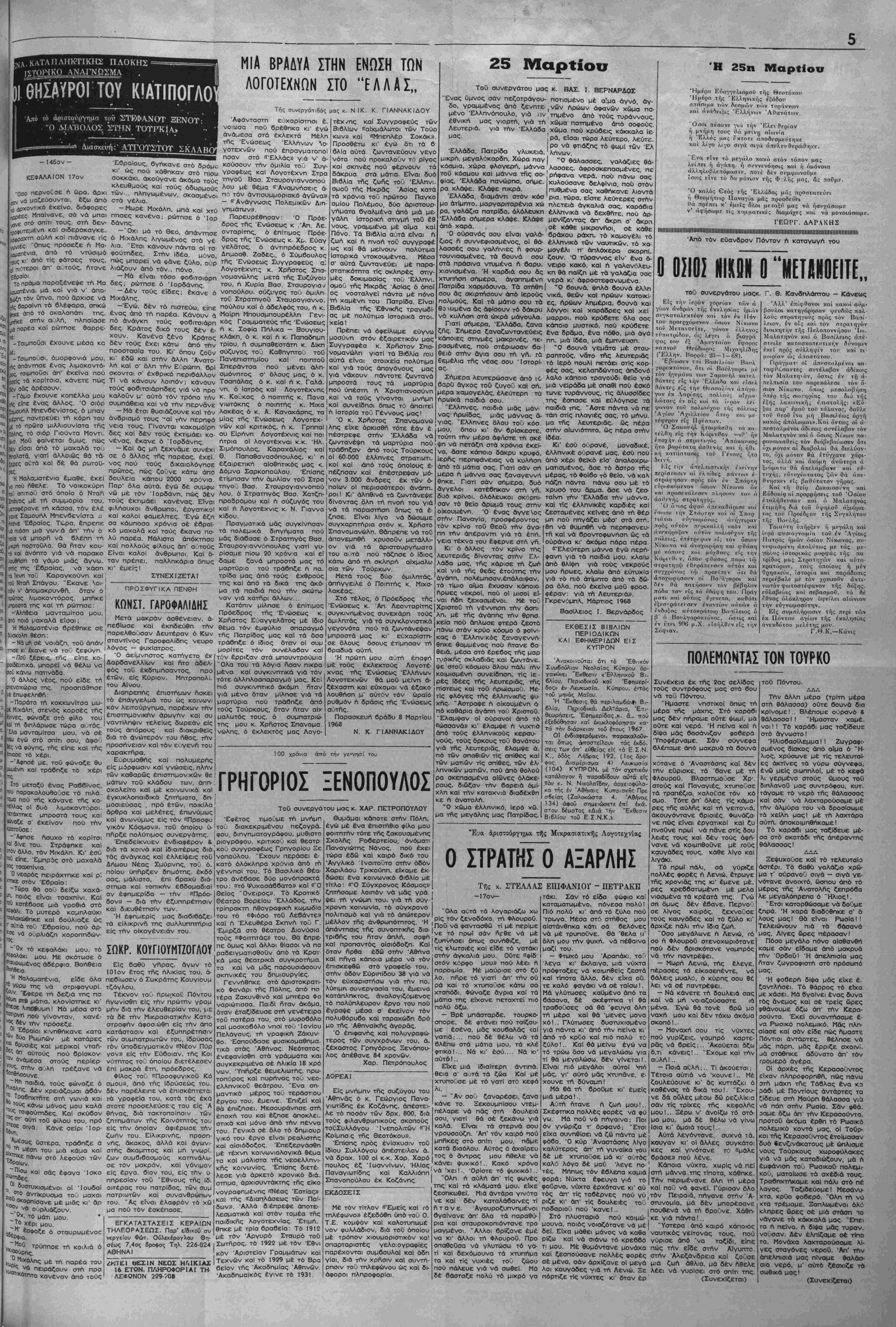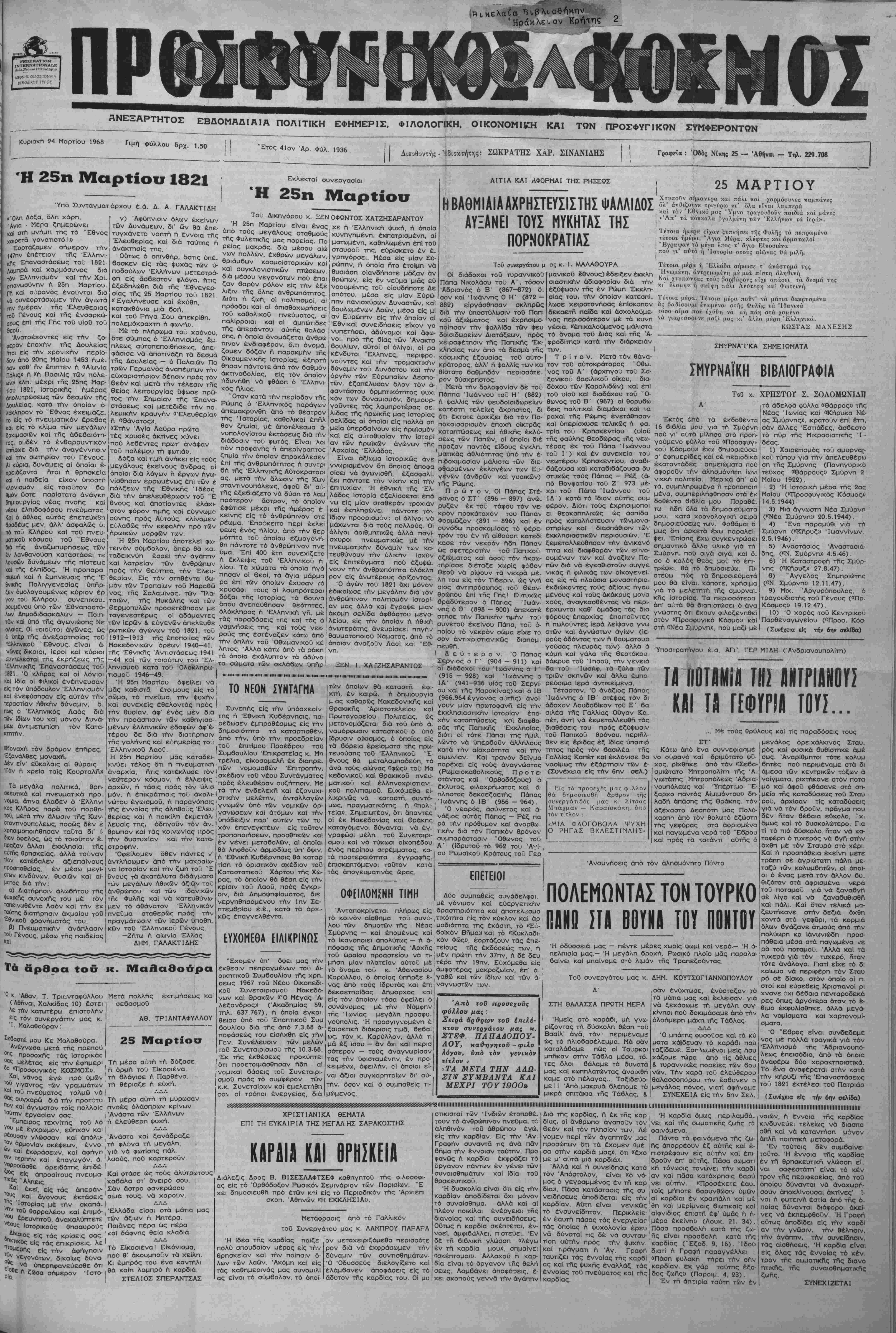 ύα Ιλ ΡΓ<"·«β Ρτ1!1 . ΟΜΟΙΓΙΟΝΛΙΛ πικολιιόϊ ττπογ Κυριακή ?4 ΜαρτΙου 1968 ΑΝΕΞΑΡ·ΓΗΤΟ^-ΒΔΟΜΑΔιΑ,Α ΠΟΛΙΤΙΚΗ ΕΦΗΜΕΡΙΣ, ΦΙΛΟΛΟΠΚΗ. ΟΙΚΟΝΟΜΙΚΗ ΚΑΙ ΤΟΝ ΠΡΟΣΦΥΓΙΚΟΝ ΣΥΜΦΕΡΟΝΤΟΝ Γιμή ψύλλου δρχ. 1.50 Έτος 41 όν Άρ. Φύλ. 1936 Διευθυντής-Ίδιοκχήτης: ΣΩΚΡΑΤΗΣ ΧΑΡ. ΣΙΝΑΝΙΔΗΣ Γραφεϊα : Όδός Νίκης 25 —■ Αθήναι — Τηλ. 229.708 Ή 25η Μαρΐίου 1821 Εκλεκταί συνεργαοίαι Υπό Συνταγματάρχου έ.ά. Δ. Α «'Όλη Δόζα, δλη χόρη, Αγια - Μερά ζημερώνει καί στή μνιΊμη της τό "Εθνος χαιρετά γονατιοτό!» Έορτάζομεν σήμερον την Ι47ην επέτειον τής 'Ελληνι- κπς Επαναστάσεως τού 1821 Λαμπρά κα'ι χαρμόσυνος διά Τ6ν Ελληνισμόν καΐ την Χρι. οτιανωσύνην η 25η Μαρτίου. Γή ούρανός ένοϋνται διά νά. ουνεορτάσωμεν την άγιωτά ημέραν τής "Ελευθερίας το0 Γένους καΙ τής ένσαρκώ- επί τής Γής τού υΐοϋ τού ΘεοΟ. 'Ανατρέχοντες είς την ζο- ιρεραν εποχήν τής Δουλείας ήτοι είς την χρονικήν περίο¬ δον άπό 20ης Μαίου 1453 ήμέ. ρον καθ1 ήν έπιπτεν ή «Αΐωνία Πόλις)) ή «ή ΒασιλΙς των πόλε ών» κλπ. μέχρι τής 25ης Μαρ¬ ιου 1821, ίστορικής ημέρας απολυτρώσεως των δεσμών τής Δουλείας, κατά την οποίαν 6 λόκληρον τό "Εθνος έχει-μάζε. το είς τό πνευματικόν έρεβος καΙ είς τό κλίμα των μεγάλων δοκιμασιών κα'ι τής άβεθαιότη- ΓΑΛΑΚΤΙΔΗ Υ) Άφύπνισιν δλων έκείνων τών Δυνάμεων, δι' ών θά έπε- τυγχάνετο νοητή ή έννοια τής °Γ Α . · ____-, •Ελευθερίας καΐ διά ταύτης ή ΤΠ<· Φυλετικί2ς μας πορείας. Πό Ή Ή 25η Μάρτιον Τού Δικηγόρου κ. ΞΕΝ ΟΦΟΝΤΟΣ ΧΑΤΖΗΣΑΡΑΝΤΟΥ 25η Μαρτίου είναι ένας χε ή "Ελλην,κή ψυχή. ή όποία ™Λ..μ5γ6λους σταθΜθύς ] κυνηγημένη, έκπατρισμένη, αί άνάκτησίς της. ρείας μακράς, διά μέσου αίώ .„ " 1 ' "" . .. . . νων πολλών, έχθρών μεγάλων, Ούτως ό σπινθήρ, όστις ύπέ. θΛιΑ,.«.....'____·- - ί ά ρ, ις ύ θοσκεν είς τάς ψυχάς των ύ- ποδούλων Έλλήνων μετεστρά- ματωμένη, καθηλωμένη επί τού σταυρού της, ευρίσκετο έν έ- γρηγόρσει. Μέσα είς μίαν Εύ· ώ Τη η χ κοσμοίστ°Ρ1κών καΙ ρώπΓτν. ή όποία ήτο ετοίμη νά και συγκλονιστικων πτώσεων,! - ■ εξεδηλώθη διά τής 'Εθνεγερ- σίας τής 25 Μαρτίου τού 1821 «Έγαλήνευσε καΐ έχύθη, καταχβόνια μιά θοή, καΐ τού Ρήγα Σου άπεκρίθπ, πολεμόκραχτη ή φωνή». διά μέσου γεγονότων ποϋ έπσ· ξαν βαρύν ρόλον είς την έξε λιξιν τής δλης ανθρωπότητος. Διότι ή ζωή, οί πολιτισμοί, αί πρόοδοι κα'ι αί όπισθοχωρήσεις πνεύματος, αί αί άμπώτιδες τοϋ καθολικοϋ παλίρροΐαι κα! ~· "."■"-",""."" " τ-··_·"· τής άπεράντου αυτής θαλάσ Μέ τό πλήρωμα τού χρόνου, ρ όπο|α ονομάζετα, ανθρω ότε σύμπας ό Ελλην,σμός έμ. πινον ενδιαφερονι 0,τ, όνομα_ πλεως αυτοπεποιθήσεως, άπε- ζ δόξαν η παρακμήν τής φάσ.σε νά άποτ.νάζη τα δεσμά Οίκουμενική ίστορίας. έςηρτή της Δουλείας - ό Παλαιών Πά θηοαν παντοτε από τον βαθ ον τρών Γερμανός αναπέμπων την α<τινο6ολίαςι είς τον όποίον ευχαρ,στήρ,ον δέησιν πρός τόν ήδυνήθη να θαση ό ,Ελληνΐ. Θεόν κα'ι μετά την τέλεσιν της <ώ ^Λ Θείας λειτουργίας ϋφωσε πρΰ- .. τος την Σημαίαν τής 'Επανα- στάσεως καΐ μετέβιδε την πό. απεμακρύνθη άπο τ0 θέατρον λεμικήν κραυγήν «Ελευθερία)) ,^,. .,„__,__.._„.,___ . -- "Οταν κατά την περίοδον ττκ Ρώμης ό Ελληνικάς παράγων ή «Θάνατος». «Στήν Άγία Λαύρα πρώτα τές χρυσές άκτίνες χύνει τος, ουδέν τό ενθαρρυντικόν πού λεβέντες πρωτ' άνάψαν ύπήρχε διά η αέ [ καΙ την σωτηρίαν τού Γένους. την αναγέννησιν [τοΰ πολέμου τη φωτία». Αί κυρίαι δυνάμεις αί οποίαι έ- χρειάζοντο ήτοι ή θρησκεία καί ή παιδεία είχον υποστή κλονισμόν είς τοιούτον θα- 8μόν ώστε παρίστατο άνάγκη δημιοΐ'ργίας νέας πνοής και νέου έλπιδοφόρου πνεύματοο Καί ό άθλος αύτός επετεύχθη βραδέως μέν, άλλ' ασφαλώς υ¬ πό τού Κλ