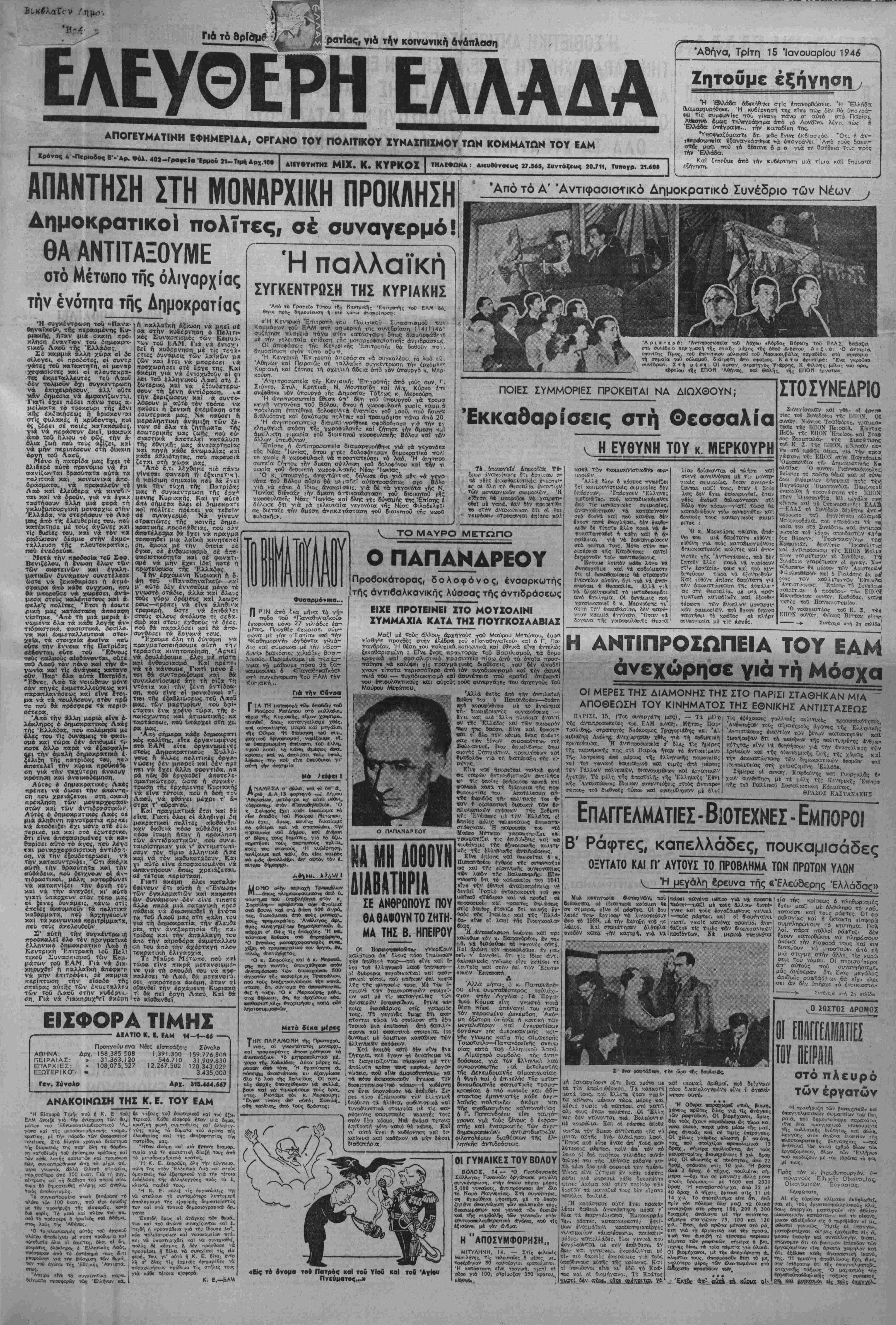 Καΐ ίπτΡθυε άττό την κυβέονηση μιά τ(υ<α καί δημοσία εξηγήση. Άπό τό Α' Άντιφασιστικο Δημοκρατικό Συνέδριο των 'Η «νγκίντρ^οη τού θηνκΐκβΰ», της πβρβσμίΛ—ς Κ»» , ή τα ν μιά οκαιη ΐτρβ- ιη έναντίβν τού δημοκρα¬ τικόν Λα«ΰ τής ΈλλκΛχς. Σέ καμμιά άλλη χώρα οί δο σίλογβι, οί προύοτες, οί συντ.ρ γάτες τοΰ κβτακτητη, ©·1 μβν-αρ ί ί ί ^ χΕφααιοτες καί οί το; εχμβτοιλλευτες δέν τολμβΰν οχι ονγκέντρωεη νά έκιχβιρήαουν. άλλ' ού τε Μ&ν δημοσία νά έμφαντζωντνι Γιατί ίχα πέσίΐ πάνω τβυί ά μίίλικτα τβ τσί-κούρι τής 48νι ς εκδικήσεως ή δριακοντ: ς φυλχκες ή κρύδονται, π*ι ς φς π ός ξέςει σέ τιοιές γιά νά ίτίράαβυν έκεΐ, μακ «πό τοΰ ηλίου το φώί, την 4 βλια ζωό ποΰ τους άςί;«ι, χκί νά ιιίγν π«ριπέαοι>ν ατή δικαιη