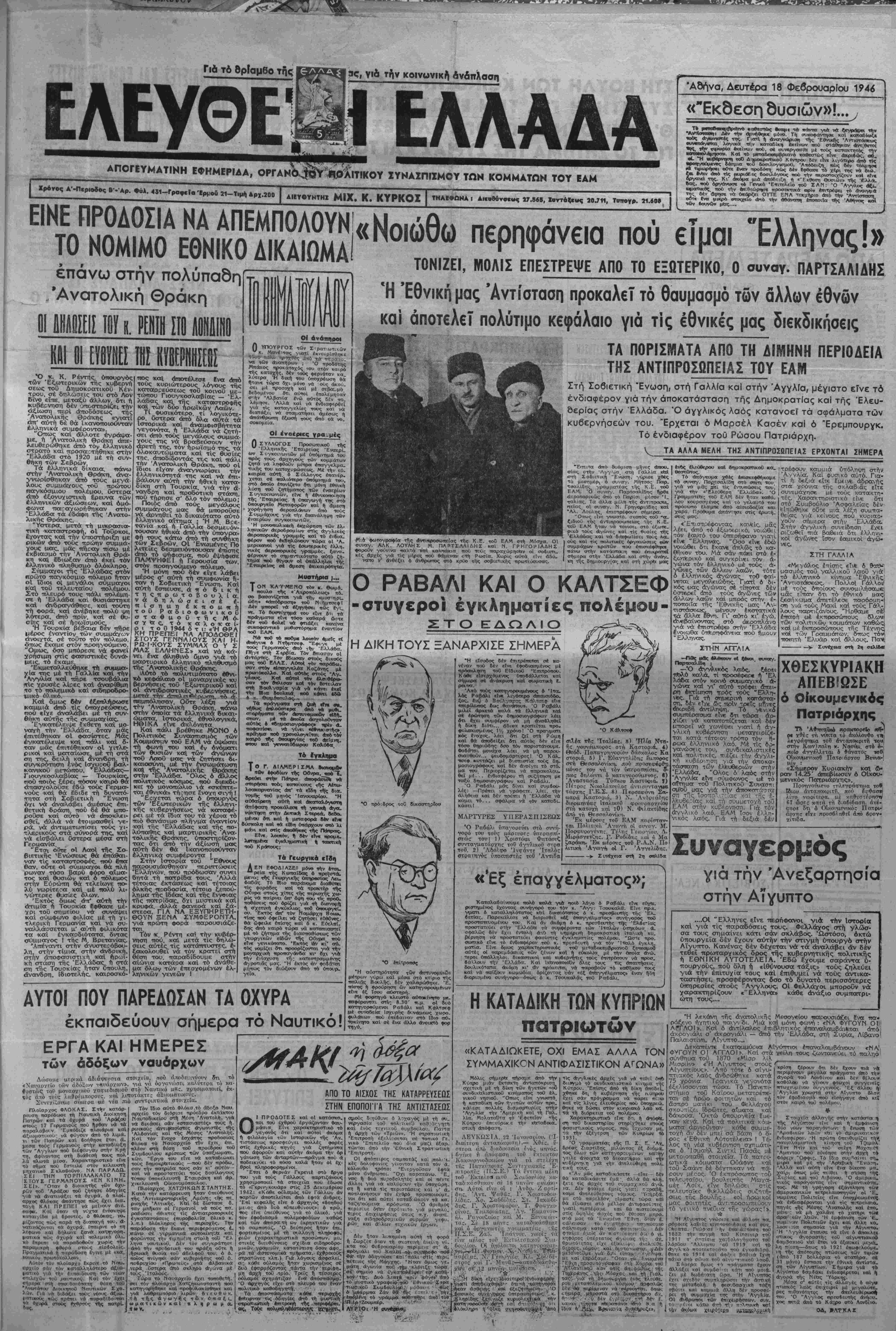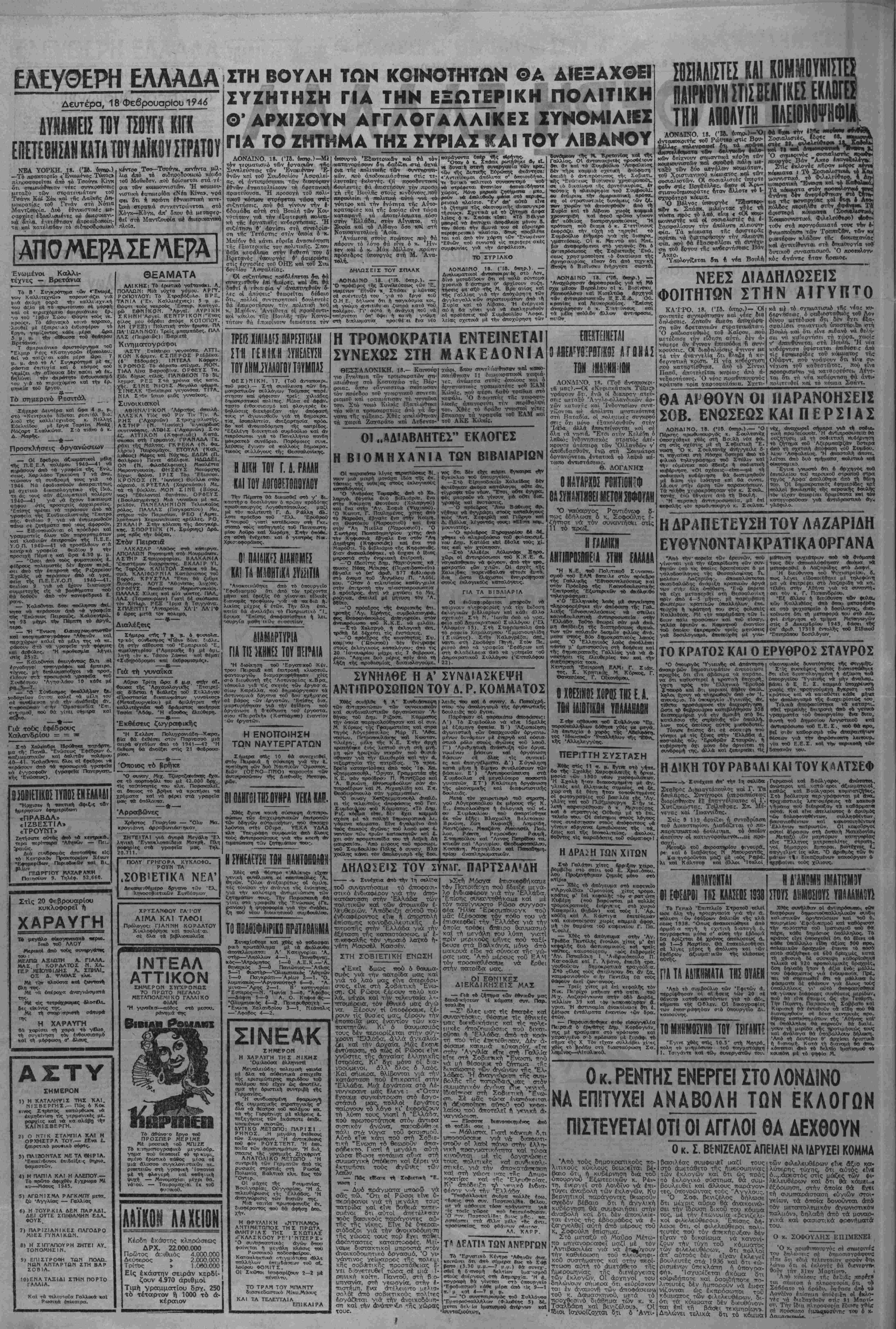 Χρόνος Δ'-Π<ριοδος Β'-Άρ. ♦ύλ. 431-ΓραφεΙα 'Ερμού 21-Τιμή Αρχ. ΙηθΛΙΤΙΚΟΥ ΙΥΗΑΙΠΙΙΜΟΥ ΤΩΝ ΚΟΜΜΑΤΩΝ ΤΟΥ ΕΔΜ ΑΙΕΥΦΥΝΤΗΧ ΜΙΧ. Κ. ΚΥΡΚΟΙ ΤΗΑΕΦΑΝΔ ι Δκ«8ύτο«««ς ΙΤ,Μβ, Χ*τταΜ«*« 20.711, Τυπογρ. 21.609 τ 'ΑΒήνα, Δευτέρα 18 Φεβρουαρίου 1946 «ΊΞκδεση δυσιών»! ···· την —«ΛρΛνό «αβιστώς θκ~ιι τα κάντα γιά νά ν. Δβν την άρνήθ—α μόνο. Τή συκοφαντηαε χαί _~..~-^~ν. «οθς Λγωντβτίς της. ΓιατΙ ή αναγνώρι — τής "Εθνυσνς "Λντΐιστα—ως ανν—άτγ·!—, λογιχά "η,ν καταδΐκτ) εκείνον πού σιάθήικοον αντ[θ·~1 •Κ, νην τΗΚ»Ρ^α «κιΐνων «ού, σ* συνιρνασΐο μέ τούς καταχτητής τ*ΐν ■—ο«—λΐμηοαν. Κ αί τό μι—χδεηβμφριανό καθβττως Είνε. αχριίώς, ο», «1. *Η «υ(Μρνη— τοθ Δ ιμοτκροοίιικοθ Κέντρου δέν είνε λιγότϊρο <*π* τίς ■ρο—/ούμτν— δόσμια τοθ δόσιλογισμοθ. 'Λπόοειξη «ώς 6*ν τόλμτ)σ« ψα Τφωρή—ι ©Οτι Ινοτν -προβή— ηώς δέν Εφθασε τό χέρι της νά 6»ώ- ί» εν*κν α«ό Ής κυριθΥες δοσιλάγους πού την —ρκττοιχΐζουν κο* ΰν« ΟργθΛ** της. Κι' άκόμα μιά όπσβειζη ή «"Εκθβση θυσιών» της ΈλλΛ. βοος, —6 (φγύΛΚύΉ τ* Γινικό ·Επιτϊελ£Ϊο τοθ ΖΑΝ: Ό "Λγγλος α(ι. θΜκττικόν; πού την *ττιθεώ™— προσεκτικά πρίν *ιητρέψει τό ίνοιγμβ της δίν 'αφησι νά (ηάρξ/ίΐ ΟΥΤΈ ΕΜ Α τεκμήριο *ΐτό την 'ΑντΙοτα— οθτ* (να μκκρό —Λχιιο Ληό την αθανα— εποποτΐα της Αθήνας κα των (ουνθν μας.... επάνω στήν πολύπαδη /Ανατολική Θράκη 01ΙΜΒΗΙ ΐΟΪΙ ΣΤΟ 111 II ΟΙ ΕΪ61ΙΙΙΠΜΗ |ιε, λευ "Ο κ. Κ. Ρέντης. Οηοοριγός των Εξωτερικών της κω&ερνή σεωχ; τοΰ ΔηιμοκρατικοΟ Κέν- τρου, σέ δηιλωσεις τού στό Λον Βινο εί—ε. μ£τ«ξύ άλλον, δτι τ) •χυ&έρνηση 6έν ·οπο<ΓΓη,ρί)ζει την ώξίωση περΐ (ί~οδόσ€α>ς της