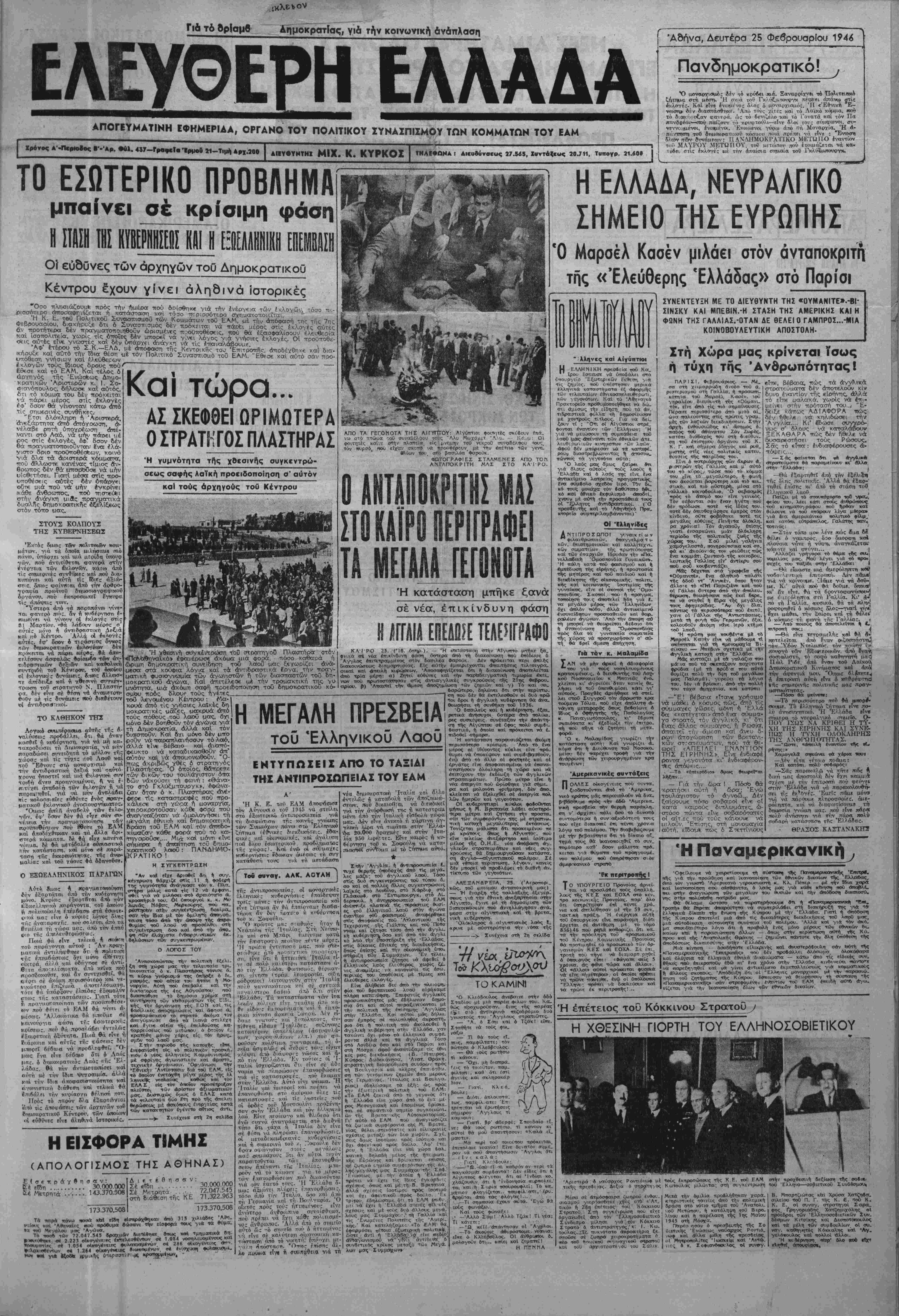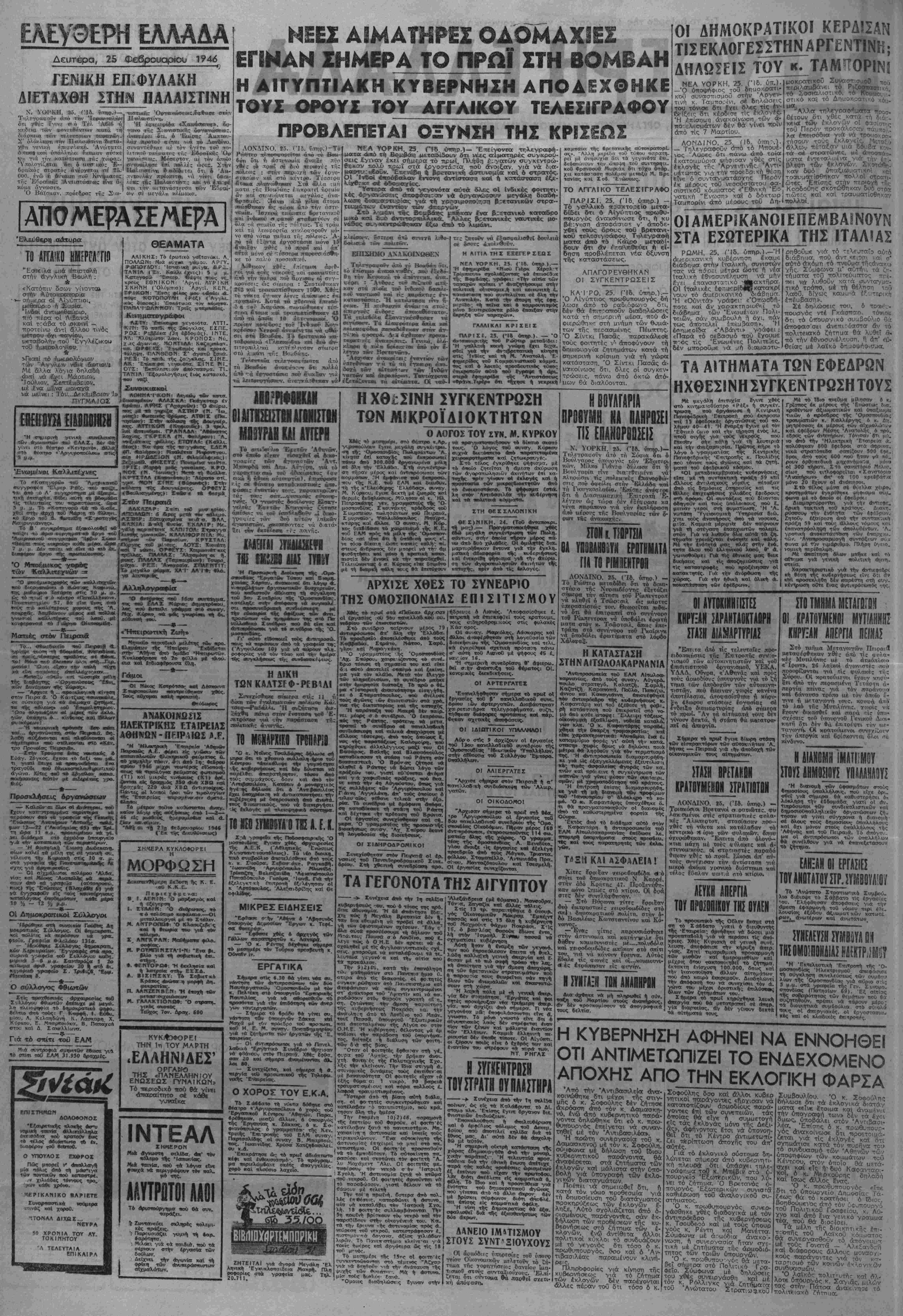 'Αδήνσ, Δευτέρα 25 Φεβρουαρίου 194<$ Πανδημοκρατικό! ^ Ό αοναοτιβιιος ·δέΛ· τΑ κονΛβι πιά. Εαναρρίννει τό Τϊολιτϊΐβχλ ίήττκκΐ. στή ιιβστ). Ή σκ.ιά τοϋ Γκ/ι'«ζατ«νι·ογκ πέφΛ«ι _ απάνω στΐϊ έκλογές.Καί βΐν* Ινωνΐνο; ή/ος 6 μοναρχιηιιος. Ή €'Εθ·νικίι Ε-^- νωοι» δι ν διασπά<τθτ>κε. Άτο τι>ϊι; χιτε; «αι το Ααικό καμμιά. ~)ί.«