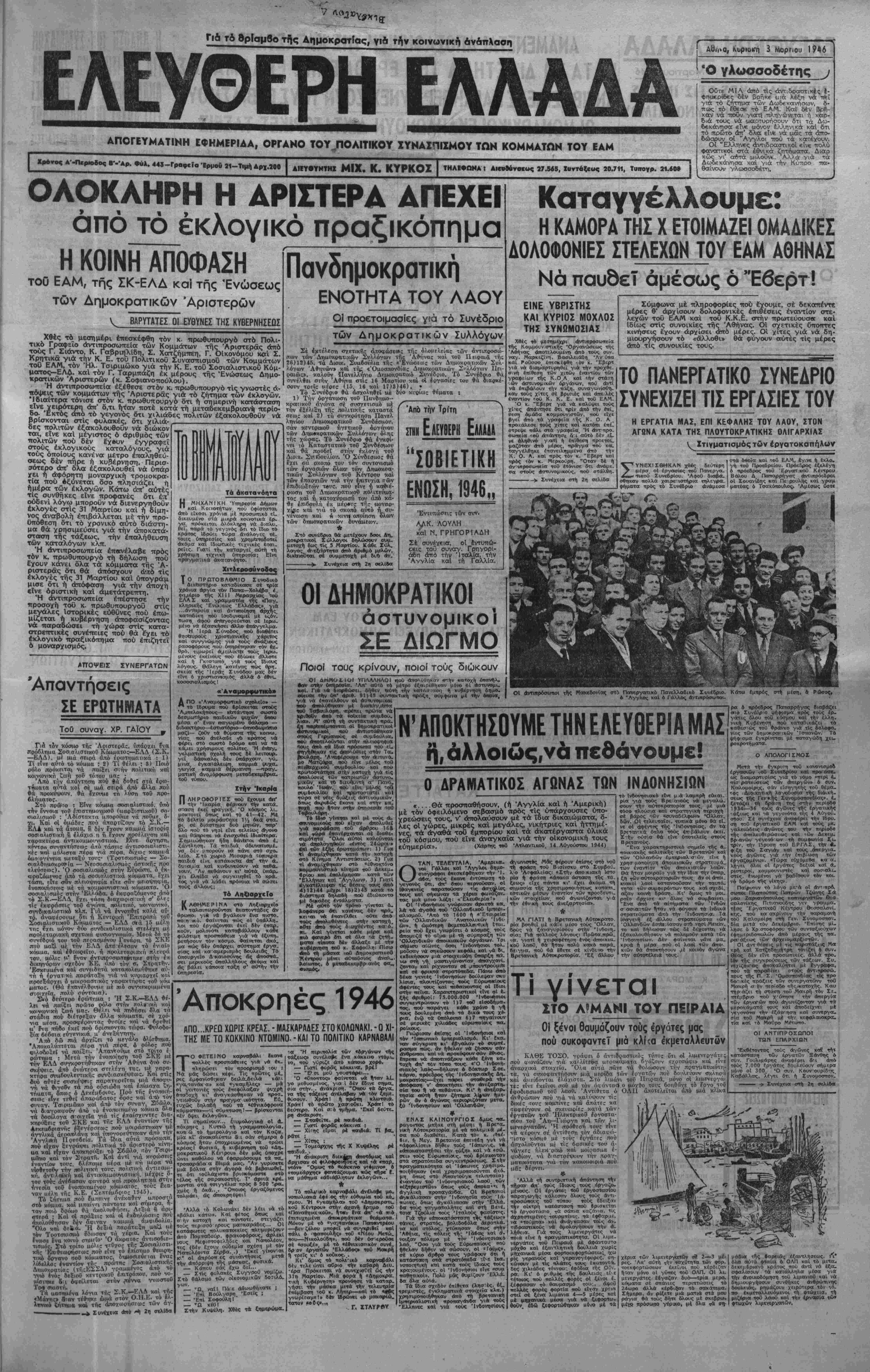 τήν δλη στάση καί τή συμερ<νη ό·νμ. περιφορά τοθ κ. "Είερτ κοτί ζητοϋμε την άμεση άπομάκρυνσή' χου άπό τή Διεύθυνση τής 'Αστ^νομΙας. Καλοϋμε δλου·- τούς κομμουνιστές τής Αθήνας, δλους τούς συμπαθοϋν. ί ό δ Ν λό ά έ ■μΙζ€ΐ «ώς μ—ρίϊ ν* συμιΐεριφίρίΤαι δπως καί στήν κατοχή πού εΐχε τίς πλάτες τοθ Σ ιμάνατ. ζητάει 4ηο ττ)ν κυίέρνηση την ό-μέση ά—μάκρυν- ση τού, γιοπΐ λεΐ κίνδυνο τάξη Ι ή παροβμονή τού ολιοτγ. γιά την ήσυχία καί τήν Καλεϊ τό 8ημο.κρατικό λαό τής ■Α¬ θήνας νά έπαγρυπνεΐ καΐ νά περιφρο^. ρήσει τα γραφεϊα των όργανώσεών τού. Πολ. Ζ υναο—.ο-γιός ΕΑΜ "Αθήνας ΠΑΝΑΪΜΟΚΡΑΤΙΚΗ ΕΗΟΤΗΤΑ ---------*. Συν^χεια άπό την 1η σελΐδα τκτροο-ώπους τού έξουσιοδοτηιμένους καταλλήλως. Σ4 60 «ερίπου άνΐρχοντχχι οί Δή. .μοκροπικοΐ Σύλλογοι οτήν "Αθηνά και στόν Πειραια που άριβμεϊ ό κοτθένας άπό 1.000—3.000 καί 5.000 ένεργά μέλη. Σ'τοιχεϊα γιά τόν άκριβή άρι. θμό των Συλλόγων στίς έταρχίες δέν ύπάρχουν ύπολογιζεται δμως ΰ"η πά νω άπό 100 θά λιιιτουργοϋν στΐς πό λεις καί στΙς ,μεγάλες κωμοπόλεις" Είνε δμως άμφίρολο άν θά κατοοβω, θεϊ νά λώίουν μέρος στά Συνέδριο δ- λοι. γιχχΐί λόγοι τεχνικοί, ονγκοινωνι. ακοί καί οίκονομικοί δέν εύνοοΰν τήν άτοοτολή άντιπροσώπων. Τό Συνέδριο θά συνέλθη κ—ά η& σσν πιθανότητα στό θέατρο «Όλύμ πια» γιά την παραχωρήση ^οθ όποίου *) «Ένωσις Δημοκρατ«ί>ν Συλλόγων