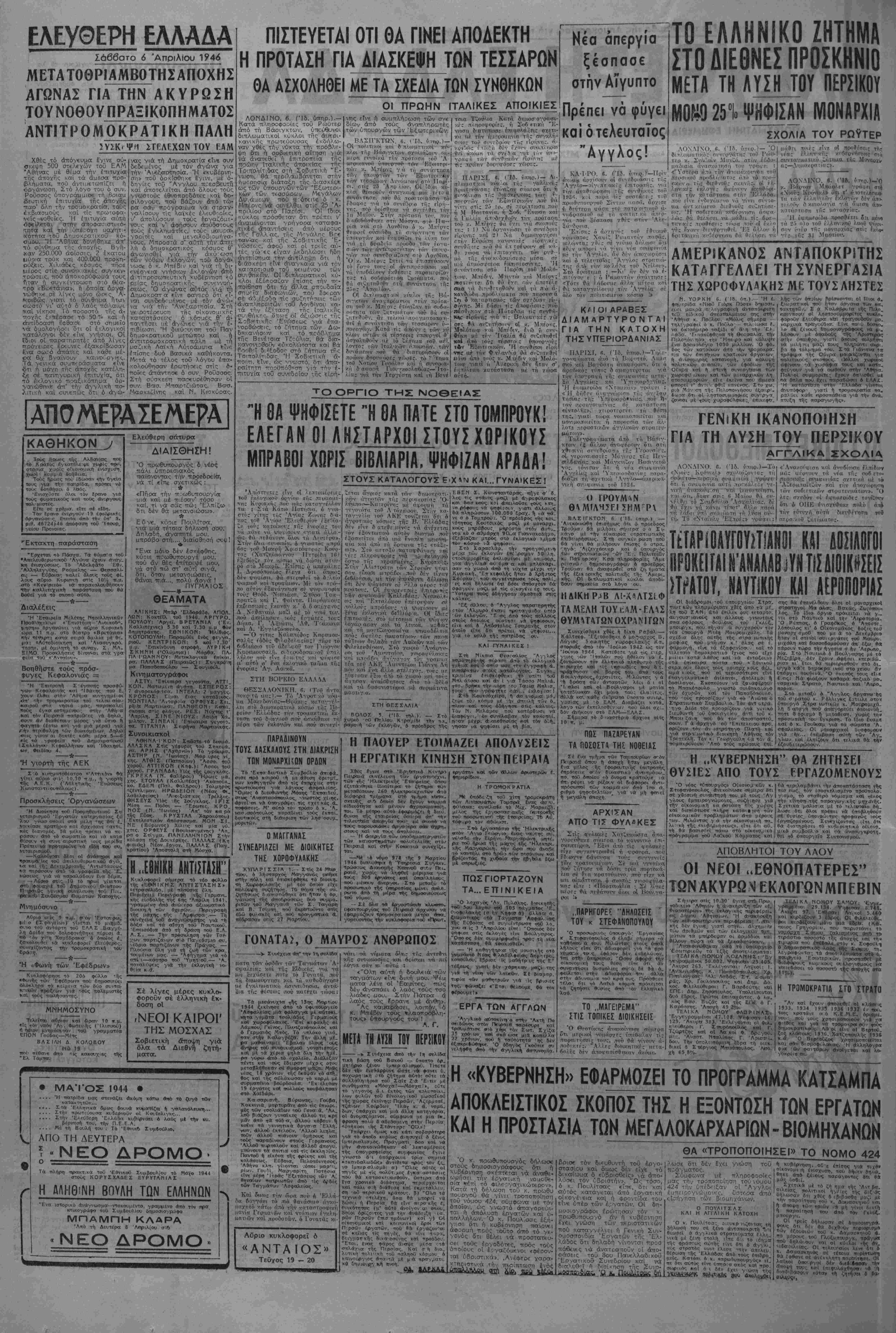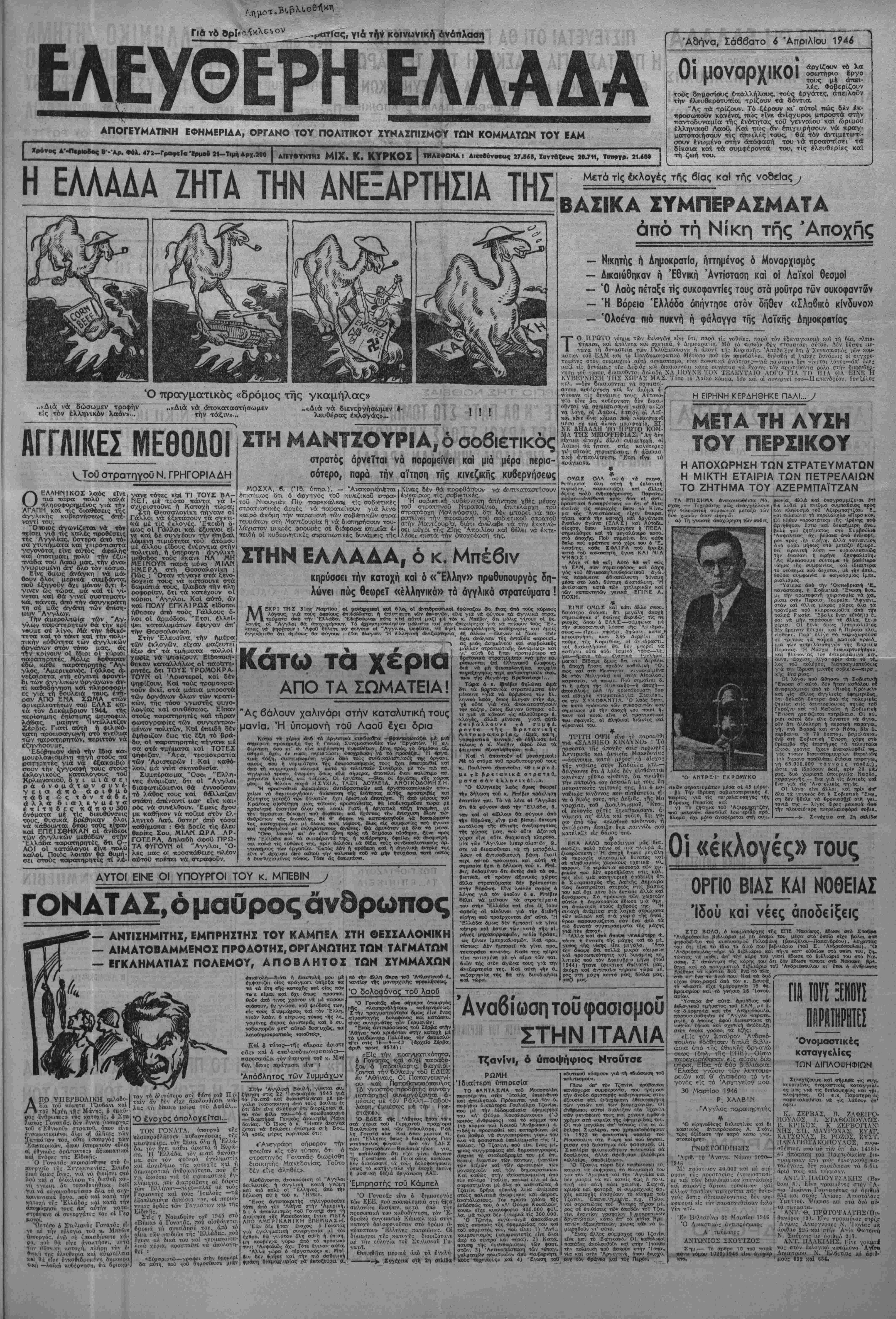 τους με <5γτϊ»τι· λές. ΦοΒερίζοον τοος δημοσίοις ίηταλλήλους, τούο ίργάτες, ατΐειλοθν την έλίυβεροτυττία, τριζουν τα δόντκχ. "Ας τα τρίζουν. Τό Σ,έρουν κι' αύτοί ιτώς δέν έκ- πρόσωπον* κοτνενα, πώς εΐν* άνΐσ-χυροι μπροστο: οτην τττχντοδυναμΐα της ένότητας τοΰ γινναίου καΐ ώριμου έλληνικοθ Λοοοϋ. Καί πώς άν έπινειρήσουν νά πραγ· ματοποιήσουν τίς άιτειλές τους, 6α τόν άντιμετωττΙ- σουν ένωμένο στην ά—όφασή τού νά προοκπτΐσϊΐ τα δίκαια κοτΐ τα ονμφέροντά τού, τίς έλευθερίες κοτΐ ή ζή Ι_! ζωή τού. ..«Διά νά δώσωμεν τροφήν είς τόν ελληνικόν λαόν»... Ό προτγματικός «δρόμος τής γκαμήλας» ..«Διά νά ατΐοκο—αστήσωμεν την τάξιν»... ..«Διά νά διενεργήσαμεν λευθέρας εκλογάς»— ΑΓΓΛΙΚΕΣ ΜΕΘΟΔΟΙ ΧΤΗΜΑΝΤΖΟΥΡΙΑ,όσοβ.ετ,κός στρατος αρνειται να παραμείνη και μια μερά περισ- σότερο, παρα την αϊτηση της κΐνεζικης κυβερνήσεως V. Τού στρατηγοϋ Ν. ΓΡΗΓΟΡΙΑΔΗ ._^ ·Λληροφορη)μ€νος γιά την ΑΓΑΓίΗ καΐ τις δκχθέσεις της αγνλικής κυβερνήσεως α~έ- νβντΐ τού. "Οποίος άγωνΐίετοει να τον ιτεισΈΐ γιά τίς κϊχλες προθέσεις της Αγγλίας, ίίστερα από τό· σα ντυπήιματα καΐ νειροκπιαστά γεγονότα. είνε ούτος άφελης ■καί Οττοτΐιμόϊει τιολΰ την έξυ- ττνάδα τού ΛαοΟ μας, την ανα- γνωρισμένη άη' δλο τδν κόσμο. Είνε όμως ανάγχη να: μά· ββυν δλοι μερικά συμ&άντα, ηου έξη νούν όν, ι μόνον δ,τι έ¬ γινεν ώς τώρα. μά χαΐ τί γί- νεται καί 6ά γινεΐ συστηιμσ-ι- %&, παντα, άπτό την όΜνγκ'θόττη τη σέ μ άς αγαιττι των £η'/<ττ· μων Άγγλων. Την ίχμεροληψία των "Αγ¬ γλίαν τταροττηρτιτών θά τί)ν χρί νβυμε σέ λίγο. Μά την ηθικό- τητα καΐ τό τακτ χαΐ την "πολι¬ τικήν εύθύτητα των αγγλικών 6ργάνων στόν τΑιτο μας, άς την κρίνουν οί ΐδιοι οί κύριόι παοατηρητές. Μόλιχ &φ6τχσα>ν