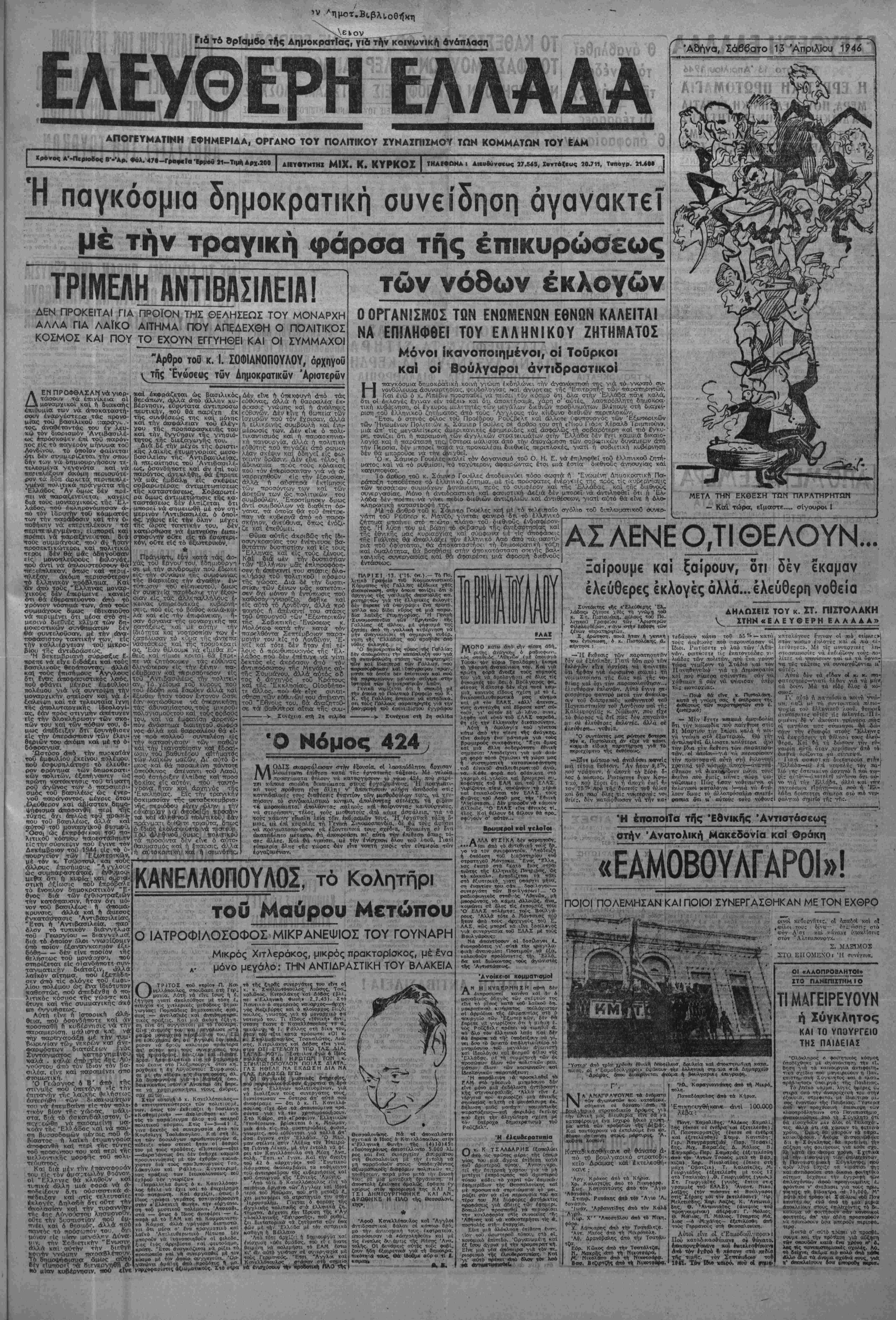 λύτως β#ϋο:ιος ότι τό δηιμ<κ|Ά·< Φΐσυα βά νινει το 1948 καί ότι ή νοονολογ>α ?αυττι θά <=ΐνε άυε- τάβετος, δπως αι ή 31η Μαρ- τΐου διά τάς εκλογάς*·. ΆντΙβε- τα, δμως, ε«ας άιτό τό «Τρ[ο» εΐπε δτι οί "Αγγλοι θά κρΐνοον τελικά πότε ΤΓτ^ττει νά λήξει Λ ιαιετσβοπικίι τοεριοδος καί άφηοε νά ύπονΌτιΟ-ΕΪ ότι οτύτό θά γίνει ττολύ σύντοαα. Η ΕΛΛΛΔΑ, ΧΤΥΠΗΤΗ ΠΑΡΑΦΟΝΙΑ ΣΤΗΝ ΑΝΑΓΕΝΝΟΜΕΝΗ ΝΟΤΙΟΑΝΑΤΟΛΙΚΗ ΕΥΡΩΠΗ ΑΝΤΙ6ΑΛΚΑΝΙΚ0 ΠΡΟΓΕΦΥΡΟΜΑ ΙΜΠΕΡΙΑΛΙΣΜΟΥ ΛΟΓΟΣ ΤΟΥ Ν. ΖΑΧΑΡίΑΔΗ Σί βυγχ*τρω— μίλων ιοθ Κομ.ι ι(βιιώ κβΐ -,ήν Εύρώ— νκττμκοθ Κόμιμ—*ς θεοΌαλονίκης 'Αιΐο»——μίιη αβύσικα » 6 Γενικός μοιηΊστικοΟ Ζαχαριαδης, σ Λ Γραμματέας Κόμματος τοθ όμματος συναγ ίκθΐτοντας τίς Κομ. Ι κρατΐΐκό χρης, σεις τού Λΐΐό τίς χω^ΐις τής Μοτιο<ζ7 νοτλή Εύώ ι€Γϊ η δ ς μιουργική Λ αιτό νοπολικής Εύρώττης ι€Γ;ρϊ την σνσδη ίργασΐα ΐϊού ουντελεϊ-αι τό καθίστώς τής Λαΐκής .. ' «λευ-ϊριά ϊΐρήνηι ΐκιοι άΈί.αρτη<τ1οβ> Μέσα σ' αότό τό