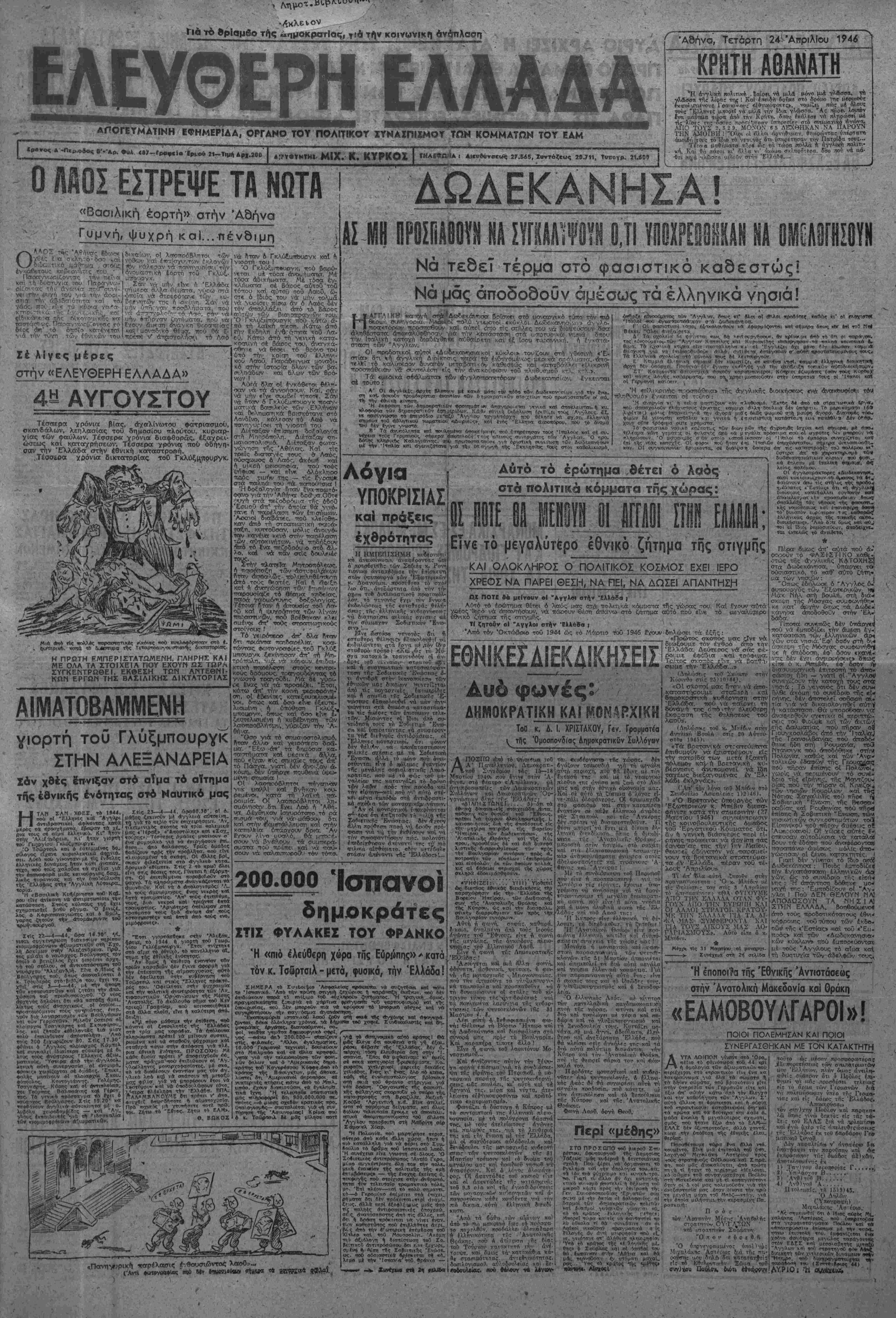 τόιοο κοτί <ϊύτσθ αοΰ Λθίθΰ, ώ- στ€ ό Τδιός τού νά αήν το^^^5 νά γορί,ςηει πίσω ότν Α Λαός οέν τόν ο?παι>^Αζ£ΐ <3—ό τό βάρος α·!)τέον τόϊγ Βισοτφαγιοη' τού. Ό Γχλι^ξιχιτουργκ ττού κίττω α ηή τή λαϊκίι τηβση Κάτω άιτό Σέ λίγες μέρες στήν «ΕΛΕΥΘΕΡΗ ΕΑΑΑΔΑ» 4» ΑΥΓΟΥΣΤΟΥ Τέσαερα γρόνκχ βΓας, άγαλίν&ντου φάτριασμοΰ, σκοτνδάλων, λεηλασίας τού δημοσίου -λούτου, κυρισρ- γίας των φαύλων. ^έ^σ£ρ« νρόνια 6ιαφθορ«ς, εξαίρει· ώσεως καΐ κ,ατοτ/ρήσεων. Τεσσερα γρονιθ{ ποϋ όδήνηι σαν την 'Ελλάδο: στήν έθνική καταστροίηή. ,Τέσσεοα νοόνια δικτατορίαν τοθ Γ «ι* *τ* τίς «ολλίς —#ββ—ηκίς ϊίκΑβς Ο ρ ^ιριιΛ, κατο «β 5_«ι«ιβ τη<: Τεΐαρτββογουΐ—βν^ς «<κτ—ορίβς. Η ΠΡΩΤΗ ΕΜΠΕΡΙΣΤΑΤΠΜΕΝΗ. ΓΛΗΡΗΣ ΚΑΙ ΜΕ ΟΛΑ ΤΑ ΣΤΟ ΙΧΕΙΑ ΠΟΥ ΕΧΟΥΝ ΩΣ Τ12ΡΑ ΣΥΓΚΕΝΤΡΩΘΕΙ, ΕΚΘΕΣΗ ΤΩΝ ΑΡΠΈΘΝ1- ΚΩΝ ΕΡΓΩΝ ΤΗΣ ΒΛΣΙΛΙΚΗΣ ΔΙΚΤΑΤΟΡΙΑΣ ^ξιχτογ κ τή λαϊκίι τη,βση. ,Κάτω άό Γήν Ικθηλη ένθ-·ά.τηιτα ιοθ Λο- οθ. Κάτ&) (5πτό τή γενική κστσ- κσαυγή σέ βάρος τού, άνχχνκά- Γβη<€ νά &ροει τό ©οονο τού ύτό την κοίατη τοθ έλληνι- κου Λοτοΰ. Παοάδι'ΐναα ιιοιαδι- κό στήν ΙστοοΙα δλων των 5α- Γ'ΐλη·ά'δύτν καί Βλων των θρό- νων Ι Αι>ά βλοτ οί ένκό^ίτοι βίλτί·