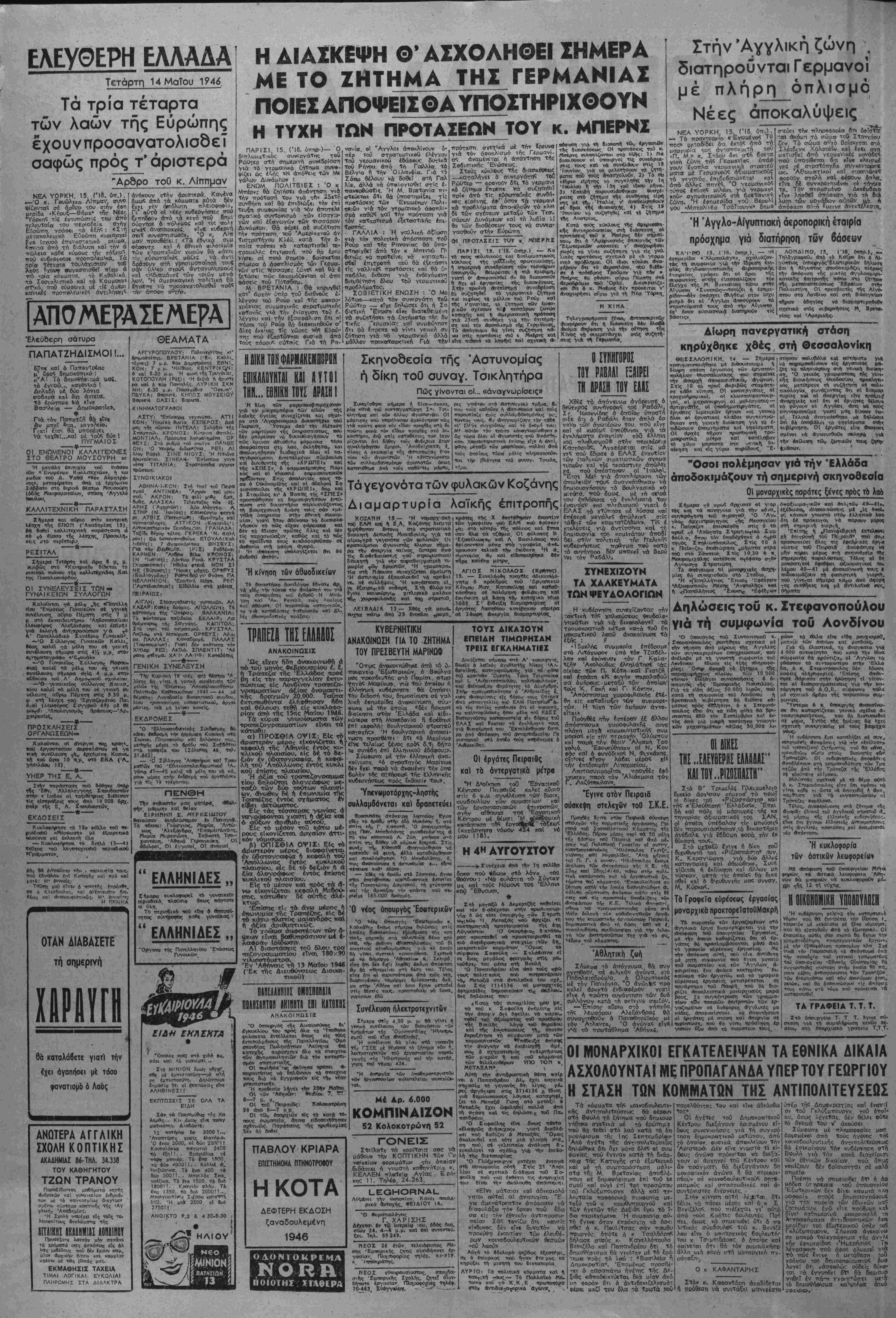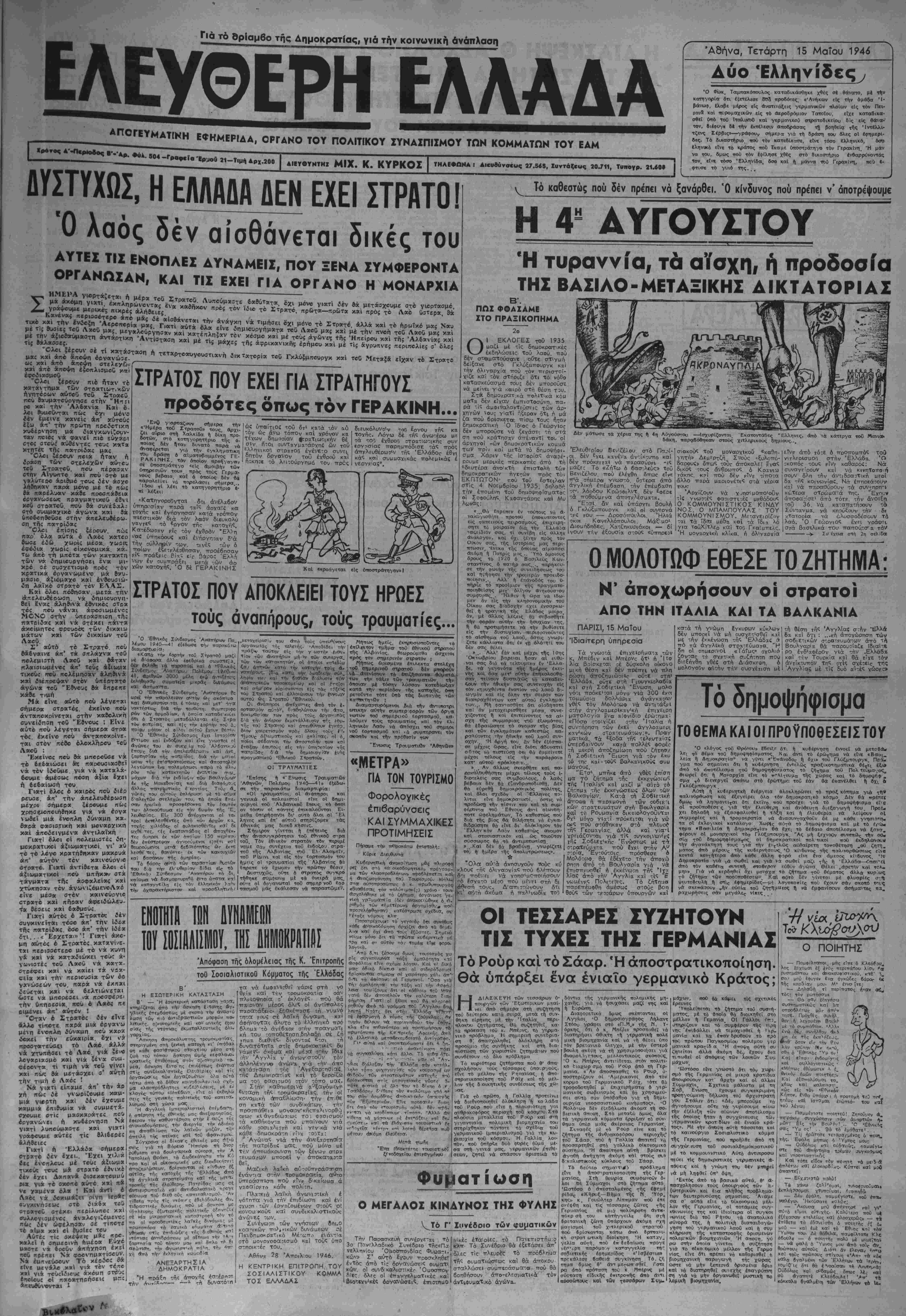 Γιατϊ βλβς 6 καιρβ< πού διέρ ρευοε. άπ' την άπίλίυθέρωδη μέχρι σήμερα ξέρουμε πώί χρηβιϊΛθπβιήβηκε νιά νά 4ογχ νωβεί μιά ένοπλη δύναμη κα- θαρά ςρασιστικη καΐ μοναοχικη καί άποδεινμέχ'α άντιλαΐκή Γιατϊ δλβι βί ίτβλεμιοτές δη- μτκρατικο'ι ά?ιωματικβί. νι' χύ τό τβ λόνβ κρχτήθηκαν μακρυά άη' αυτόν τβν κχινβύρνιβ οτρατβ. Γιατϊ άντίθετα βλβι βί άξιωματικβί πού Ηπήκαν οτά τάνματχ τής άοφκλείας κχί χτύιτησχν τβν άνωνι^όμενβΛχό «Ινε μέαα οτβν καινβύρνιβ οτρχτό κχί πήραν άφειδώλβυ- Τα βέσεΐί καΐ έαθμφύς. Γιχτϊ αύτοι ό ΣτΡατόΐ δέν ουνΜΐνεΐται τβββ *«' την Ιδία τήί ««τρίδας. 6σβ άη* την Ιύέχ δτι.. -«"Ερχεται» '! Γιατί άκο· μη αύτβς ο Στρατός κατανίνϊ- ται περιβοότερο μέ τό νά κυντι γα κχΐ νχ καταδιώκει τούΐ ά- γωνΐστές τβΰ Λαβΰ νά κατχ- στοέςρει καΐ νά κχϊβι τχ νδχ· «ρεϊχ χχΐ την περιβυοίχ των όβ γανώοΐών τού. παρά νά έκπχι δίύΐται χαί νά (ελτιώνεται ώοτε να μπορεβει νά πρβσφέρΐι την ύπτιοίβιχ. κου ο Λχός πι οιμΐνει άπ' αυτόν ! "Οτχν 6 ΣτΡ*τβί δέν είνε «λλβ τίποτε κχρά μιά όρναν» μένη ίνοηλη δύναμη κβύ καρά δβχίί την εύκαΐρία. ίχι ν» πρβοτατίύαβ.1 τό Λ*©, αλλά νά ττνηήσβι τβ Λαό. νιά ϊένβ λβγχριαίμό χαΐ νιά ξένχ αυμ- ίέρβντχ τί τιμη νά τού νίνίΐ χχΐ π ώς βά μετάοχβι σ' αύτη την τιμη β Λχος ί Νά νιατί εϊπχμί άπ' την άο χή κώς δέ ννωρίζουμε καμ¬ μιά ν-ρτη κχί δέν εχουμ: καμμιά έπιθυμία νά βυμμετκ- βχονμε ότι: μασκαράτεί πβθ οργανώνει ή κυδέρνηση Νά γιχτΐ λυκβϋμχβτε και νιατϊ νράφουμε χύτέΐ τίς Βλι&ερές άλήδίΐες Γιατϊ π 'Ελλκδα σήμερα βτρατβ δέν έχει.. "Εχει χιλιχ βες ενοπλβλκ μέ τβύ: άϊιωμα τικβύς τ«υς μά βτρχτό έίνικί δέν «γει Δαπανά διθίκατβμμύ ριχ νικ τβ οχοκβ αύτβ κχΐ πά ν< γχμενχ βλχ ! Κχΐ χντΐ 6 νά δβκιμάϊε» ριγη ·εβ*ί .,____ οτβ διά6χ τοΰ .. . βϋ οτέχΕι περίλυπβς κχί συλΑονιομένβς άνχλβγ "' «ώς δέν ώφίλησχν α'ε τό χΐμχ χχΐ «Ι &υο(ε: τβυ Αύτεο τκ βχέφεις μχς καλϊί ή οηιΐίοινή Λαέ&χ Ρ-χβΤί νά 6ρβΰν άηη^ηαη τβΰ πρέιτιι Νά φββνηματίαβυν. Νά έμπνίύοβυν Τό κέβδβί όά είνε »εν*λβ .κχΐ νιά τόν τίπβ **» νι* τβύ<ΐδΐ€τ>« άκβυη οτδύς