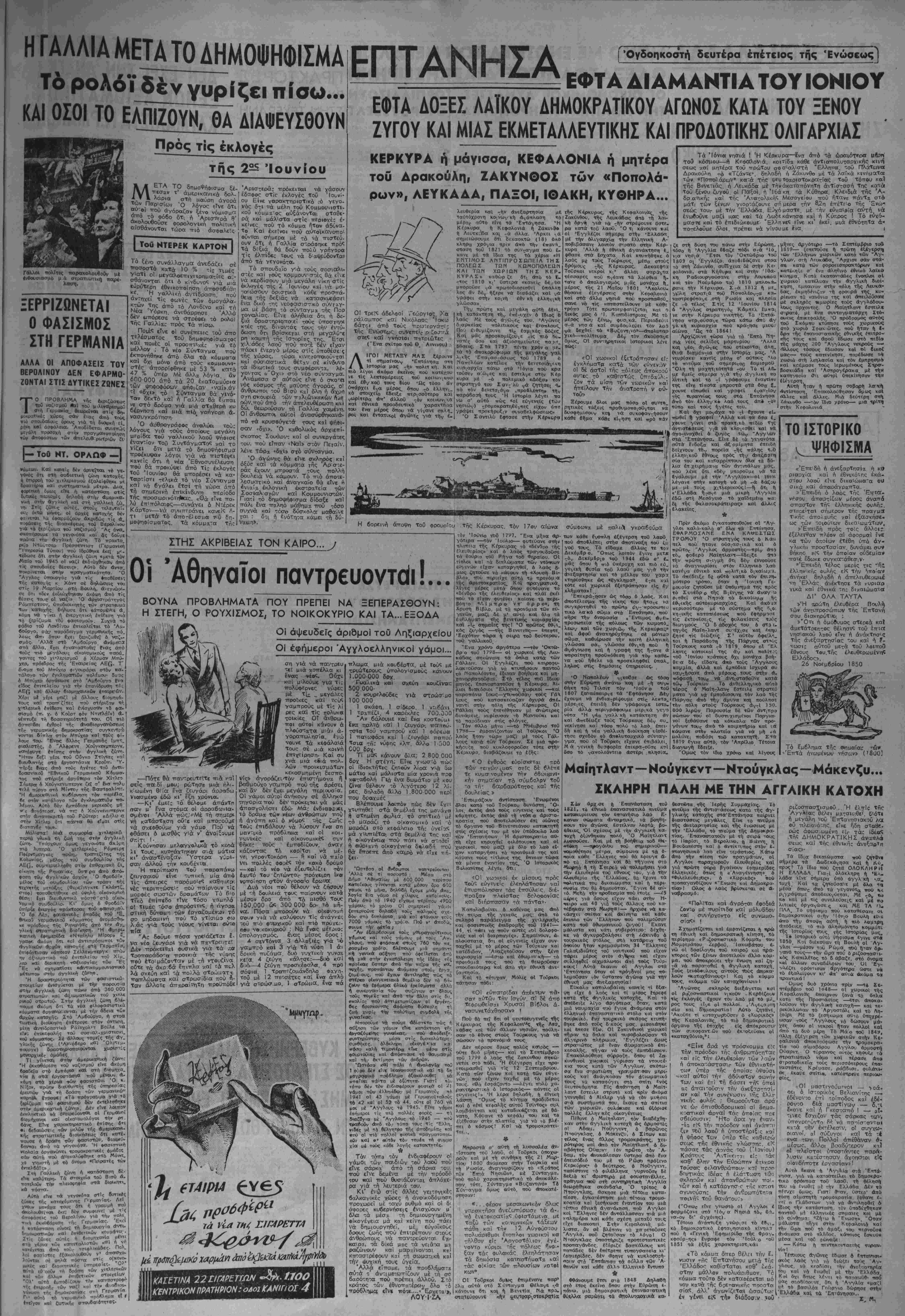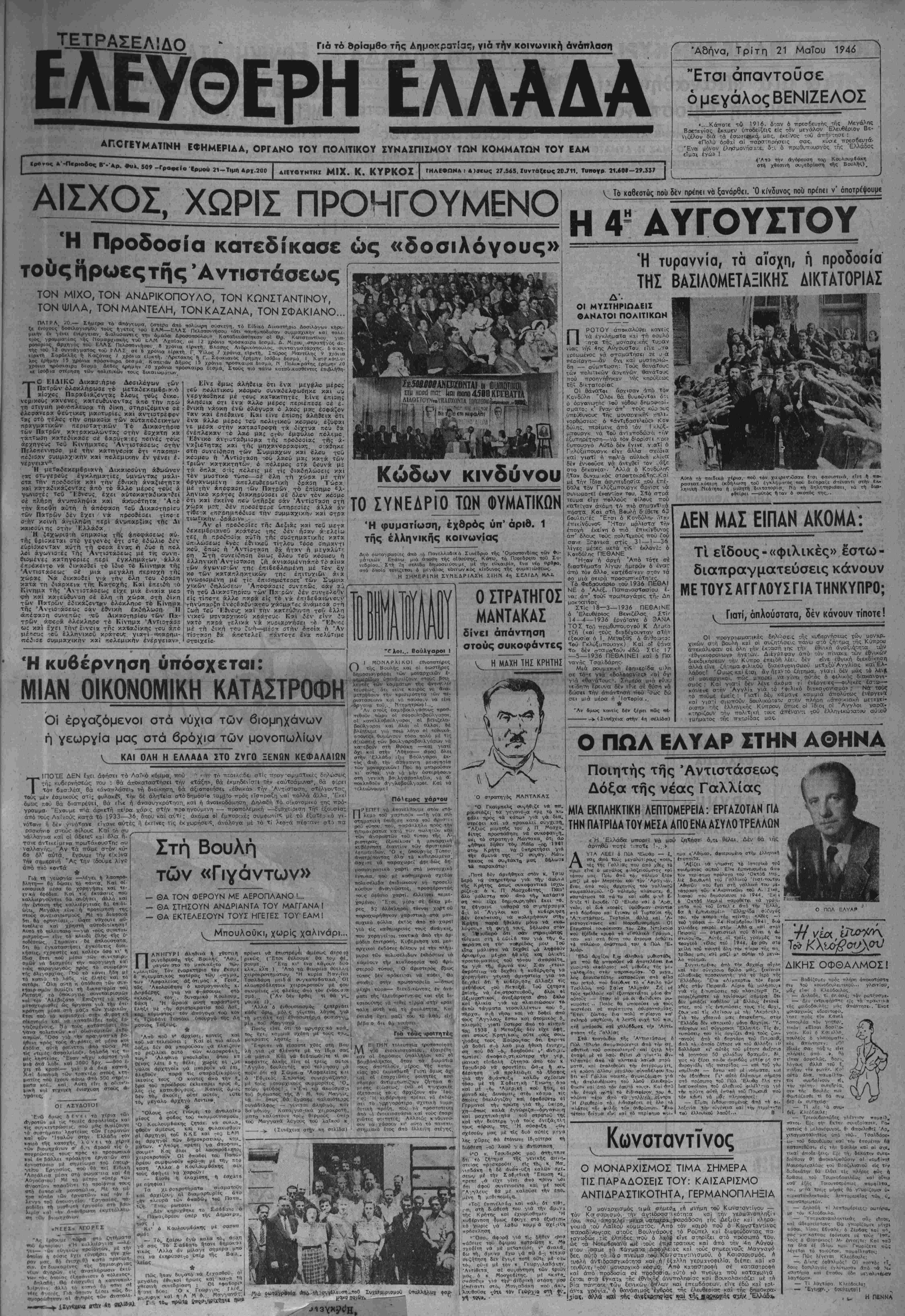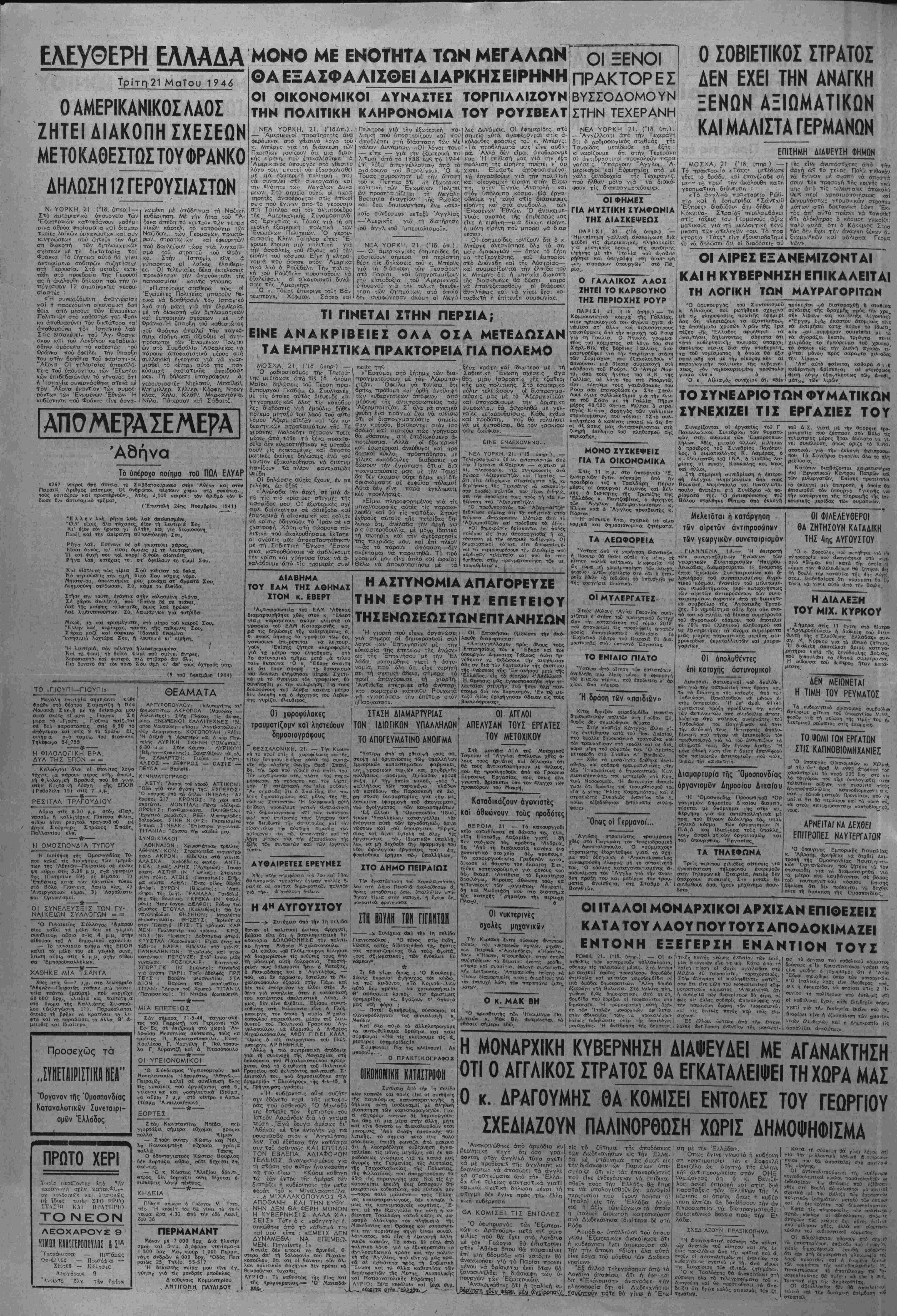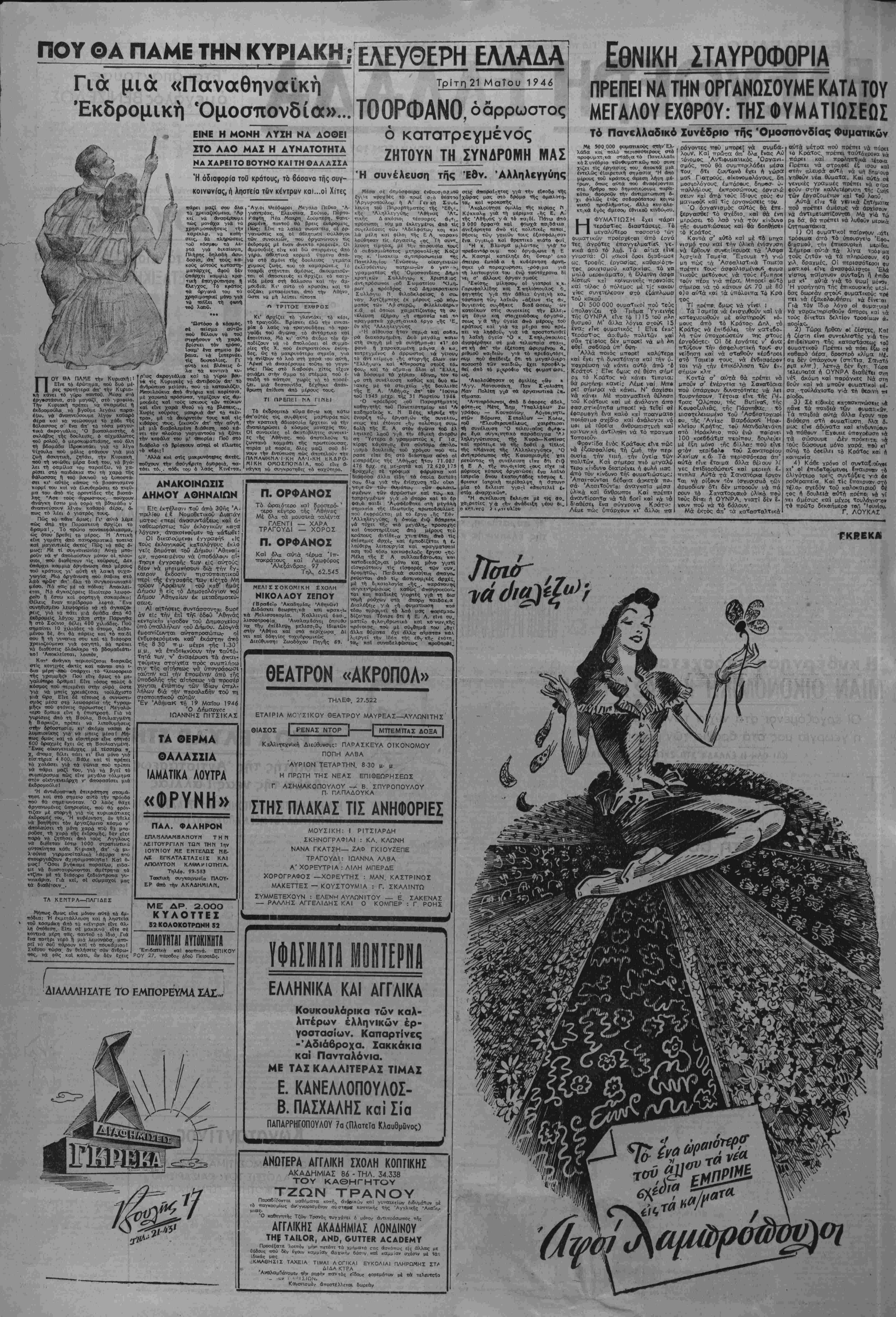 (ρο*<κ Α'-Π«ρ·ο6θς Β·-ΆΡ. Φυ« 50» Γ « - Ι ' " Ι --------------------------------~ΡΒφ"° 'ΡΜθυ 21-Τ.μΟ 4ρ,.200 Α,6ΥβΥΝτΗΙ ΜΙΧ. Κ. ΚΥΡΚΟΙ ΉΛΕΦΠΝΑ ^"**"*"*——■—ε^β^β—β^^^ΗΜ™^____________^____________ Ι ----------------------------------~ΓρΒφ"° «ΡΜΟύ 2ΐ-Τ.μ<, 4ρν..200 Α,ΕΥ8ΤΜΤΗΐ ΜΙΧ. Κ. ΚΥΡΚΟΣ | ΤΗΑΕΦΩΝΑ » Α)«»ς 27.565. ϊοντάζεως 7 ΑΙΣΧΟΣ, ΧΩΡΙΣ ΠΡΟΗΓΟΥΜΕΝΟ 27.565. Συντάξεως 20.711. Τυπογρ. 21.601-29.337 'Αδήνα, Τρίτη 21 Μαΐου 1946 "Ετσι άπαντοϋσε ό μεγάλος ΒΕΝΙΖΕΛΟΣ «...Κάττοτε ιω 1916, δταν 6 ττρεσδευτής τής Μεγάλης Βρεττανίας ίκχυΐ,ν ύποδείξεις είς τόν μεγάλον Έλευθέριον Βε¬ νιζέλον διά τά έσωτεβκά/ μας, έκεϊνος τ<>0 απήντησε :