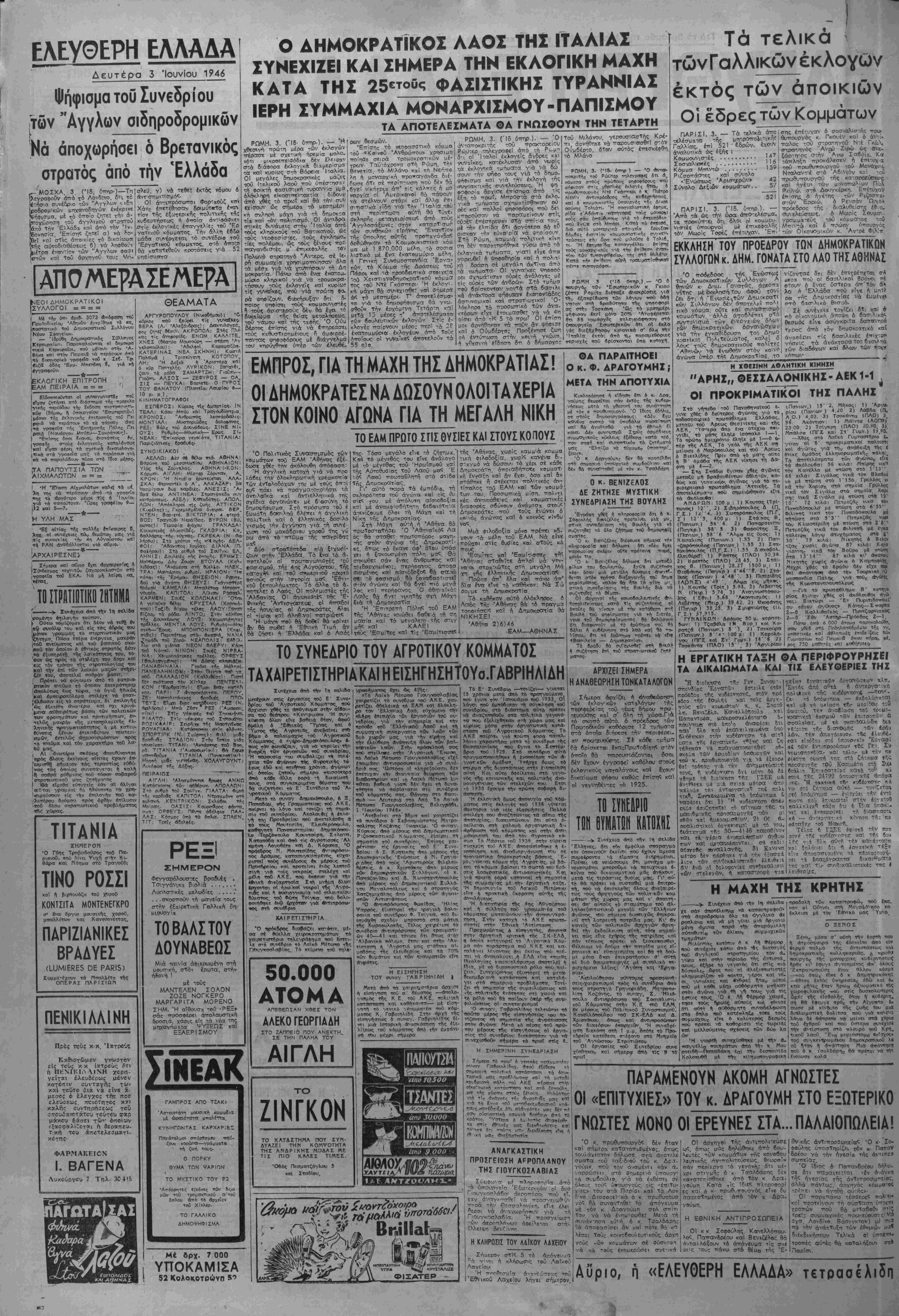 —<9εσε έκτός ΰττηρεσία^- έδώ καΐ ο. κτώ μήνες Εναν ήρωα άξιωματικό τής χωροφυλακής ποθ στίς δυσχολώτερίς ώρηι τής εΐσίολής. δτσγ ή χυίέρνη. ση βά έφευγε πρός τήν Αΐγυτίτο έ« σωσ» μέ κΐνβυνο τής ζωής Τού μια διπλωματική βαλίτσα ποθ γιά κανένα λόγο δέ βαπρετιε να μεΐνϊΐ στά χίρω τοΰ ίχθιροθ καΐ ποΰ Οστερα συνέχισΐ την αντίσταση στό ττλίυρό τοθ Κρη. τικοΰ λαοθ "Ενα μυριόστομο «οΓσχος» τοθ συγκεντρωμέ»ου δημοχρατικοθ λβ ού ήταν ή αττάντηση Μιά ατΓάν~στΐ ποϋ ό κ Γσαλδάρης θά πρέπει νά την. ένοιωσε κσλά ΠΑΡΑΜΕΝΟΥΗ ΑΚΟΜΗ ΑΓΝΩΣΤΕΣ ΟΙ «ΕΠΙΤΥΧΙΕΣ» ΤΟΥ κ. ΑΡΑΓΟΥΜΗ ΣΤΟ ΕΞΩΤΕΡΙΚΟ ΓΝΩΙΤΕΣ ΜΟΝΟ ΟΙ ΕΡΕΥΝΕΣ ΣΤΑ...ΠΔΛΑΙΟΠΟΛΕΙΑ! Ό κ. ττροοθυττουργίΛ δέν ί(ταν καί σήμΕρα κατατοπι,σμένο;. δττως τουλάνιστον δήλωσε. στά αΓ.οτίλΓ σματα τού ταξιδιοθ τού κ. Δρ ϊ- γούμν. ■—ύ τόν αναμένη «άν ά. ναρρώσει». στό Οημερινό ύττουργΐ κό σΐ-μ6ούλιο. γ'ά νά έν.θέσει σέ δλους τού, ύττουογούς τίς; «έττ^υ- χίες» τού στό Πσρίίι και τό Λον 5'νο Δισφορετ'κά ό κ ττρωθιοπουο, νό" θά συνανΤηθετ τό αττόγευμα ιαέ τόν κ Δοαγούμη στη σπίτι τοιι. γά νά ένημ'οωθεΐ Μϊτά τη «τι,νάνηση αύιη ό κ Τοαλδάρη: "5α άττοφασΓσει άν /αι πότε θά «ο λίσει Τούς κοινοβουλεοτ'κούς άοχι γούς -ών κομμάτων σέ βύσι^ιΐΐΊ νά νά τούς ένημερώσει σγε-ικΑ ΟΙ άρχηγοΐ Τής άντιπολιτεύσε — 5. δττω: μάς δηλώθηκε άπό 6ο^ι- λΐυτές των κομμάτων της κονοβου λιυτικης *ν-ττολιτε6σεως. θεωοο'ιν ίΐάν ττε.ρίεργο τό γεγονό.: δτι αέ· χρι στιγμή; ό κ· Τσαλδάρικ δέν κατατοΓΐσθηκε άττό Τόν κ. Λρα. γούμη Κατά τ^ "διες ττληροΦορί ες καί ό κ ττρωθυττουργός είνε δυ σσρεσΤημένος άττό τόν κ Δρα. Υθύμη. Η ΕΘΝΙΚΗ ΑΝΤΙΠΡΟΣΩΠΕΙΑ ΟΙ κ κ Σοφούλης ΚσΛ'ελλόττοι»- λοί. Παπανδρέου καί Βενιζίλβε θά άνταλλάξουν τό άττόγευιια τίς σ<* ΐ τού: πάνω στό θέμα τής 'Ε- ής άΓοοσοΛπείος. Ό κ· Σο. Φούλης ύττοσΤηρίζεί -[Αν κ- Παττον δρέου γά την ιτ,γεσία τής άντιττρϊ σωττεία;. Ό ΐδιος ό Παττανδρέου δήλοΛ. σβ δτι ιτσρσιτίΐται «έν ά/άνκη τής ήγεσίας της άνΤιπροσωττείας. άλλά ττόντω;. άοχηγός κόμματος ΓΡίπει νά ήγηθή αύ-ής»· ΟΙ παραττανω τέσαερε<: πολιτι* κοί ττοοτείνοΐΛ' τή σύστσση ύττοεττι τροττών ποΰ θά μεταβοδν στ;€ τρετς συμυαχικές πρωτεύουσες(νβ 5χα. Λονδΐνο. Βάσιγκτον) μέ τ·/3 ττό τήν άνάττΤιιξη των έθνικών μθΛ ίιεκδικήσεων Τελικά ο! ύττβεττι· τροττές ούτές θά καΤοληξουν στό Παο'σι. Αύριο, η «ΕΛΕΥΘΕΡΗ ΕΛΛΑΔΑ» τ€τοασέλιδη
