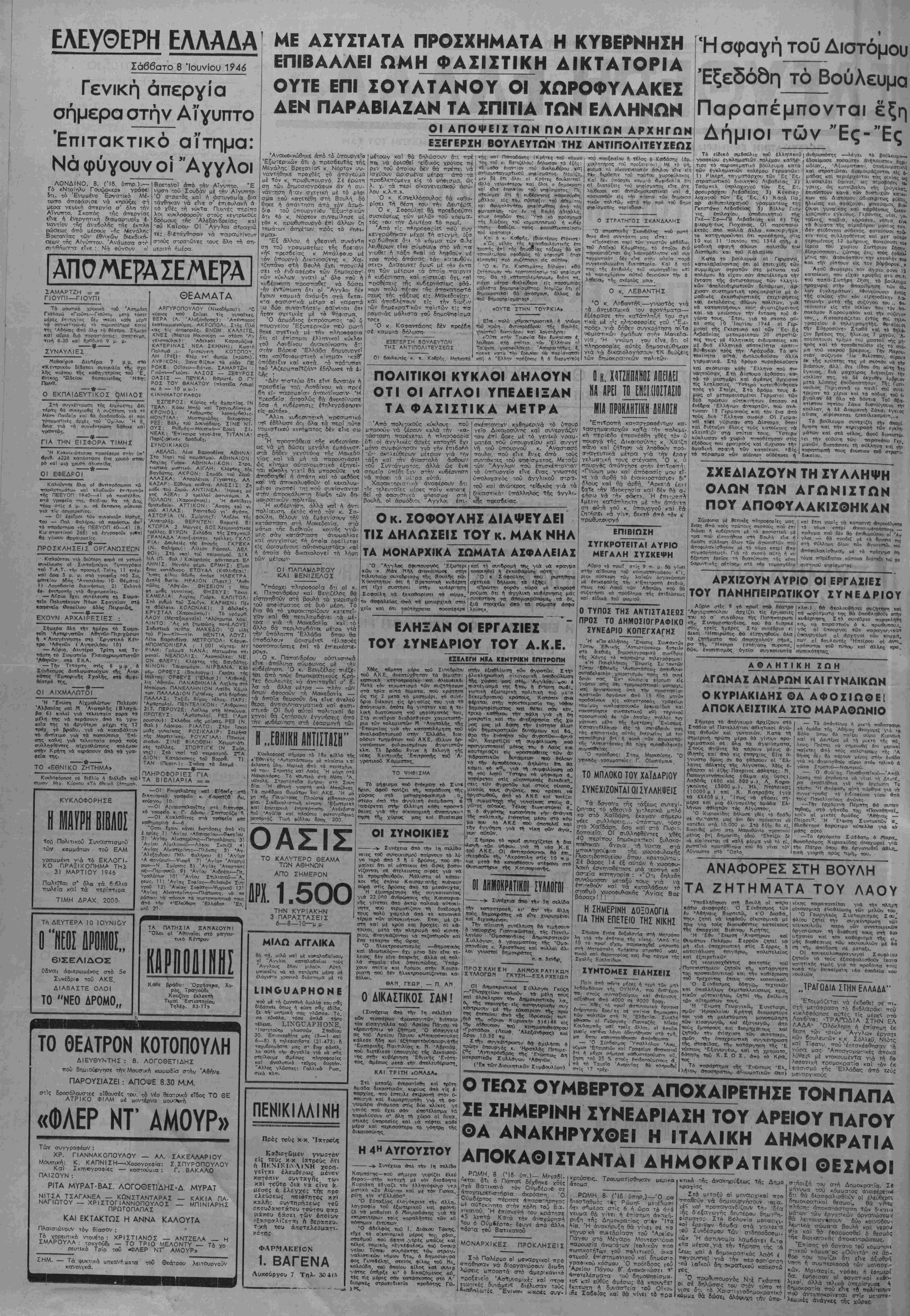 νώρα μας· τμωτκές άηο<α ΛυΨει*; μέ ντοκουμέντα για τή δο λοφονι·/ή τρομοκοατία καΐ τόν (κ φασισμό τής 'Ελλάδβς άττό μονσογικούζ Ο ΤΕΩΣ ΟΥΜΒΕΡΤΟΣ ΑΠΟΧΑΙΡΕΤΗΣΕ ΤΟΝ ΠΑΠΑ ΣΕ ΣΗΜΕΡΙΝΗ ΣΥΝΕΔΡΙΔΣΗ ΤΟΥ ΑΡΕΙΟΥ ΠΑΓΟΥ ΟΑ ΑΝΑΚΗΡΥΧΟΕΙ Η ΙΤΑΛΙΚΗ ΔΗΜΟΚΡΑΤΙΑ ΑΠΟΚΑΟΙΣΤΑΝΤΑΙ ΔΗΜΟΚΡΑΤΙΚΟΙ ΟΕΣΜΟΙ ΡΩΜΗ. 8 (Ίδ· ύττ.)— δΤι ό Πά—(χς δέχθηκε -ικανό τόν Ουμ6έο;β" σε η. Ό μρος τερασε <4τταρβτήρτι·τ;ος υ·: αθτοκίνητο στήν κόλη τού Εατ. τκανον. 'Η έττίσκεΨή τού κθάτη— *5 λετττά Κατά την αναχωρήση του ό Ούμΐέοτο^ έφυγε άττό άλλη τόρτα τού Βατικανοΰ ΜΟΝΑΡΧΙΚΕΣ ΠΡΟΚΛΗΣΕΙΣ Σ-ό Πσλέριιο οί μθναρχικοι πτο σττάθΓχταν νά δΐοργανώσουν διο5η λώσεις μττοοστά στό άμερ'κανικό ΆσΤυνομιν.έ: καΐ ττ ρα ά δ τιωτικές δυνάμϊις Κΐ£χβηλωτέ<:. ' Ενί διέλυσαν -ούς αΐκοΐς "ρούσεκ. όΐτομα. Τροτυαατίσθηκαν ιιευικα ΡΩΜΗ. 8· (Ίδ ύτττ>ρ.)—-Ό οα