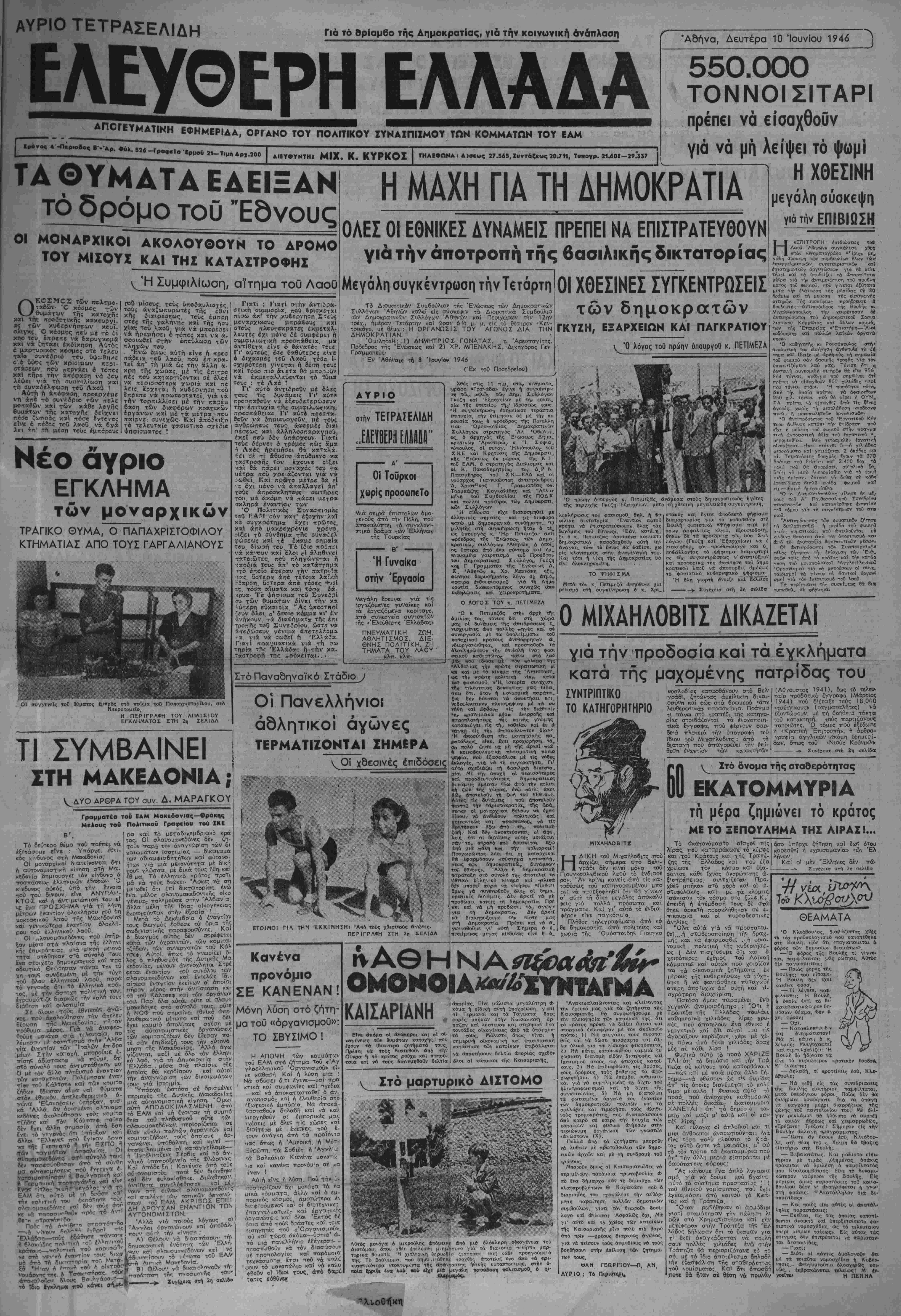 ό διχχσμός τβΰ Λαβΰ. τ«<3β I- δχυρέτερη γινεχχι η βέαπ το«« κχί τόοβ πιβ «ετχ θά μπ*Λ·Λν νά έκμετχλλεϋβντχι τό ?ΰιι* ς : χβ Λαό ! Γι' «ύτ6 άνχιίροΰν μέ δλες χυς τίς ίννάμεις Γι' αώτ* πρβσπαίοϋν νά έξί την έπΐτυχία τής άθ Γ Η ΜΑΧΗ ΠΑ ΤΗ ΑΗΜΟΚΡΑΤΙΑ ΟλΕΣ ΟΙ ΕΘΝΙΚΕΣ ΔΥΝΑΜΕΙΣ ΠΡΕΠΕΙ ΝΑ ΕΠΙΣΤΡΑΤΕΥΘΟΥΝ γιά τήν άποτροπή τής βασιλικής δικτατορίας ΟΙ Χ0ΕΣΙΝΕΣΣΫΤΚΕΝΤΡΟΣΕΙΣ 55Ο.ΟΟΟ ΤΟΝΝΟΙΣΙΤΑΡΙ πρέπει νά είσαχθοϋν γιά νά μή λείψει τό ψωμί Η ΧΘΕΣΙΝΗ μεγάλη σύσκεψη γιάτήνΕΠΙΒΙΩΣΗ Μεγάλιι συγκεντρώση τήνΤετάρτη Τό Διοικητικόν Συμβούλιον τής "Ενώσεως των Δημοκρατ^κών Συλλόγων "Αθηνών καλεϊ είς σύσκεψιν -ά Διοικητικά Συμβουλασ ■:ών Δημοκρατΐκών Συλλόγων Αθηνών καΐ Περιχώρων την 12ον τρέχ , ημέραν Τετάρτην καί ώρσν 6 ]/ζ μ. μ. είς τό Θέατρον «Κεν¬ τρικόν», υέ &έμι : Η ΟΡΓΑΝΩΣΙΣ ΤΟΥ ΑΓΩΝΟΣ ΔΙΑ ΤΗΝ ΔΗΜΟΚΡΑΤΙΑΝ. Όμ'λιναίΐ: 1) ΔΗΜΗΤΡΙΟΣ ΓΟΝΑΤΑΣ, τ. Άρεοτταγίτης. Πρόεδρος τής "Ενώσεως κα! 2) ΧΡ. ΜΠΕΝΑΚΗΣ, Δικηγόρος Γε.ν Γραμματεύς· Εν Αθήναις τη 8 ΊουνΙον '946 ("ΕΞκ τού ΠρβεδρεΙου) των δημοκρατών ΓΚΥΖΗ, ΕΞΑΡΧΕΙΩΝ ΚΑΙ ΠΑΓΚΡΑΤΙΟΥ ι Ό λόγος τοϋ πρώην ΰπουργοθ κ. ΠΕΤΙΜΕΖΑ Νέο άγριο ΕΓΚΛΗΜΑ των μοναρχικών ΤΡΑΠΚΟ ΘΥΜΑ, Ο ΠΑΠΑΧΡΙΣΤΟΦΙΛΟΥ ΚΤΗΜΑΤΙΑΙ ΑΠΟ ΤΟΥΣ ΓΑΡΓΑΛΙΑΝΟΥΣ ; —δ ιττί>μα τοθ ΠαΐτοχριστοψΙλου, στ6