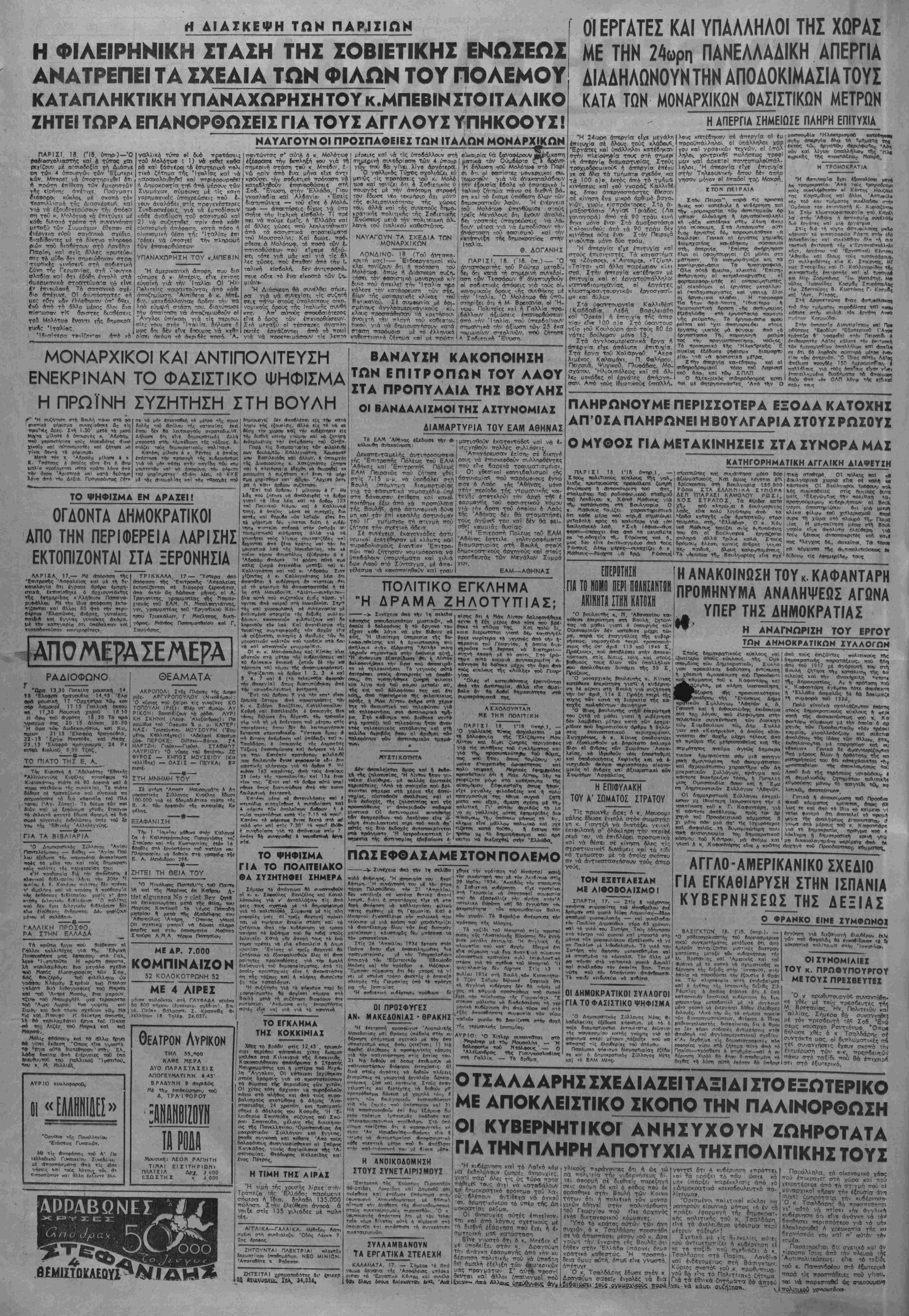 βίνβίΐ τή Χύ— βΛ>Γή <φ*ίΐον βά Μ *ΥΥύηση γιά διεξβγωγή γών 0 αΧΑ β ηη γών τη50 ή ρων ίκΧ4 βα έγχβΛΙίρι— τ« ** ή Ί φς γίρι τ« μοχρατ1x4 —λίΤϊυμα στήν ΊσνοΛΊα». χη< ΐ ρεΑν μ Ιματισμίς ίητββίνση »βί ή ίβΧ μ μμς η ■<ΓΤροφβρυι»ΚΡυτική —ρίβτιΧψη. Στ© βιτβ τβνΐζίτβι Χτ, Α τϊββσφνιγιΧθ "Αν Μο·κϊδον(ας—θοακηΓ; ε! Α ί * κββι μέτρο μί βίοτΚΤ Η ΛΝΟΙΚΟΛΟΜΗΣΗ ΣΤΟΥΣ ΣΥΝΕΤΑΙΡΙΣΜΟΥΣ Έιτιτροπή Τής Ενώσεως ΠυρνντΓθτβόν ΐ'θ'ώτιδας Λοκοίδας καί Δουβκθΰ έιτι σκίφβηκε χαϊ ίτέεωσε ΰιτόμνημα στ4»· ύφυττουογο Ανοικοδομήσεως μέ βααικί βΤτημα την άνοβεοτι τής ανρΐκοδομ*σεω£ στούς σννετατρΐσμούς ττνροιταθάϊν. "0 κ ύά έ ς ύφι—υρνος 4τι μέ τ4ν τιλίυ φς η μ 4 τβίβ νάυο δΐνιτοπ ούτή ή ιύχίοιια στ4 ύττουργείο κα! οννί—ηβι τή συγκροτήση συνίταιρισμών. ΣΥΛΛΑΜΒΑΝΟΥΝ ΤΑ ΕΡΓΑΤΙΚΑ ΣΤΕΛΕΧΗ ΚΑΑΑΜΑΤΑ, 17. — Σήμερα ι4 σπί γευμα ίργβ-.'α τής 'Αβφάλειας μπλοιιό ό 'Εργατΐκό Κί-Λρο καί συνέλβ Ι *< Άί ρισαν τό β9ν ρο —Ινκονταν Άνί ΟΙΖΥΝΟΜΙΛΙΕΖ ΤΟΥ κ. ΠΡΩΦΥΠΟΥΡΓΟΥ ΜΕΤ0ΥΙΠΡ6ΣΒΕΥΤΕΧ Ό ν «ρωθυττουργός κε χθέΓ μέ τού; τΓρεσ&υτ,ές Μ. Βρίτανίοις. Ην. Πολιτπών αλλίας. Σήμερα θπ συνανΤηθί{ μέ τόν ττρεσβεακΓή τής 2.ο6 Έ'ΐώ σεως νβύαρχο Ροντιόνωφ *Όττω«. δήλωσε χθές ό κ Τσαλδάρη,. σ# ό μβς. ο! δι-λωμ—ικές ββ ή—ις £γβυν σχοττό την επμέροχτη τών κ·κ. ττρεσβειηώ» ττβνω στό τοξί& ττού θά έττιχπρτΐ <τ'« στο έξω-ερικό. ΟΤΣΑΛΔΑΡΗΣΣΧΕΔΙΔΖΕΙΤΑΞΙΔΙΣΤΟΕΞΩΤΕΡΙΚΟ ΜΕ ΑΠΟΚΛΕΙΣΤΙΚΟ ΣΚΟΠΟ ΤΗΝ ΠΑΛΙΝΟΡΟΩΣΗ ΟΙ ΚΥΒΕΡΝΗΤΙΚΟΙ ΑΝΗΣΥΧΟΥΝ ΖΩΗΡΟΤΑΤΑ ΠΑ ΤΗΝ ΠΛΗΡΗ ΑΠΟΤΥΧΙΑ ΤΗΣΠΟΛΙΤΙΚΗΣ ΤΟΥΙ Ή κιοβέρνηση καΐ τό Λβΐκό κδμ μα έκβηλώνβυν ζωηρίΌ άνηοοχίίς. '*']!} παο' όλε; τ'ς ώς τώρα τ βέ τβυς ζη η ; τ'ς ώς τώρα ! ά ρ κσχα6άλοι/ν νλΐκούς παροτγοντες δτι ή ώς τώ ρα ττολν,τεία τής κΐ-βεονήσεως δί. νει άφορμή σέ διεθνεϊς παρεξηγή σίις άκόμη δέ καΐ ό φόδος πού έκ Φράσθηκε στπν Βουλή των Κοινο Τητων δΐι ή ιτολιτική των μονσρ «■ δημοκρατικό φρόνημα τού λα- ου. βλέιτουν άντίθίτα νά όγκβΰ "αι, όρμητΐκότερο τό ύττέρ τής Μ μοκρατίβς ρϊΰμβ. ΟΙ άνπσυχίες αύτές έτητείνον- Ται καΐ άττό λόγοιο; σχετικούς μέ τή δΐίδνη έίάοτηση πού έχει ή έ- Εΐνι γνωστό δτι ό κ. Μ*έ6ιν ε! χε 6ττοδείξει οτόν κ. Δοαγούιαη τή) άνάγκη έ-ψαρμογής άττό την κυ, ,υ«τ.,κο κυ.οΐσ-τ.ωι». - προ<—·α- Βεονηση ττολιτικηί πού νά ύττββ-.η θτια όμω; αυτή. δττως εΓνι γνωστό δεί όυαλή έξέλιξη των έβω-ερικών —'------ μας -ραγμάτων· Σ' αύτΑ -ροσΊ-ί θεντβι καΐ ότλλοι ύπαΐννγμοί έχιν*-. Αβό...... χικών όδηγε? στήν τταλΐνόρθωση "ού Γεωογίου ττού ?Τνε άοχηγ^ς ενός δικτατορικοϋ κόμυβτο;. 'Υττό τό κράτος αυτών των άνη συχιών ό κ Τσαλδά,ρηΐΓ ττηοσηάθη σε νά άττοσιτάσει μέσον τού κ. Δρβ γούμη την ε'γκριση τής Βουλής.ότ1 δήθεν στήν Έλλάδα όττάοχί, δπμθ 'Η Ό κ. Τσβλδάρης Ιδωσε στόν κ νά δια δτι Λ κυβέρνηση ρ θά Γθάξει τό ττάν ωστε νά μην ύττόρξει πηρέκκλισ·; άττό τό «Δημοκρατικό κοινοβουλευτκό ττο- λί τμ. Όρισμένοι πολντικοΐ κύκλοι ιιπ ρατηροθν εΐρωνικά υήττως ·ή έν άξ ίή ρηρ ρά πράξει ίφαρμογή κής ττολιτικης τού κ, ί ό άλύθ ής της το , Τσαλ είνε τό άνελεύθερο ψηφισμα έ ά£^! ς ή έν τή Οημοκηκτ- Τσαλδάρη ί τ τ Σχετικό ύ ά αύ·ίς Σχετικό με τΐς 5υ»"ίθ*ίΓς αύ·ίς ηού άντιμϊτωτίίίει ή κυβίρντ,ση εί νέ τ* ταξιδι ττού σχεΐάζΐ ό νέ τ* Τλί ό κ Λονδίνβ ττού χ β τό ΠαρίΓτι, κβι ένδεχομένως στή Κυοιο; σκο-ός το0 κ ττρωθι.τΓ,-^ο. γοΰ Θά ΐΤνι τό ΠολιχΜβ«4 ζητημα Γιά τα ίθνικά ζητήματι 6ά άύ » νά κάα* σζή τ νά κάα*. ν. Παράλληλα. τό οίκονομικό χβος "ου έτπκρατετ —ή χώρα <αϊ τι ού Χίΐροχέοεψε άπό τή στιγμή ποϋ οί ιιοαρΐ έξ ψ ιιοναρχικοΐ ή τγμή την έξουσία ή β ηρο τη έξουσία άνη συχεΐ ζωηο