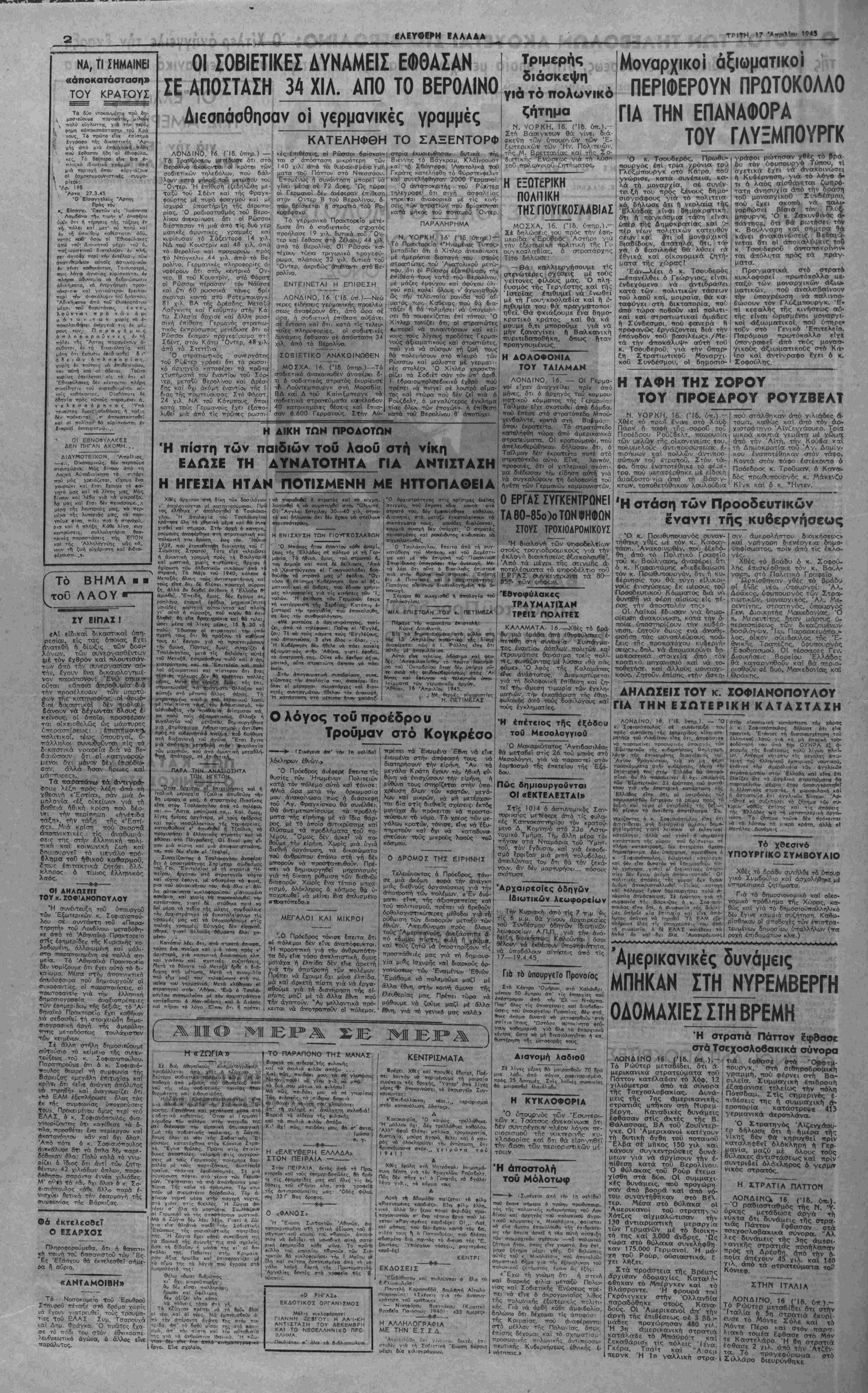 νομικό π-ρόβλημα τής Χώρας, κ<χ- θώς καΐ γιά τό δημοσιούπαλληλικό δέν έΎινε καμμιά συζητήση. Καβω- ρίσθηκον οί άττοδοχές των έττιστρα- τΐυμένων δημοσίων ύπαλλήλων (ττα ροχή έπιδομάτων κλττ.) Άμερικανικές δυνάμεις ΜΠΗΚΑΝ ΣΤΗ ΝΥΡΕΜΒΕΡΓΗ ΟΑΟΜΑΧΙΕΣ ΣΤΗ ΒΡΕΜΗ Ή στρατιά Πάττον έφθασε στά Τσεχοσλοβακικά σύνορα ΛΟΝΔΙΝΟ 16. ί'Ιδ. δή..).- Τό Ρώθτερ μεταδίδει, δτι Λ- μερικανικα στρατεύματα τοθ Πάττον κατέλαβον τό Χ6φ, 12 χΛιόμετρα άπό τα σύνοπα "|ς Τσεχοσλοβακίας. Δι/νά· μεις της 7ης Λμερικανικής στρατιας ατΐηκαν στη Νυρεμ βέργη. Καναδικές δυνάμεις έφθασαν στίς άκτές τής Β. θαλάσσας, ΒΑ τοΰ Ζουΐντερ- γκε. ΟΙ Άμερικανοί κατέχουν τή δυτική δγθη τοθ ττοταϋοϋ "Ελβα σέ μήκος 150 χιλ. καί κάνουν συγκεντρώσι.ις δυνά- μεων γιά νά άρχίσουν την έ- τιίθεση κατά τρθ Βερολίνου. "Ο θύλαοκας τοθ Ρούρ έτεμα- χίσβη στά δυο. ΟΙ συμμαχι- κίς δυνάμεις, ιτοϋ ττρογώρη- σαν άττό βοορα καί άηό νό- του συναντήθηκαν στό Βίλ· τερ. Μέσα στό ©ύλακα οί 'Ααερικανοι τοθ στρατη ιό Χότζες αΐχμαλώτισαν την 130 άντιαρματική μεραρχία των Γερμανβν. μέ τό διοική¬ ται της καΐ 3.000 άνδρες. Ώς τώρα στό θύλακα συνελήφθη- καν 175.000 Γερμανοί. Ή μά- χη τοΰ Ρούρ, οώσιαστικά, Ε χει λήξει. Στά προάστεια τής Βρέαης ήρχισαν όδομαχίες. Κατα>.τΐ-