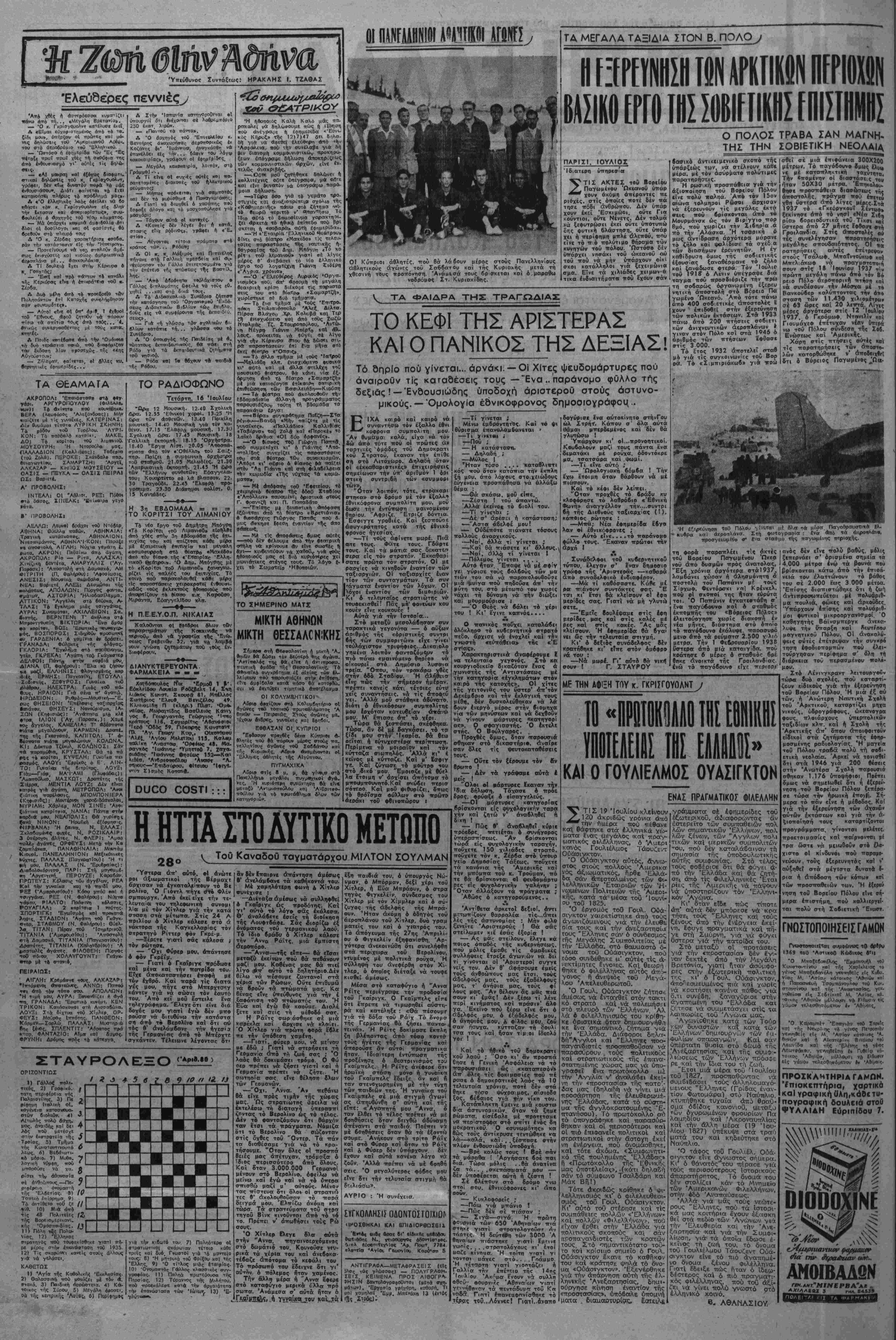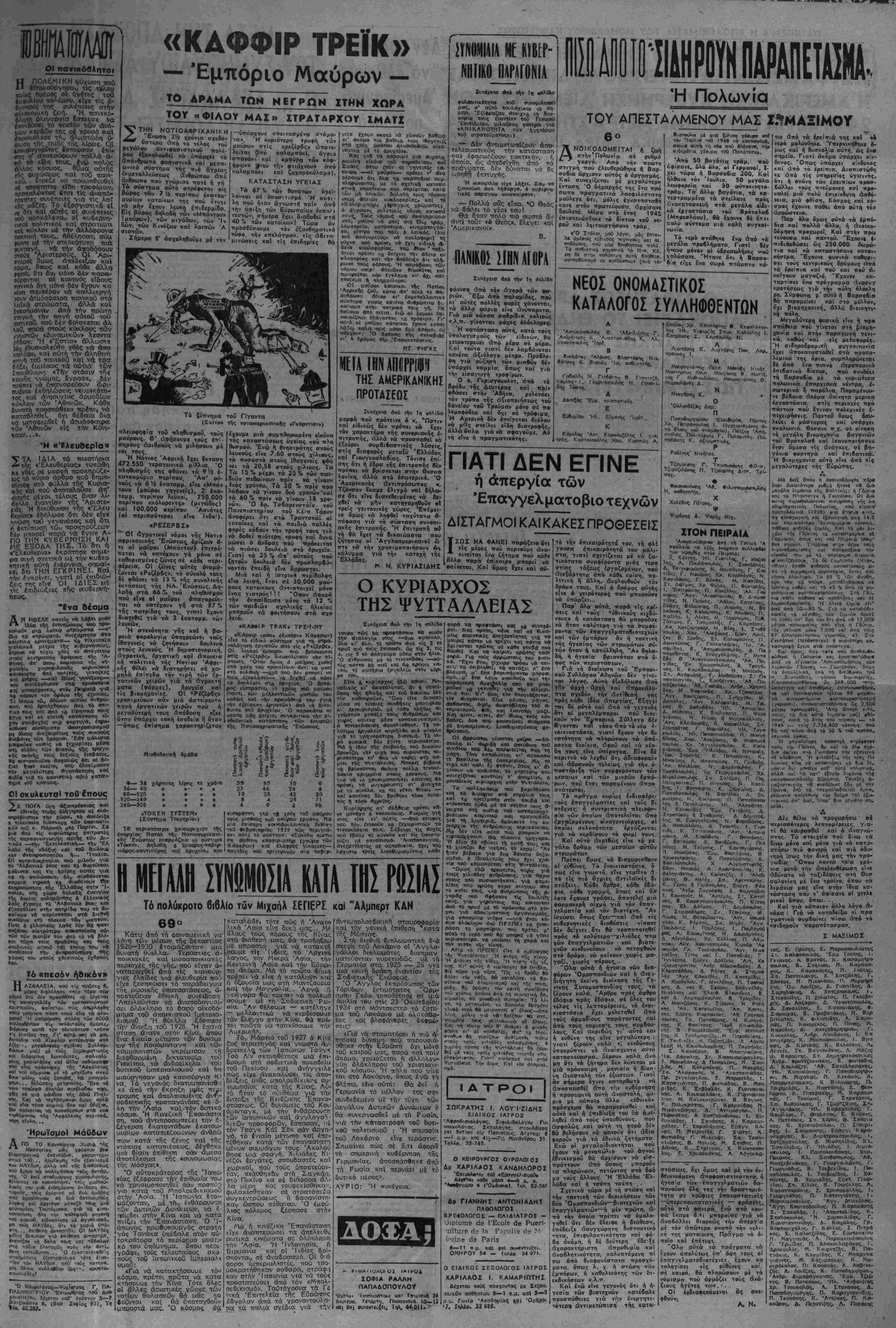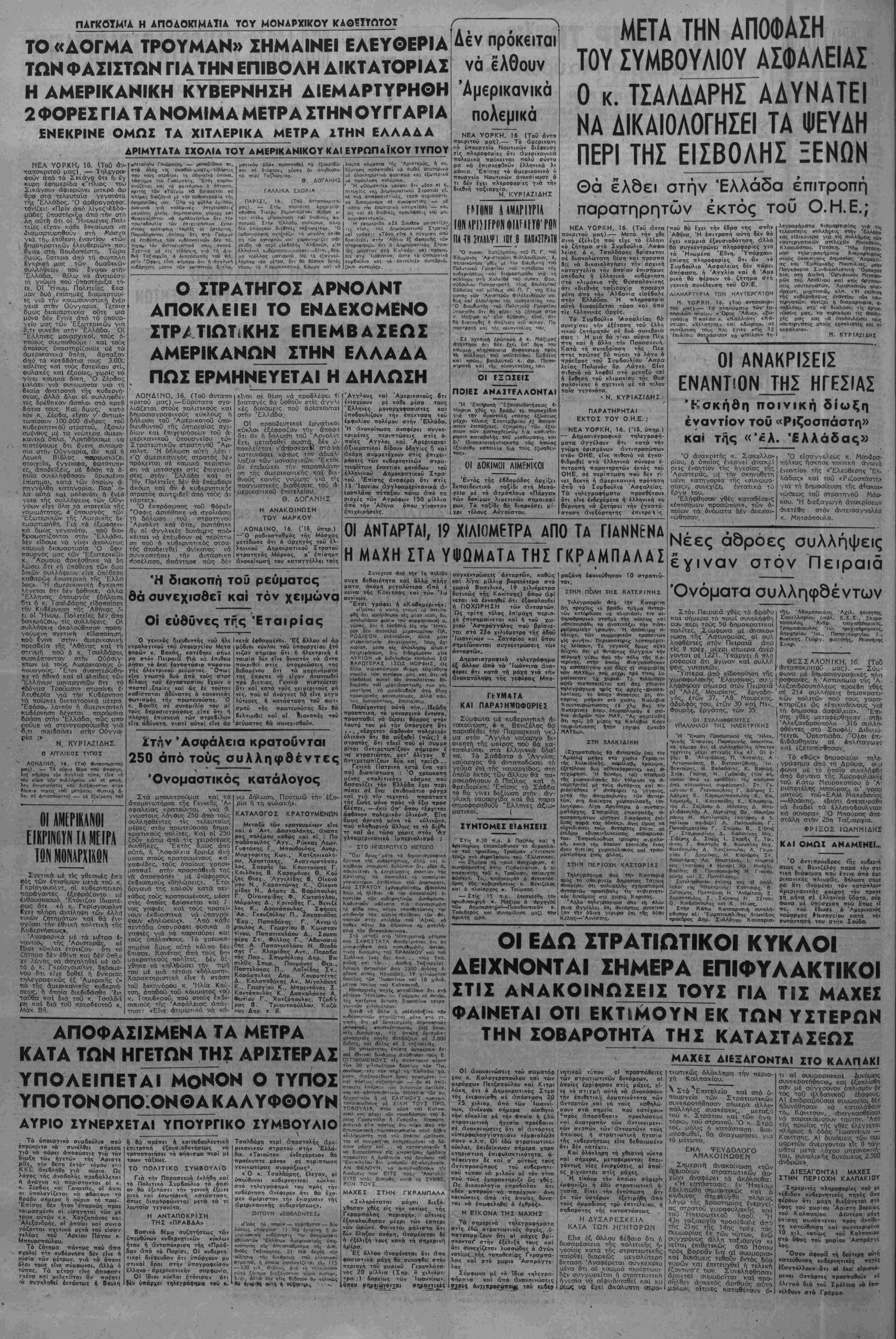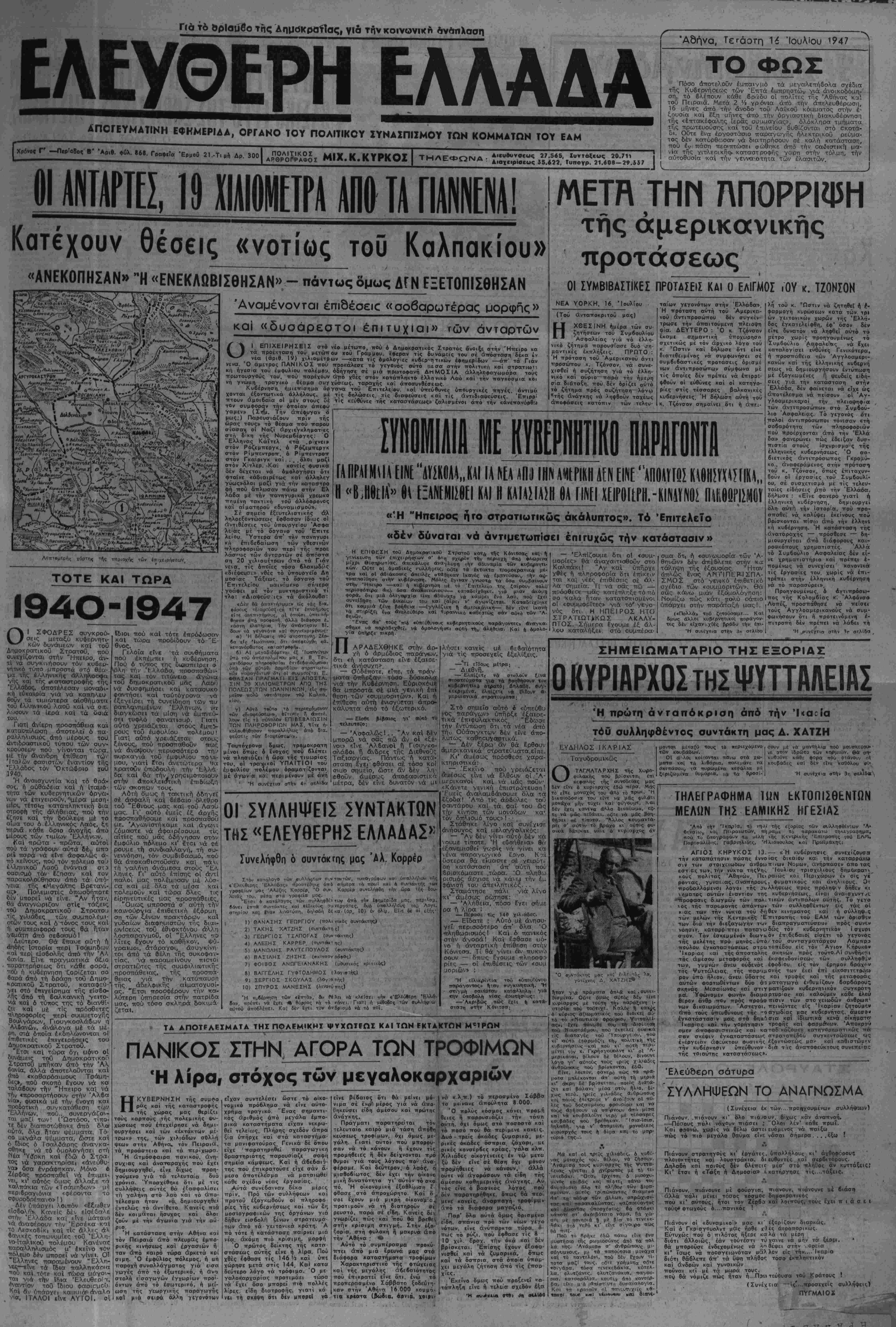 Χρ6ν«* Γ -Περ.«8ο< Β' Αριθ. φύλ. 868. Γραφεΐα -ΕρμοΟ 21.-Τι μ» Δρ. 300 Κ ΚΥΡΙΐΏΥ ΤΜΛΡΛηΐΜΛ Αιευβυνσεως 27.505, Ιυ ν τάξεως 20.711 .Κ.ΚΤΡΚΟ- ΤΗΛΕΦΩΝΑ : ^αχε.ριοεος 55.022. ΤυηογρΓ^ΐΓόΟβ-Ζ».»7 Άβήνα, ΤεΓάοτη Μ Ιουλίου 1947 ΤΟ ΦΩΣ Πόσο άπστελοΰν έμπαινμό τα μεγαλεττήδολα σγέοια τής Κυβερνήσεως των Έπτά έμπρηστών Υ»ά άνοικοδόμη- ση, τό δλέπουν κάθε 6ράδυ οί τΐολΐτες της Αθήνας καΐ τού Πειραια. Μετά 2 V» γρόνια άτίό την απελευθέρωσιν 16 ιαηνες άπό την άνοδο τού Λαΐκοΰ κσμματος στήν έ- ξουοια καί_ ££,η μηνες_ άπο την όργιαστική διακυδέρνηση της «έπτοοκέ<ζαλΓ,ς ϊεράς συυ,μαγίαςϊ·, όλόκληρα τμηιματα τής πρωτευούσης καί τού ίπινείου βυθίζονται στό σκοτά- οι. Οϋτε ίνα έργοστάσιο παραγωγης ήλεκτρικοΰ ρεύμα- τος δέν κατύ.ρθοσαν νά διατηρήσουν σέ καλή κατάστσση, ττού έν πάση πεοιτττύσει οώθηικε άπό την σαίιστική μα- νια της γιτλεοικη<> καταστροφής γαρη στήν τόλμη, την