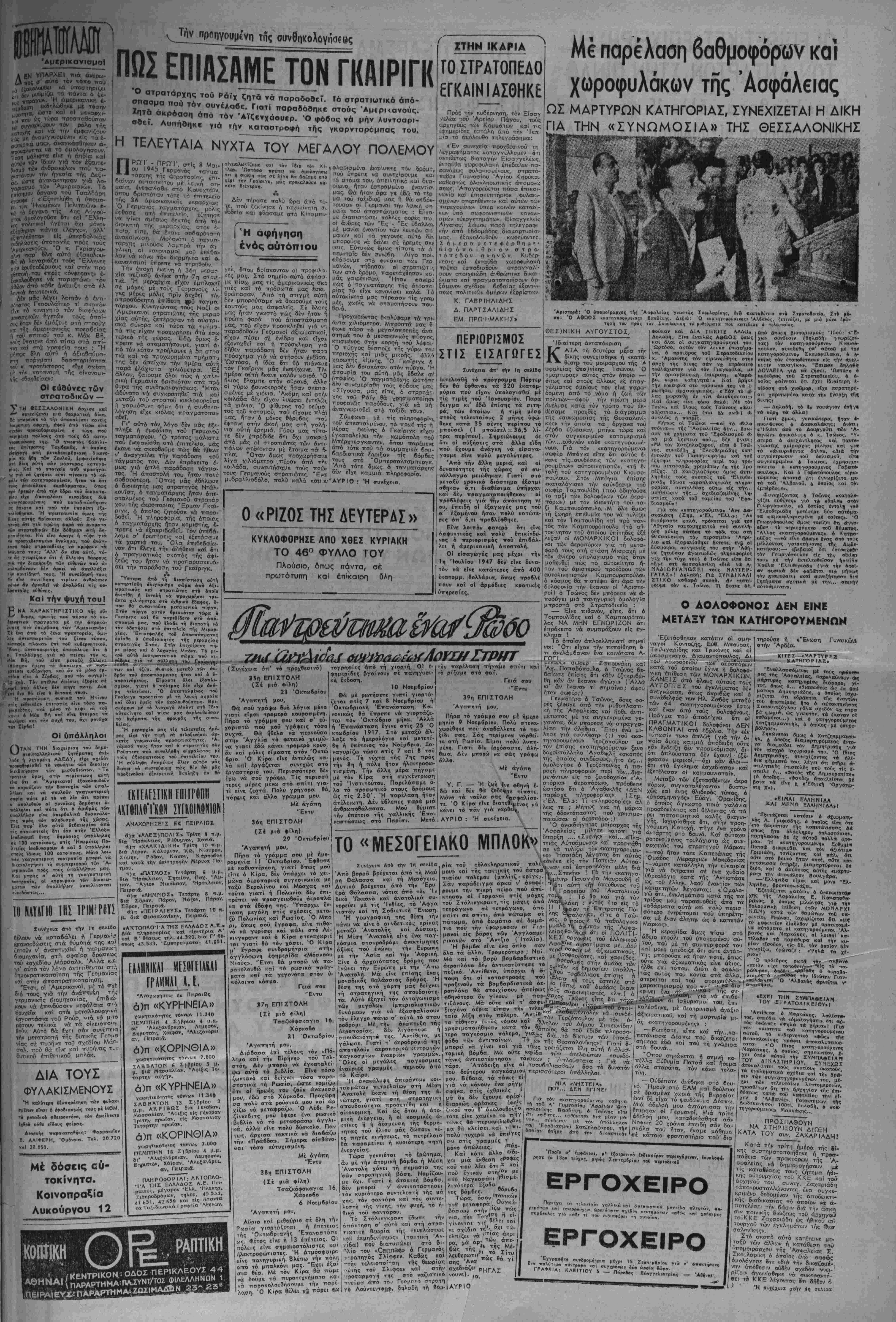 κ αι νά συγκεντρωνεΐ τι'<ί"τ[ληρο φορίες και τά σγ,όλια τών κυ- όερνητικών εφημερίδων, καθως καί τών πολιτικών τφθσώττων, ττοϋ άνήκουν στ'ις κυδερνητικές γραμμές. Καί όμολογοΰμε δτι τιοτέ δέν ε'ίγαμε καλύτερη καΐ ■ίτιο Γύσυνκοητη ουνεργασια' Άλλά άνεξάρτητα καί άττό αύτό, ττως θά μττορέσουν οί κου φοι, ττού ίί,ήγγειλαν αύτά- τά μέτρα, νά κόψουν τ}) φωνή τοϋ ΡΜοιοφωνικοΰ Σταθμοΰ τού στρατηγοΰ Μάρκου, κι' άν ύπο- θέοουμε ττώς θά κατόρθωνίχν νά πνίξουν τή φωνή τοΰ δημο- κραιικοΰ Τύπου ; ΠίΤις Θά έμ- ττοδίσουν τίς έκατοντάοες γιλι- άδες τών άκροατών νά. άκοόν οτό ραδιόφωνο την μετάόοοη τών άνακοινωθάντων τοΰ Δημο- κρατικοΰ Στρατοϋ : Λ 'Εκεΐ ομως ττοϋ ή κυβερνητική μωρία ελαμψε μεγαλοπρεπεστέρα είνε ή άπόφοση νά άφαιρεθεΐ τα δικαίωμα της άπεργίας άπό τούς δημοσίους ύπαλλήλους. Μέ μιά μονοκοντυλιά, μέ μια ανακοινώση, ή δυναμική κυβερνη στοι. ποϋ άπό καιρό τώρα άπη- χεϊ τις γνΛμες τοΰ στρατηγού Παπά γ ου και των άμεσων στρα¬ τιωτικών τού συνεργατών προτεί νει άνοιχτή βασιλική δικτατορια: «Δηλαδή: Νσ έκλέξει ο Βασιλεύς μίαν ττροσωπικοτητα, ιτεριβεβλημενην με κύρος κσι αίγλην, μίαν ττροσωπι- κοτητα, η οττοία ουτκ ανεμίχθη, ουτε 6ά άναμιχθή στα κομματικήν ουτΐ προέρχεται από την πολιτικήν Μιην προσω-ττικότητα, τής οποίας ή δρό>