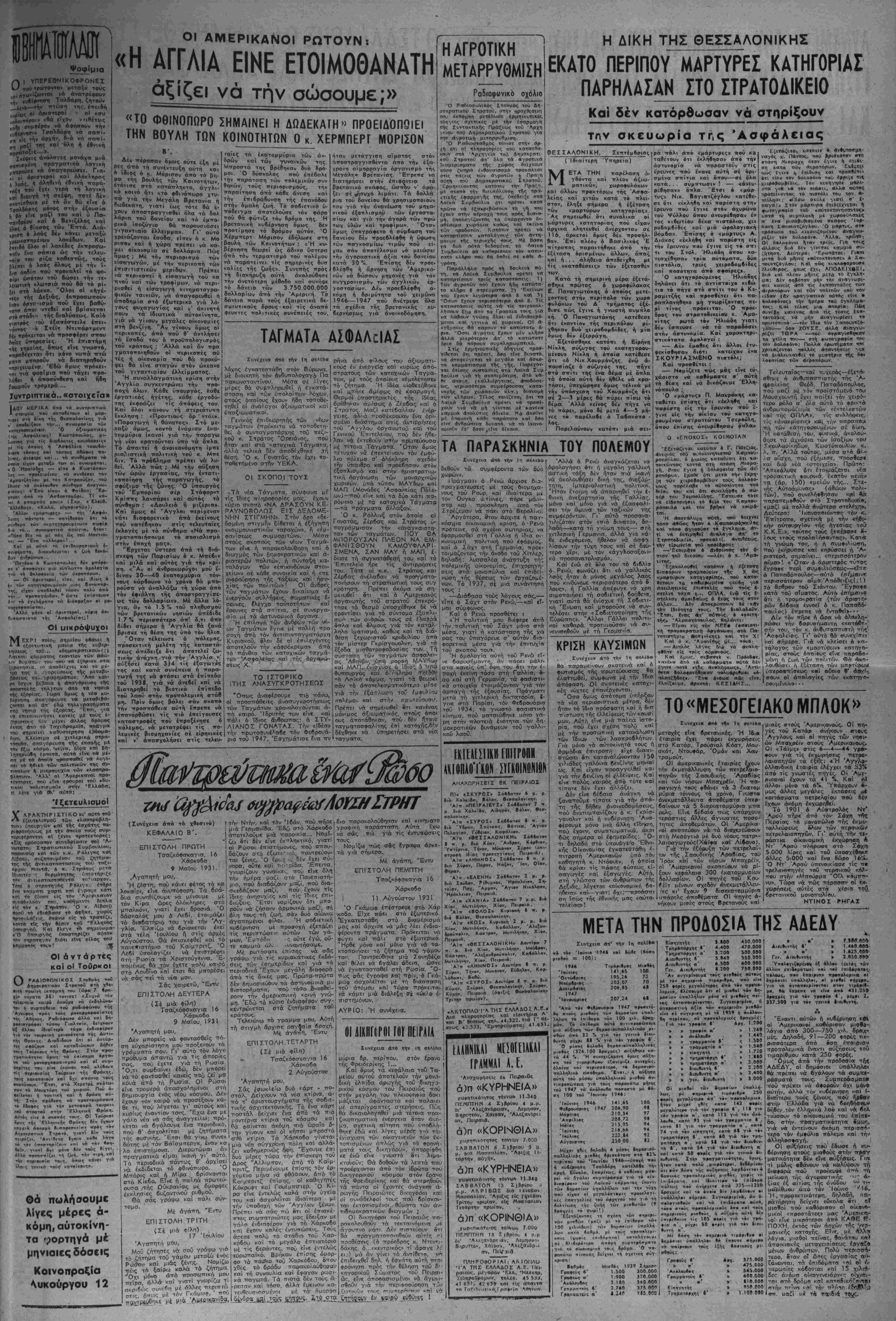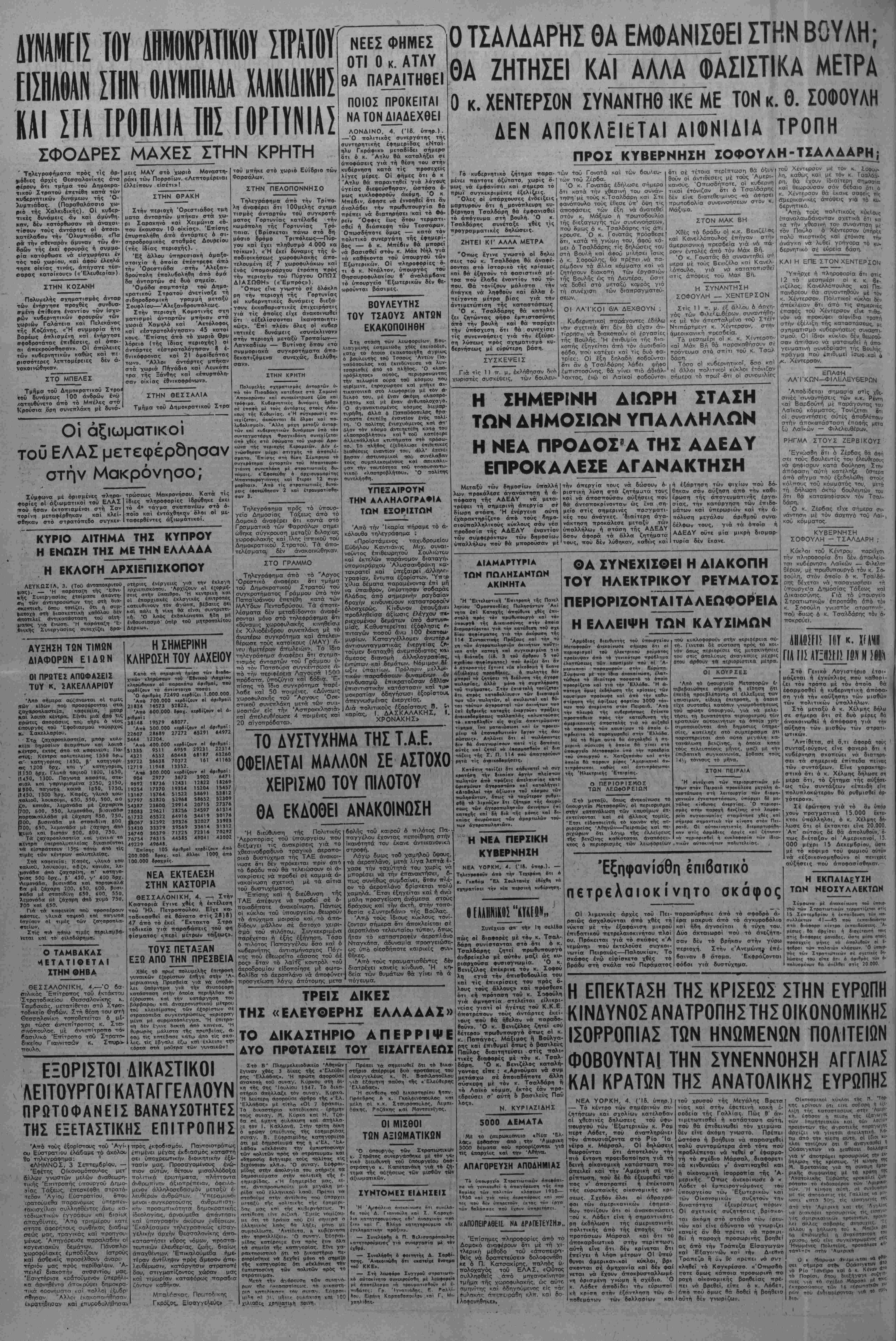 τής Βουλής. 'Η έττιθυμία τής δι<ι· κοπής έξηγεΤται άπό τόν άυοιδαΐο φόβο, ποθ κατέχει καΐ τίς δυό φα- τρίεο: ΟΊ έξη Εηλαδή Λοβοϋνται δτι αν ό Τσαλδάρης λάβει ψήφο έμπιστοσυνης, θά γίνει πιό άδιάλ- λακτος, ένώ οί Λαίκοϊ φοδοΰνται δτι σέ τέτοισ ττερϊπτωση θά όςυν θοΰν οί άντιθέσεις μέ τούς Άμερι- κανούς. Όπωσδήποτε, οί κυβερνη τικοί έτόνιζαν ότι ό Τσαλδάρης δέν είνε διατεθειμΐινος τ/ά άφήσει ττρωτοδολίσ συνεννοήσεων στόν κ. Μάξιμο. ΣΤΟΝ ΜΑΚ ΒΗ Χθές τό δράδυ οί κ.κ. Βενιζέ'-βς καϊ Κανελλόπουλος έπήγαν στήν άμερικσνική πρεσβεία γιά νά πά- ροι·ν έντολές άπό τόν Μάκ Βή. "Ο κ. Γονατάς θά συνσντηθεϊ σή μερά μέ τούς Βενιζέλο κσϊ Κανελ- λότουλο, γιά νά κατσ,τοπισθεΤ ατ'ις άπόψεις τού Μακ Βή. Η ΣΥΝΑΝΤΗΣΗ ΣΟΦΟΥΛΗ — ΧΕΝΤΕΡΣΟΝ Στΐς Π π. μ. έξ άλλου ό , γός τώ« Φιλελ&υθέρων συναντήθη- χε μέ τού άττεσταλμένο τού Στέϊτ Ντιπάρτμεντ κ. Χέντερσου, στήν άμεοικανική πρεσβεία. Τό μεσημέρι οί κ. κ. Χίντερσο» καΐ Μάκ Βή 9ά ττσρσκβθήσουν σέ ττρόγευμα στό σπίτι τού κ. Τσαλ δάρη. Τόσο οί κυδερν/ητικοί, δσο κκΐ ηΐ άλλοι πολιτικοΐ κύκλοι ετονίζον σήμερα τό πρωΐ -δτι οί συυομιλίες Η ΣΗΜΕΡΙΝΗ ΔΙΩΡΗ ΣΤΑΣΗ ΤΩΝ ΑΗΜΟΣΙΩΝ ΥΠΑΛΛΗΛΩΝ Η ΝΕΑ ΠΡΟΔΟΣΑ ΤΗΣ ΔΔΕΔΥ ΕΠΡΟΚΑΛΕΣΕ ΑΓΑΝΑΚΤΗΣΗ Μεταξΰ των δημοσίων υπβλλή λων προκάλεσι: άγανάκτηαη ή ά- πόφβση της ΑΑΕΑΥ νά μετα- τρέψει τή σημερινή άπεργια σϊ δίωρη στάση. 'Η ενεργεια αυτή έχαρακτηρίζετο άπό τοΰς ^ δημο- σιοϋπαλληλικοΰς κύκλους σάν νεα προδοσία της ΑΑΕΔΥ εναντίον των σύμφερόντον των δημοσίων ϋπαλλήλων πού βά μποροΰσαν μέ την άπεργία τους νά δώσουν ό· ριστική λύση στά ζητήματα τους καί νά άποσπούσαν αύξήσεις ποϋ θά άνταποκρίνονταν ώς έ'να ,ση- μεΐο στ'ις σημερινές πο?νματι· κές τού άνάγκες. 'διαίτερη όγα- νάκτηση προκάλεσε μεταξΰ των ϋπαλλήλων ή στάση τής ΑΔΕΔΥ δσον άφορά τα άλλα ζητήματά τους, ποΰ δέν λύθηκαν, καθός καΐ ή έξάρτηση των ψιχίων ποϋ δό- θηκαν σάν αυξήση άπό την καθι- έρωση τής απογευματινάς εργα¬ σίας, την καταργήση των έπιδο- μάτων καί ύπερωριών καί την ά- πόλυση μεγάλου άριθμοΰ συνά¬ δελφον τους, γιά τα όποϊα ή ΑΔΕΔΥ οϋτι μία μικρή διαμαρ- τυρι'α δέν εκανε. ΔΙΑΜΑΡΤΥΡΙΑ ΤΩΝ ΠΩΛΗΖΑΝΤΩΝ ΑΚΙΝΗΤΔ Ή Έκτελιστικί Επιτραπή της Πανελ ληνίου ΌμοσττονΒίας Πωλησάντων Άκ'ι νητα ίπΐ Κατβχής βπηνθυνε χθές ίπι- στβλή πρός τβν πρωθυπουργό καί τον ύ·κουργ4 τής Λικαιβούνης στήν οιτ·ία βιαμαρτύρεται γιά την καταθέση τοθ σχϊ δίβΐί ψηφίσματος γιά την ακΰρωση τής 114 Συντακτικής Πράξεως καΐ την τύ XI) των άγβραπωληβιίιν άκινήτυν τΐοβγι- να· οτη< κατβκη κα) σνγκικριμένα γιά τή (ιάταξη (έα. 3 τβΰ ίίρθρου Ι τβθ «χεϋ«υ νη·>·Ίΐν·«ς) ττβν «ρίζει ότι Κ»